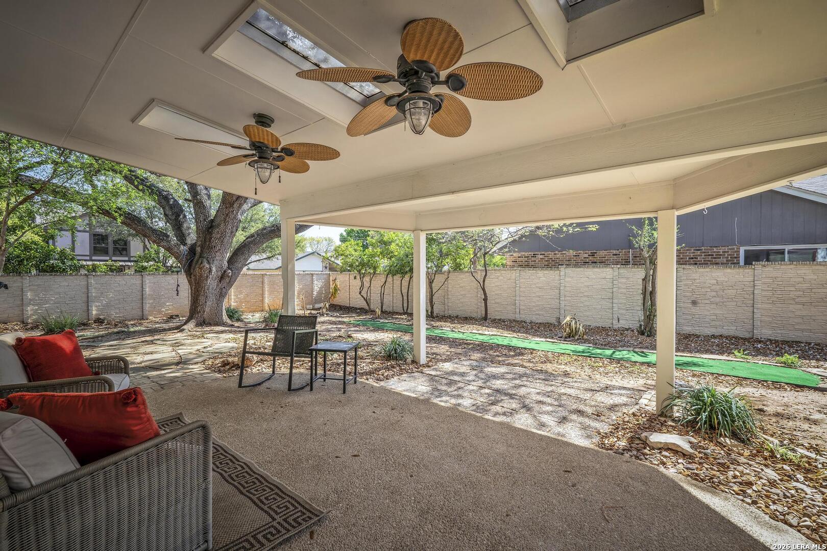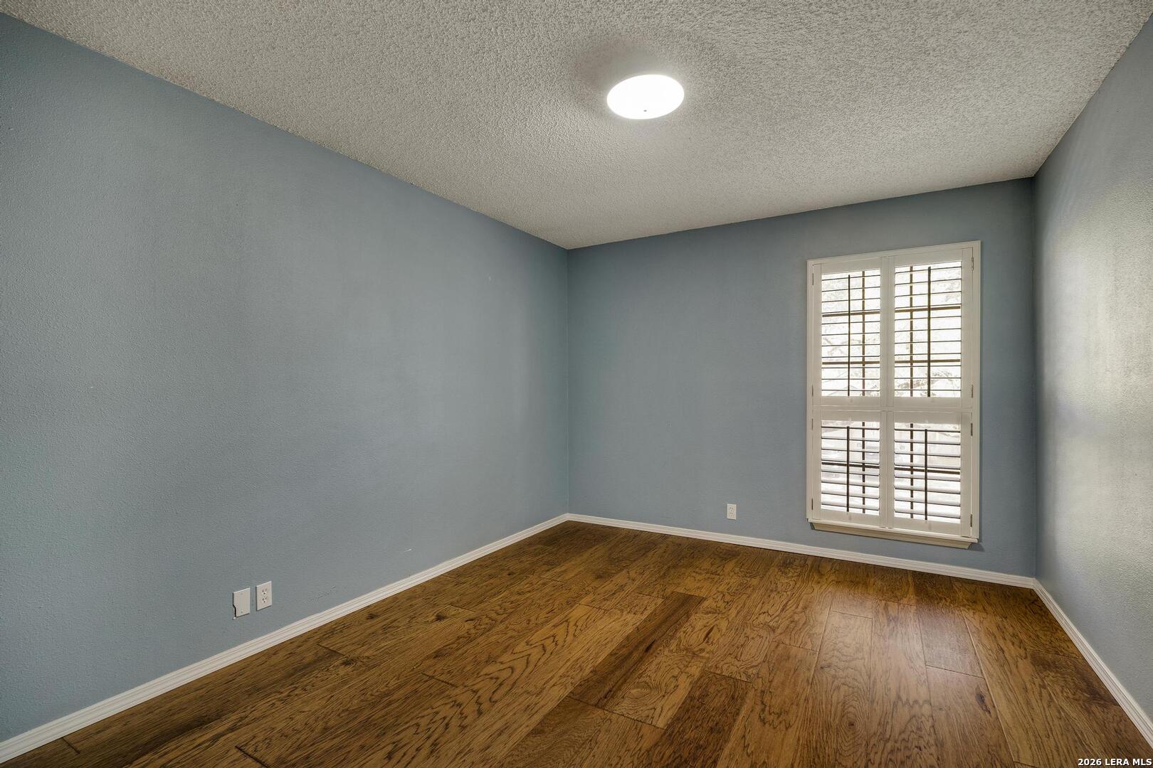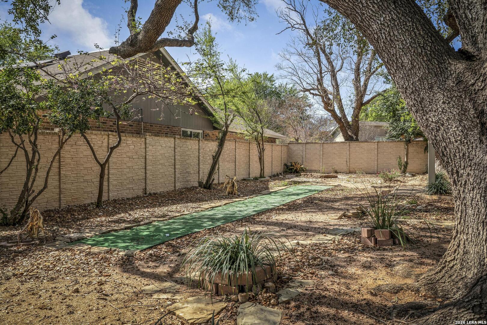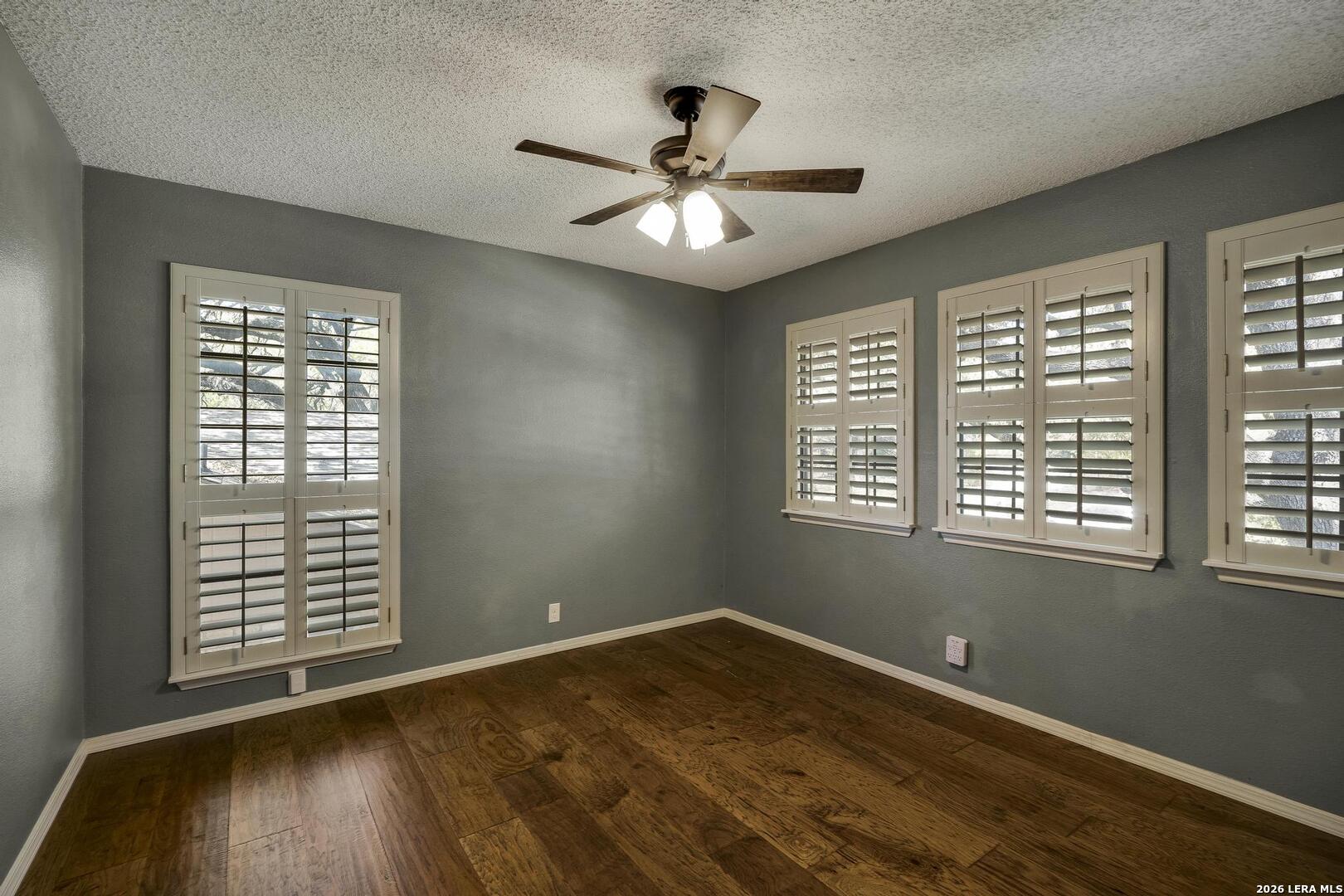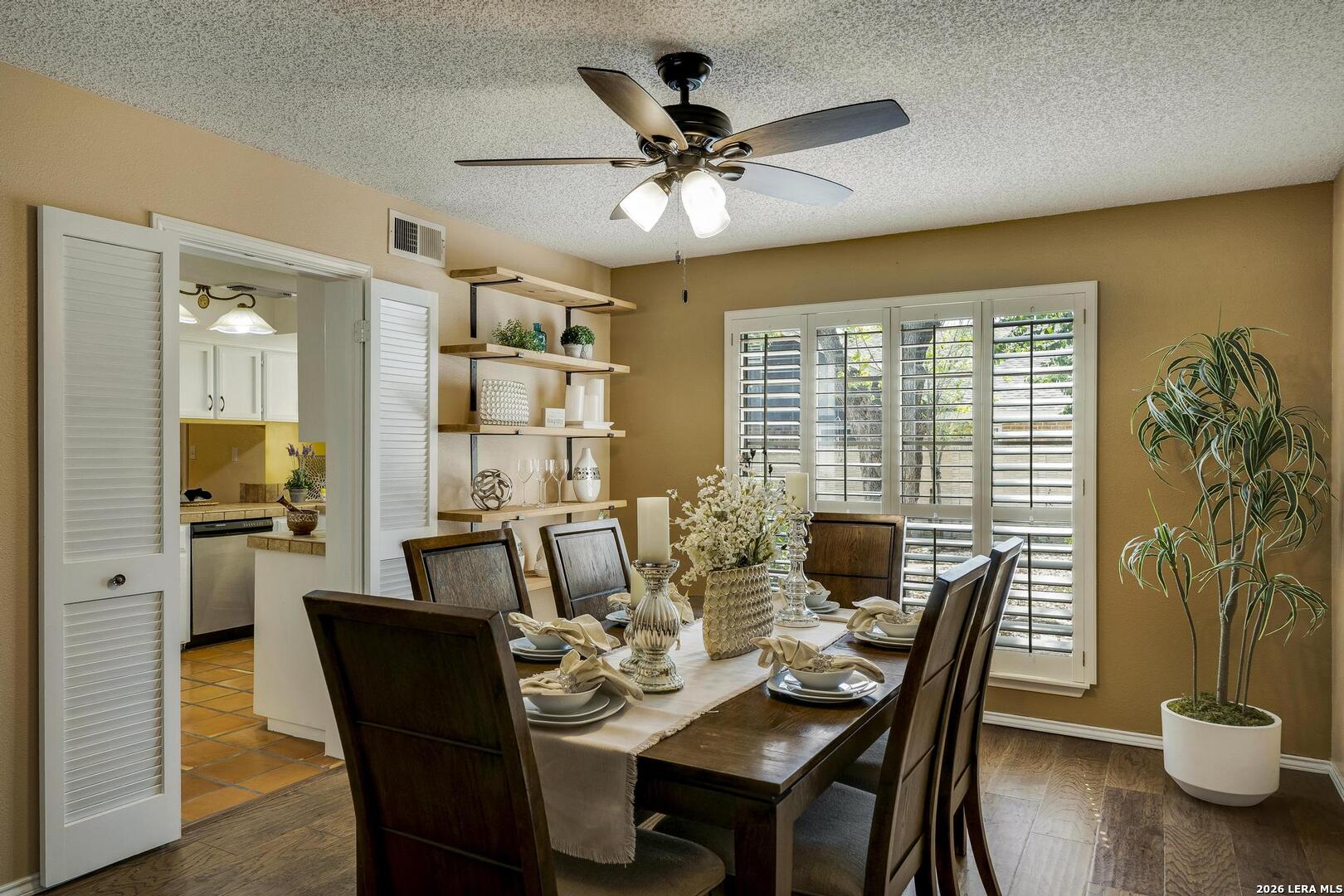 Elegant Spanish-style home with modern updates in desirable North Central San Antonio. Surrounded by mature oak trees, this beautifully maintained property features engineered wood flooring throughout, classic Saltillo tile, custom wood entry doors, plantation shutters, and a stunning floor-to-ceiling stone fireplace with vented gas logs. The spacious kitchen offers stainless steel appliances, generous counter space, and a breakfast bar, while the oversized primary suite includes a custom walk-in closet with built-ins. Enjoy the covered back patio, beautifully landscaped front and back yard, zero-scaped backyard for low-maintenance living, water softener, and 3-car garage. A rare blend of timeless character, warmth, and modern convenience.