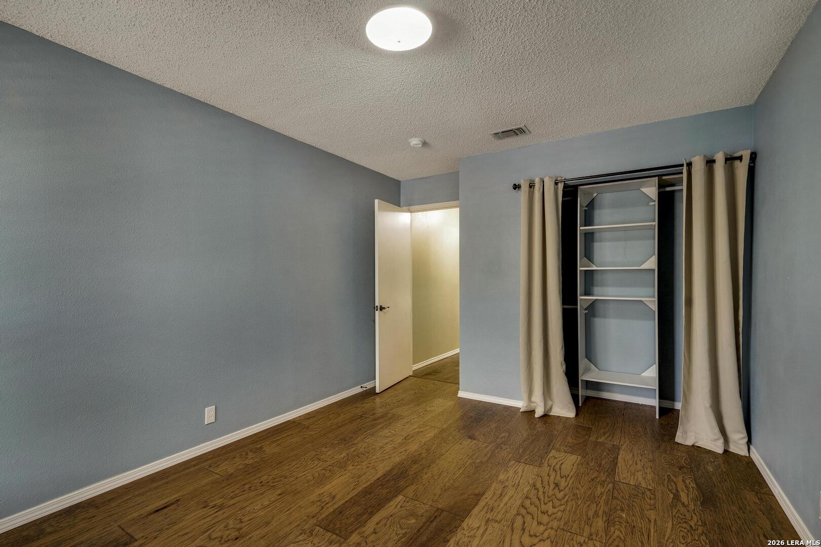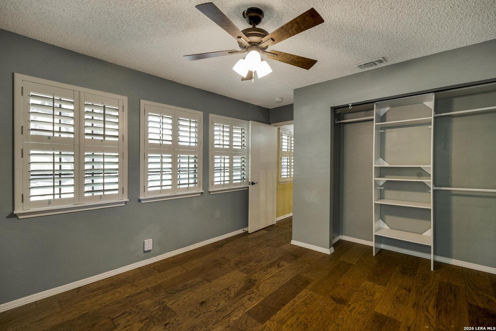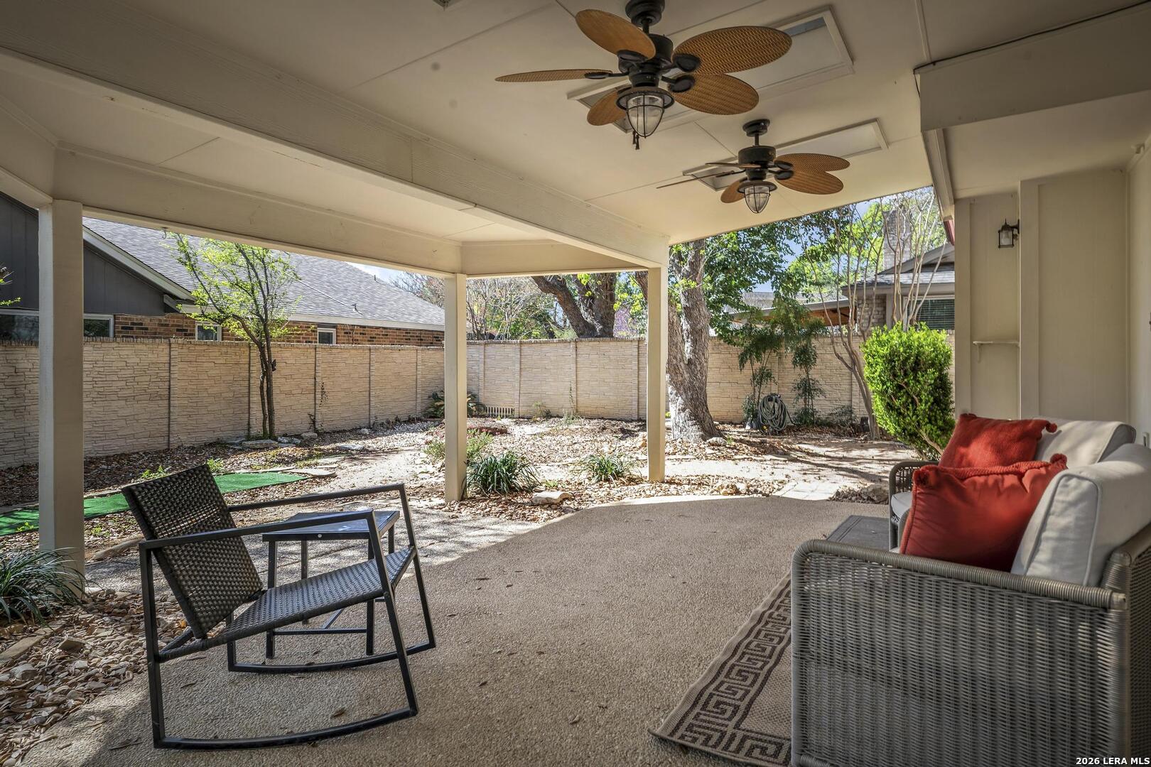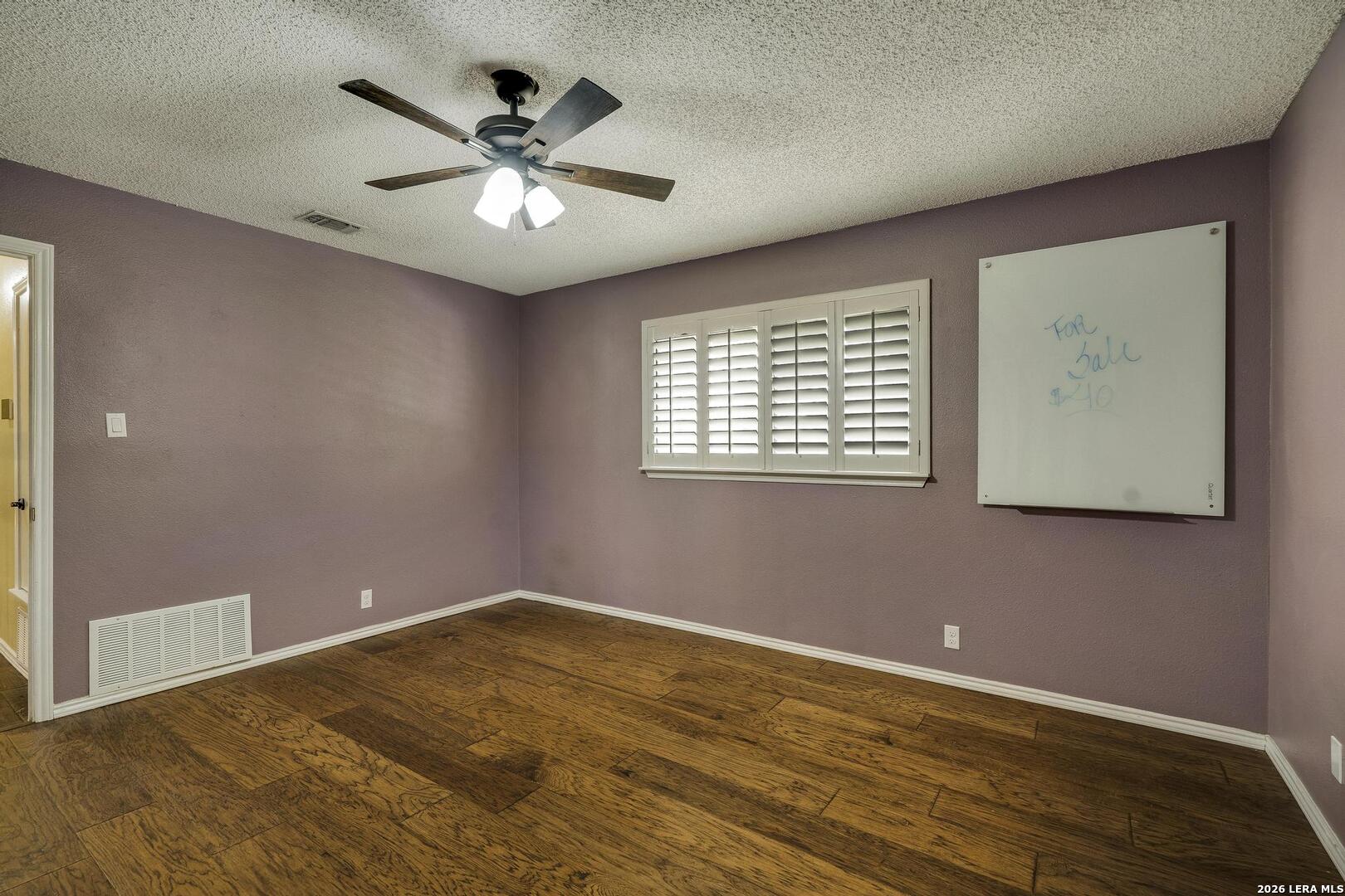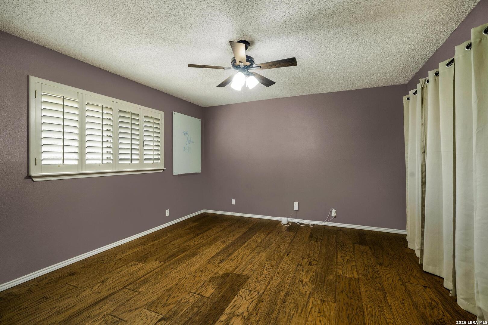 Elegant Spanish-style home with modern updates in desirable North Central San Antonio. Surrounded by mature oak trees, this beautifully maintained property features engineered wood flooring throughout, classic Saltillo tile, custom wood entry doors, plantation shutters, and a stunning floor-to-ceiling stone fireplace with vented gas logs. The spacious kitchen offers stainless steel appliances, generous counter space, and a breakfast bar, while the oversized primary suite includes a custom walk-in closet with built-ins. Enjoy the covered back patio, beautifully landscaped front and back yard, zero-scaped backyard for low-maintenance living, water softener, and 3-car garage. A rare blend of timeless character, warmth, and modern convenience.