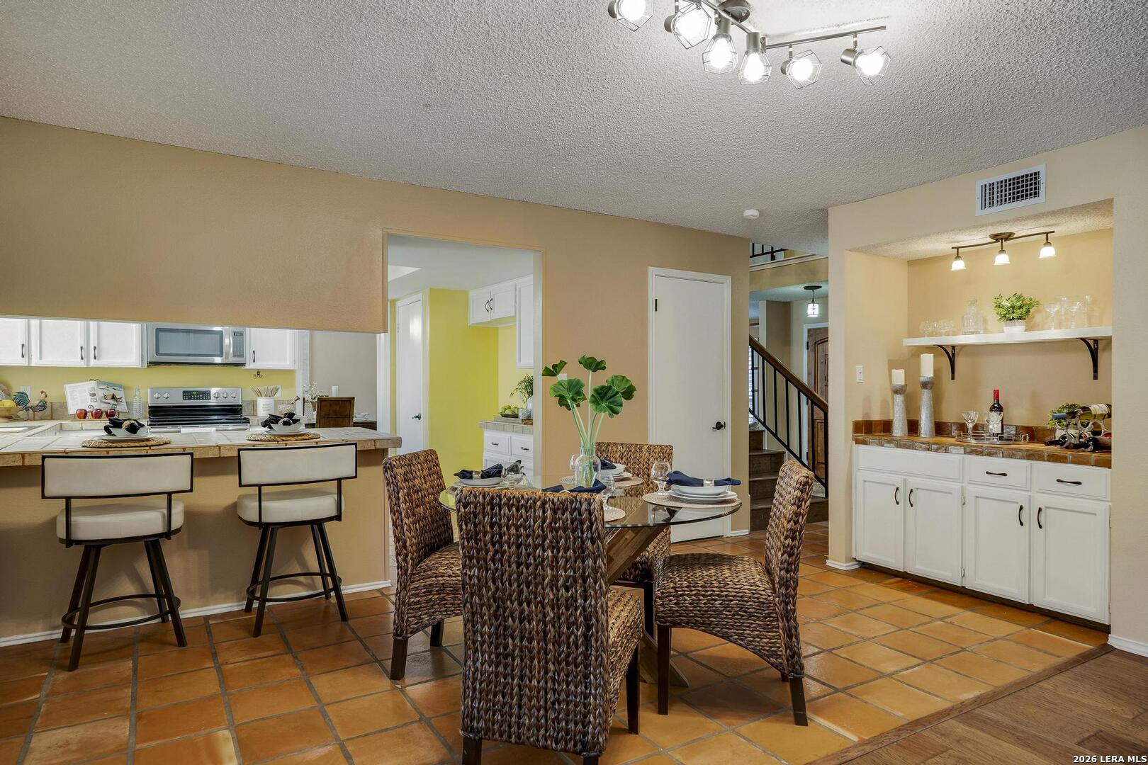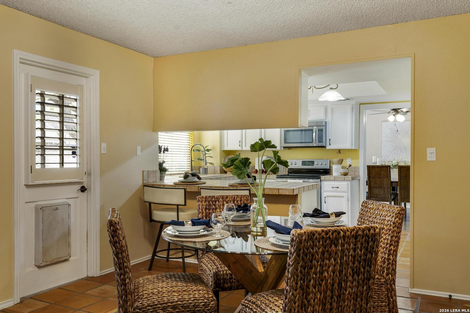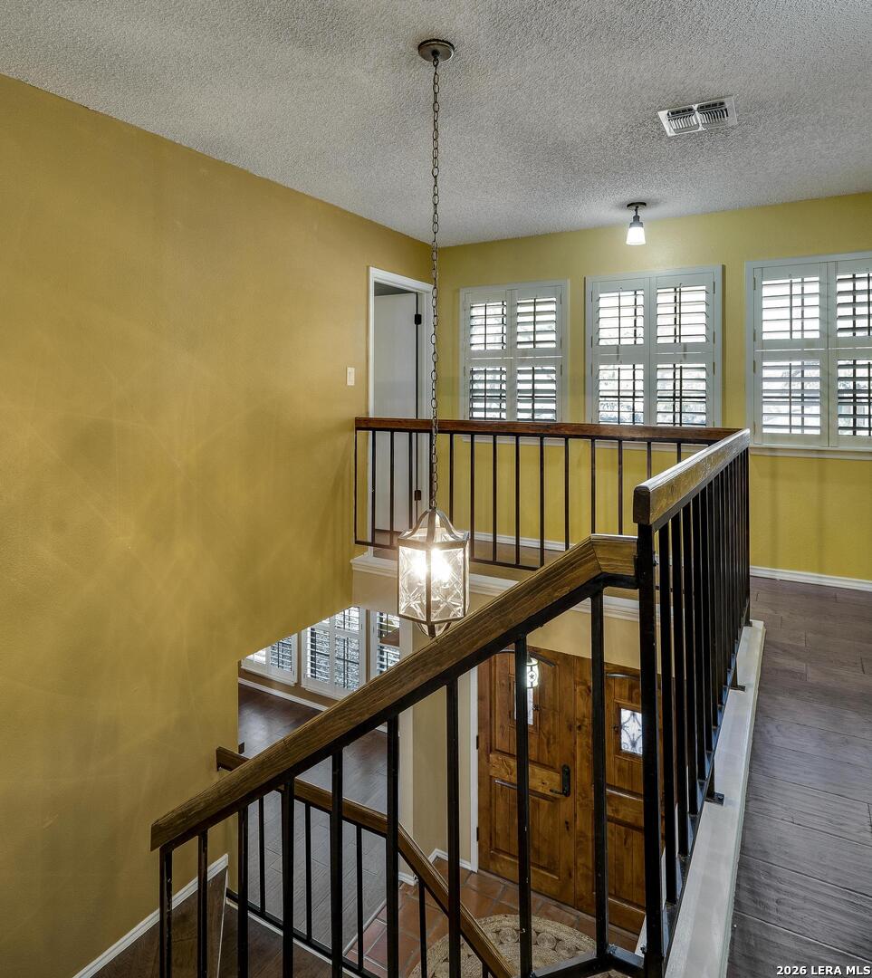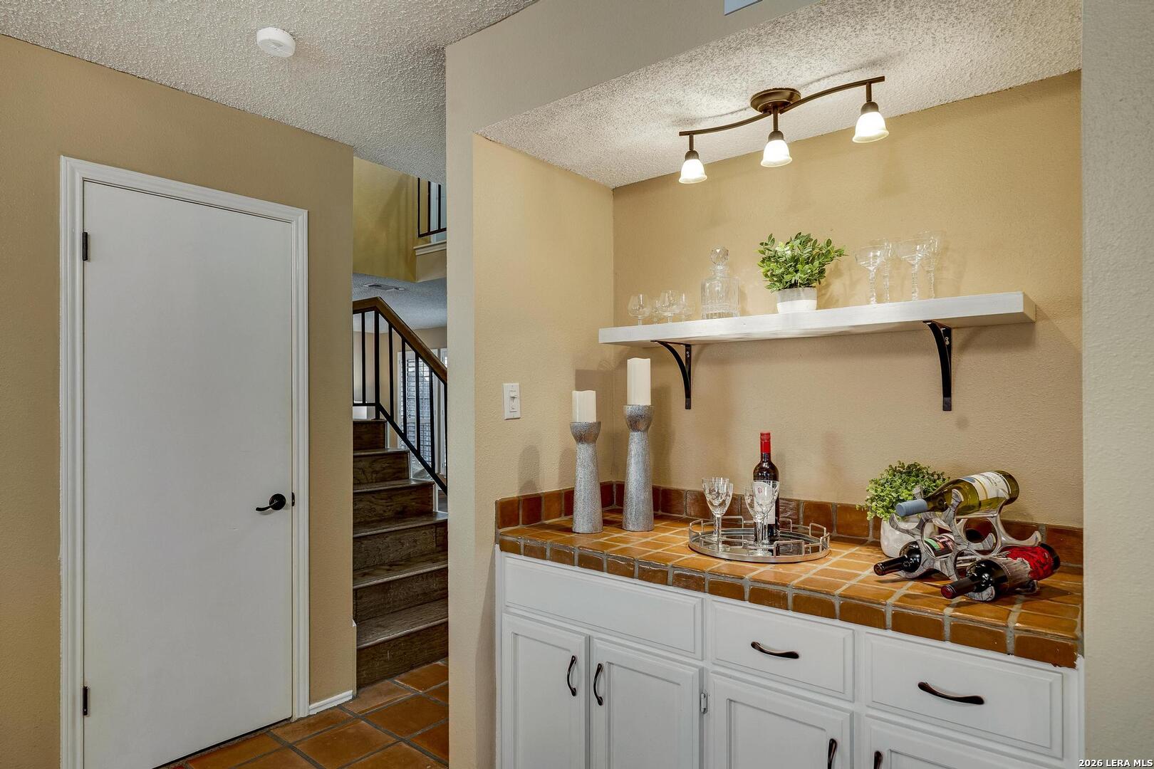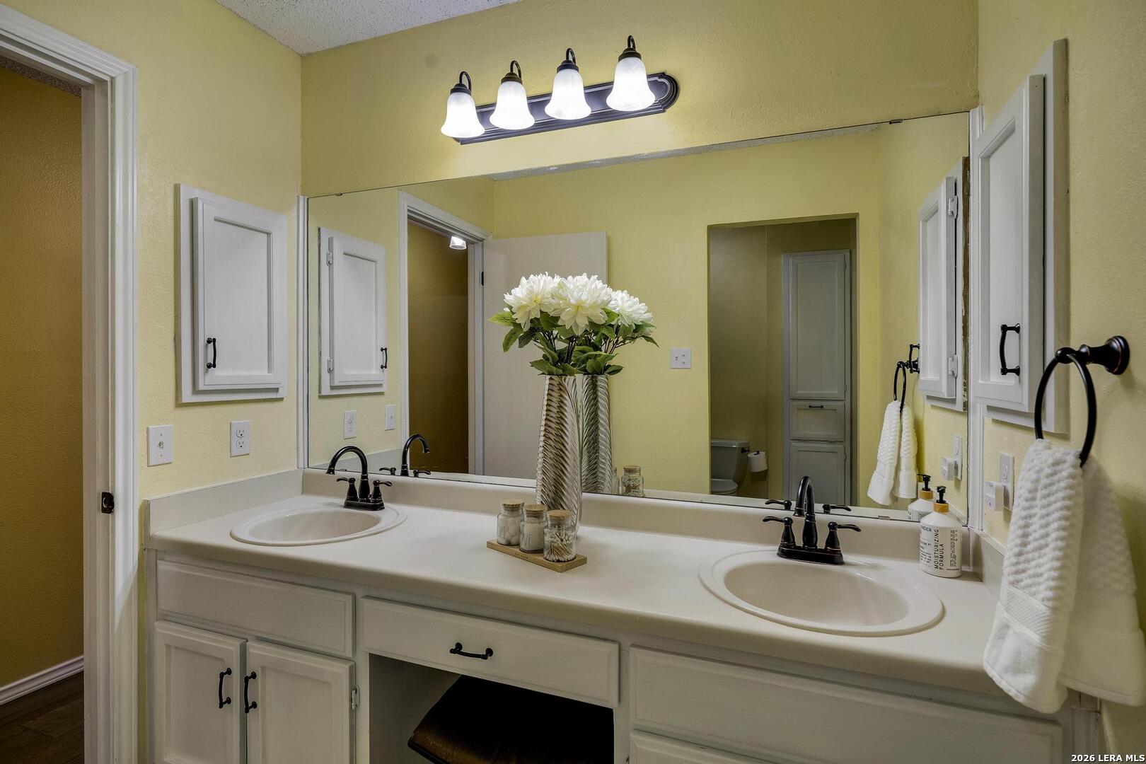 Elegant Spanish-style home with modern updates in desirable North Central San Antonio. Surrounded by mature oak trees, this beautifully maintained property features engineered wood flooring throughout, classic Saltillo tile, custom wood entry doors, plantation shutters, and a stunning floor-to-ceiling stone fireplace with vented gas logs. The spacious kitchen offers stainless steel appliances, generous counter space, and a breakfast bar, while the oversized primary suite includes a custom walk-in closet with built-ins. Enjoy the covered back patio, beautifully landscaped front and back yard, zero-scaped backyard for low-maintenance living, water softener, and 3-car garage. A rare blend of timeless character, warmth, and modern convenience.