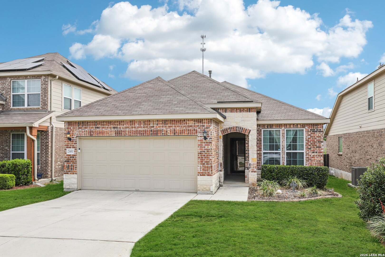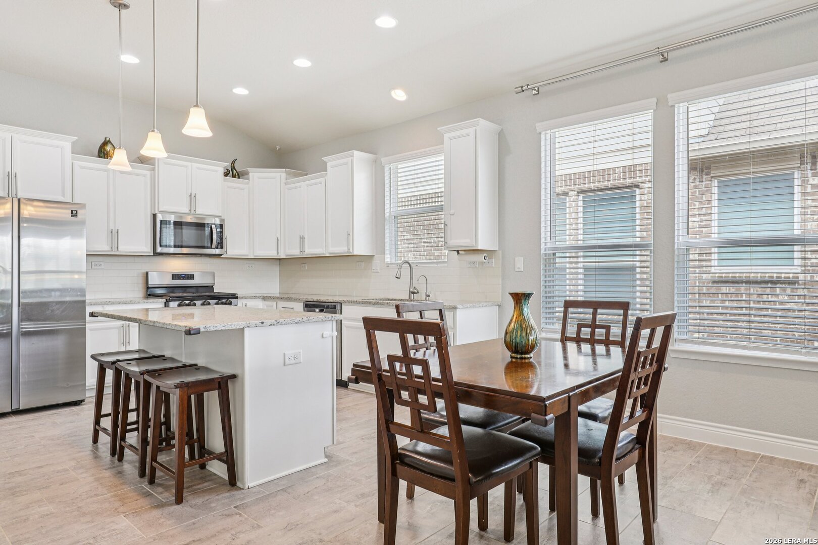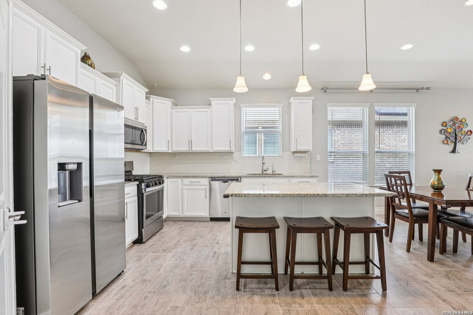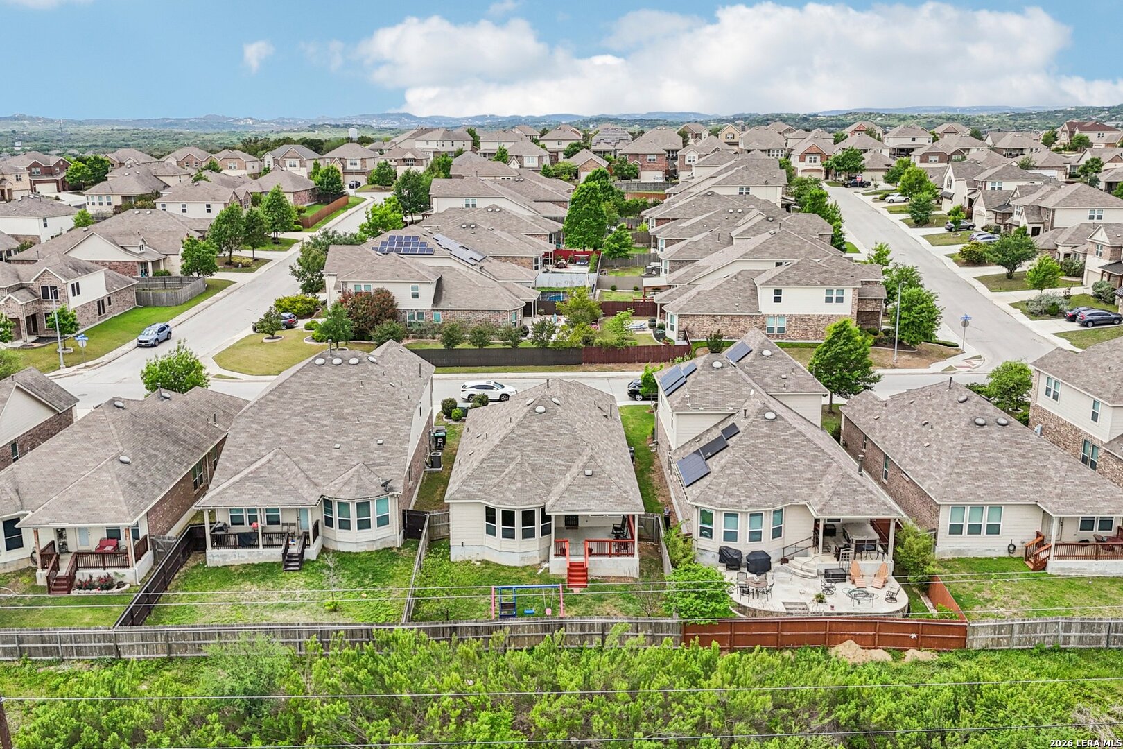 Lovely one story brick and stone home located in the desirable Terrace of Stonehaven, The welcoming 3 bedroom 2 bath home, entry opens to an open floor plan with high ceilings and abundant natural light. The kitchen features 42" cabinets, granite countertops, and a layout ideal for everyday living and entertaining. Ceramic tile flows through the main living areas. A generous family room offers large windows and high ceilings. The primary suite includes dual vanities, a custom spa shower, and a spacious walk in closet. Additional highlights include a large laundry room with mud bench, extended covered patio perfect for outdoor entertaining, and a private green space behind the home. Convenient to Boerne schools, HEB, La Cantera Mall, golf courses and local entertainment.