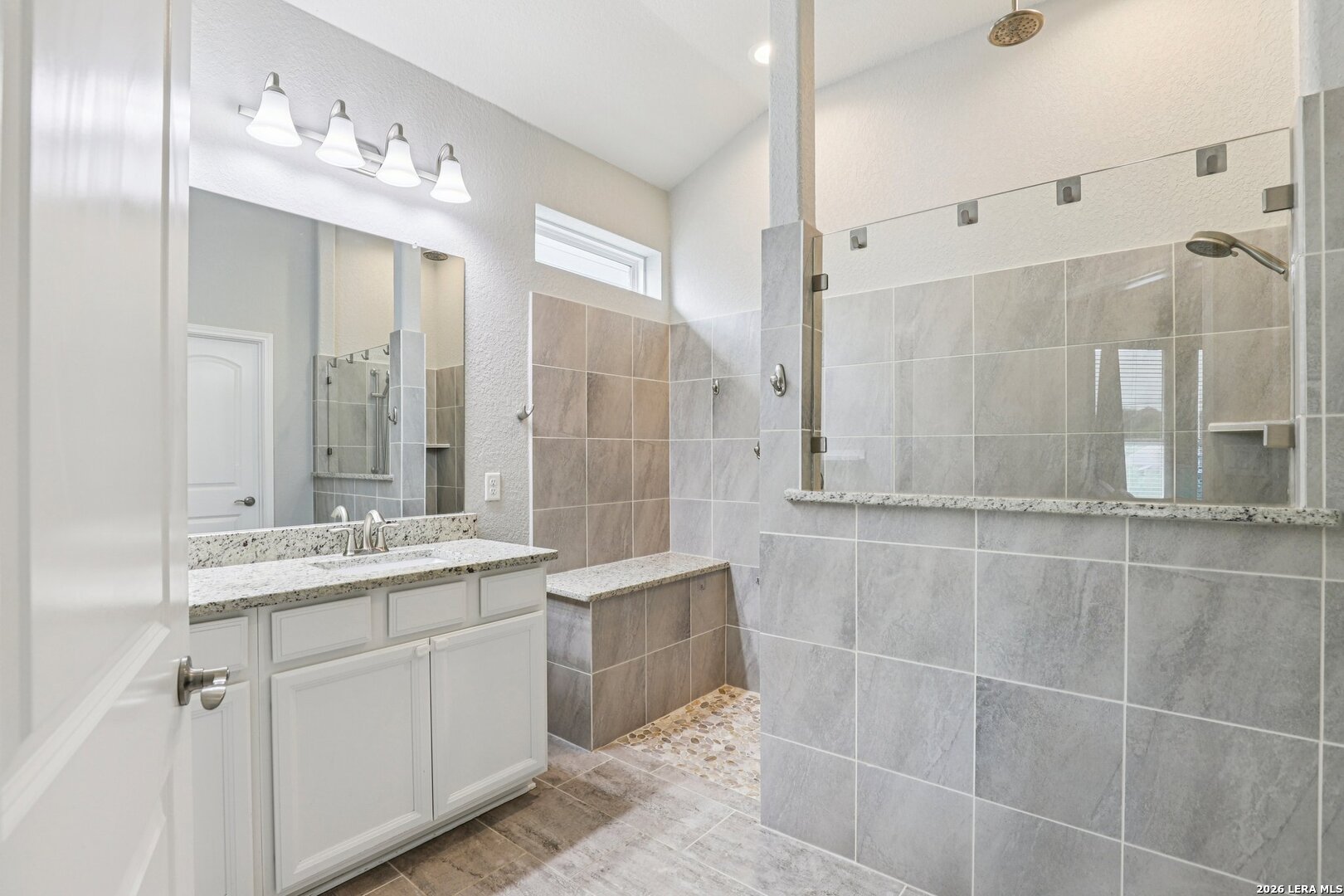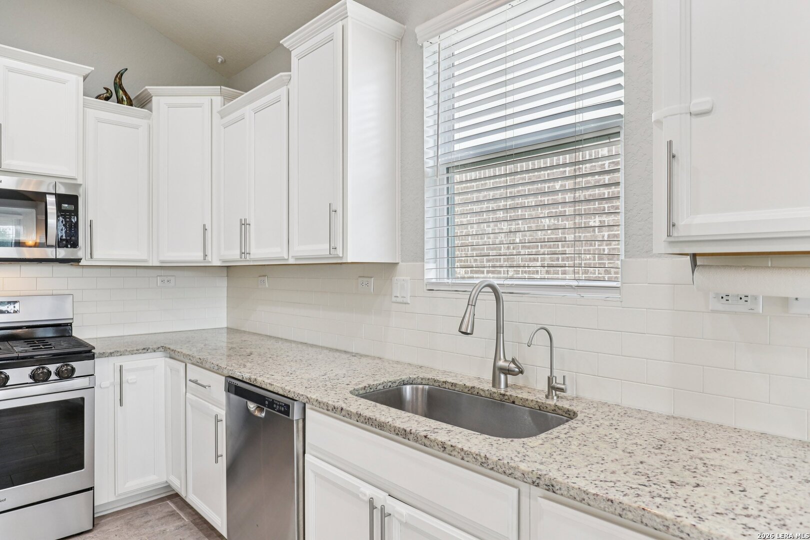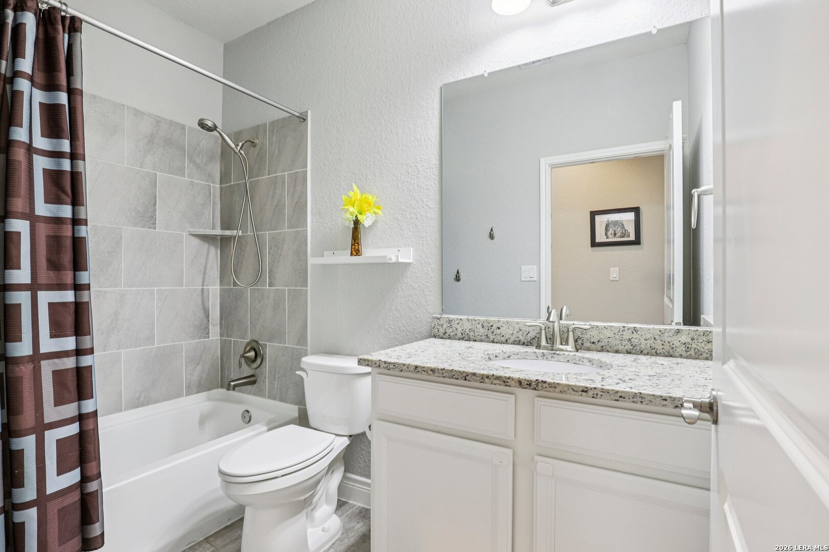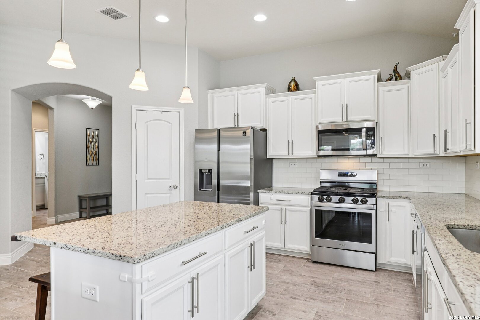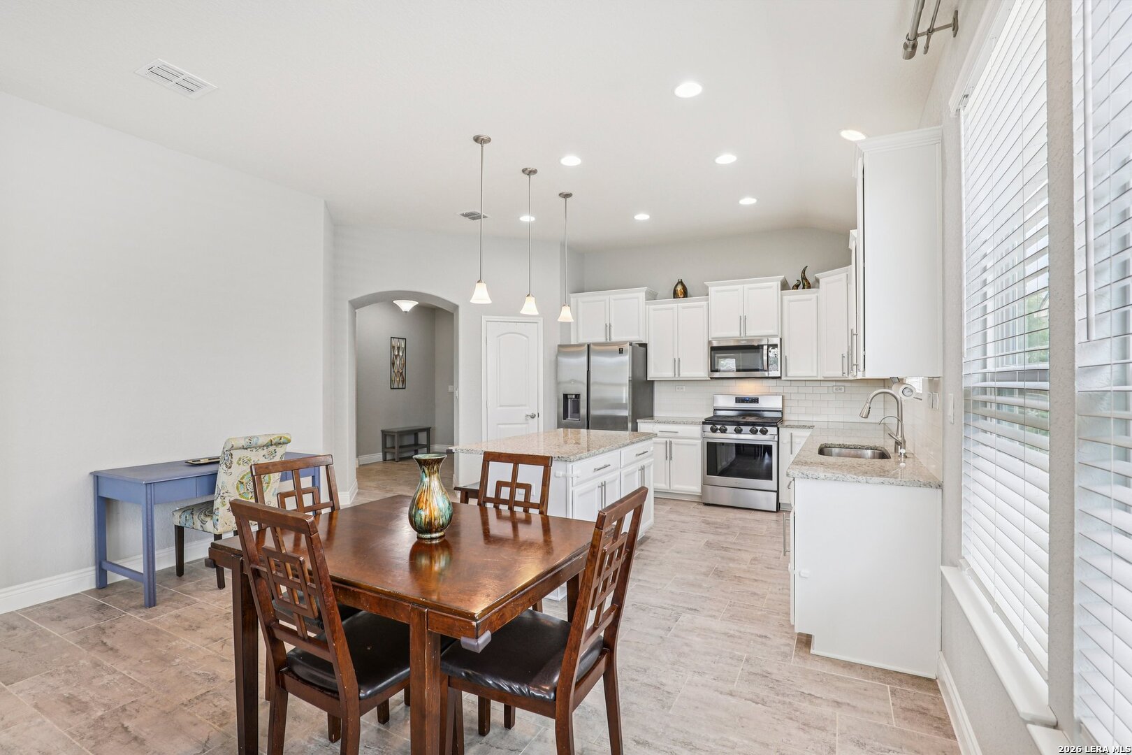 Lovely one story brick and stone home located in the desirable Terrace of Stonehaven, The welcoming 3 bedroom 2 bath home, entry opens to an open floor plan with high ceilings and abundant natural light. The kitchen features 42" cabinets, granite countertops, and a layout ideal for everyday living and entertaining. Ceramic tile flows through the main living areas. A generous family room offers large windows and high ceilings. The primary suite includes dual vanities, a custom spa shower, and a spacious walk in closet. Additional highlights include a large laundry room with mud bench, extended covered patio perfect for outdoor entertaining, and a private green space behind the home. Convenient to Boerne schools, HEB, La Cantera Mall, golf courses and local entertainment.