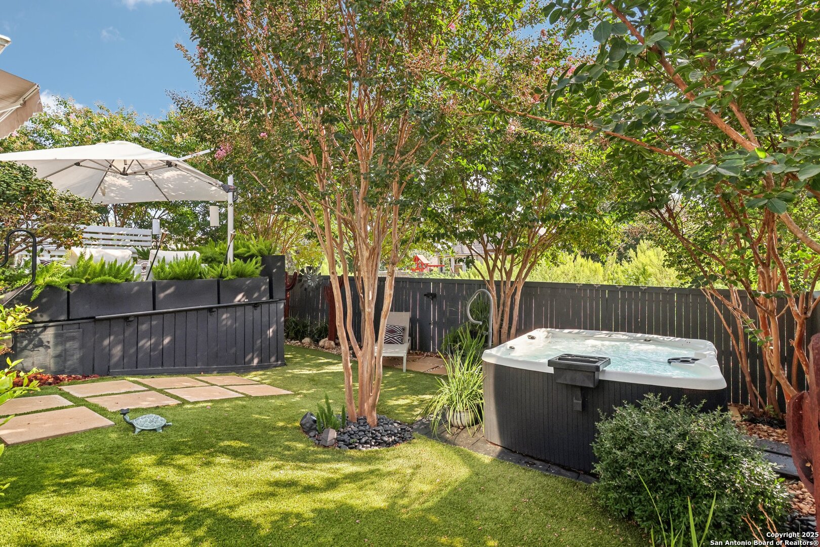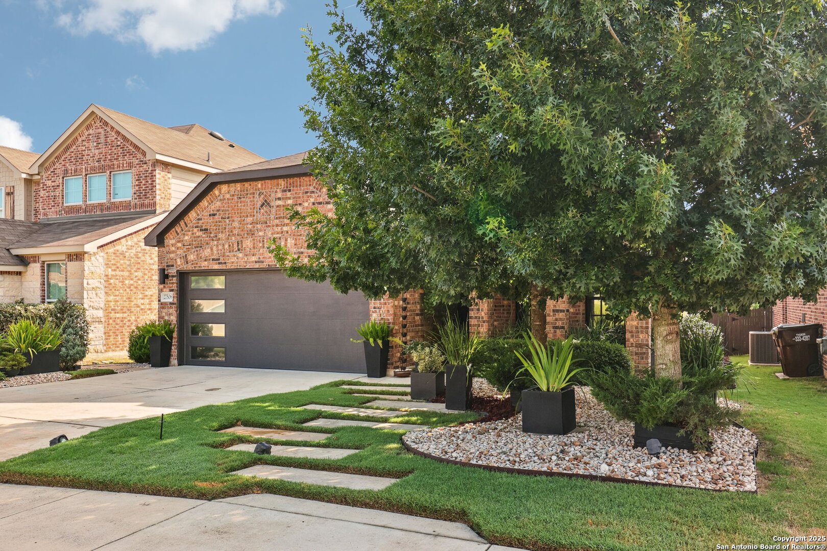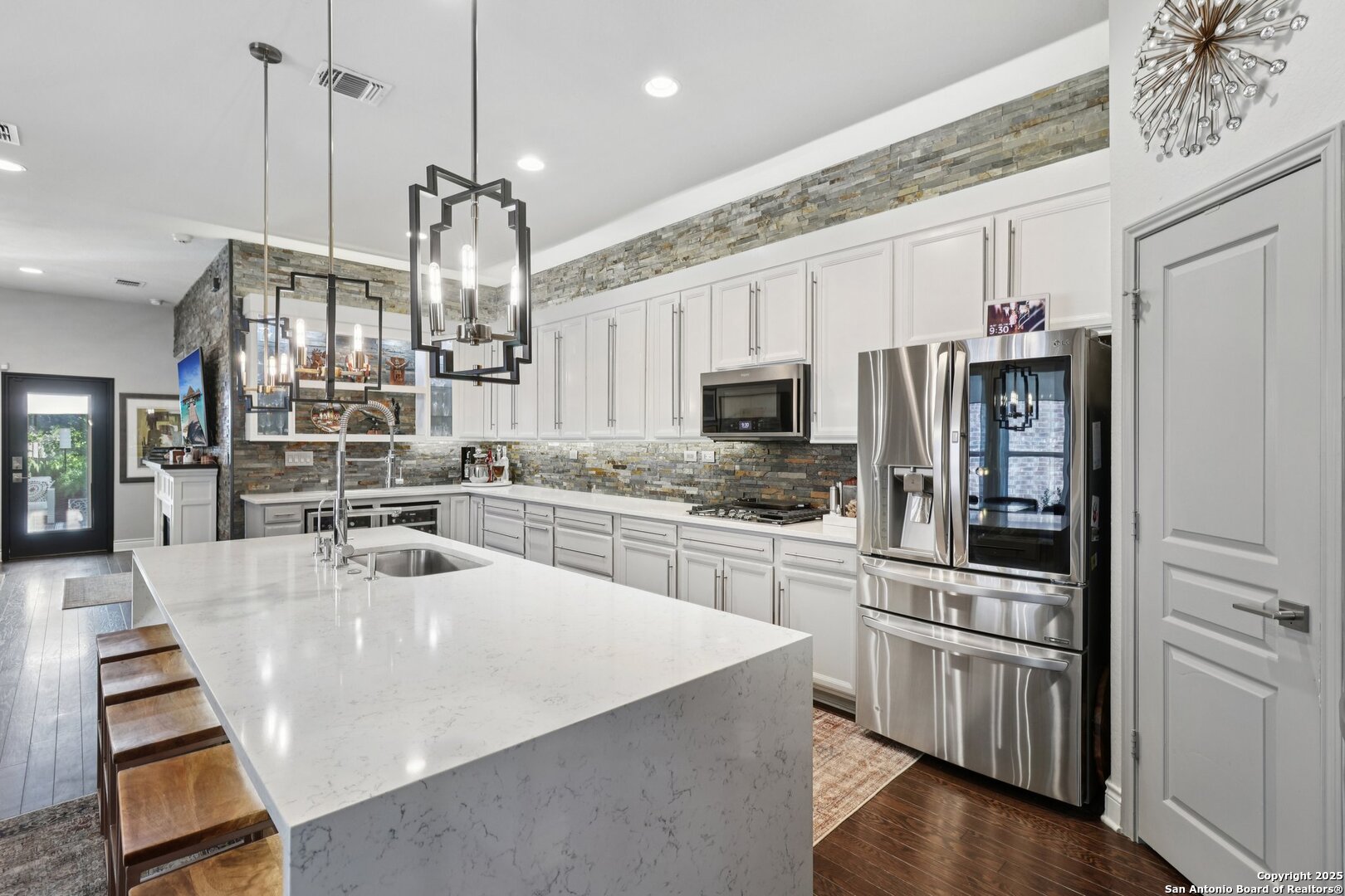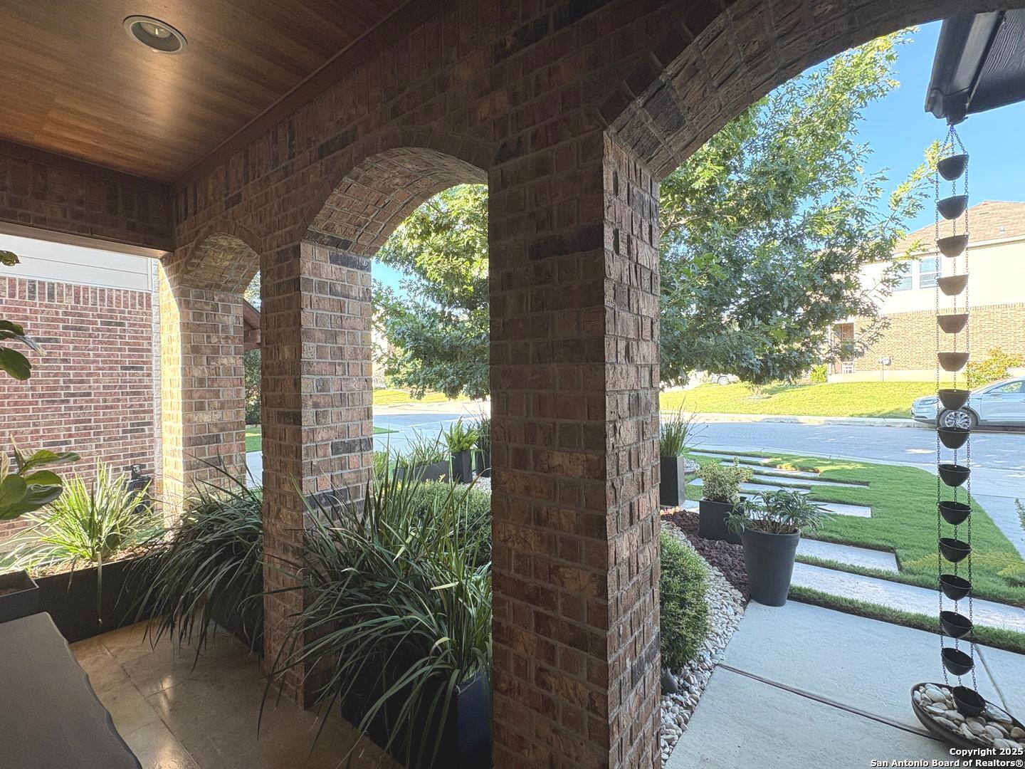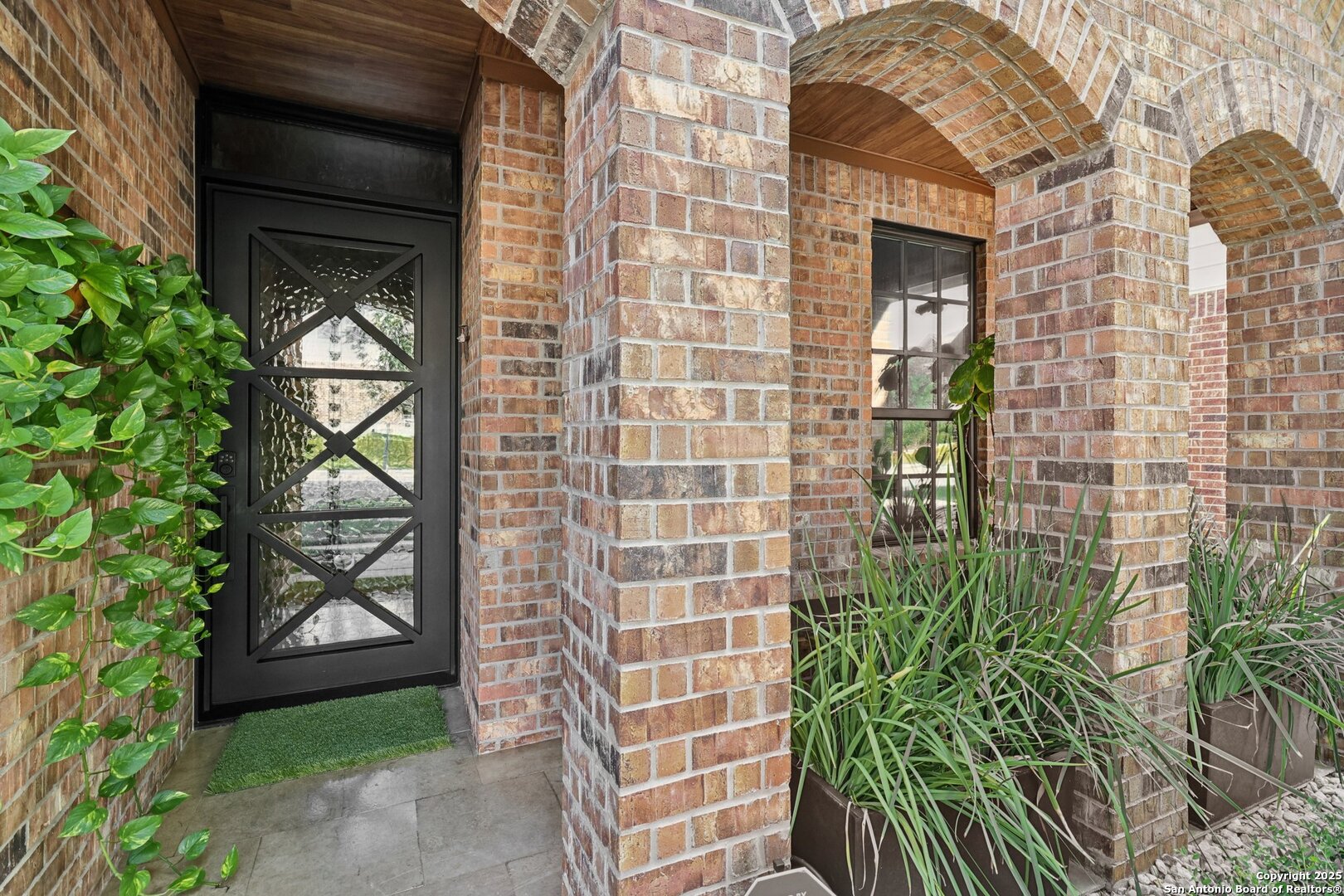 Wow! This home has been beautifully enhanced at every turn! Starting with irresistible curb appeal that features a beautiful insulated garage door, concrete block walk-way, front porch with wood ceiling and heavy wrought iron and glass front door. Step inside to hardwood flooring, gorgeous light fixtures throughout, wood and tile wall treatments and beautiful window coverings! The kitchen has a gas cooktop, extended cabinetry with quartz counter tops, oversized island with waterfall edge, double ovens, 2 wine refrigerators, under-counter lighting and walk-in pantry. The Study has glass french doors. Split Primary bedroom has lovely pendant lights and bath with double vanity & huge walk-in shower. All closets in the home have been cedar lined. Bedrooms 2 & 3 have upgraded, designer carpet. Step out back to a little bit of paradise! Outdoor living at it's finest, with covered, private patio extending to a large deck. The patio has a remote controlled awning for extra shade, stainless steel gas grill, wine fridge and TV. In the artificial turfed backyard you'll find a hot tub and gorgeous landscaping all on a greenbelt for added privacy! Great location, Boerne School district, convenient access to IH 10 and shopping & dining at La Cantera and The Rim.
