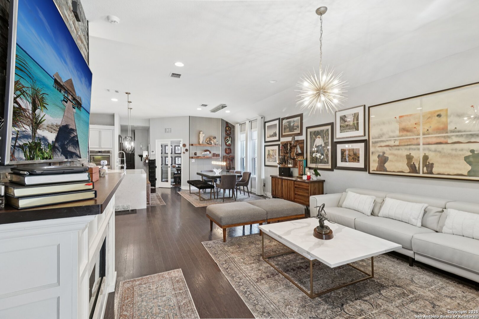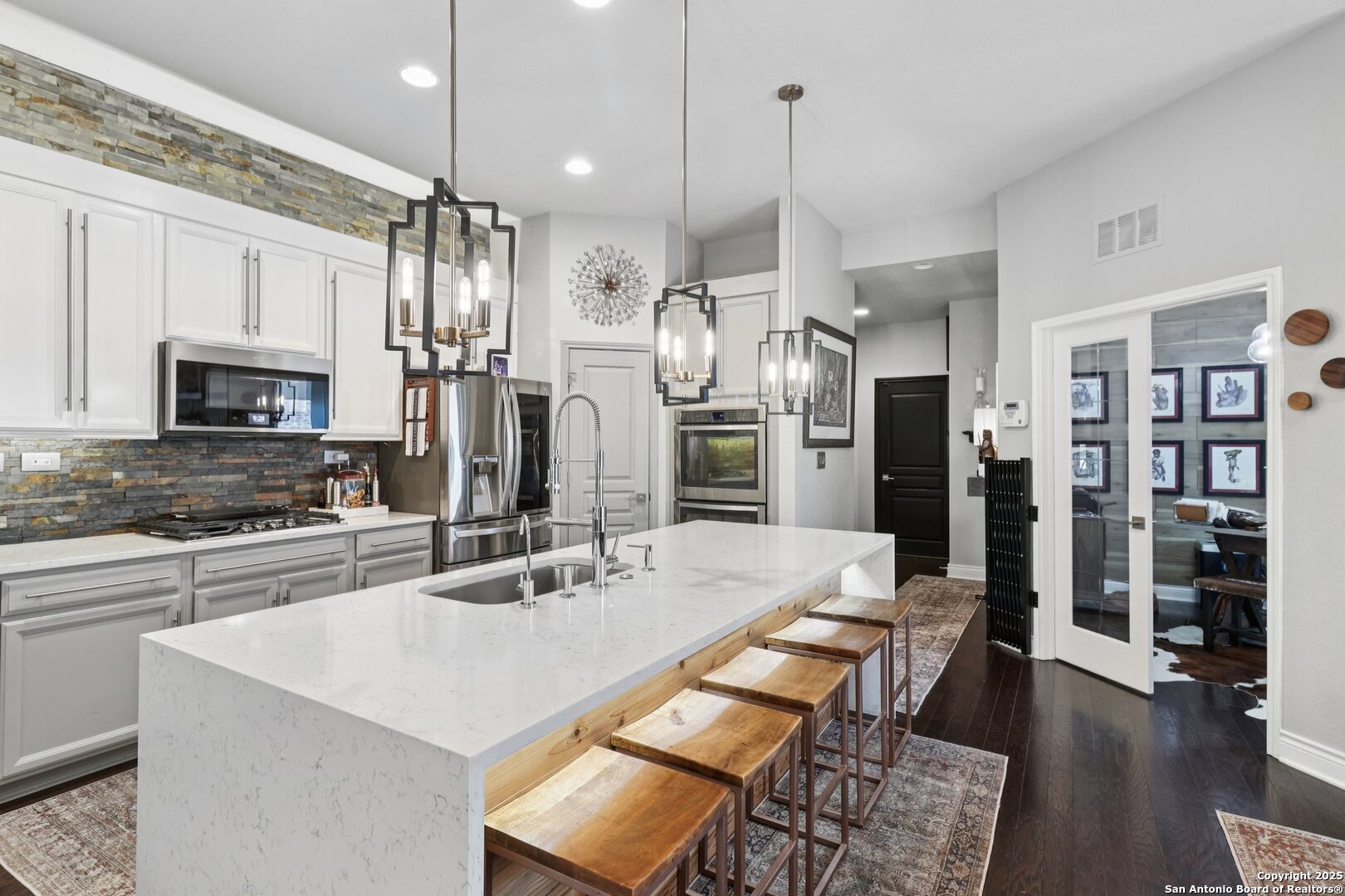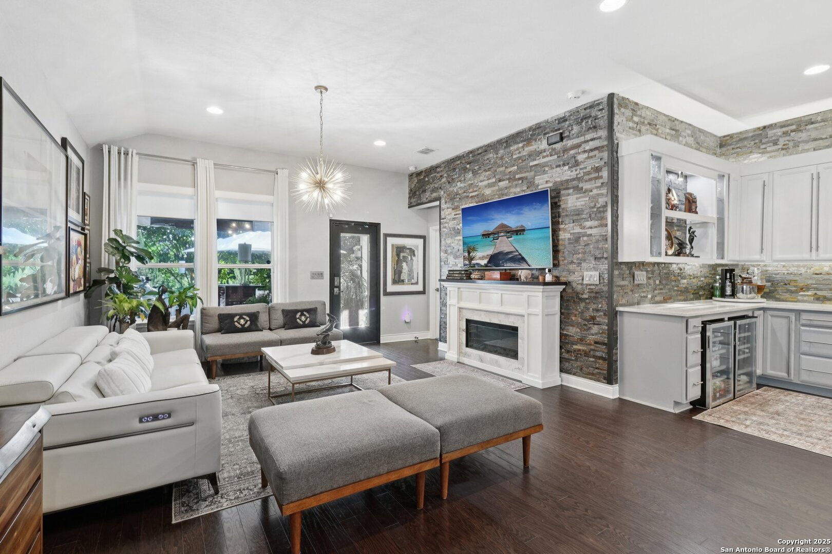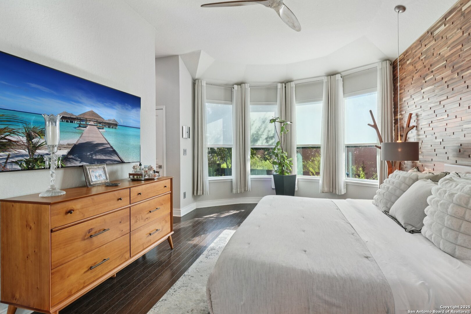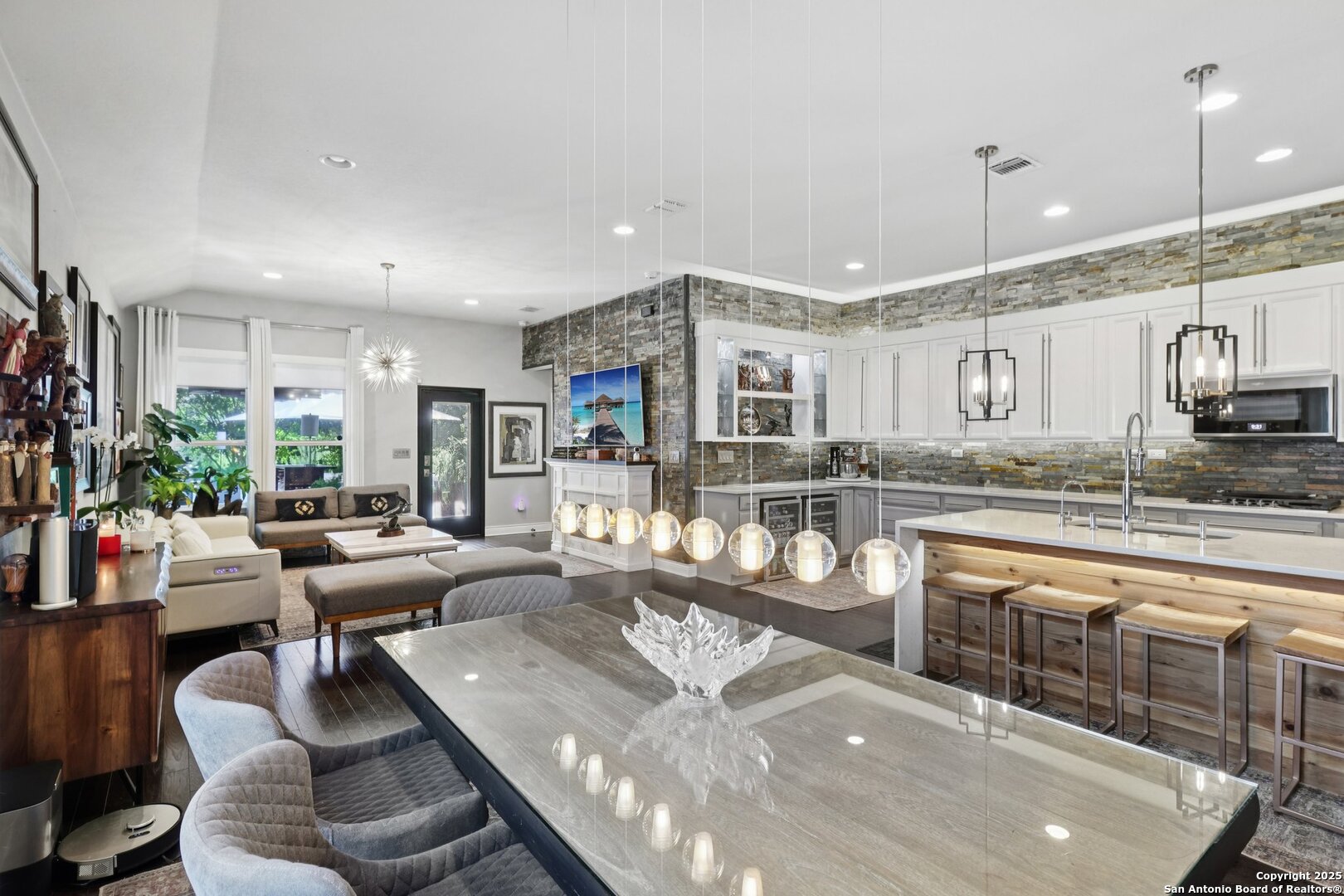 Wow! This home has been beautifully enhanced at every turn! Starting with irresistible curb appeal that features a beautiful insulated garage door, concrete block walk-way, front porch with wood ceiling and heavy wrought iron and glass front door. Step inside to hardwood flooring, gorgeous light fixtures throughout, wood and tile wall treatments and beautiful window coverings! The kitchen has a gas cooktop, extended cabinetry with quartz counter tops, oversized island with waterfall edge, double ovens, 2 wine refrigerators, under-counter lighting and walk-in pantry. The Study has glass french doors. Split Primary bedroom has lovely pendant lights and bath with double vanity & huge walk-in shower. All closets in the home have been cedar lined. Bedrooms 2 & 3 have upgraded, designer carpet. Step out back to a little bit of paradise! Outdoor living at it's finest, with covered, private patio extending to a large deck. The patio has a remote controlled awning for extra shade, stainless steel gas grill, wine fridge and TV. In the artificial turfed backyard you'll find a hot tub and gorgeous landscaping all on a greenbelt for added privacy! Great location, Boerne School district, convenient access to IH 10 and shopping & dining at La Cantera and The Rim.