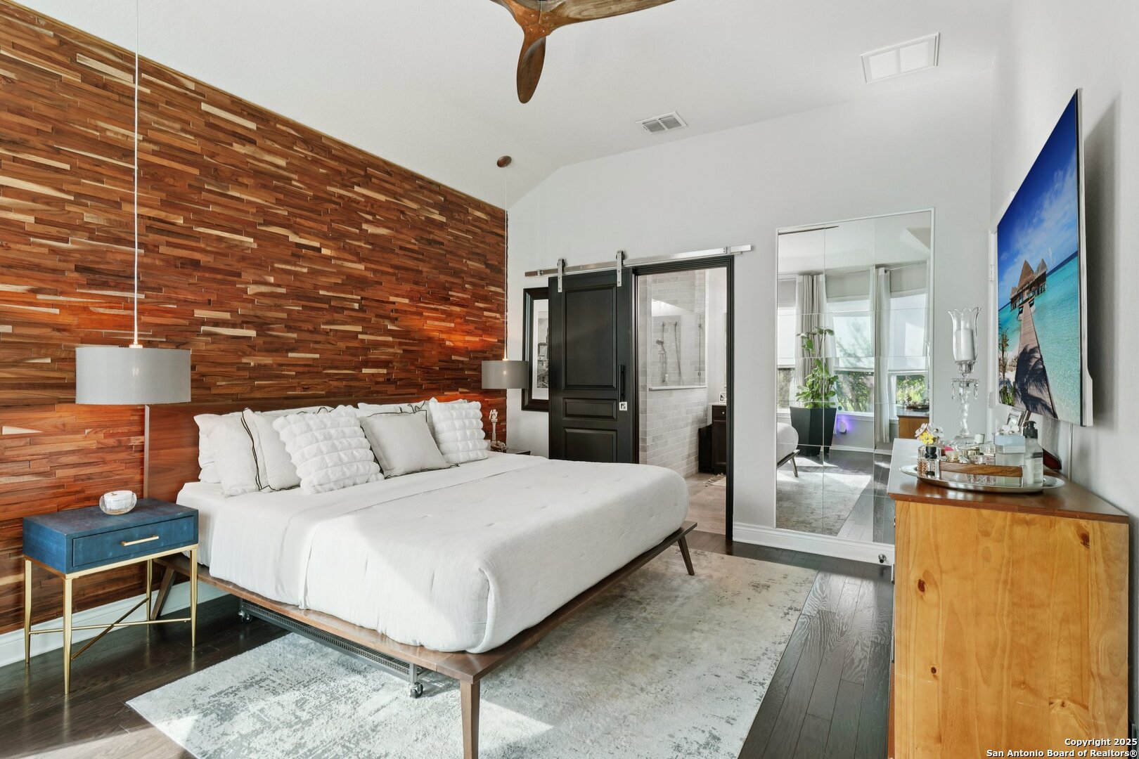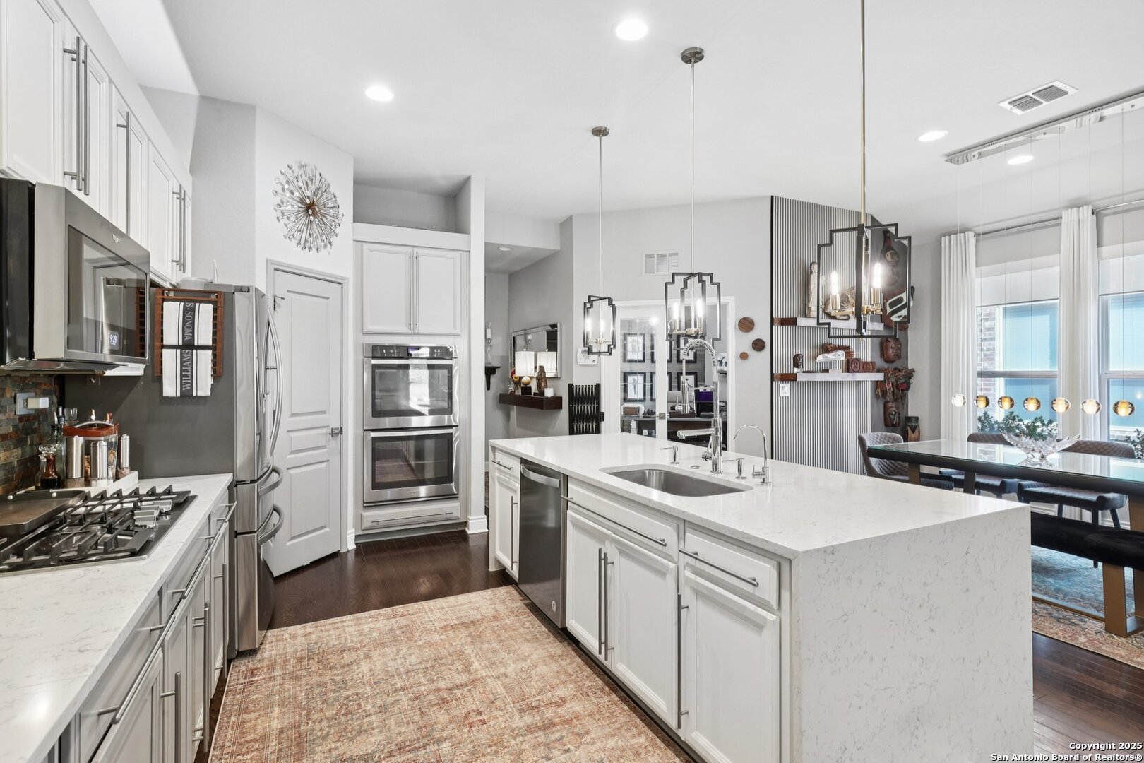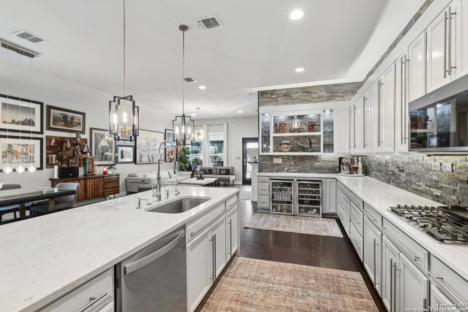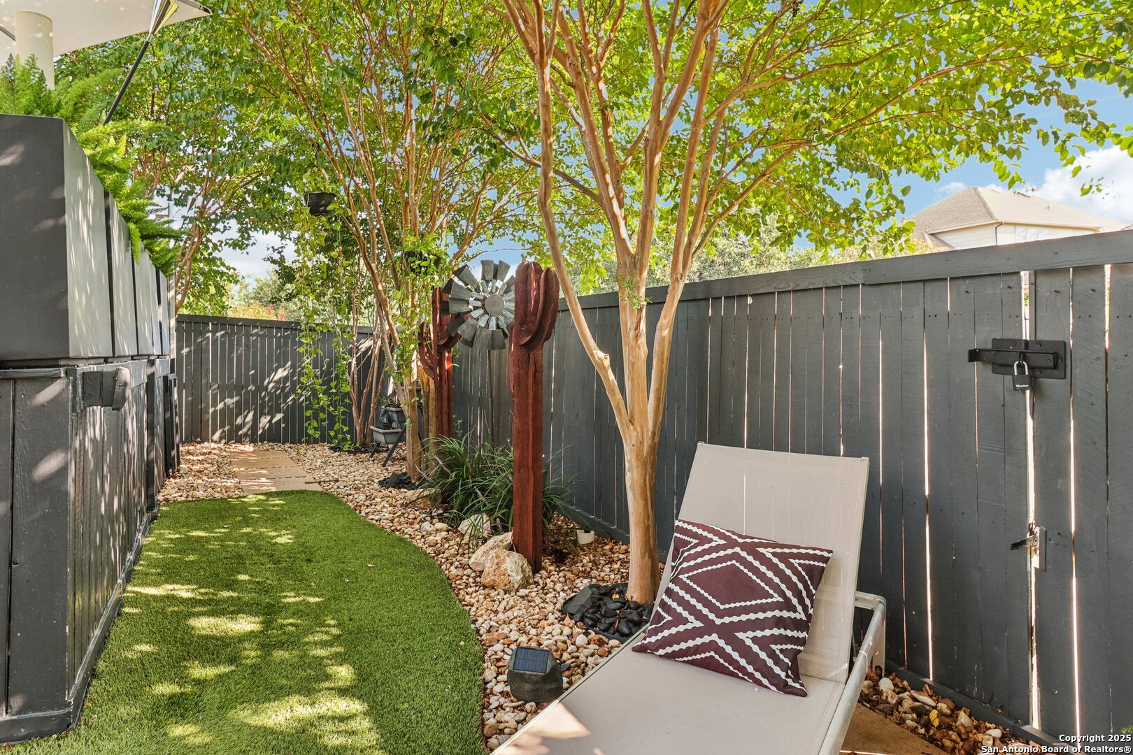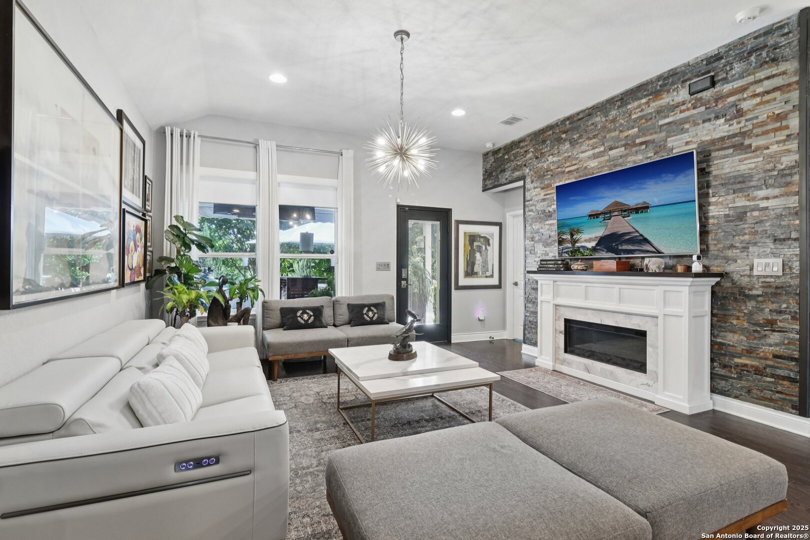 Wow! This home has been beautifully enhanced at every turn! Starting with irresistible curb appeal that features a beautiful insulated garage door, concrete block walk-way, front porch with wood ceiling and heavy wrought iron and glass front door. Step inside to hardwood flooring, gorgeous light fixtures throughout, wood and tile wall treatments and beautiful window coverings! The kitchen has a gas cooktop, extended cabinetry with quartz counter tops, oversized island with waterfall edge, double ovens, 2 wine refrigerators, under-counter lighting and walk-in pantry. The Study has glass french doors. Split Primary bedroom has lovely pendant lights and bath with double vanity & huge walk-in shower. All closets in the home have been cedar lined. Bedrooms 2 & 3 have upgraded, designer carpet. Step out back to a little bit of paradise! Outdoor living at it's finest, with covered, private patio extending to a large deck. The patio has a remote controlled awning for extra shade, stainless steel gas grill, wine fridge and TV. In the artificial turfed backyard you'll find a hot tub and gorgeous landscaping all on a greenbelt for added privacy! Great location, Boerne School district, convenient access to IH 10 and shopping & dining at La Cantera and The Rim.