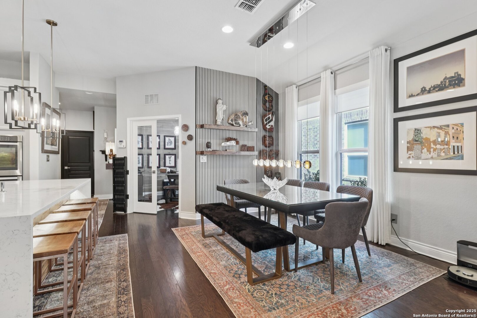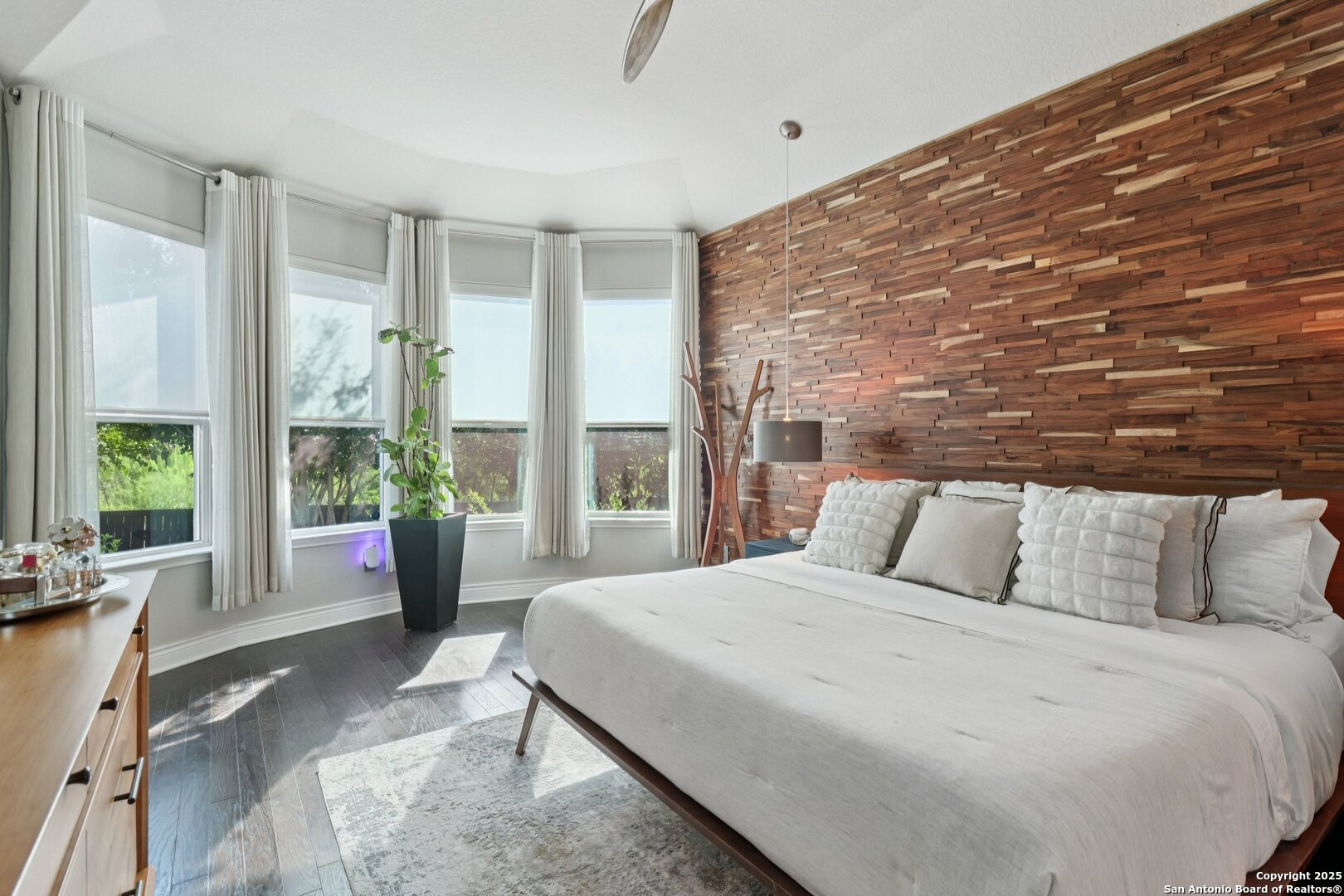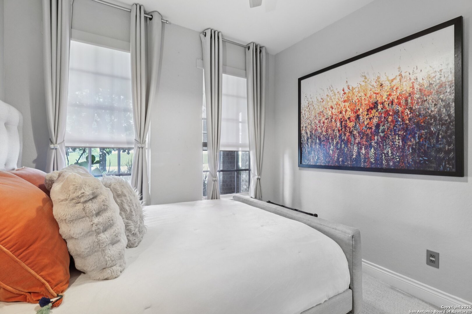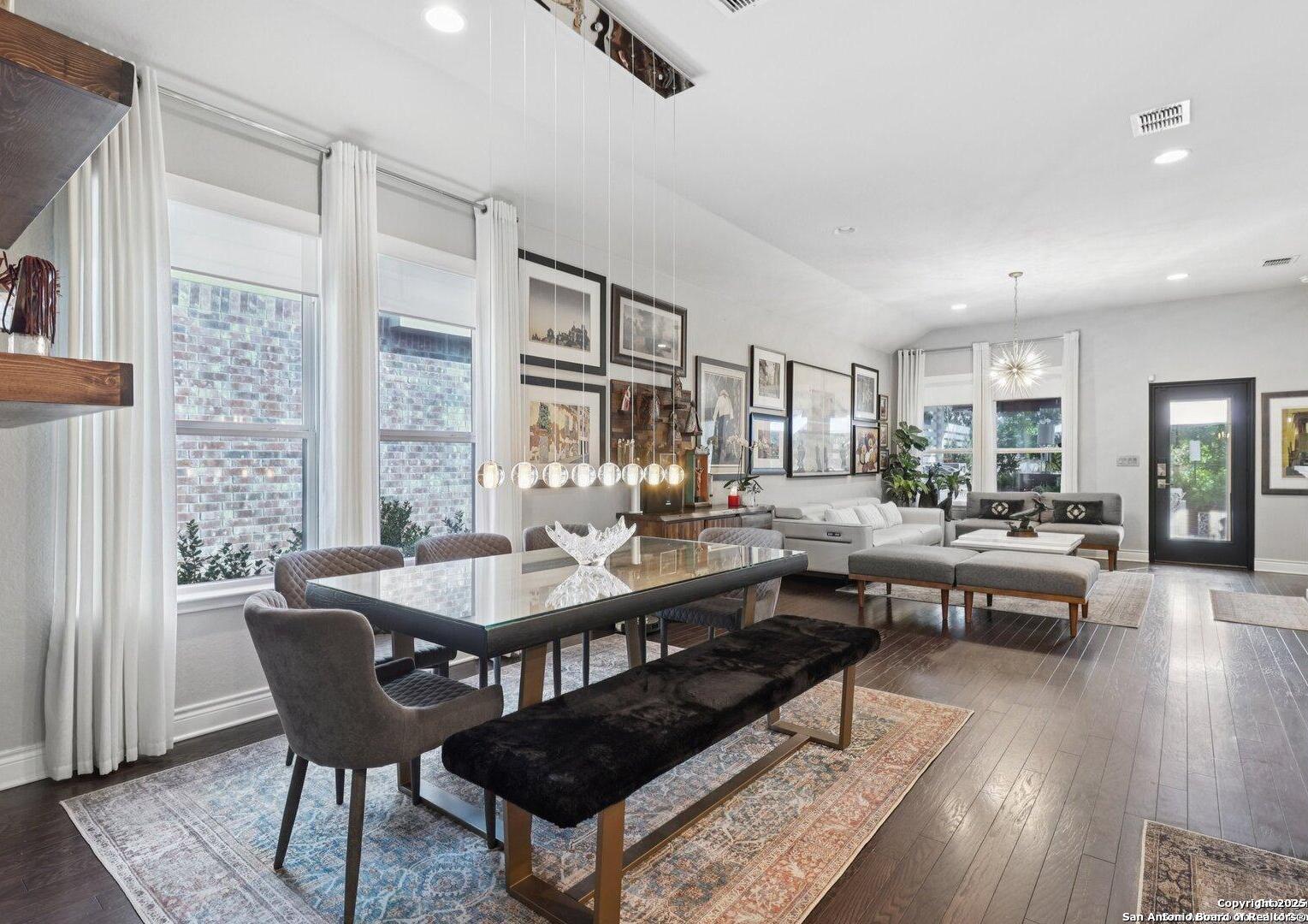 Wow! This home has been beautifully enhanced at every turn! Starting with irresistible curb appeal that features a beautiful insulated garage door, concrete block walk-way, front porch with wood ceiling and heavy wrought iron and glass front door. Step inside to hardwood flooring, gorgeous light fixtures throughout, wood and tile wall treatments and beautiful window coverings! The kitchen has a gas cooktop, extended cabinetry with quartz counter tops, oversized island with waterfall edge, double ovens, 2 wine refrigerators, under-counter lighting and walk-in pantry. The Study has glass french doors. Split Primary bedroom has lovely pendant lights and bath with double vanity & huge walk-in shower. All closets in the home have been cedar lined. Bedrooms 2 & 3 have upgraded, designer carpet. Step out back to a little bit of paradise! Outdoor living at it's finest, with covered, private patio extending to a large deck. The patio has a remote controlled awning for extra shade, stainless steel gas grill, wine fridge and TV. In the artificial turfed backyard you'll find a hot tub and gorgeous landscaping all on a greenbelt for added privacy! Great location, Boerne School district, convenient access to IH 10 and shopping & dining at La Cantera and The Rim.