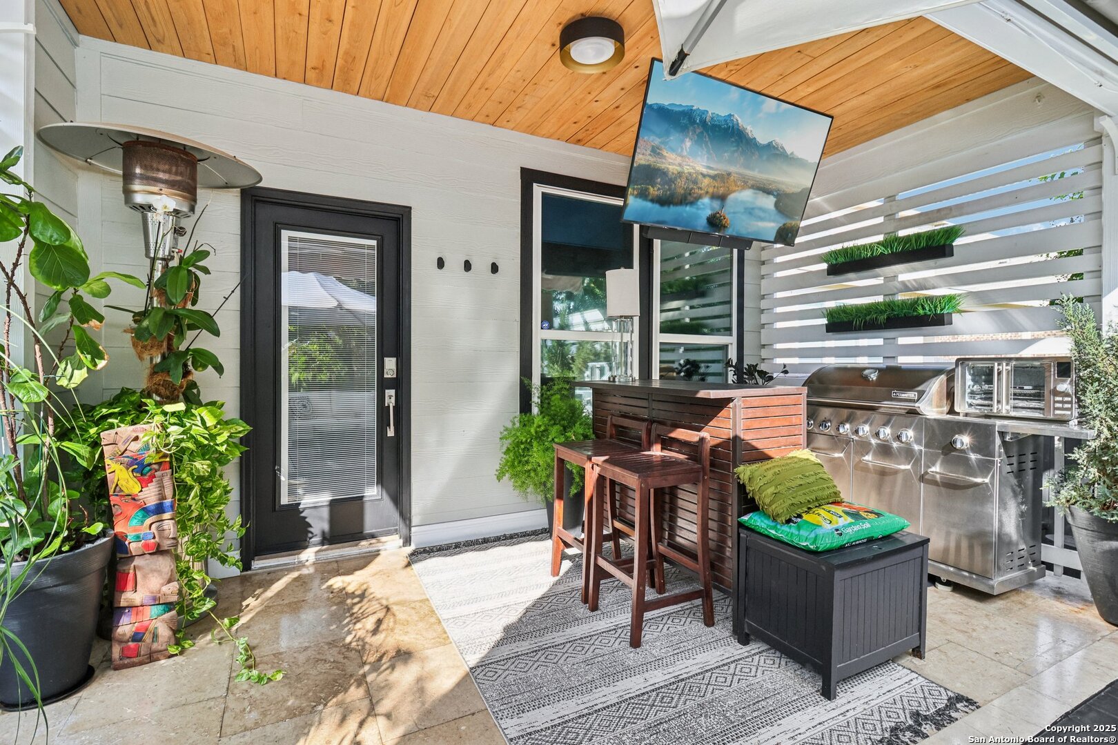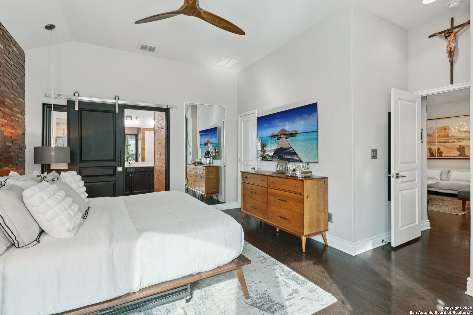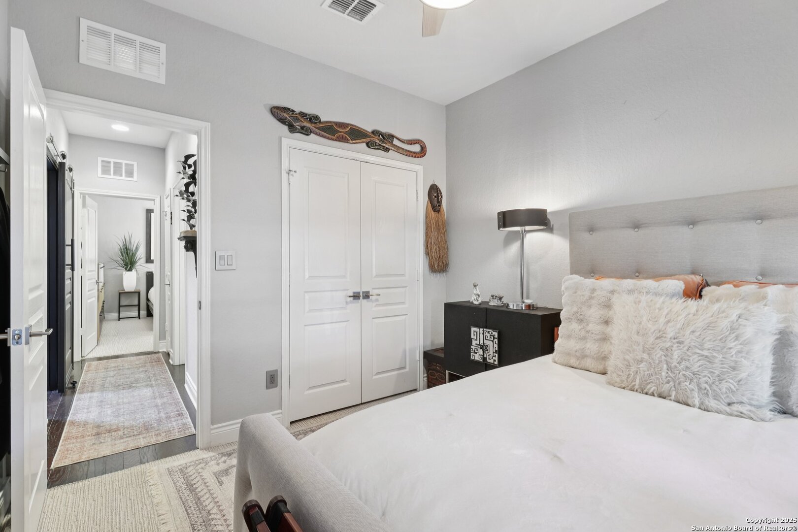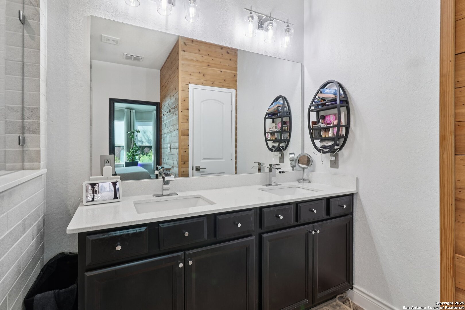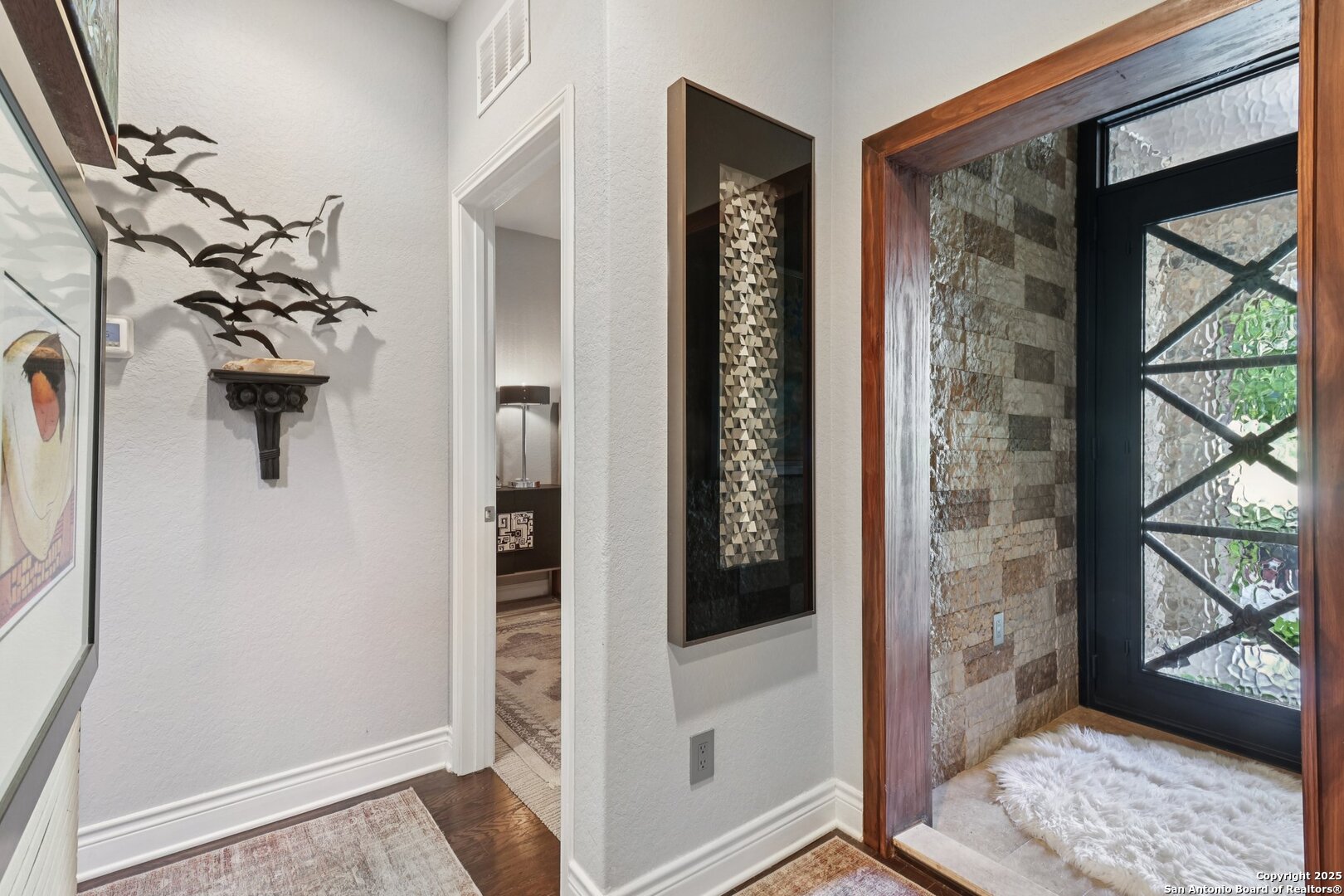 Wow! This home has been beautifully enhanced at every turn! Starting with irresistible curb appeal that features a beautiful insulated garage door, concrete block walk-way, front porch with wood ceiling and heavy wrought iron and glass front door. Step inside to hardwood flooring, gorgeous light fixtures throughout, wood and tile wall treatments and beautiful window coverings! The kitchen has a gas cooktop, extended cabinetry with quartz counter tops, oversized island with waterfall edge, double ovens, 2 wine refrigerators, under-counter lighting and walk-in pantry. The Study has glass french doors. Split Primary bedroom has lovely pendant lights and bath with double vanity & huge walk-in shower. All closets in the home have been cedar lined. Bedrooms 2 & 3 have upgraded, designer carpet. Step out back to a little bit of paradise! Outdoor living at it's finest, with covered, private patio extending to a large deck. The patio has a remote controlled awning for extra shade, stainless steel gas grill, wine fridge and TV. In the artificial turfed backyard you'll find a hot tub and gorgeous landscaping all on a greenbelt for added privacy! Great location, Boerne School district, convenient access to IH 10 and shopping & dining at La Cantera and The Rim.