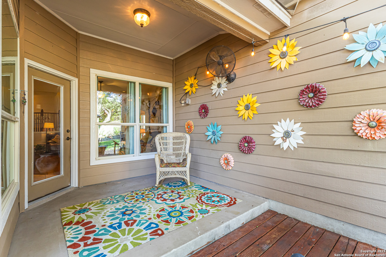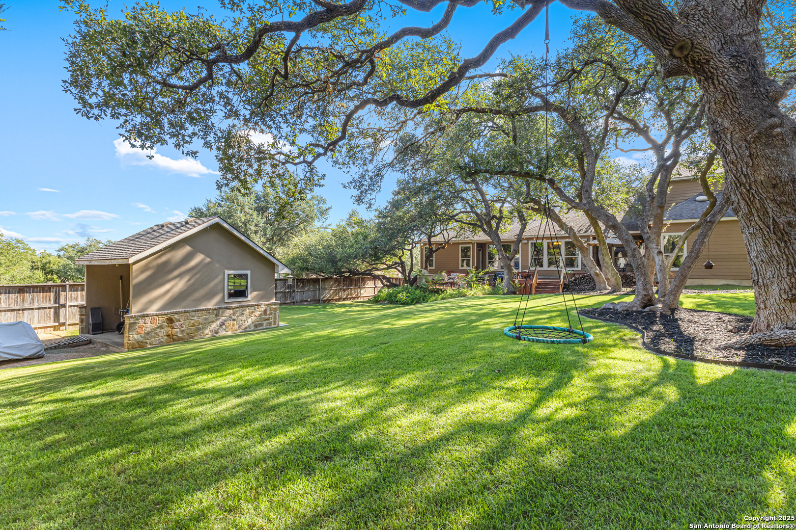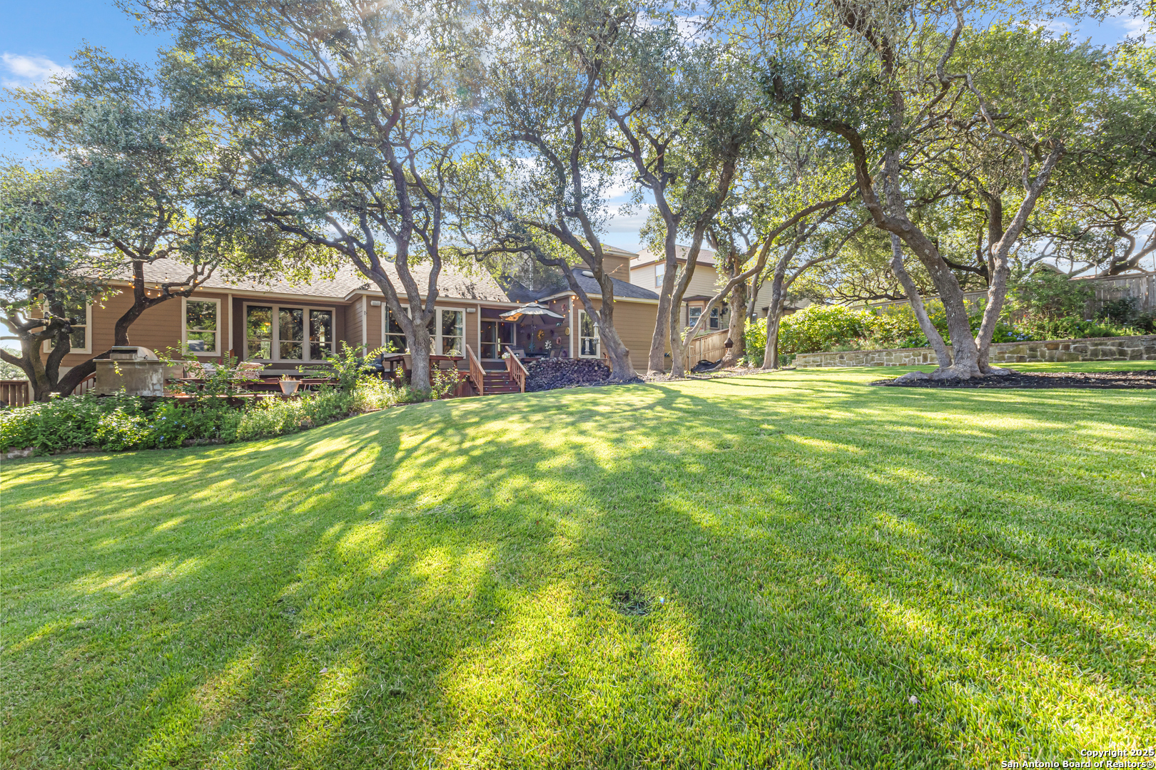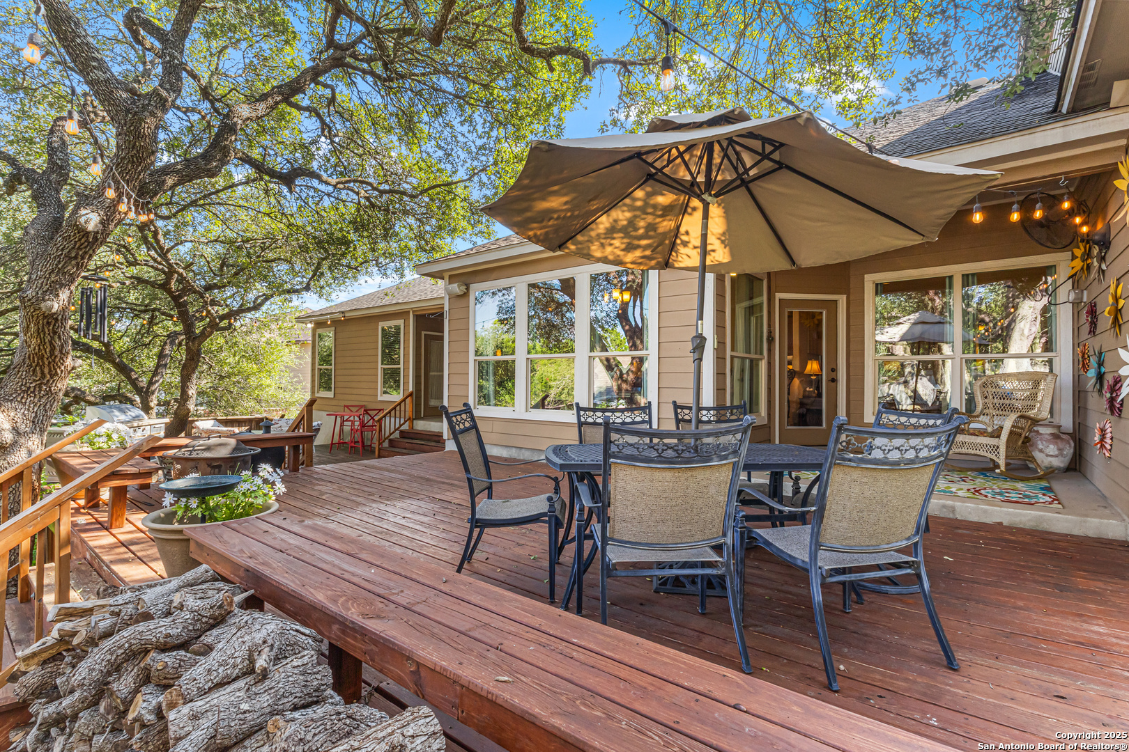 Beautiful 2-story stone and stucco Texas Hill Country home on a spacious 0.56-acre lot in the gated community of Canyon Ranch Estates! Located within highly sought-after Comal ISD, with zoning to Pieper Middle School and Pieper High School. Designed for multigenerational living, this home offers 5 bedrooms (4 downstairs), 4 full bathrooms, and a versatile upstairs flex space that can serve as a second primary suite, game room, or media room. The inviting interior features high ceilings, warm wood flooring, and an open floor plan with 3 living areas and 2 dining areas all on the main level-perfect for gatherings and entertaining. A private study with doors provides a quiet space for working from home. Step outside to enjoy the mature shade trees and a multi-level deck ideal for barbecues, relaxing, or entertaining guests. Extra storage is easy with the included backyard shed. Additional features include a sprinkler system, water softener plumbing and 1 year prepaid American Home Shield Residential Home Warranty. Make this home yours today!