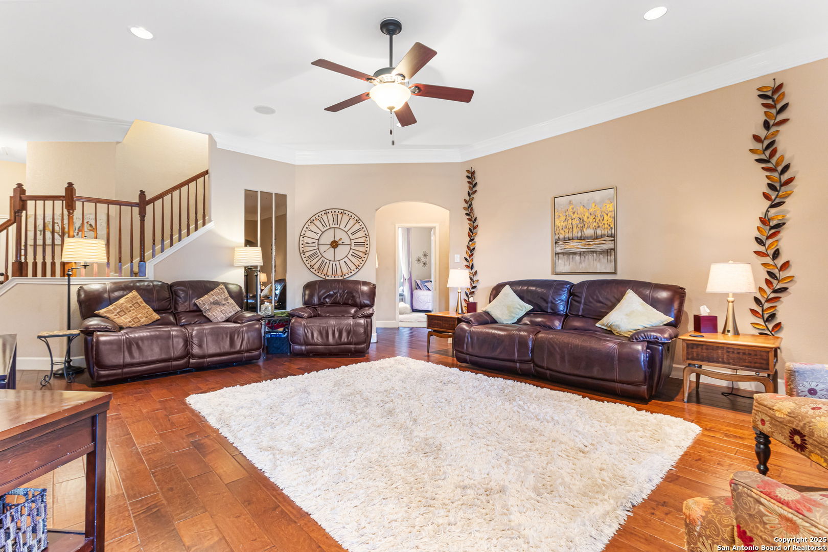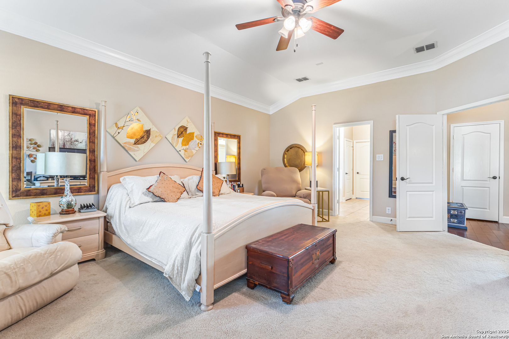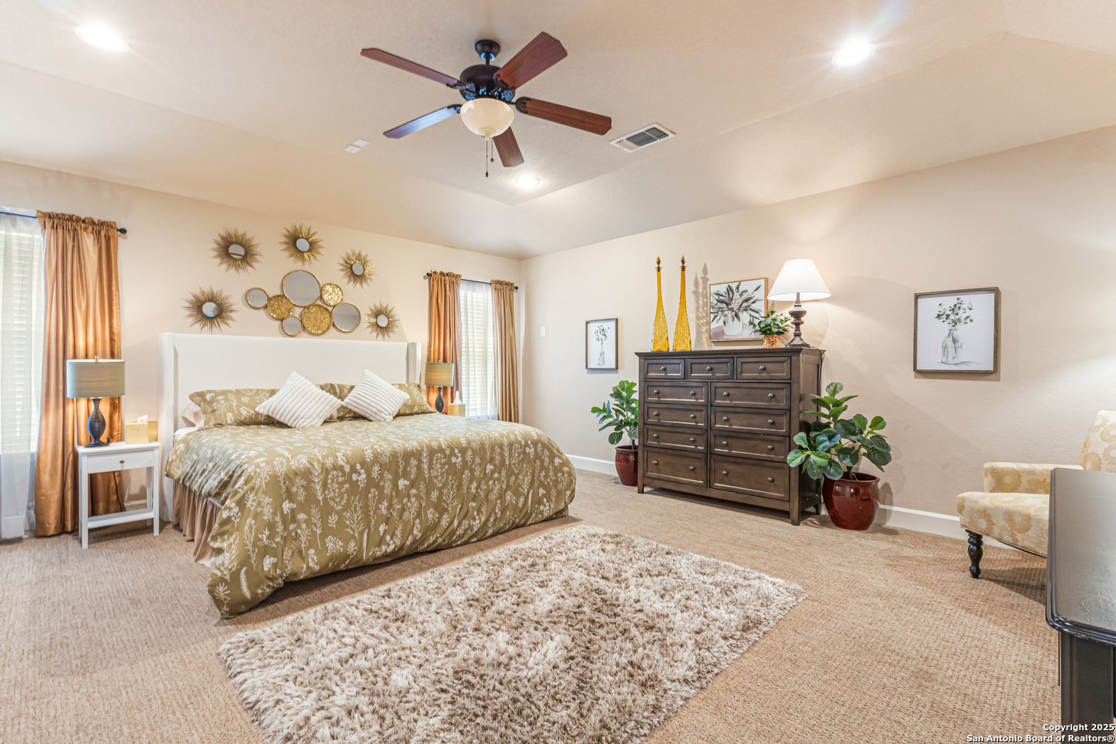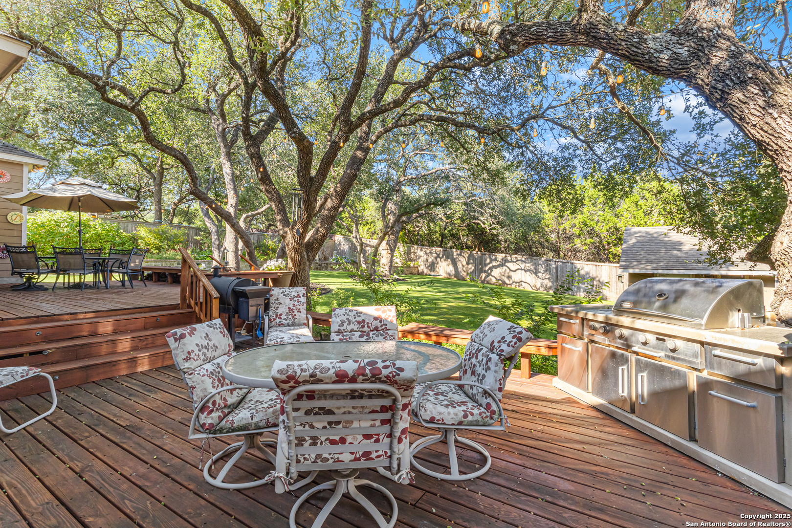 Beautiful 2-story stone and stucco Texas Hill Country home on a spacious 0.56-acre lot in the gated community of Canyon Ranch Estates! Located within highly sought-after Comal ISD, with zoning to Pieper Middle School and Pieper High School. Designed for multigenerational living, this home offers 5 bedrooms (4 downstairs), 4 full bathrooms, and a versatile upstairs flex space that can serve as a second primary suite, game room, or media room. The inviting interior features high ceilings, warm wood flooring, and an open floor plan with 3 living areas and 2 dining areas all on the main level-perfect for gatherings and entertaining. A private study with doors provides a quiet space for working from home. Step outside to enjoy the mature shade trees and a multi-level deck ideal for barbecues, relaxing, or entertaining guests. Extra storage is easy with the included backyard shed. Additional features include a sprinkler system, water softener plumbing and 1 year prepaid American Home Shield Residential Home Warranty. Make this home yours today!