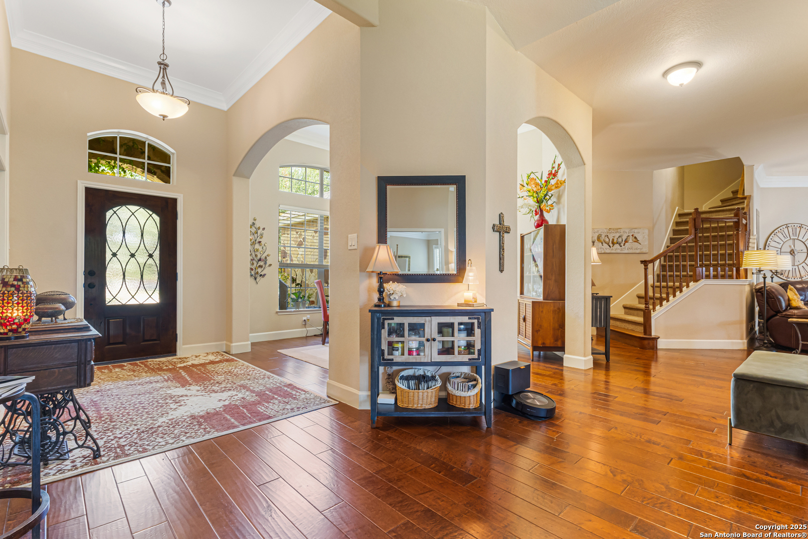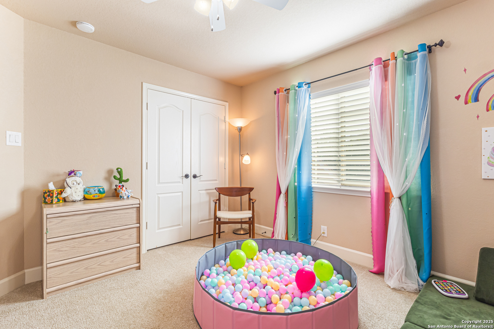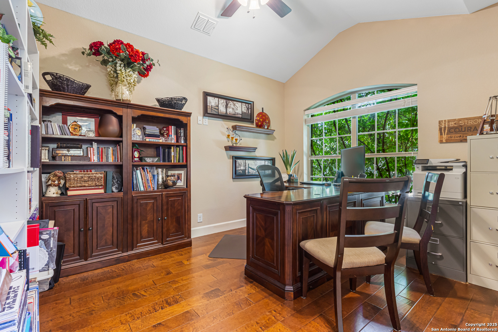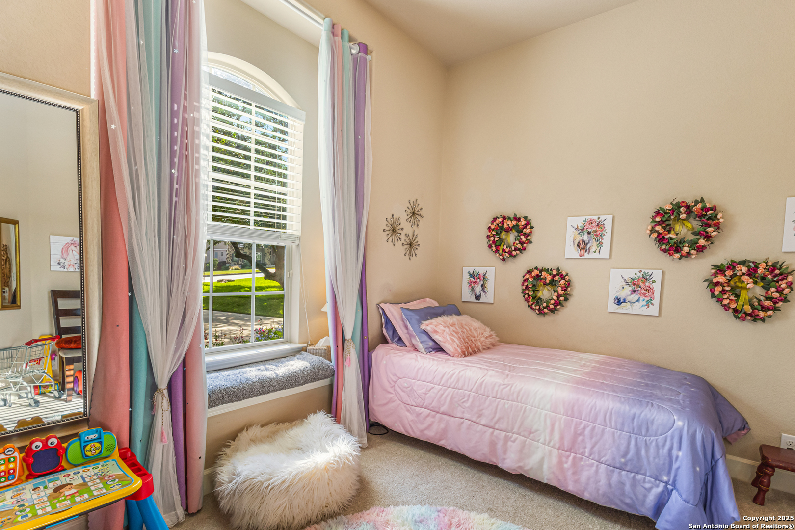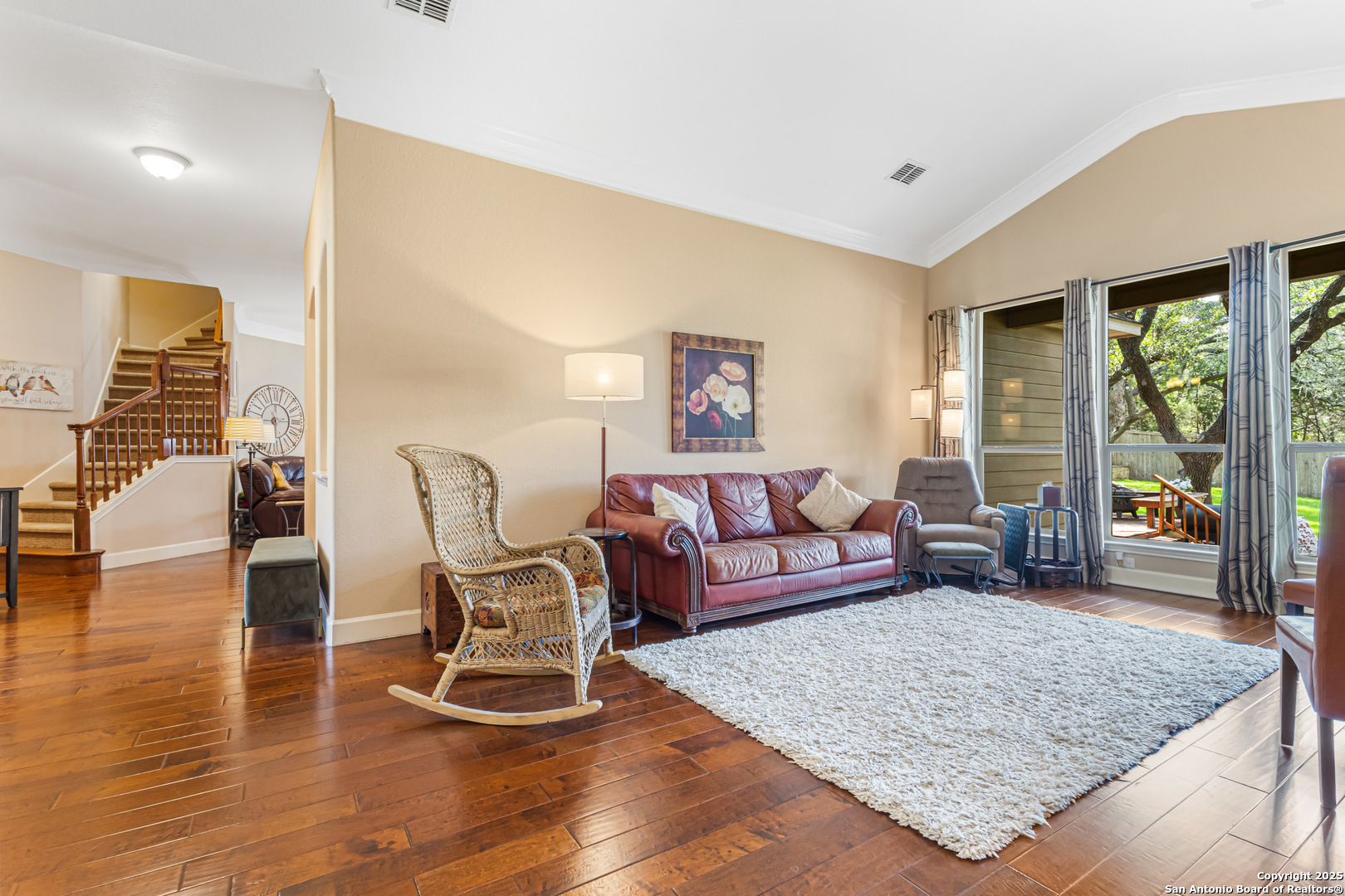 Beautiful 2-story stone and stucco Texas Hill Country home on a spacious 0.56-acre lot in the gated community of Canyon Ranch Estates! Located within highly sought-after Comal ISD, with zoning to Pieper Middle School and Pieper High School. Designed for multigenerational living, this home offers 5 bedrooms (4 downstairs), 4 full bathrooms, and a versatile upstairs flex space that can serve as a second primary suite, game room, or media room. The inviting interior features high ceilings, warm wood flooring, and an open floor plan with 3 living areas and 2 dining areas all on the main level-perfect for gatherings and entertaining. A private study with doors provides a quiet space for working from home. Step outside to enjoy the mature shade trees and a multi-level deck ideal for barbecues, relaxing, or entertaining guests. Extra storage is easy with the included backyard shed. Additional features include a sprinkler system, water softener plumbing and 1 year prepaid American Home Shield Residential Home Warranty. Make this home yours today!