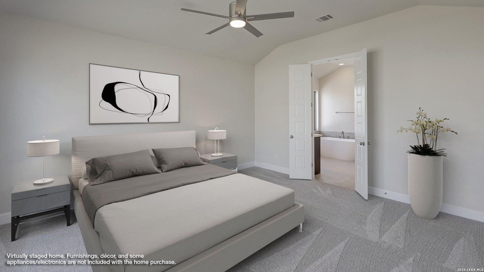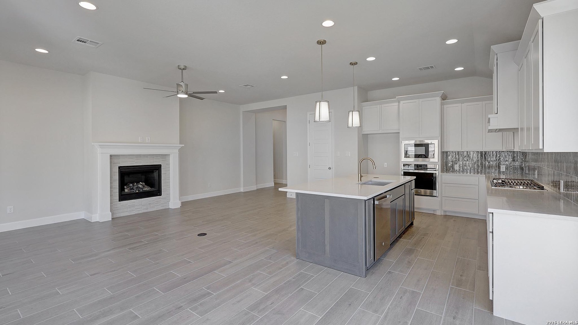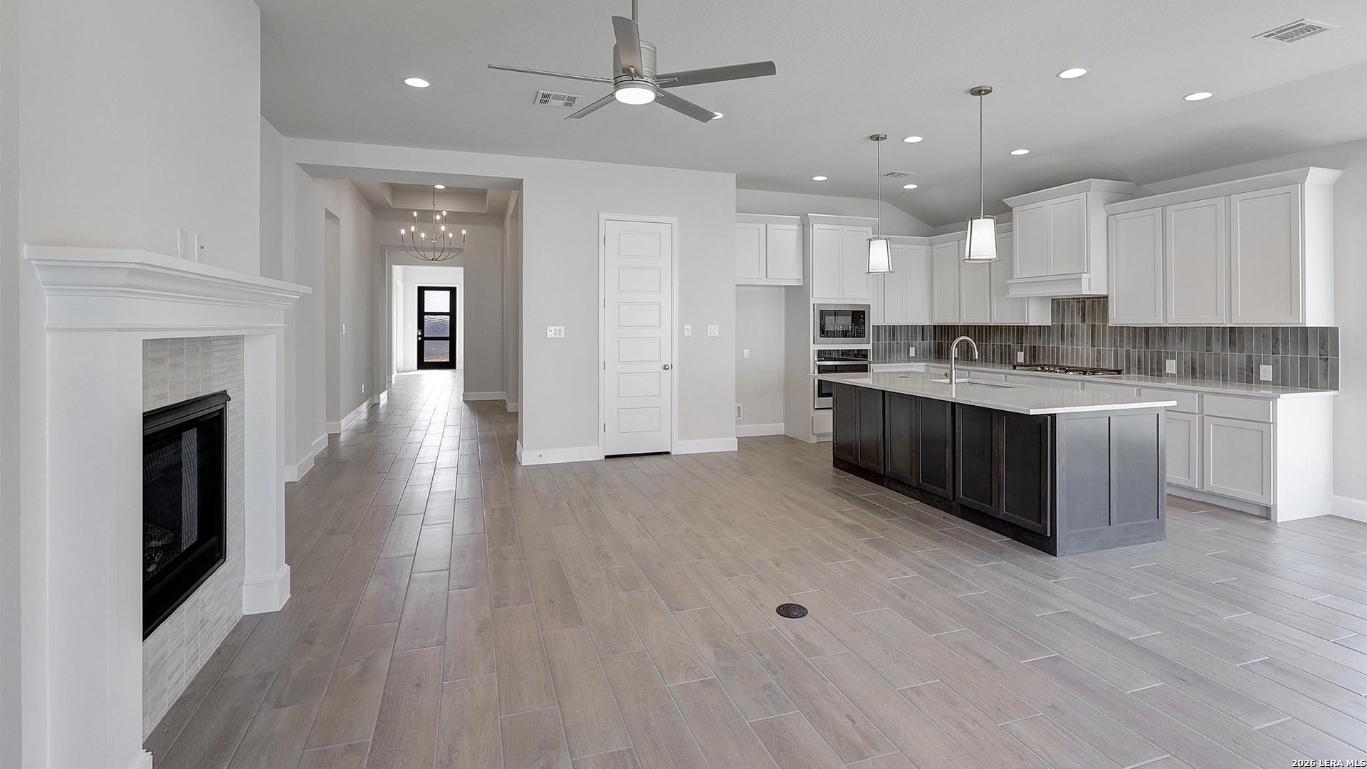 Extended entry with 12-foot ceiling. Home office with French doors off the main hallway. Game room with French doors for added entertainment. Open family room extends through the dining area and kitchen. Island kitchen with a walk-in pantry and 5-burner gas cooktop. Secluded primary suite features French doors, dual vanities, separate glass enclosed shower, garden tub, and a large walk-in closet in the primary bath. Guest suite with full bathroom and walk-in closet. Utility room with linen closet. Covered backyard patio. Two-car garage.