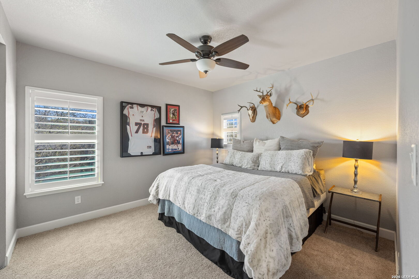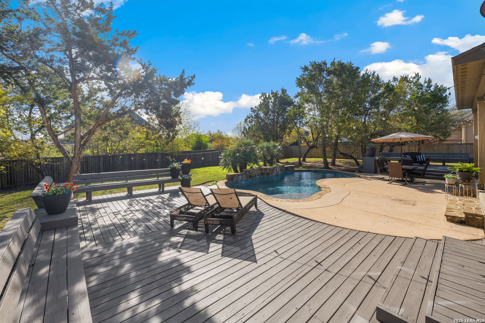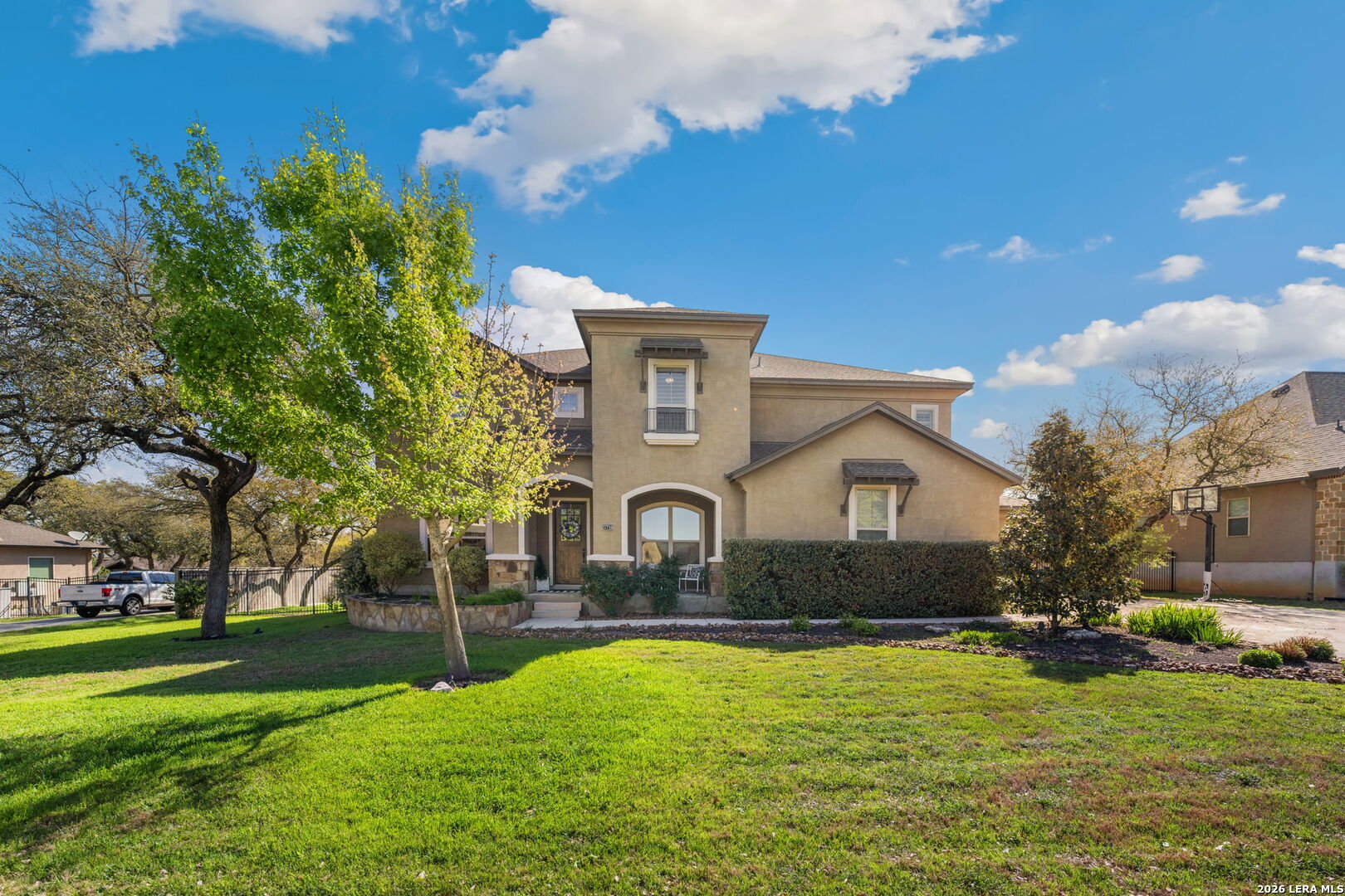Welcome to this exceptional one-owner home in the gated community of Venado Creek, located within highly sought-after Comal ISD. Situated on just over half an acre, this 5-bedroom, 3.5-bath home offers 3,831 square feet of thoughtfully designed living space and an incredible backyard, with pool, built for entertaining. Built in 2013 and meticulously maintained, the home features a functional layout with the primary suite on the main level, complemented by rich wood flooring throughout the downstairs living areas. Recent updates include fresh interior paint and new carpet upstairs, creating a clean, move-in ready feel. The grand entry welcomes you with soaring ceilings and an elegant staircase, opening into a light-filled living area with expansive windows, plantation shutters, and a cozy fireplace. The open-concept design flows seamlessly into the spacious kitchen, complete with an oversized island, abundant custom cabinetry, gas range, and ideal sightlines for both everyday living and entertaining. A dedicated home office provides flexibility for remote work, while upstairs offers a large game room and generously sized secondary bedrooms. Additional features include an interior sound system, sprinkler system, and a three-car garage with a split layout, including a separate front-facing bay ideal for a golf cart, storage, or workshop space. Step outside to your private backyard retreat featuring a custom-built pool with water feature, an expansive deck, and a covered patio designed for year-round enjoyment. Surrounded by mature trees and set on over half an acre, the property offers a rare sense of space and privacy. With limited inventory in Venado Creek and access to top-rated schools including Timberwood Park Elementary, Pieper Middle, and Pieper High School, this home presents a rare opportunity to own a move-in ready property with exceptional indoor and outdoor living. Minutes from 281 & 1604.