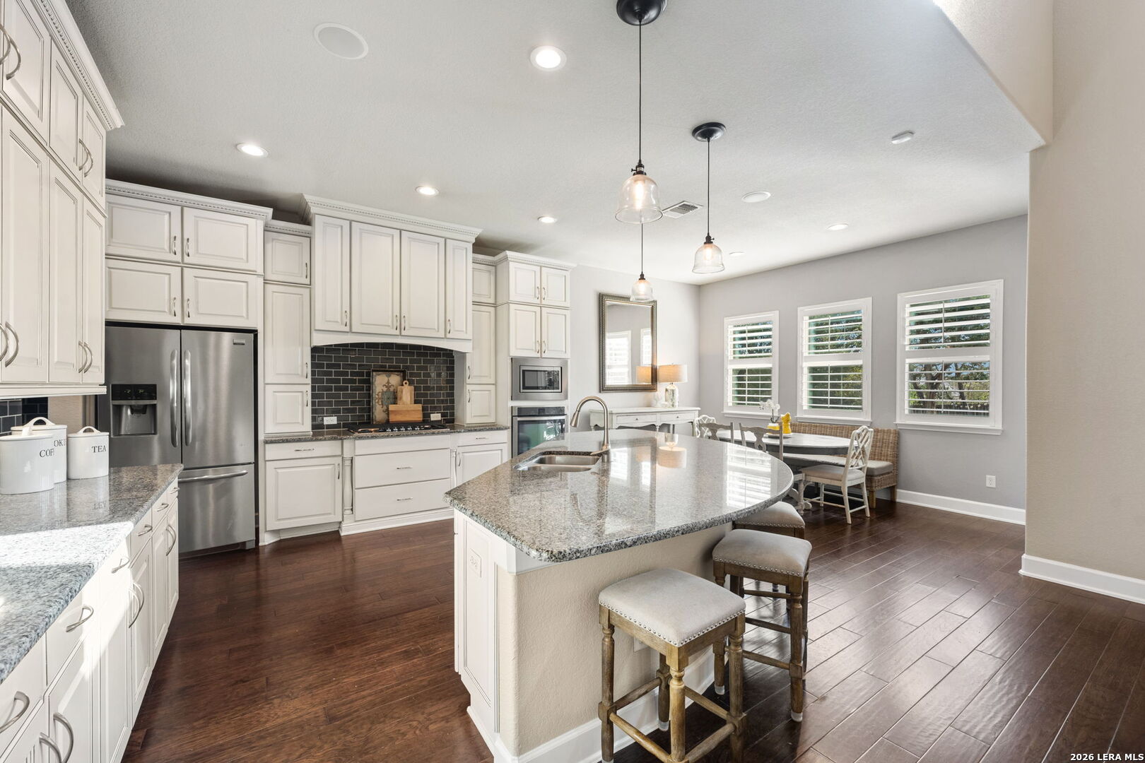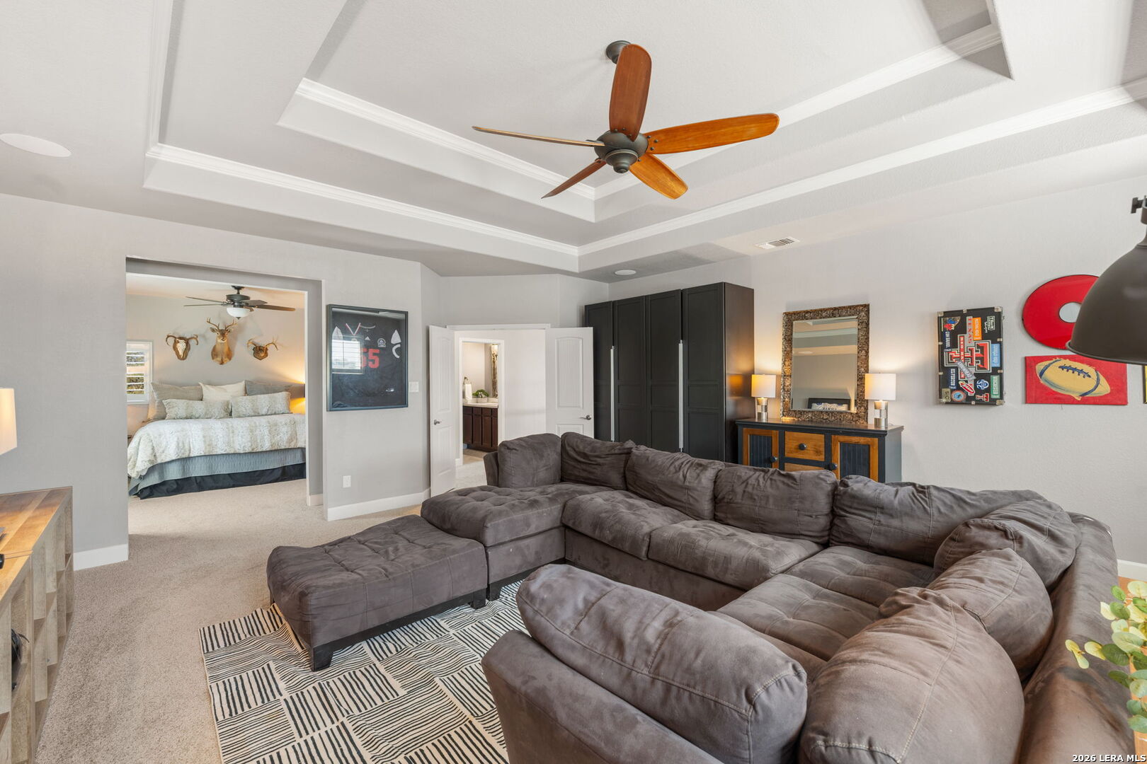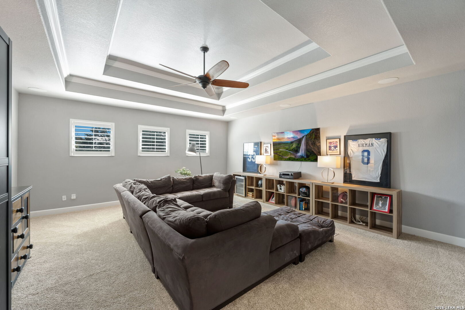 Welcome to this exceptional one-owner home in the gated community of Venado Creek, located within highly sought-after Comal ISD. Situated on just over half an acre, this 5-bedroom, 3.5-bath home offers 3,831 square feet of thoughtfully designed living space and an incredible backyard, with pool, built for entertaining. Built in 2013 and meticulously maintained, the home features a functional layout with the primary suite on the main level, complemented by rich wood flooring throughout the downstairs living areas. Recent updates include fresh interior paint and new carpet upstairs, creating a clean, move-in ready feel. The grand entry welcomes you with soaring ceilings and an elegant staircase, opening into a light-filled living area with expansive windows, plantation shutters, and a cozy fireplace. The open-concept design flows seamlessly into the spacious kitchen, complete with an oversized island, abundant custom cabinetry, gas range, and ideal sightlines for both everyday living and entertaining. A dedicated home office provides flexibility for remote work, while upstairs offers a large game room and generously sized secondary bedrooms. Additional features include an interior sound system, sprinkler system, and a three-car garage with a split layout, including a separate front-facing bay ideal for a golf cart, storage, or workshop space. Step outside to your private backyard retreat featuring a custom-built pool with water feature, an expansive deck, and a covered patio designed for year-round enjoyment. Surrounded by mature trees and set on over half an acre, the property offers a rare sense of space and privacy. With limited inventory in Venado Creek and access to top-rated schools including Timberwood Park Elementary, Pieper Middle, and Pieper High School, this home presents a rare opportunity to own a move-in ready property with exceptional indoor and outdoor living. Minutes from 281 & 1604.