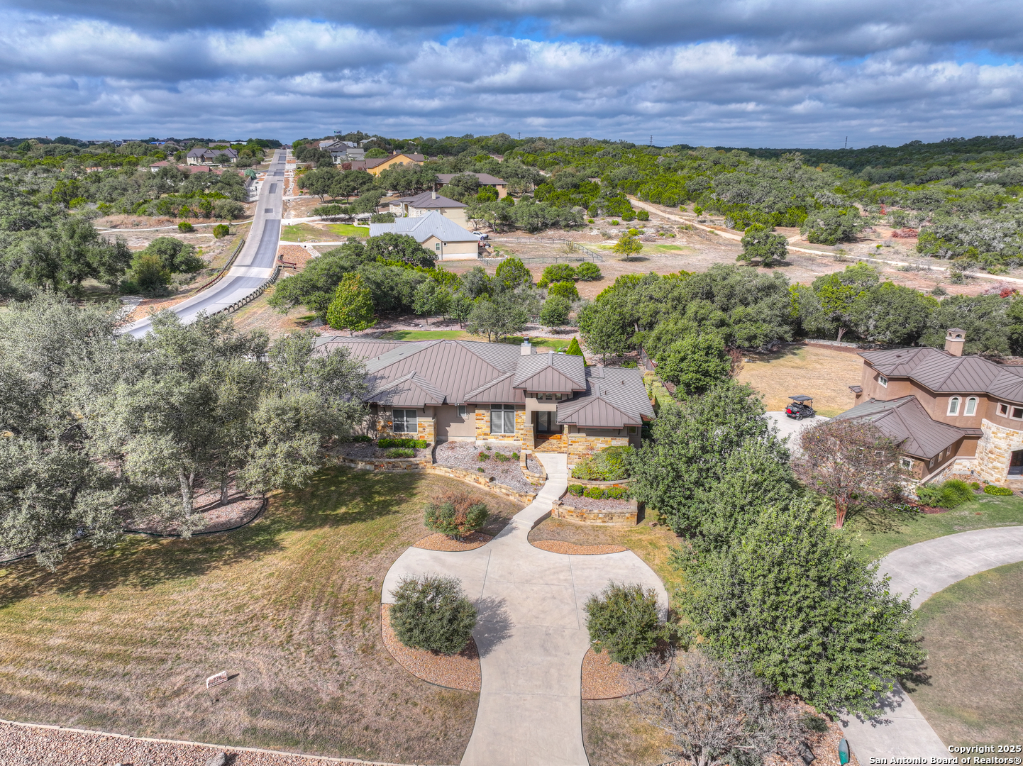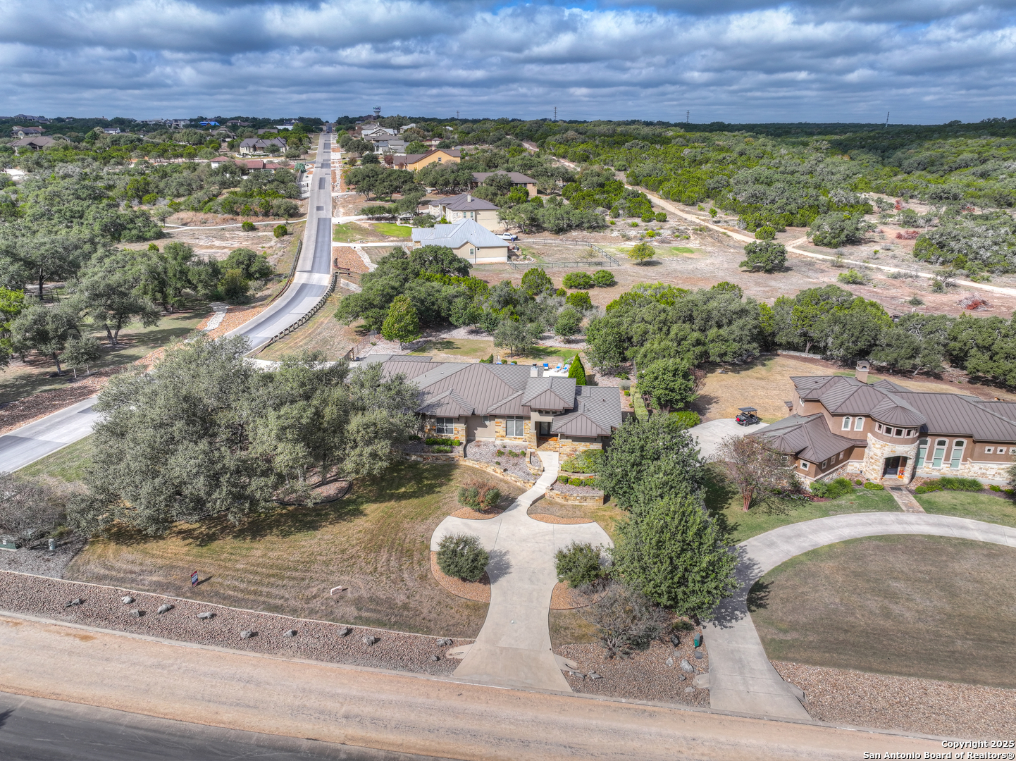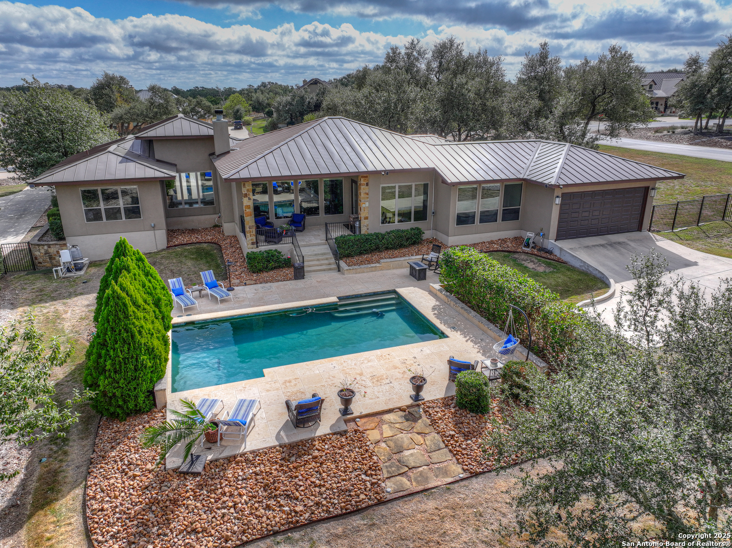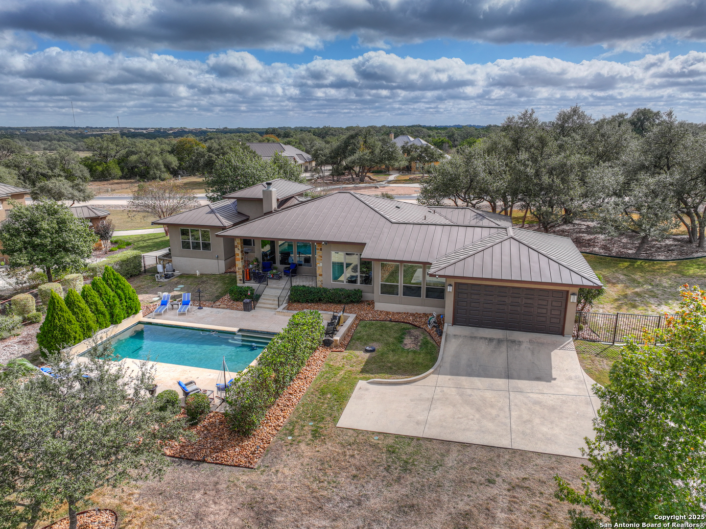 Stunning David Mills custom home in gated Copper Ridge! This luxury 4-bedroom, 3.5-bath residence sits on a 1-acre park-like corner lot with a private gated rear entry and exceptional curb appeal. Mature oaks, professional lighting, sprinkler system & elevated stone beds surround this elegant property, offering both privacy & beauty in one of New Braunfels' premier Hill Country communities. Inside, the open-concept floor plan showcases hardwood floors, soaring ceilings, & picture windows that fill the home with natural light. The spacious living room features gas fire logs & trayed ceilings with dimmable lighting. The gourmet kitchen boasts granite countertops, Bosch stainless appliances, Thermador gas cooktop, soft-close drawers, & a large walk-in pantry. The oversized primary suite includes dual vanities, honed granite counters, a soaking tub, & a large walk-in shower with a rain shower head, plus a custom closet with built-ins. Three of the four bedrooms include private ensuites, upgraded carpet, & 1/2" memory foam pad with spill guard. All bedrooms feature walk-in closets. The fourth bedroom, located near the front door, is currently used as an office. Additional features include a dedicated office, game/theater room, mudroom area with built-in bench, & a laundry room with granite counters, sink, cabinetry, & space for a refrigerator. The epoxy-floored garage offers 2 workrooms, tankless water heaters, water softener, extra attic decking, & the home is wired and equipped with speakers for surround sound inside & out. New main AC unit (April 2025) ensures year-round comfort. Step outside to your custom Keith Zars pool, perfectly positioned for privacy with no rear neighbor in view. Enjoy walking distance to the community park, pickleball and basketball courts, pool, pavilion, & mailboxes. Experience luxury Hill Country living in New Braunfels-a rare combination of craftsmanship, comfort, and lifestyle in Copper Ridge.