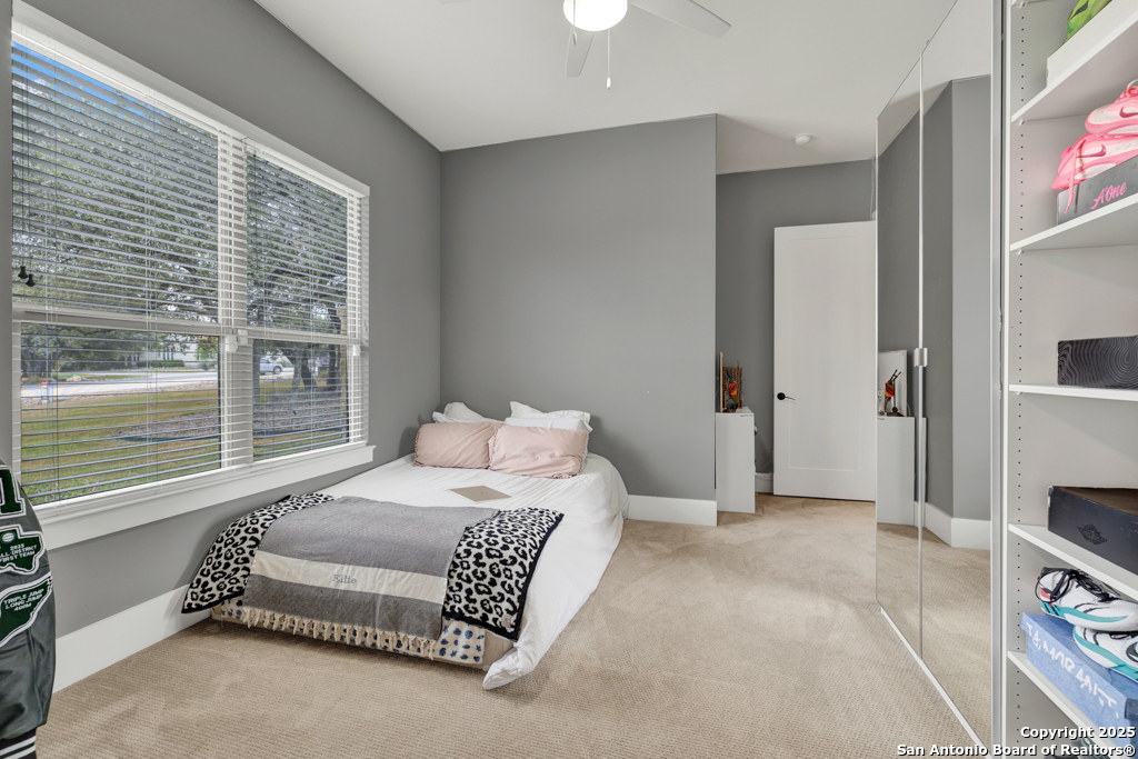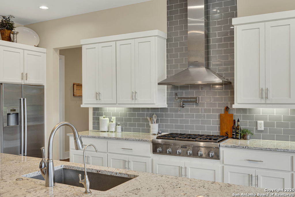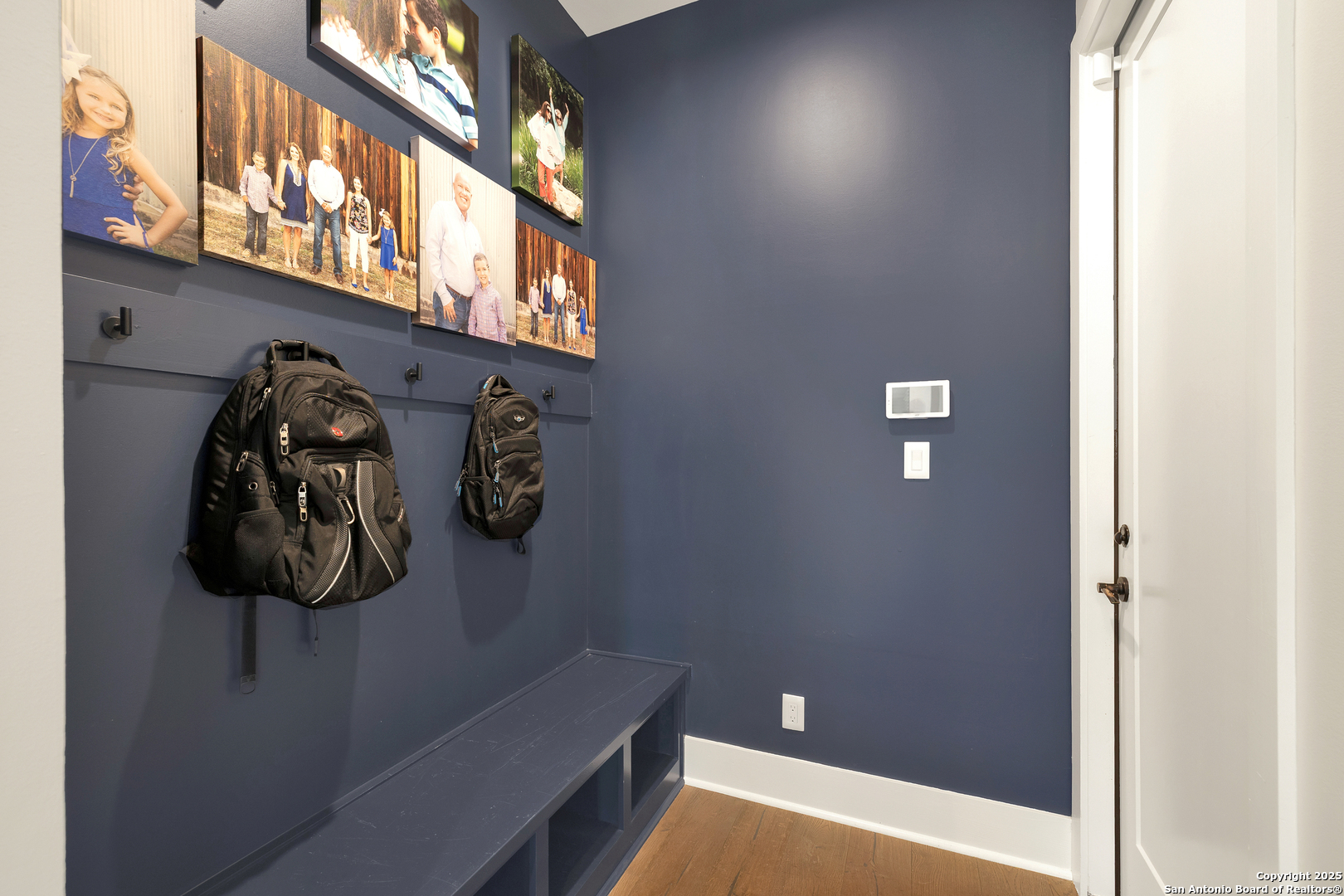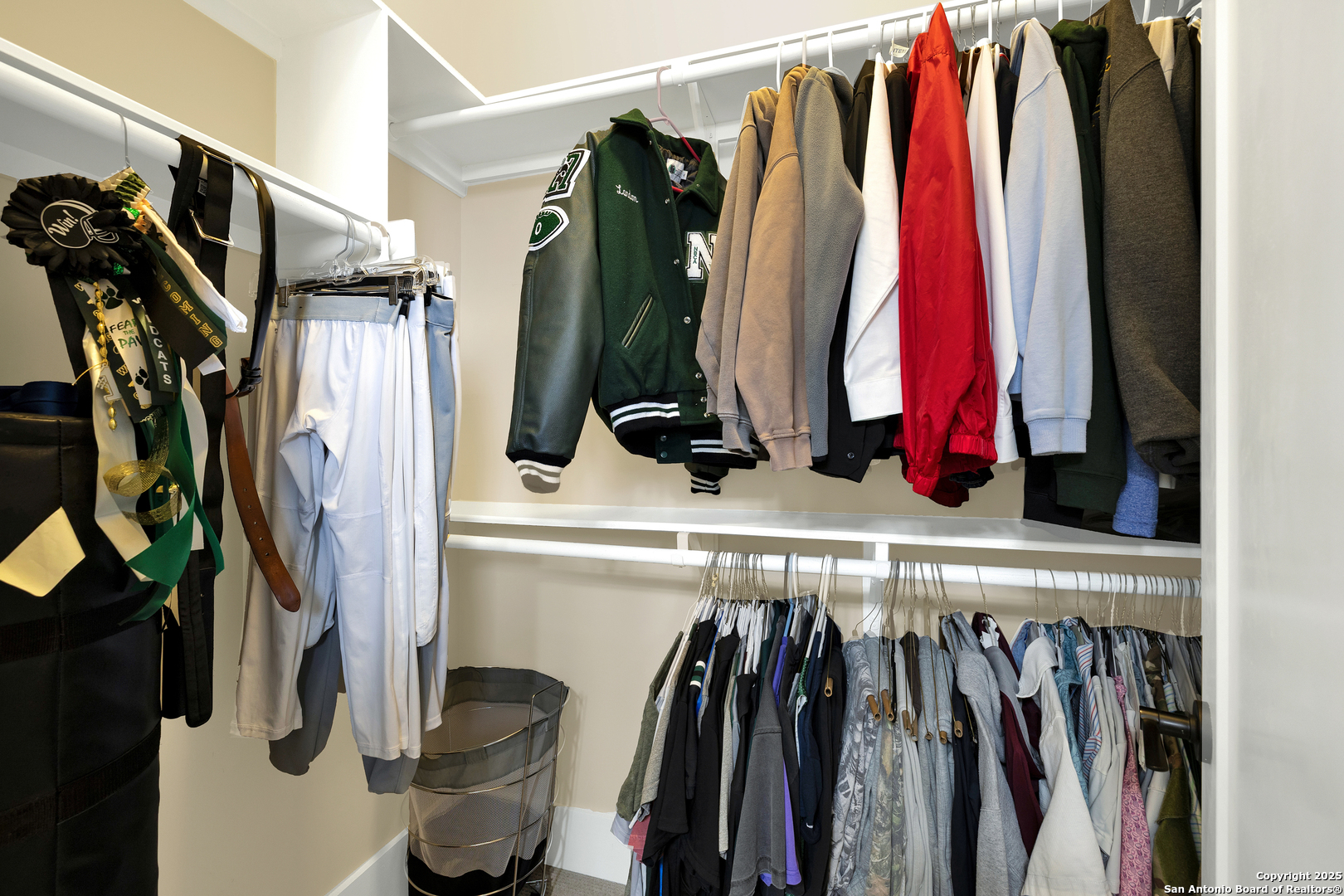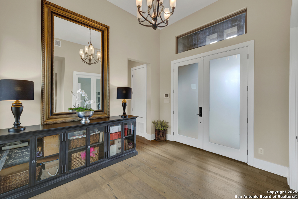 Stunning David Mills custom home in gated Copper Ridge! This luxury 4-bedroom, 3.5-bath residence sits on a 1-acre park-like corner lot with a private gated rear entry and exceptional curb appeal. Mature oaks, professional lighting, sprinkler system & elevated stone beds surround this elegant property, offering both privacy & beauty in one of New Braunfels' premier Hill Country communities. Inside, the open-concept floor plan showcases hardwood floors, soaring ceilings, & picture windows that fill the home with natural light. The spacious living room features gas fire logs & trayed ceilings with dimmable lighting. The gourmet kitchen boasts granite countertops, Bosch stainless appliances, Thermador gas cooktop, soft-close drawers, & a large walk-in pantry. The oversized primary suite includes dual vanities, honed granite counters, a soaking tub, & a large walk-in shower with a rain shower head, plus a custom closet with built-ins. Three of the four bedrooms include private ensuites, upgraded carpet, & 1/2" memory foam pad with spill guard. All bedrooms feature walk-in closets. The fourth bedroom, located near the front door, is currently used as an office. Additional features include a dedicated office, game/theater room, mudroom area with built-in bench, & a laundry room with granite counters, sink, cabinetry, & space for a refrigerator. The epoxy-floored garage offers 2 workrooms, tankless water heaters, water softener, extra attic decking, & the home is wired and equipped with speakers for surround sound inside & out. New main AC unit (April 2025) ensures year-round comfort. Step outside to your custom Keith Zars pool, perfectly positioned for privacy with no rear neighbor in view. Enjoy walking distance to the community park, pickleball and basketball courts, pool, pavilion, & mailboxes. Experience luxury Hill Country living in New Braunfels-a rare combination of craftsmanship, comfort, and lifestyle in Copper Ridge.
