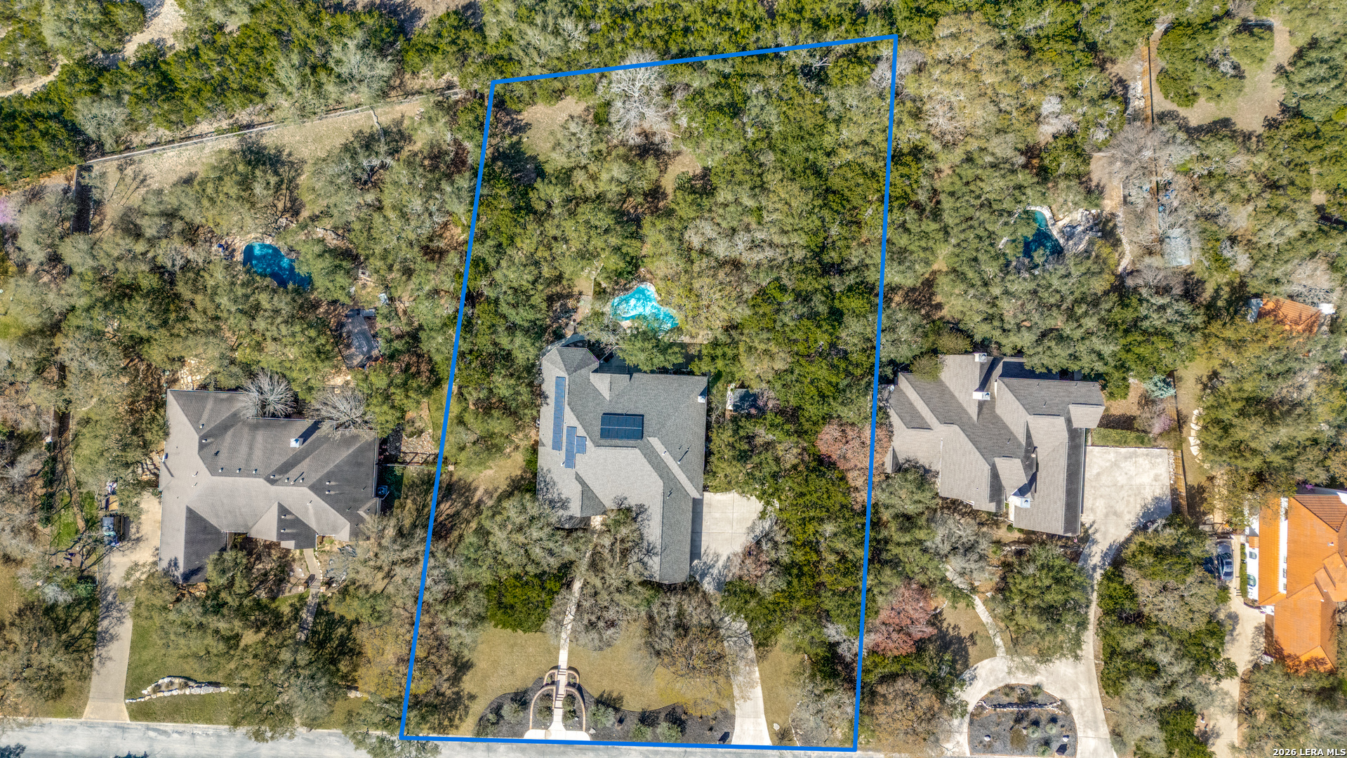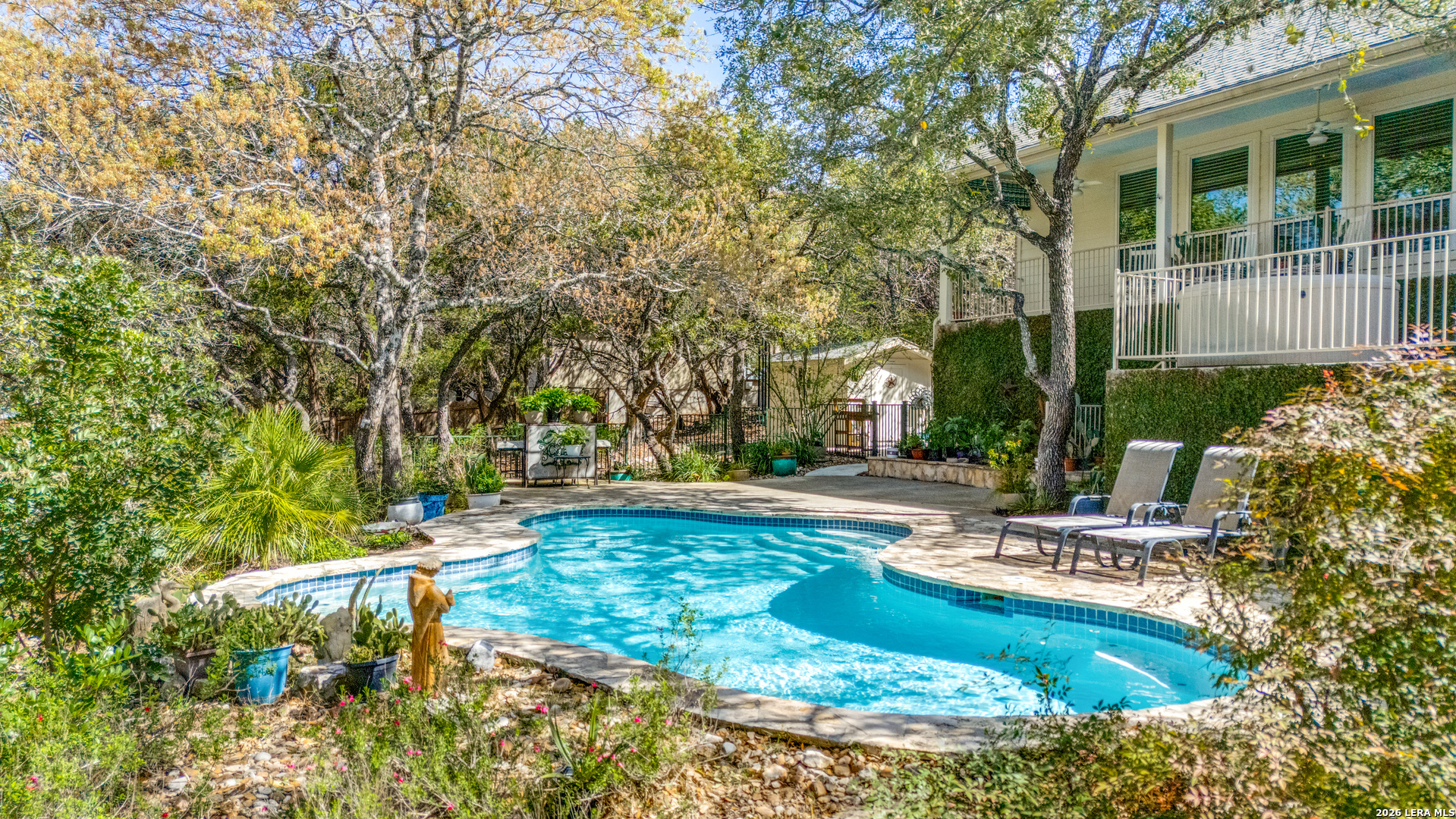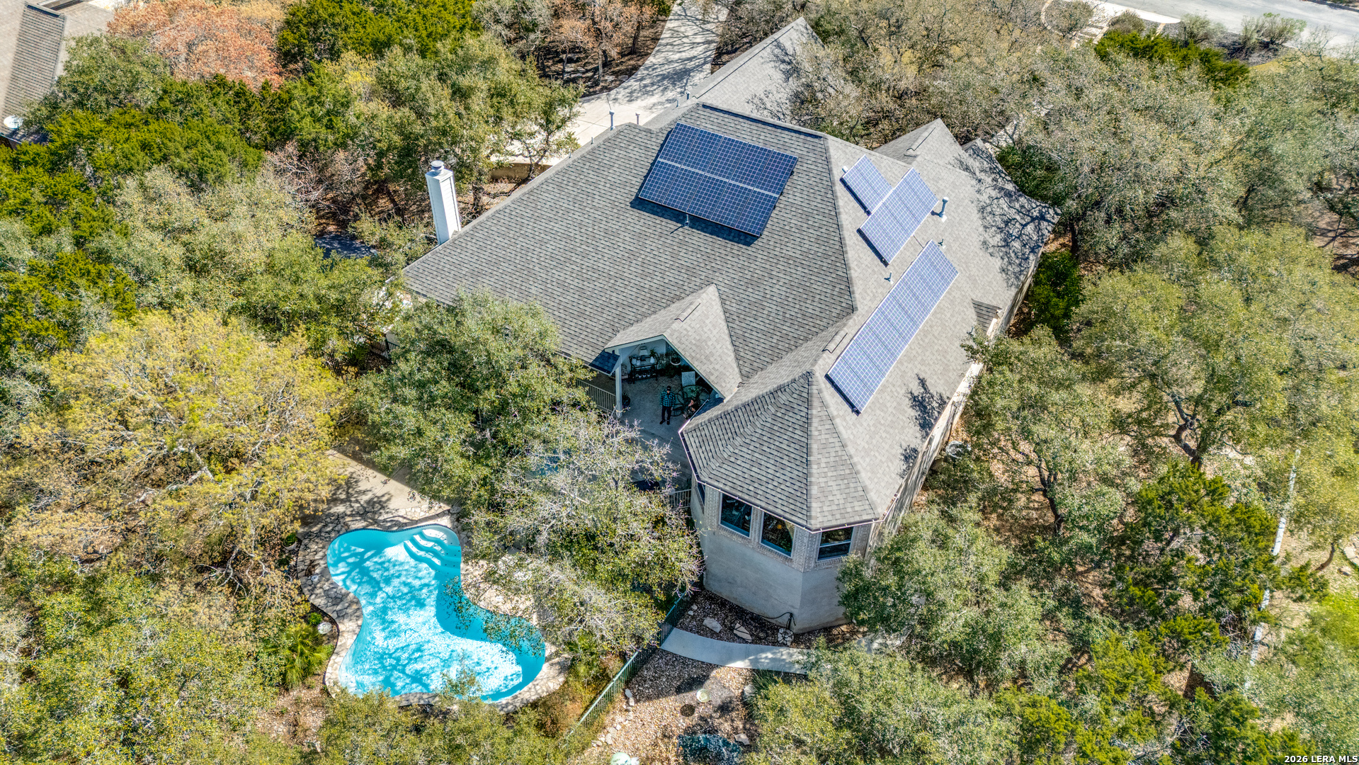 Welcome to this beautifully maintained original-owner home in the highly sought after gated community of The Village Green. Situated on over one private acre and backing to a serene greenbelt, this property offers exceptional privacy along with tranquil wooded views. This 3,476 sq.ft. home features 4 bedrooms and 3 full baths, soaring ceilings, and abundant natural light throughout. Two spacious living areas showcase walls of windows that frame the peaceful backyard The oversized primary suite is a true retreat, complete with a fully remodeled spa-like bath and expansive custom California Closet and remote operated window shades. Two secondary bedrooms share a convenient adjoining bathroom. Step outside to enjoy the view on a full upper patio with extensive seating and a hot tub to relax in. Down below is a private oasis featuring a beautiful in-ground pool and spacious patio for entertaining or relaxing. The backyard offers exceptional privacy and tranquil views with no rear neighbors. Additional highlights include a 3-car garage with extensive built-in storage, a 12x9 storage shed, and impressive energy efficiency thanks to 26 owned solar panels, keeping utility costs low. Meticulously cared for and thoughtfully updated, this exceptional property combines privacy, comfort, and convenience in a prime location only one mile from I 10.