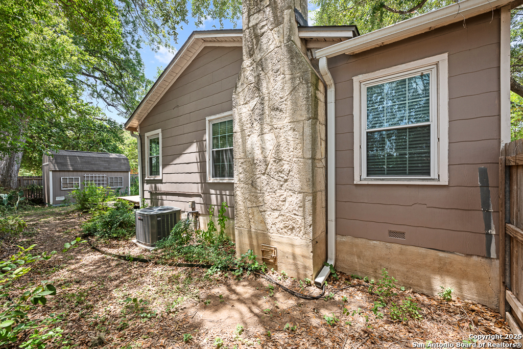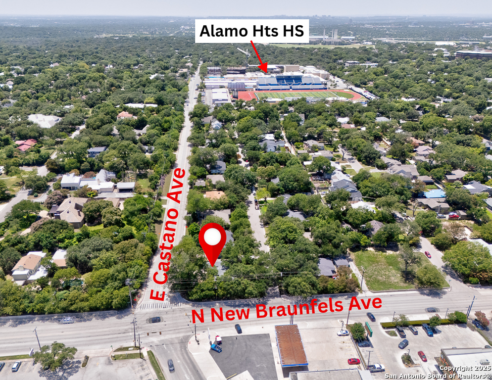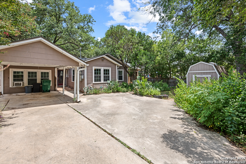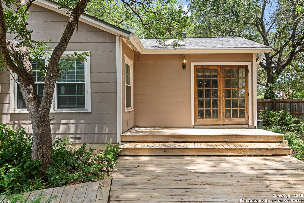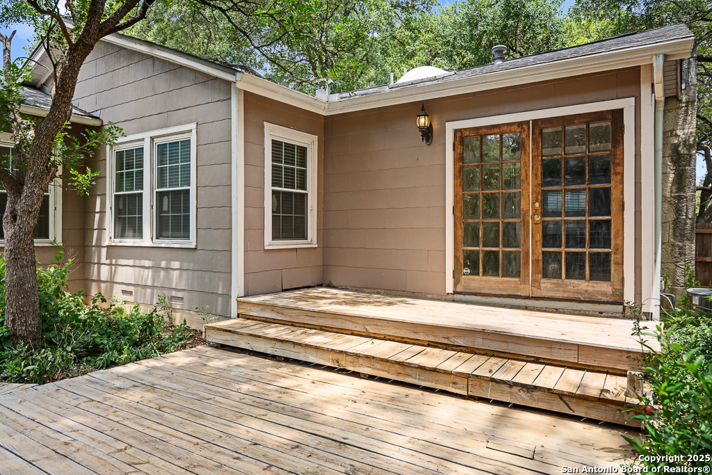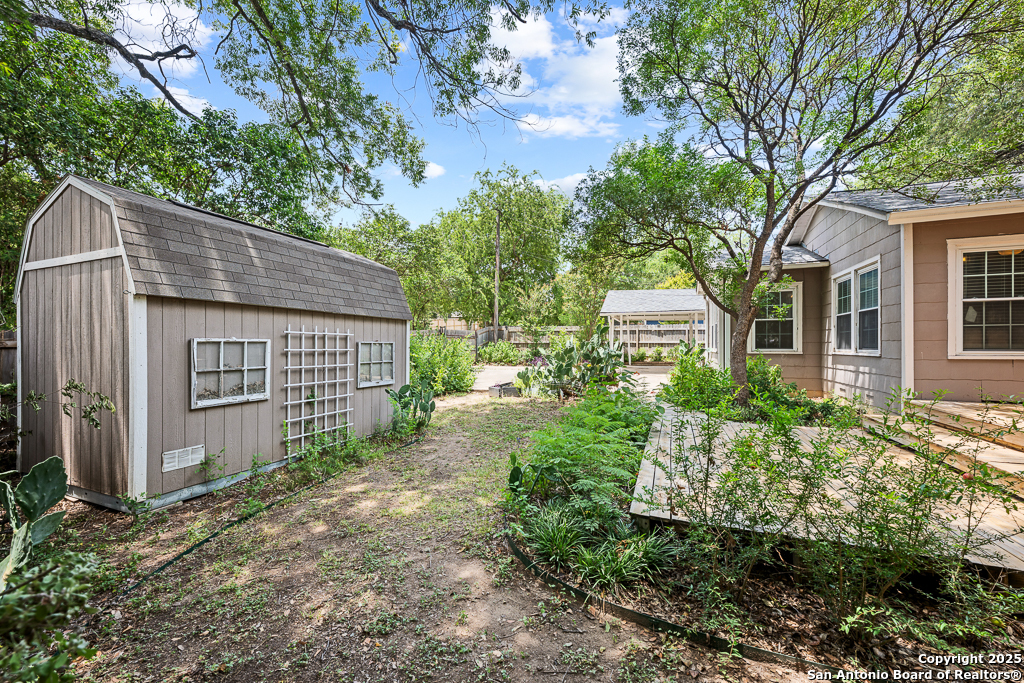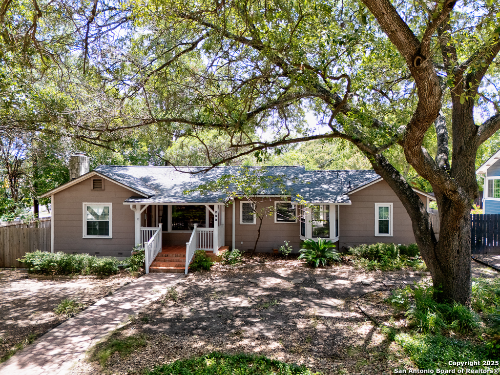 Charming cottage with timeless appeal, nestled in the heart of Alamo Heights, this inviting 3-bedroom, 2-bathroom cottage blends classic charm with modern comfort on an expansive corner lot shaded by mature trees. Located just steps from award-winning Alamo Heights schools, this one-story home offers both tranquility and convenience in one of San Antonio's most beloved neighborhoods. Step inside to warm hardwood floors and a light-filled family room anchored by a cozy fireplace - the perfect place to gather. A separate play area or flex space adds versatility for growing families or those working from home. The kitchen is a chef's delight, with custom cabinetry, stainless steel appliances, and a charming breakfast nook with bay windows that fill the space with natural light. Three well-appointed bedrooms and two full bathrooms offer comfortable living for all. Out back, enjoy peaceful evenings on the spacious deck, surrounded by privacy and greenery, with gated access to the covered parking area and a convenient storage shed. Washer and dryer connections are located inside for everyday ease. With its unbeatable location, timeless features, and thoughtful layout, this Alamo Heights gem is ready to welcome you home.
