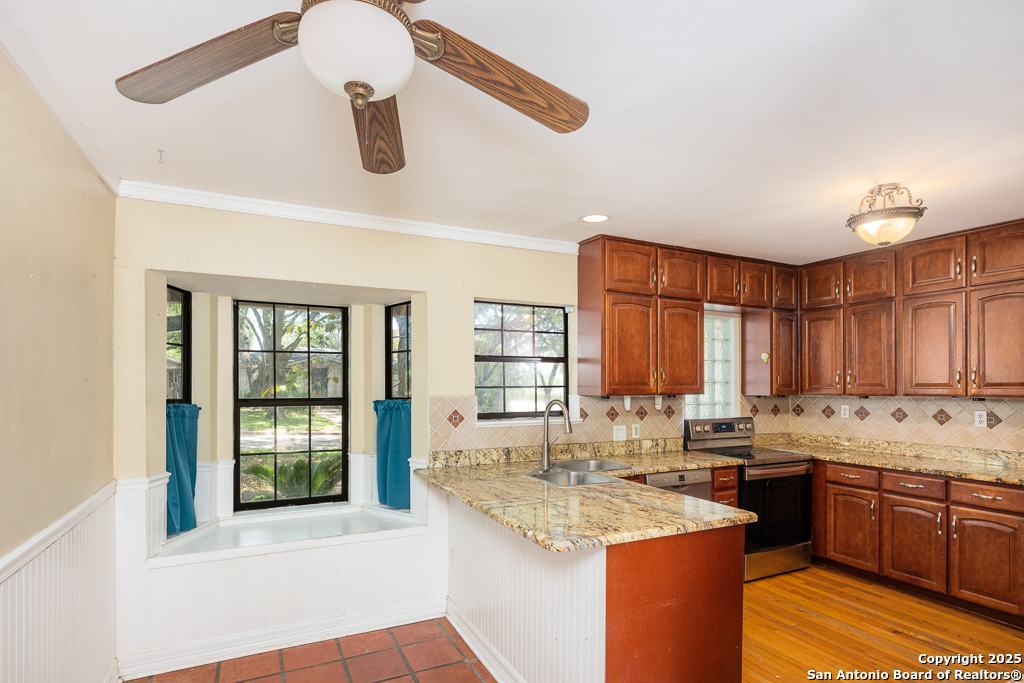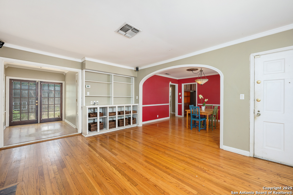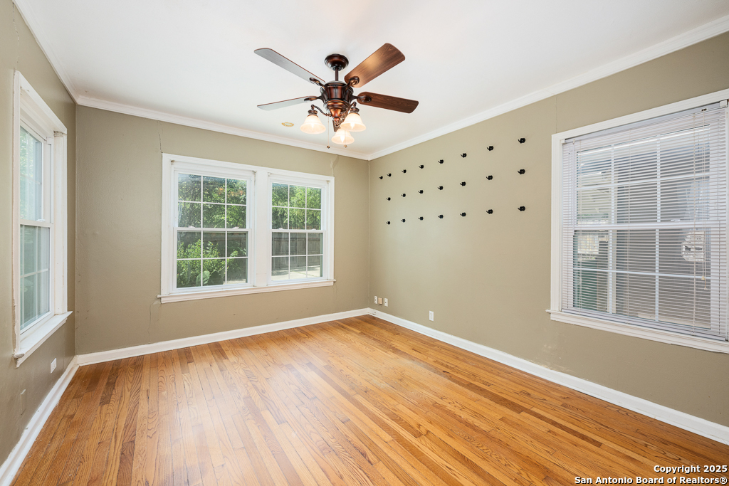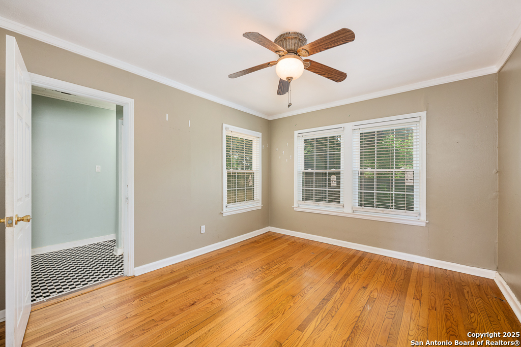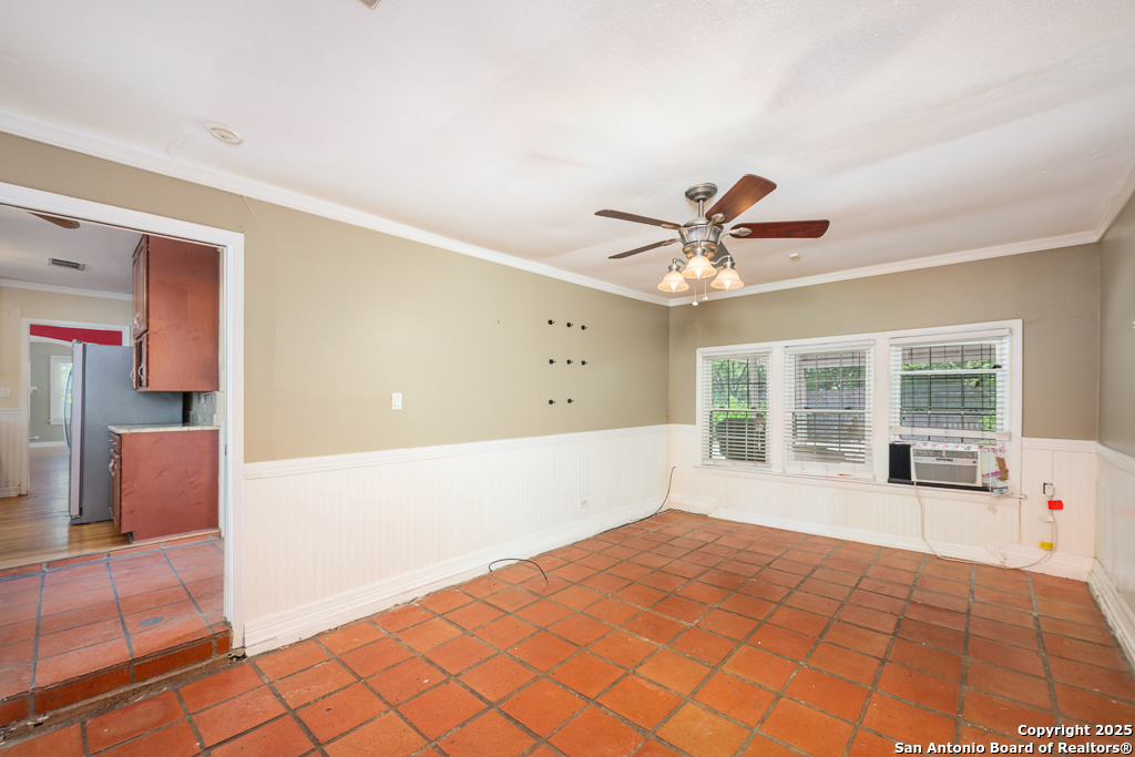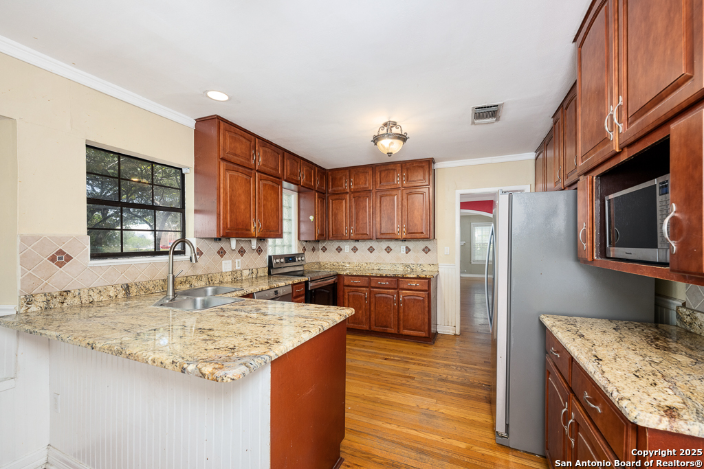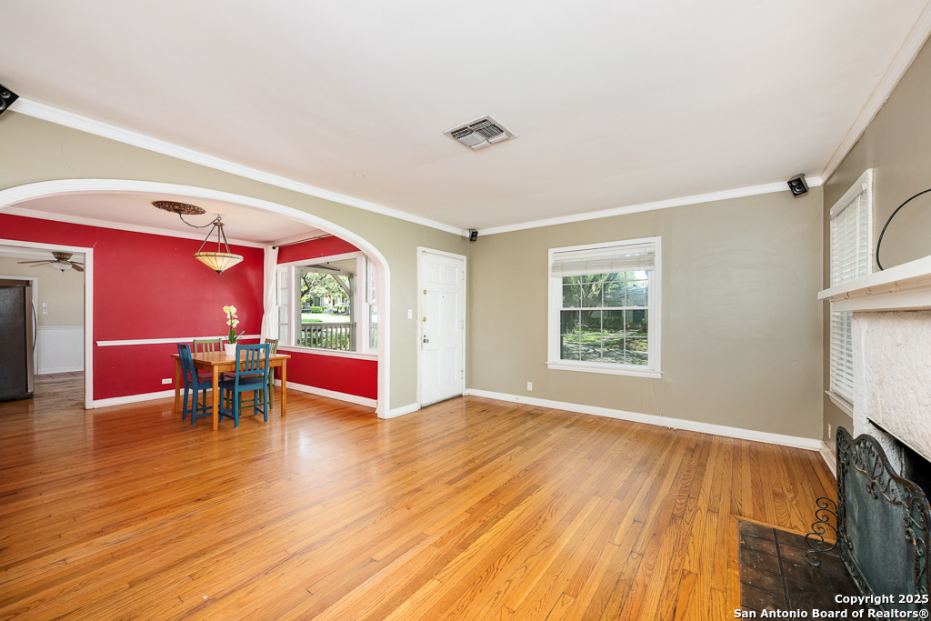 Charming cottage with timeless appeal, nestled in the heart of Alamo Heights, this inviting 3-bedroom, 2-bathroom cottage blends classic charm with modern comfort on an expansive corner lot shaded by mature trees. Located just steps from award-winning Alamo Heights schools, this one-story home offers both tranquility and convenience in one of San Antonio's most beloved neighborhoods. Step inside to warm hardwood floors and a light-filled family room anchored by a cozy fireplace - the perfect place to gather. A separate play area or flex space adds versatility for growing families or those working from home. The kitchen is a chef's delight, with custom cabinetry, stainless steel appliances, and a charming breakfast nook with bay windows that fill the space with natural light. Three well-appointed bedrooms and two full bathrooms offer comfortable living for all. Out back, enjoy peaceful evenings on the spacious deck, surrounded by privacy and greenery, with gated access to the covered parking area and a convenient storage shed. Washer and dryer connections are located inside for everyday ease. With its unbeatable location, timeless features, and thoughtful layout, this Alamo Heights gem is ready to welcome you home.