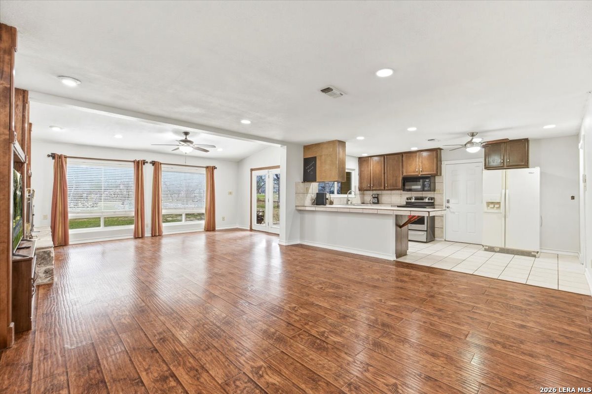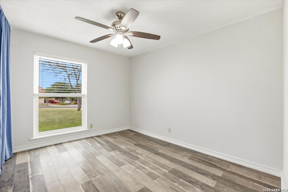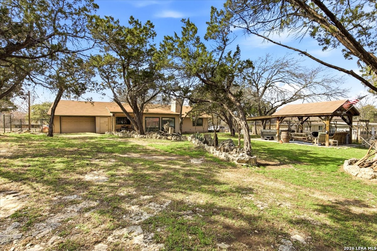 Enjoy the serenity of this nice quiet neighborhood. Nestled on a dead end street and set on over an acre of classic Hill Country charm with plenty of mature trees, this exceptional property offers the perfect blend of privacy, character, and convenience. Extensively updated and truly move-in ready, the home features brand new windows installed 2 years ago, a newer roof, HVAC, water heater, stainless steel appliances, interior and exterior paint, baseboards, doors, plumbing fixtures, and hardware. Inside, you'll find three bedrooms, two beautifully updated bathrooms, and a bright, open living area anchored by a stunning rock fireplace and hand-scraped Brazilian Cherry flooring. No HOA and with the unrestricted use, this property is designed for living life to the fullest outdoors. The fully fenced yard includes a 16' x 32' covered pavilion with hot tub-ideal for entertaining or relaxing under the Texas sky. The impressive 30' x 40' barn is plumbed for a kitchen, bathroom, and washer/dryer, offering endless possibilities for guest quarters, multigenerational living, or a home-based business. A 10' x 30' patio is attached, along with a 10' x 30' covered lean-to for storing equipment, boats, or recreational toys. There's also ample room for RV parking. Additional features include a 9' x 9' storage shed, a fun outdoor shower, a masonry fire pit, and a fenced 10' x 20' garden area for those with a green thumb. The 60' driveway leading up to the three-car tandem garage offers convenient drive-through access to the backyard. Livestock-friendly, unrestricted, and packed with upgrades-this one-of-a-kind property is ready to welcome you home. Great Location, convenient to Hwy. 281 and Blanco Rd. Country living with city convenience. Comal Schools!
