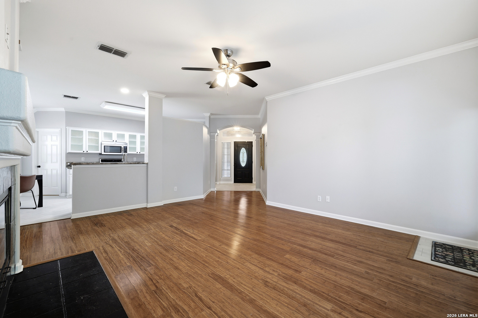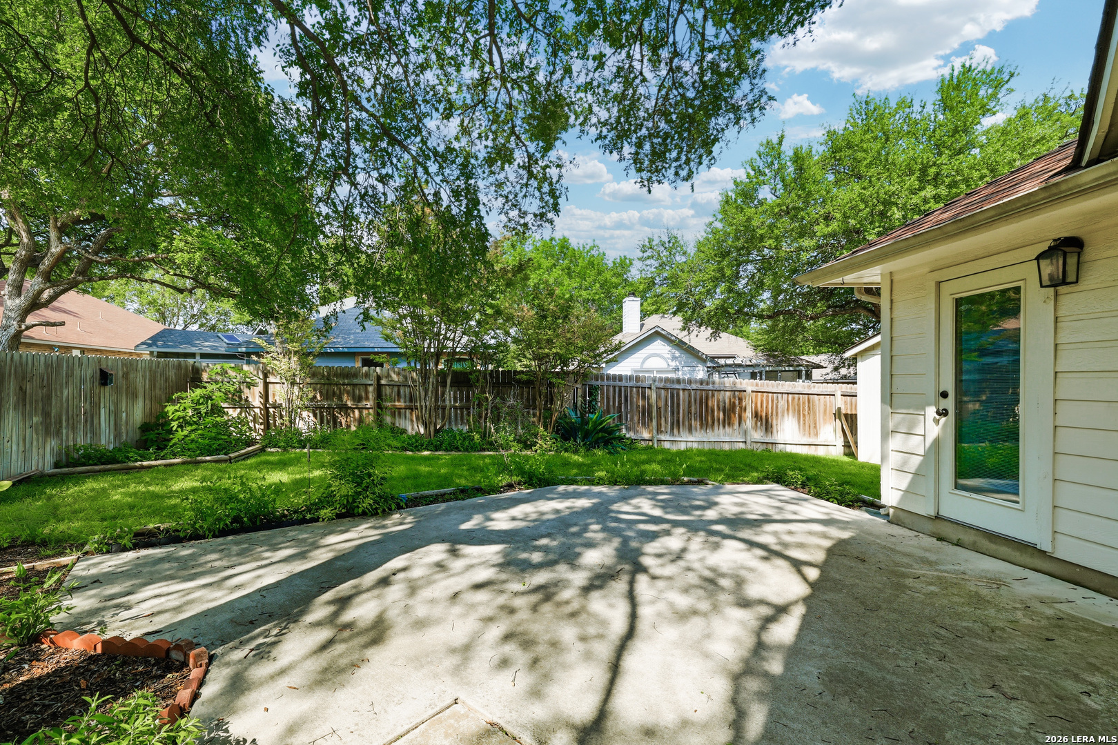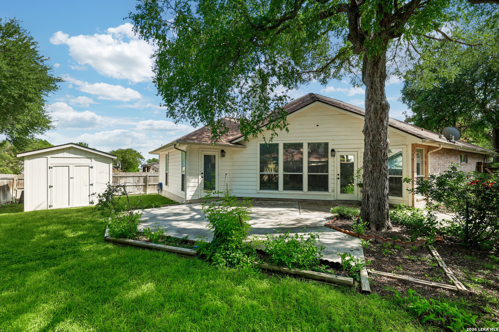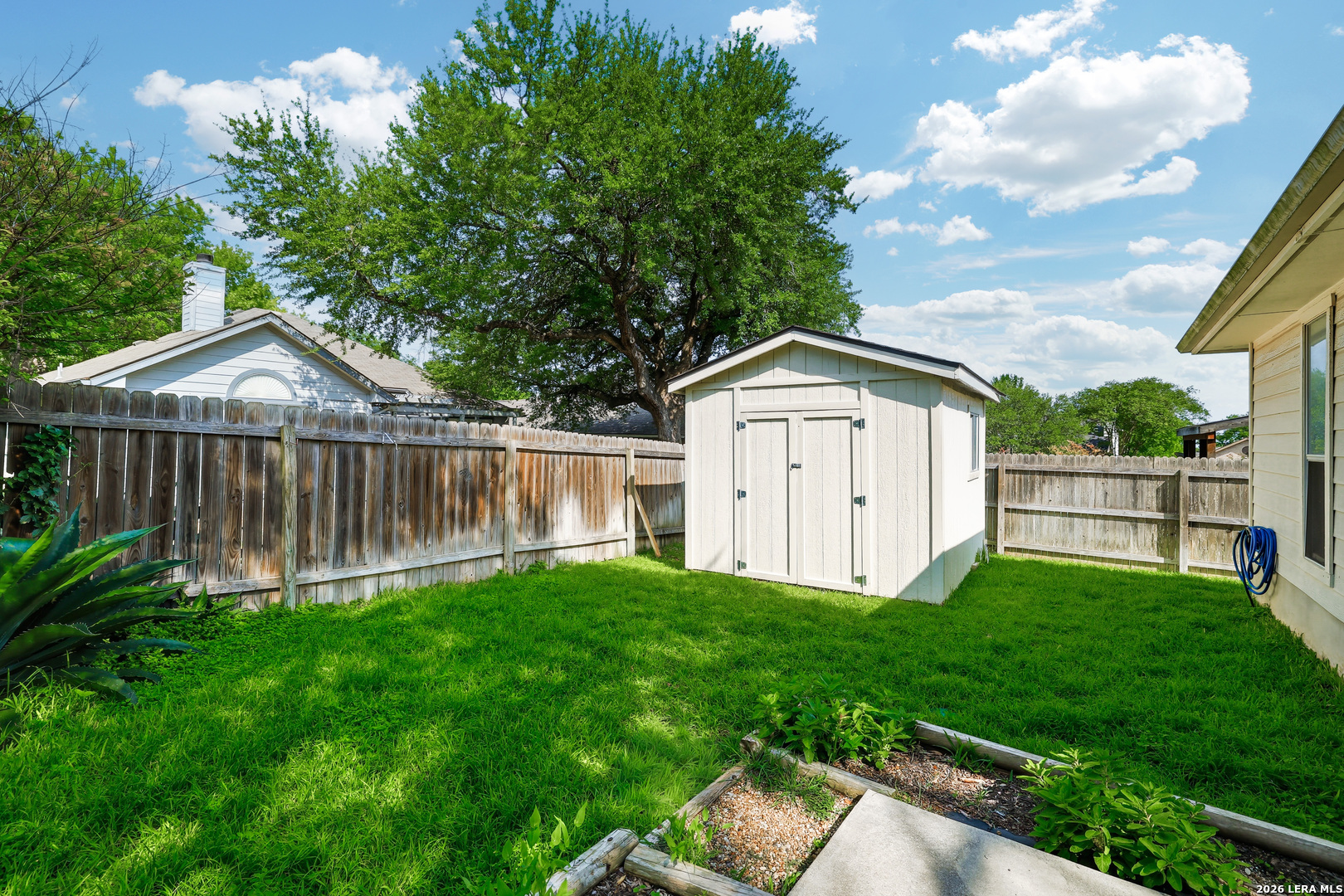 Welcome to this beautifully maintained 3-bedroom, 2-bath single-story home nestled in the highly sought-after gated community of Berry Creek. Thoughtfully designed for both comfort and style, this home offers a warm and inviting atmosphere from the moment you step inside the large entryway. The spacious family room serves as the heart of the home, featuring a cozy wood burning fireplace framed by modern stucco accents and a stylish accent wall-perfect for relaxing or entertaining. Elegant bamboo wood flooring, installed just four years ago, flows throughout the main living areas, while durable ceramic tile enhances all wet spaces. Additional upgrades include 2-inch wood blinds, updated crown molding, contemporary light fixtures, and refined finishes throughout. The private primary suite provides a peaceful retreat, complete with a generously sized ensuite bathroom featuring a seamless glass shower and a large walk-in closet. The home's functional layout also includes a convenient garage entry leading into an oversized pantry and laundry room with ample shelving for storage and organization. The kitchen blends practicality with style, offering stainless steel appliances, granite countertops, tile flooring, and a breakfast bar ideal for casual dining or hosting guests. Step outside to enjoy a spacious backyard designed for both relaxation and entertaining, featuring a large patio, mature trees. A full sprinkler system services both the front and back yards. The front yard features decorative stone. A 10x10 storage shed, with wood floor provides valuable additional space for hobbies or storage. Additional peace of mind comes with a roof inspection completed in 2023. Conveniently located just off FM 3009, this home offers an easy commute to Randolph Air Force Base and quick access to nearby shopping, dining, and entertainment. It is also served by the highly regarded Schertz-Cibolo-Universal City ISD. Enjoy being just a short drive from popular destinations such as New Braunfels, Gruene, Canyon Lake, the Guadalupe River, and Natural Bridge Caverns. Don't miss the opportunity to make this exceptional home yours!