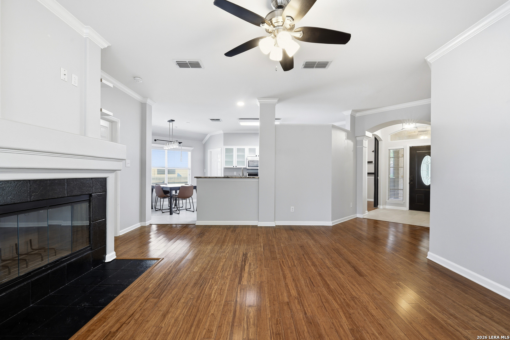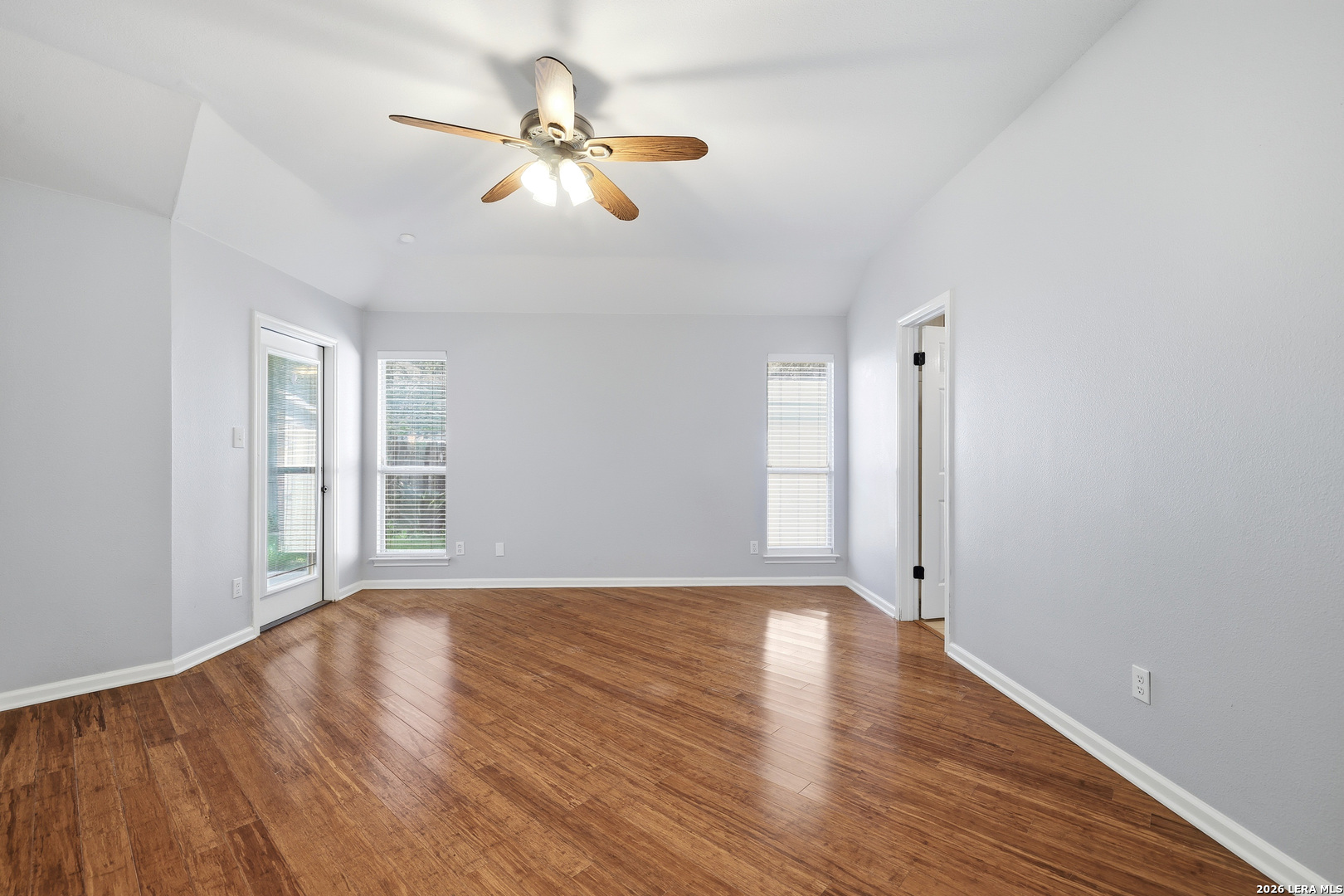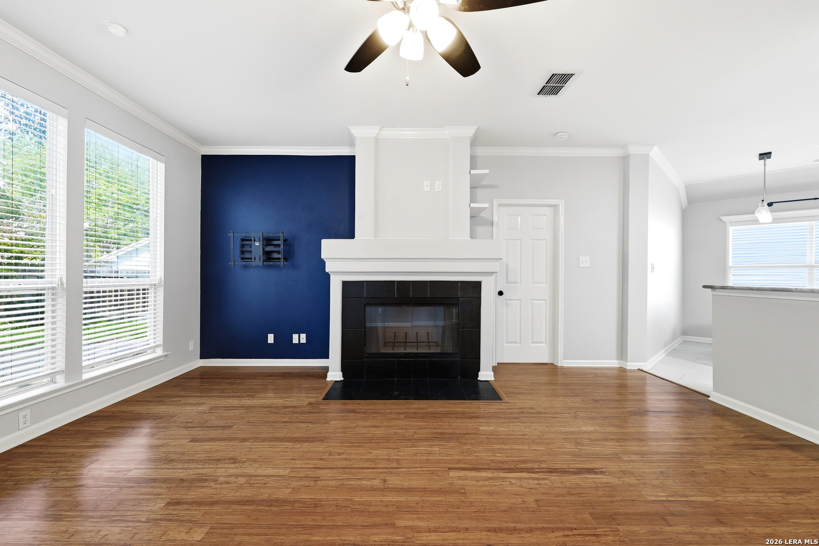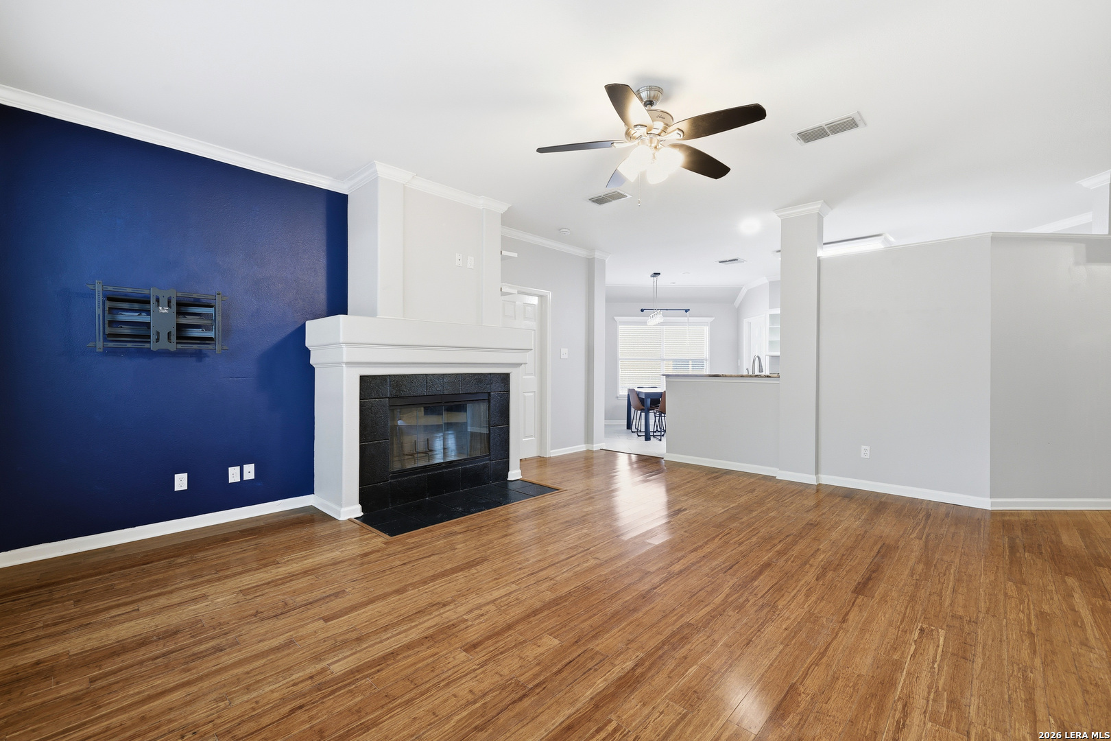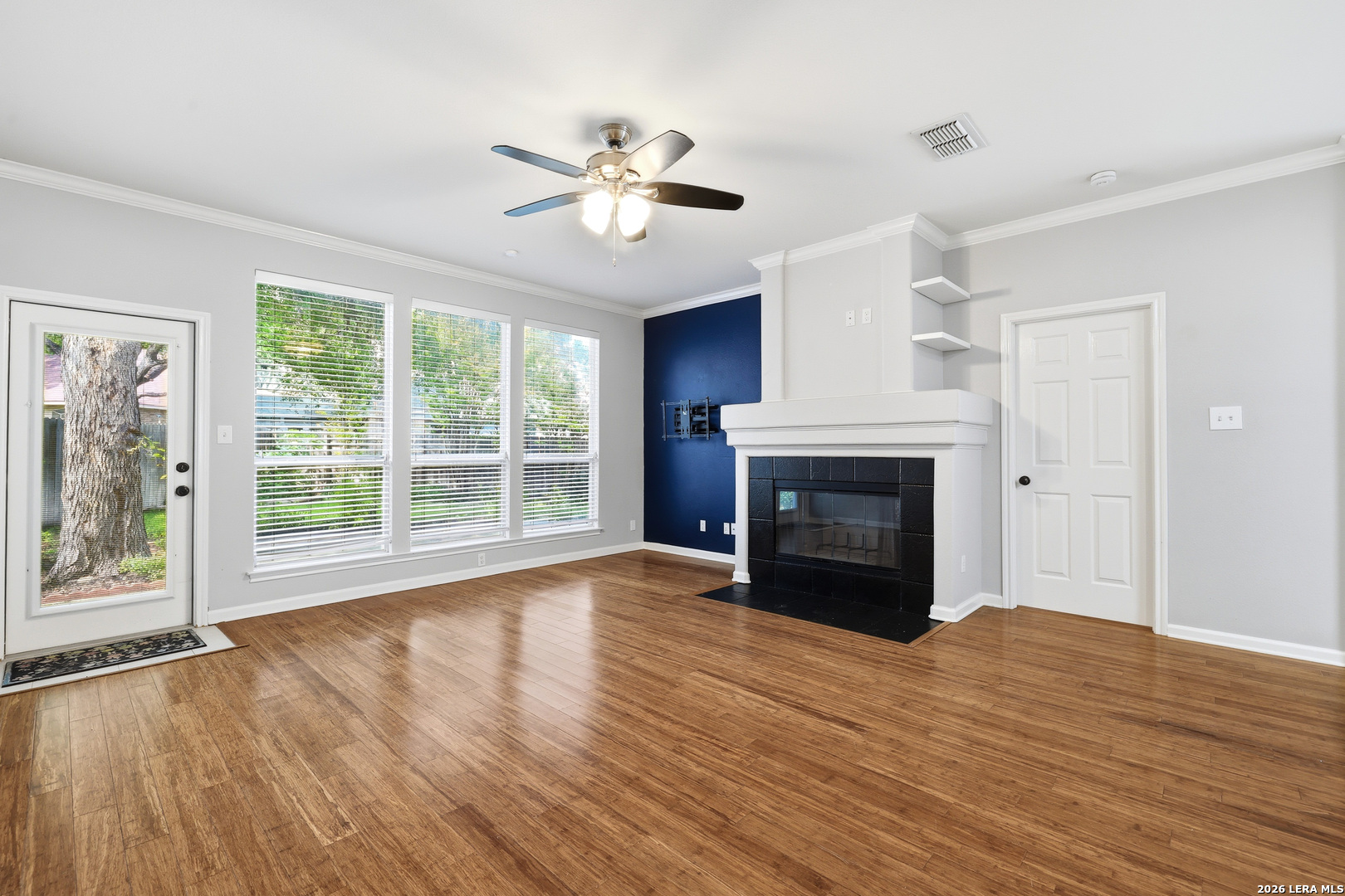 Welcome to this beautifully maintained 3-bedroom, 2-bath single-story home nestled in the highly sought-after gated community of Berry Creek. Thoughtfully designed for both comfort and style, this home offers a warm and inviting atmosphere from the moment you step inside the large entryway. The spacious family room serves as the heart of the home, featuring a cozy wood burning fireplace framed by modern stucco accents and a stylish accent wall-perfect for relaxing or entertaining. Elegant bamboo wood flooring, installed just four years ago, flows throughout the main living areas, while durable ceramic tile enhances all wet spaces. Additional upgrades include 2-inch wood blinds, updated crown molding, contemporary light fixtures, and refined finishes throughout. The private primary suite provides a peaceful retreat, complete with a generously sized ensuite bathroom featuring a seamless glass shower and a large walk-in closet. The home's functional layout also includes a convenient garage entry leading into an oversized pantry and laundry room with ample shelving for storage and organization. The kitchen blends practicality with style, offering stainless steel appliances, granite countertops, tile flooring, and a breakfast bar ideal for casual dining or hosting guests. Step outside to enjoy a spacious backyard designed for both relaxation and entertaining, featuring a large patio, mature trees. A full sprinkler system services both the front and back yards. The front yard features decorative stone. A 10x10 storage shed, with wood floor provides valuable additional space for hobbies or storage. Additional peace of mind comes with a roof inspection completed in 2023. Conveniently located just off FM 3009, this home offers an easy commute to Randolph Air Force Base and quick access to nearby shopping, dining, and entertainment. It is also served by the highly regarded Schertz-Cibolo-Universal City ISD. Enjoy being just a short drive from popular destinations such as New Braunfels, Gruene, Canyon Lake, the Guadalupe River, and Natural Bridge Caverns. Don't miss the opportunity to make this exceptional home yours!