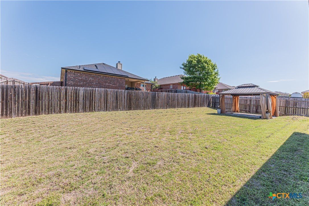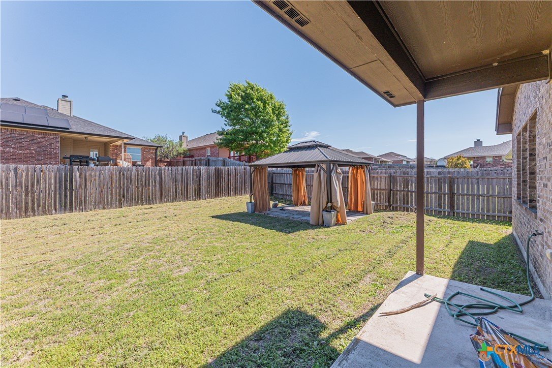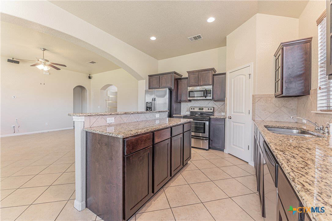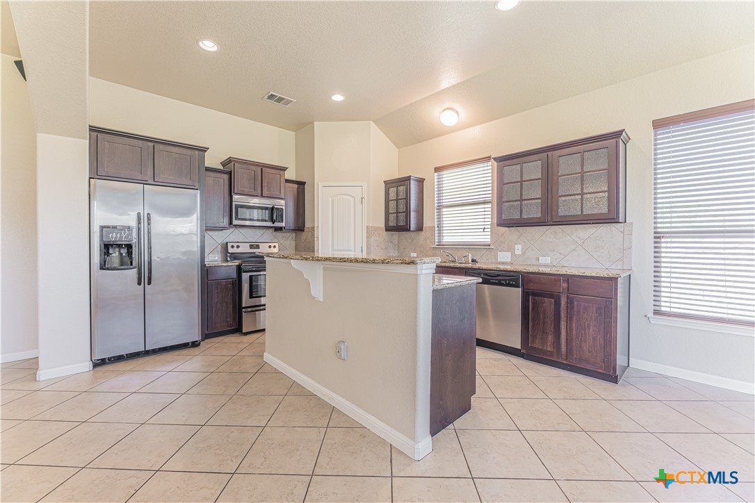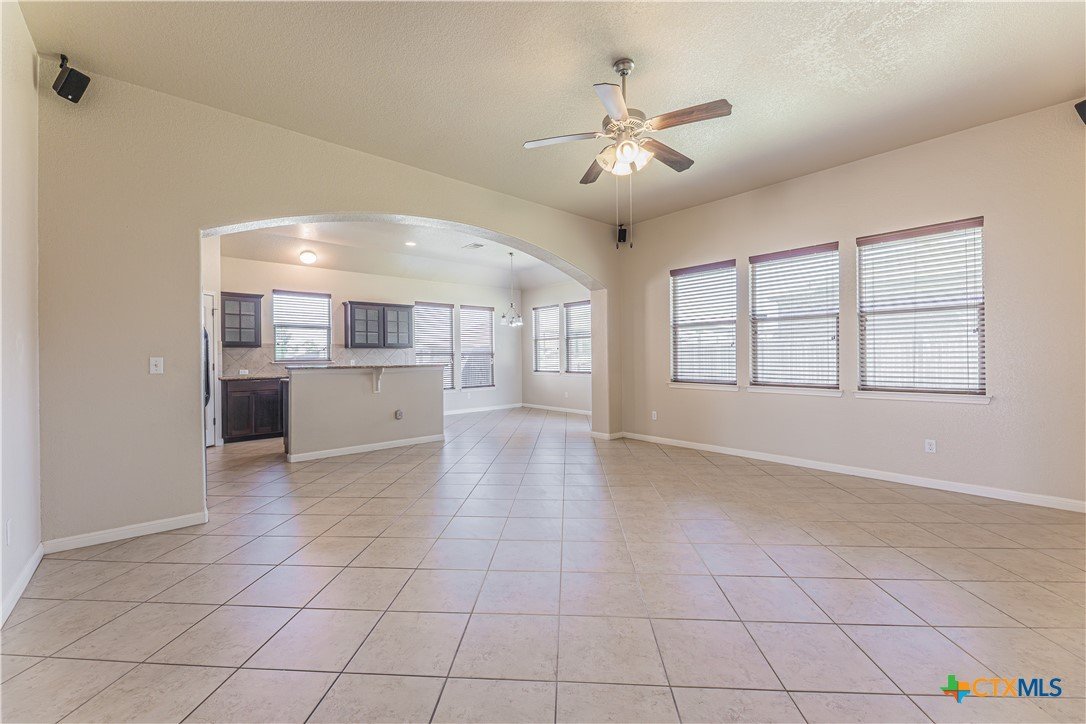 This beautifully designed 1,887-square-foot home offers the perfect blend of comfort, style, and functionality. Featuring a thoughtfully planned split floor layout, this residence includes four spacious bedrooms and two full bathrooms, providing privacy and flexibility. At the heart of the home, an open-concept kitchen flows seamlessly into the living room, creating an inviting space ideal for both everyday living and entertaining. The kitchen is equipped with a large island, sleek granite countertops, and a convenient pantry, offering ample storage and workspace. The living room is enhanced with built-in surround sound speakers, perfect for enjoying movies, music, or hosting gatherings. Durable ceramic tile flooring extends through high-traffic areas, combining practicality with modern appeal. The private master suite is generously sized, providing a relaxing retreat. The en-suite bathroom features a separate soaking tub and walk-in shower, delivering both luxury and convenience. Additional highlights include a dedicated laundry room, a covered front entryway that adds charm and protection, and a covered back patio ideal for outdoor relaxation or entertaining guests. The circular driveway enhances curb appeal while offering easy access and ample parking. This home is designed to meet the needs of modern living while maintaining comfort and style