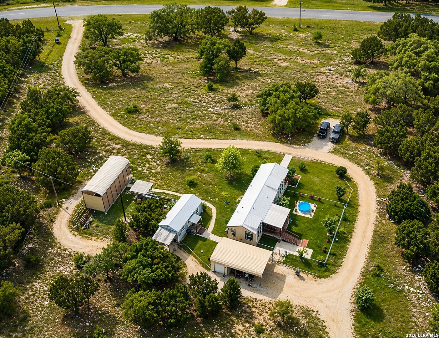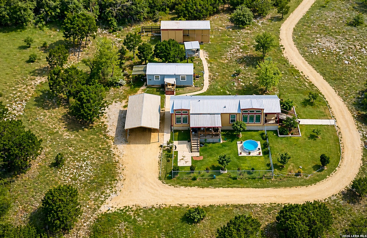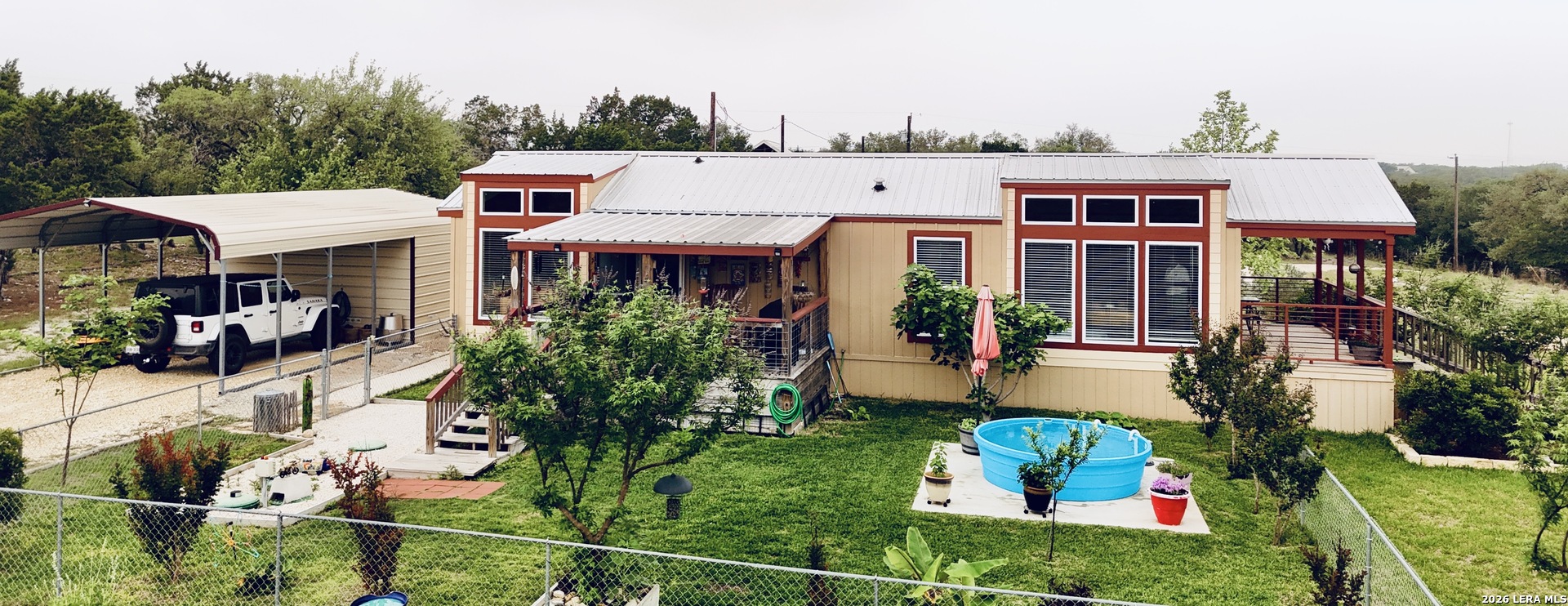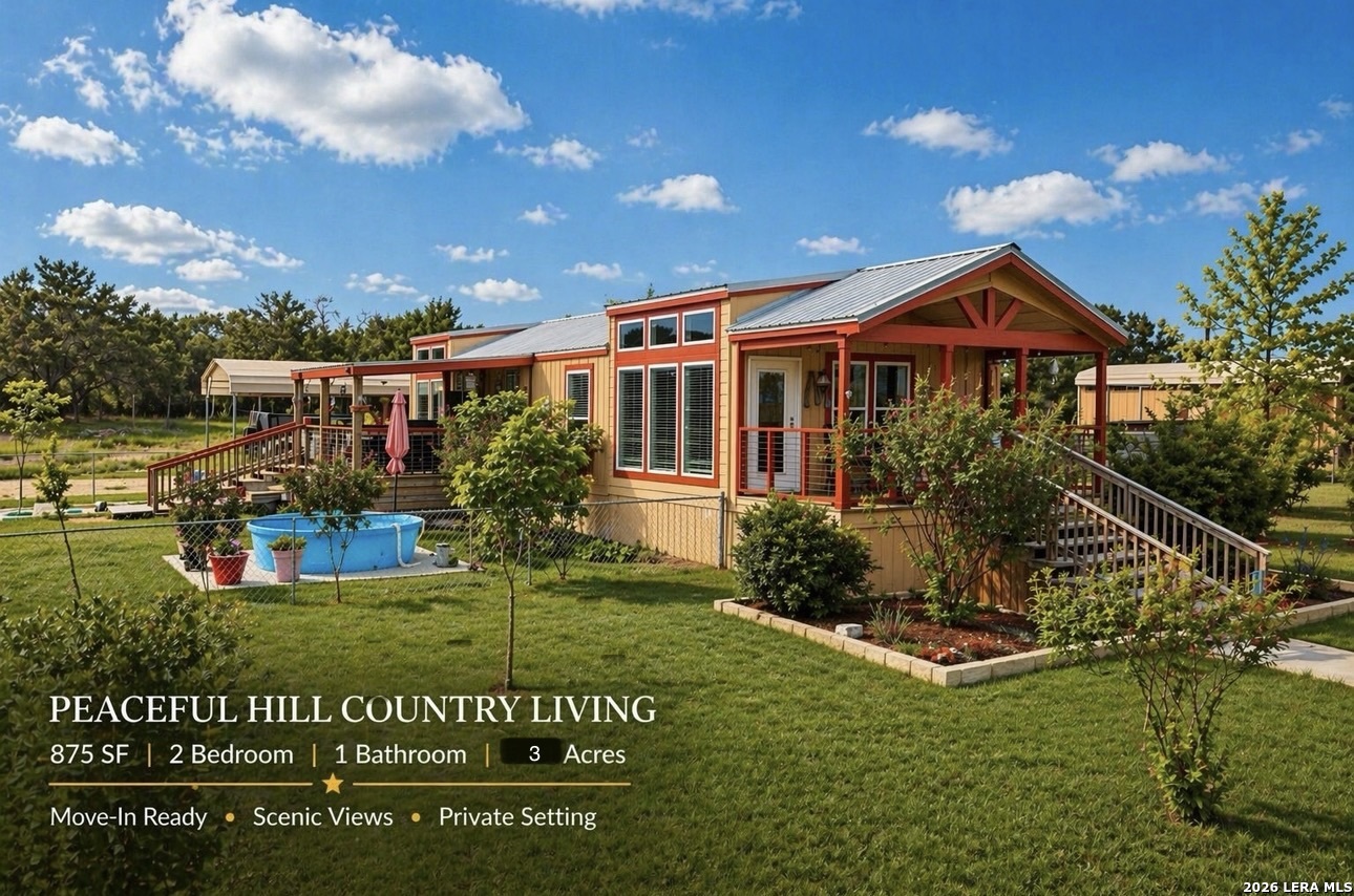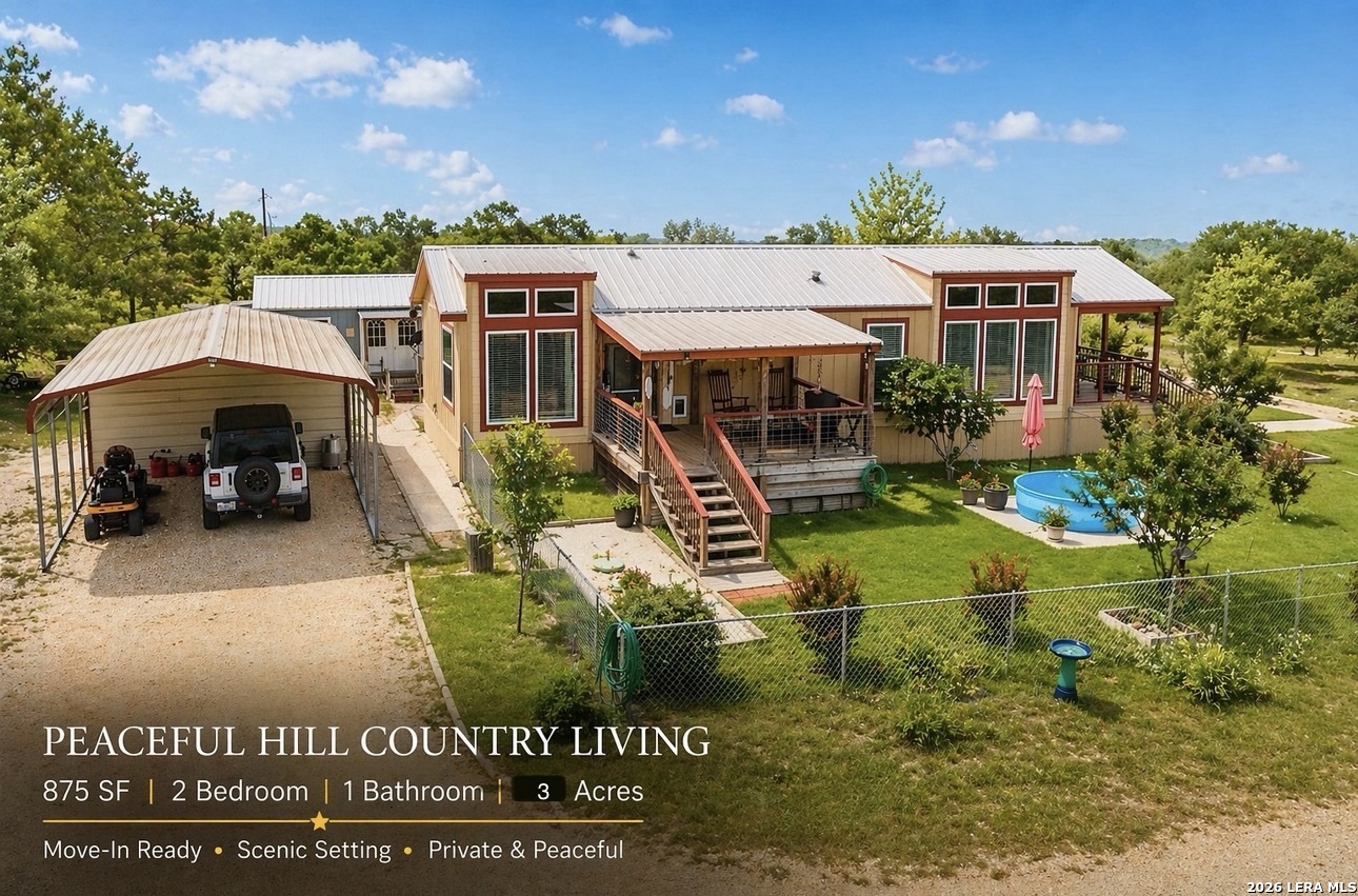 Escape to your own private retreat on 3 beautiful acres in Oak Hollow! This well-cared-for manufactured home offers a peaceful setting with mature trees, open space, and plenty of room to enjoy the outdoors. Relax on one of two decks, cool off in the above-ground pool, or start your dream garden with ready-to-use beds. Inside, the open floorplan is filled with natural light and features a spacious kitchen complete with a large island for eat-in style dining, abundant cabinetry, and an oversized metal sink. The home includes 2 bedrooms, 1 bathroom, and comes fully equipped with a refrigerator, propane stove, and stackable washer and dryer. The property is packed with functionality, including a 18x12 ft workshop/storage building with electricity, covered carport with extra storage space, and a large covered space for RV or boat parking. Additional highlights include a private well, chain link fencing around front area of the home, and a durable metal roof - just 5 years old. No HOA!! Located in Bandera ISD-this move-in ready property offers both comfort and flexibility. Come see this property TODAY!