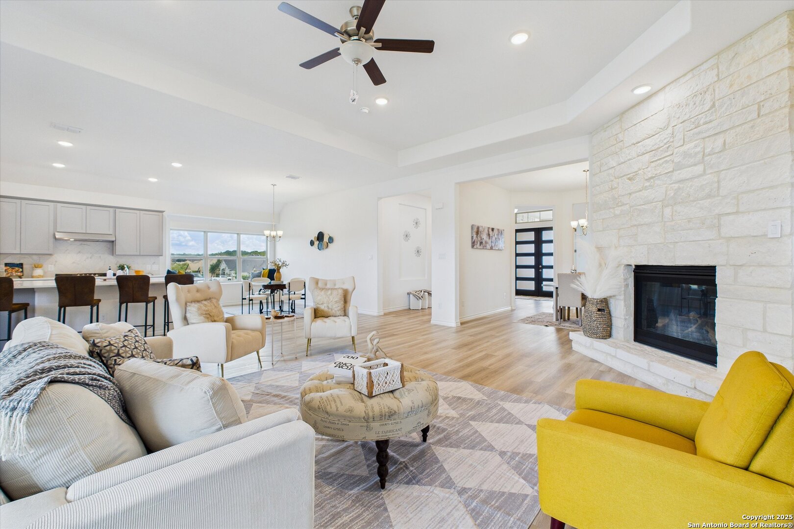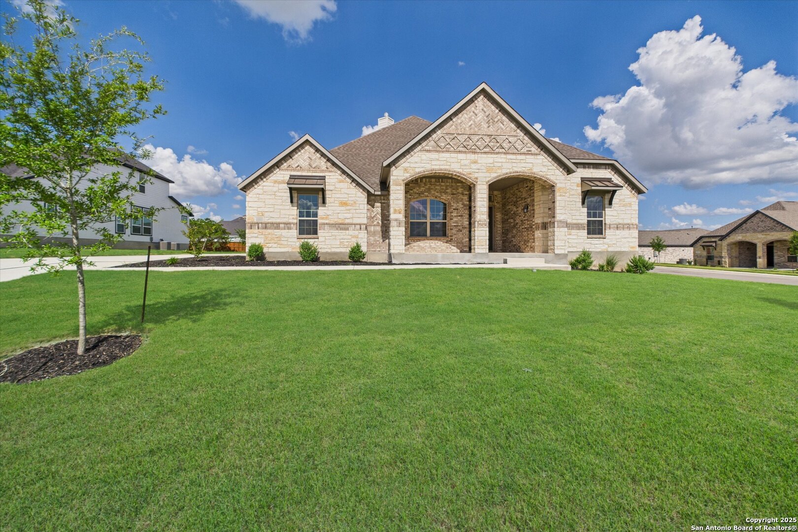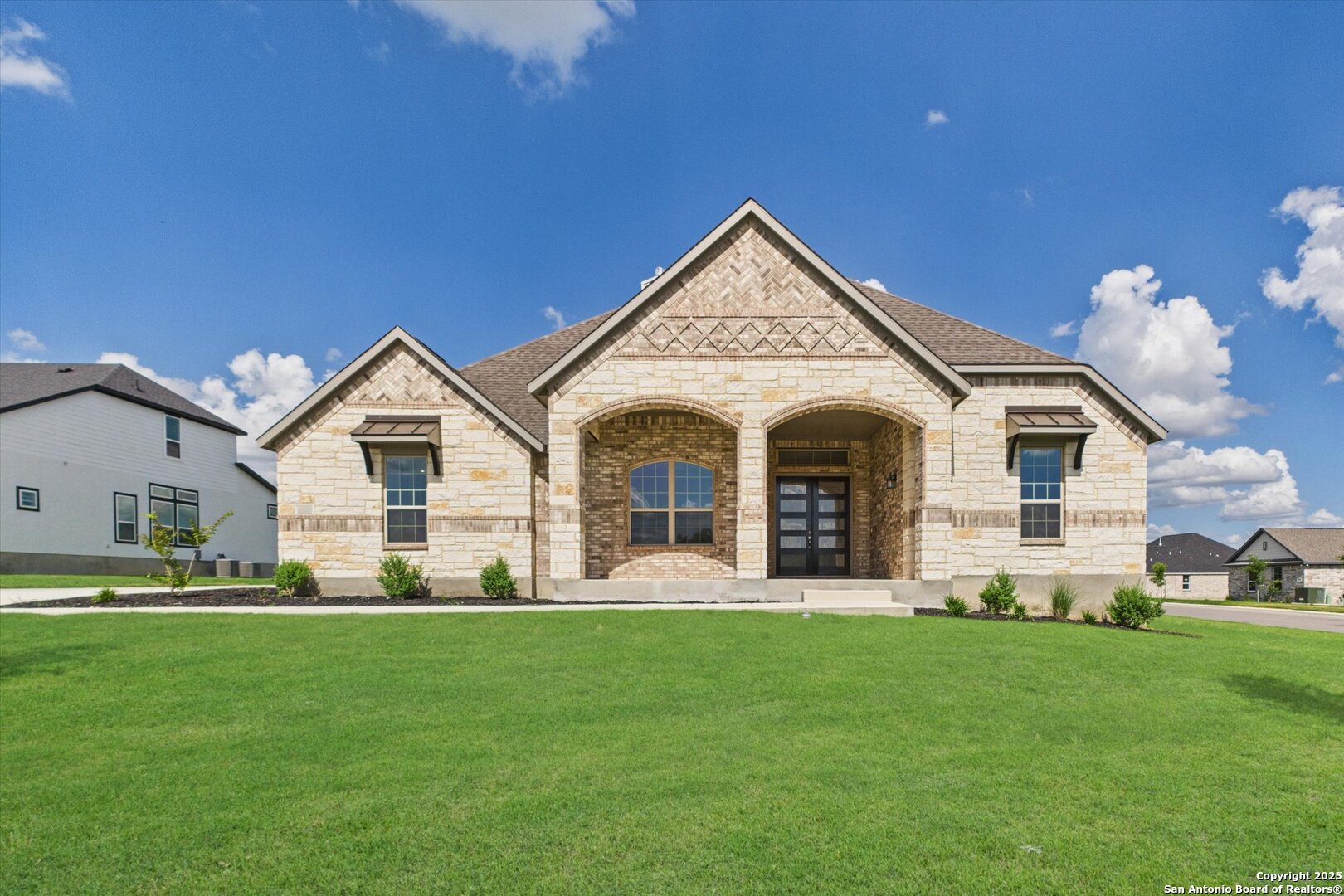 The Summerlin is a stunning one-story home that blends elegance and comfort on nearly a half-acre lot. Its stone-and-brick exterior with a spacious front porch creates exceptional curb appeal. Inside, tray and coffered ceilings, a stone fireplace, Riverside doors, and luxury vinyl plank flooring set the tone for sophisticated living, with ceramic tile throughout and carpet only in the bedrooms.The open family room flows seamlessly to the covered outdoor living area, while the gourmet kitchen offers an oversized island, abundant cabinetry, and a large walk-in pantry. A dedicated media room sits just beyond the kitchen for added versatility.The luxurious primary suite boasts two expansive walk-in closets and a spa-like bath with dual vanities, extended counter space, and an oversized soaking tub-perfect for unwinding in style.