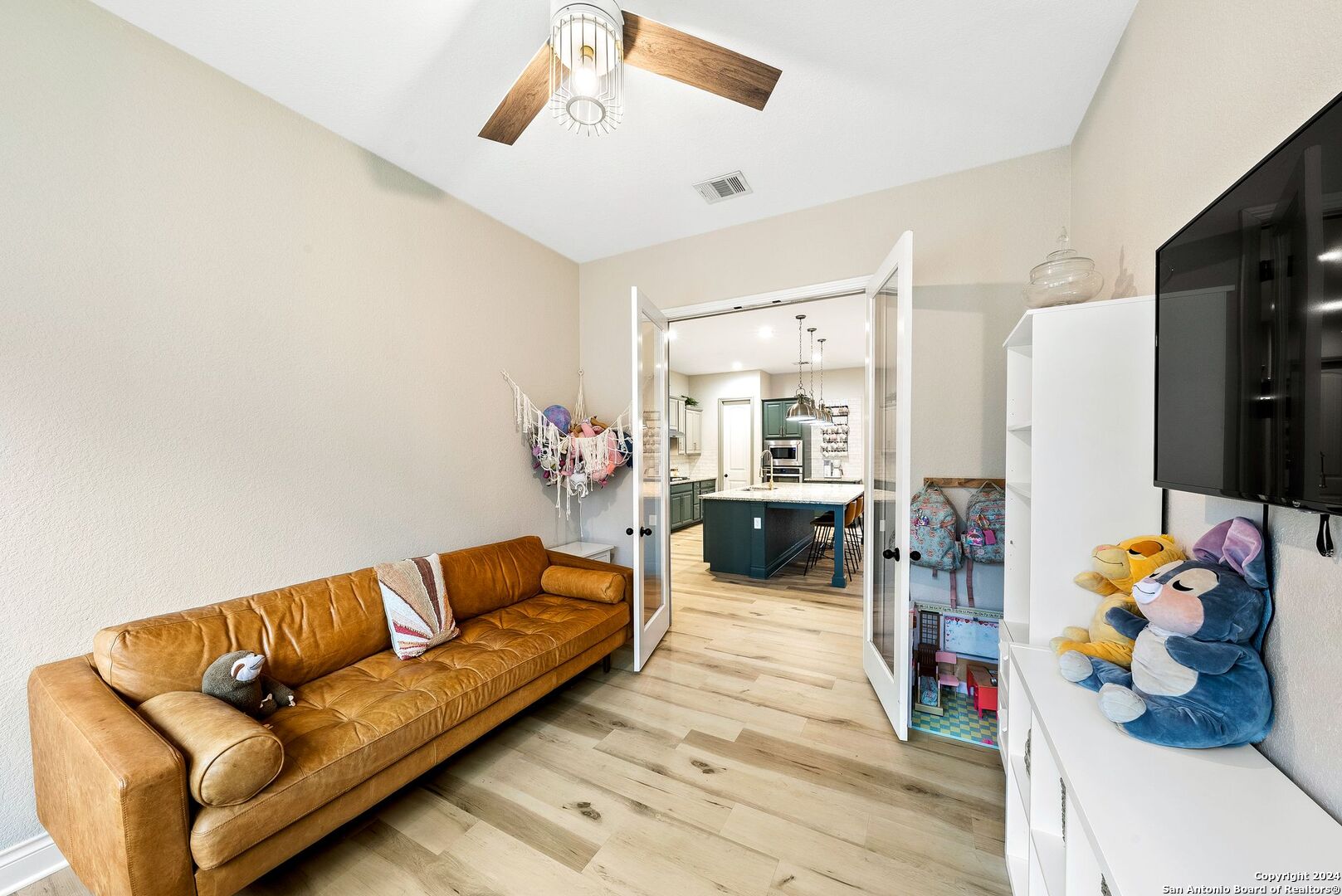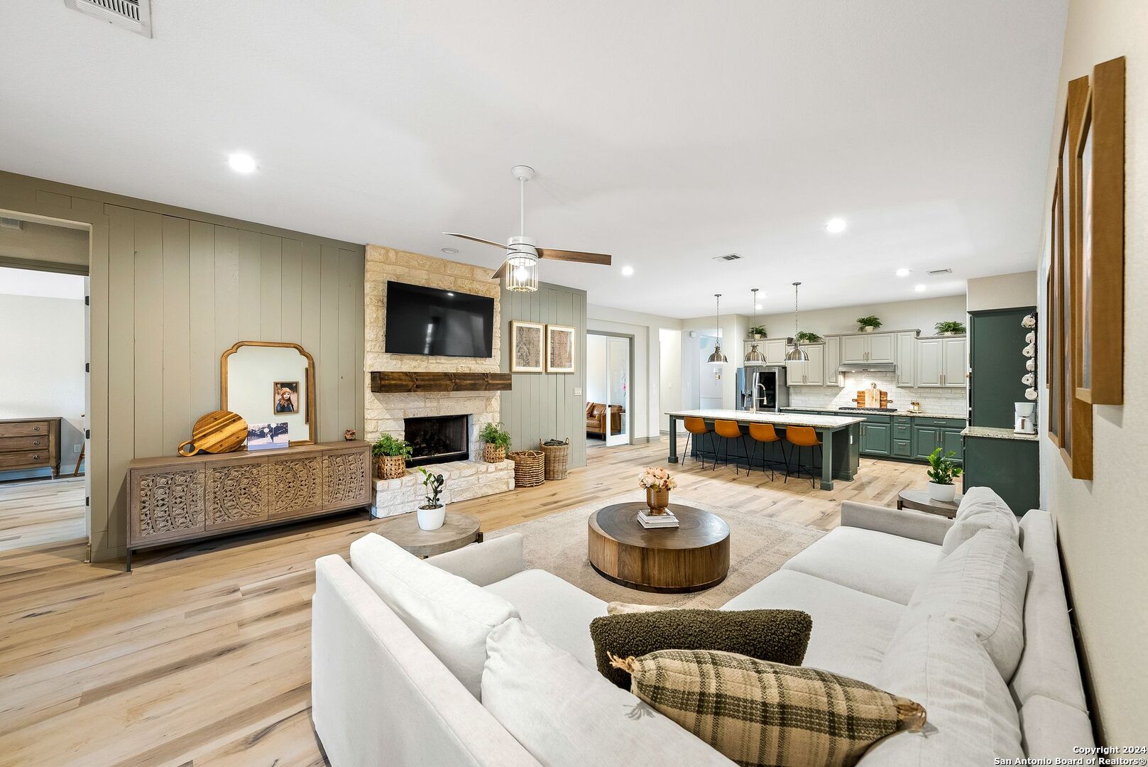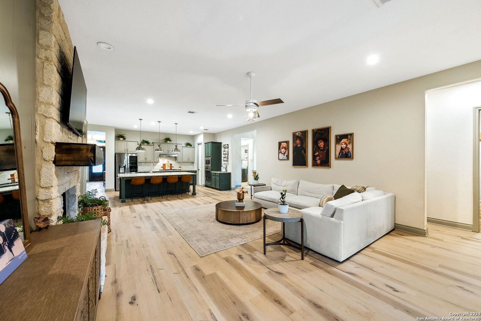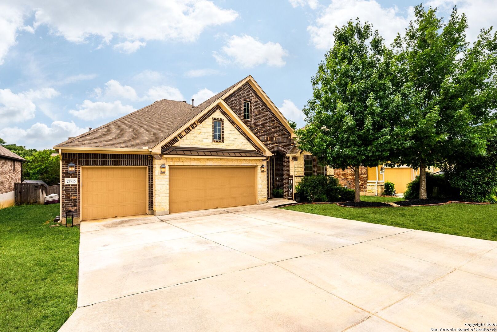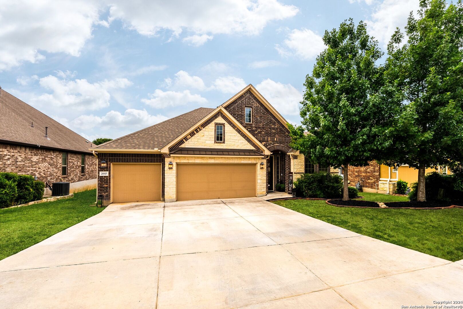 This spacious single-story home features three bedrooms, two and a half bathrooms, and a three-car garage, complete with an office and flex space. The entire home boasts new luxury vinyl plank flooring, with no carpet, enhancing its modern appeal. The open floor plan highlights a large granite kitchen island that overlooks the living room, with beautiful two-toned cabinets and a complementary backsplash. A stunning accent wall adds character to the living room. All bedrooms are generously sized, and the newly renovated primary ensuite is a dream bathroom. The backyard includes a covered patio and an extended deck overlooking the green space, perfect for relaxation and entertaining. With a new AC, water softener, and water heater, this home offers everything you need and more.