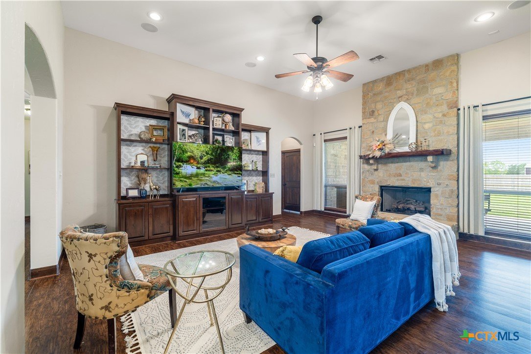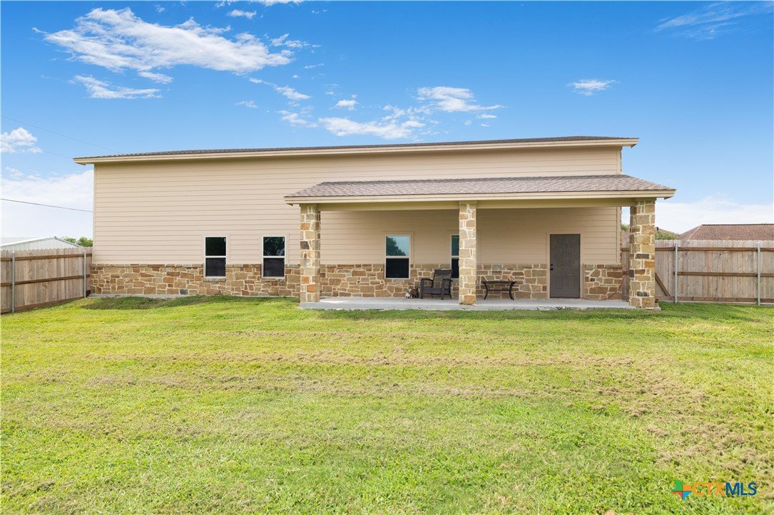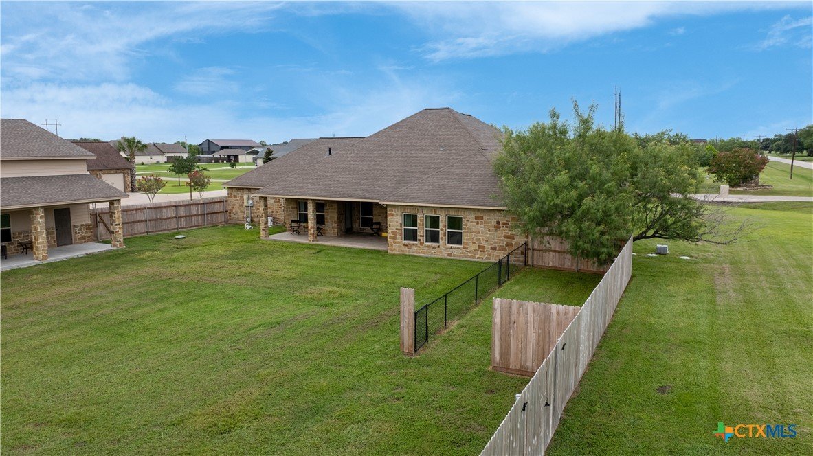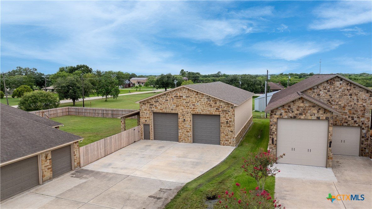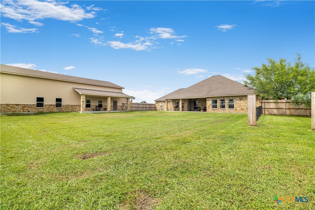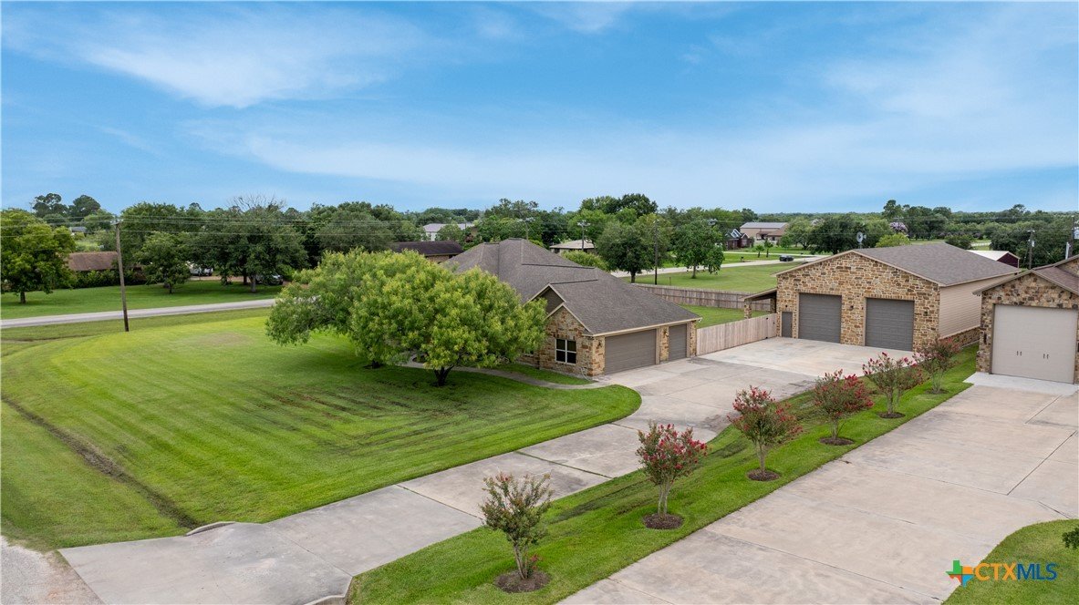 Spring Ridge is known for its beautiful custom homes and they rarely hit the market. Don’t miss this opportunity! Rustic charm meets modern flair in this stunning custom-built Hill Country-style home on over an acre in Spring Ridge Subdivision! This spacious 4-bedroom, 3-bath home offers approx. 2,700 sq ft of well-designed living space with custom finishes throughout PLUS a massive shop and no city taxes! Step inside the welcoming entryway to find engineered hardwood floors, solid wood doors, a rock-accented gas fireplace, and a built-in entertainment center. The open-concept kitchen features double ovens, granite counters, custom cabinetry, and a walk-in pantry perfect for any chef. Each bedroom has extra-large walk-in closets, with built-in dressers in three of them for plenty of storage. The luxurious primary suite includes large windows overlooking the expansive backyard, a huge tile shower, jetted tub, separate vanities, and a spacious walk-in closet with natural light. Designed for entertaining, the home offers two dining areas, a versatile game room/man cave, and a large laundry room with sink. A security system with perimeter cameras, water softener, sprinkler system, and a history of low utilities add to the appeal. Outside, enjoy covered porches and a wide-open backyard perfect for adding a pool, plus a newer privacy fence (2024), a dog run for pets, and an impressive 40' x 60' workshop with 16’ ceilings and two 12’ roll-up doors (2022). The 2,400 sq ft shop is plumbed for a bathroom and offers excellent storage for tools, toys, or projects giving you plenty of space inside and out. Set on a generous corner lot in an established neighborhood with minimal traffic, this property offers peaceful country living just minutes from Victoria amenities and Victoria ISD schools. (Note: House number stone in front holds sentimental value and is excluded.)