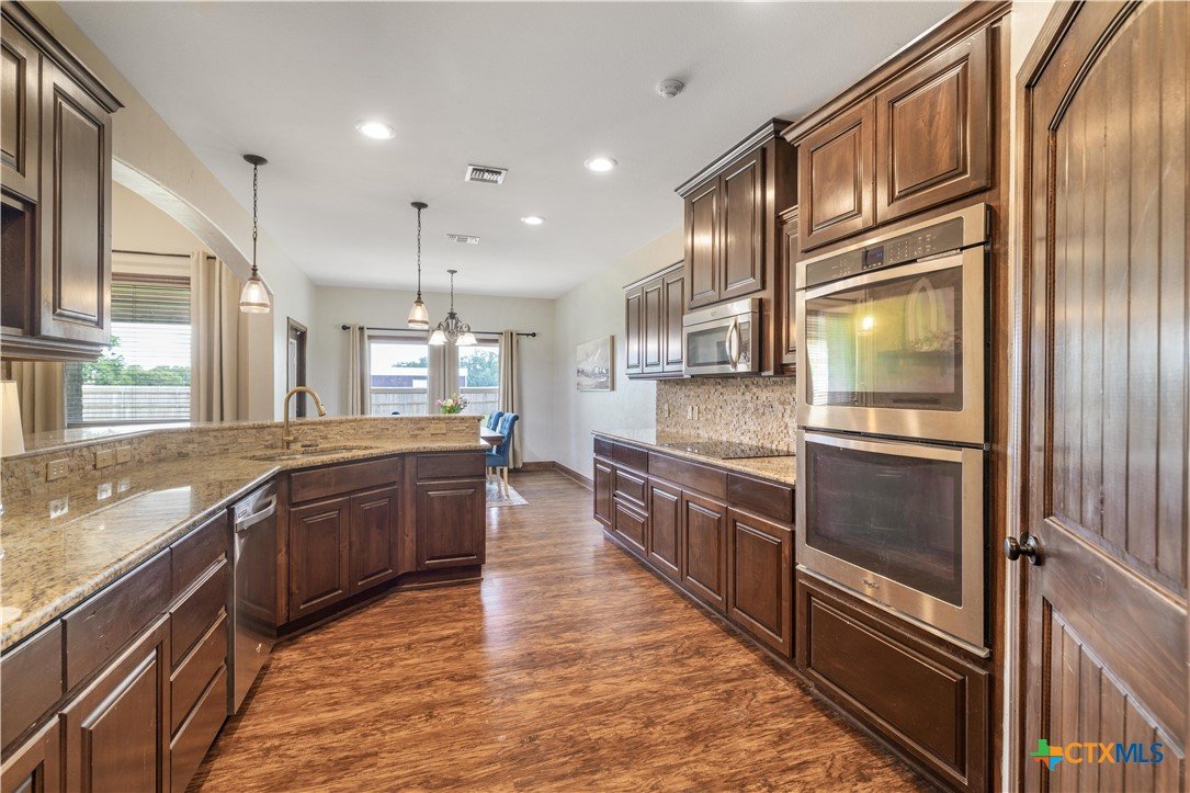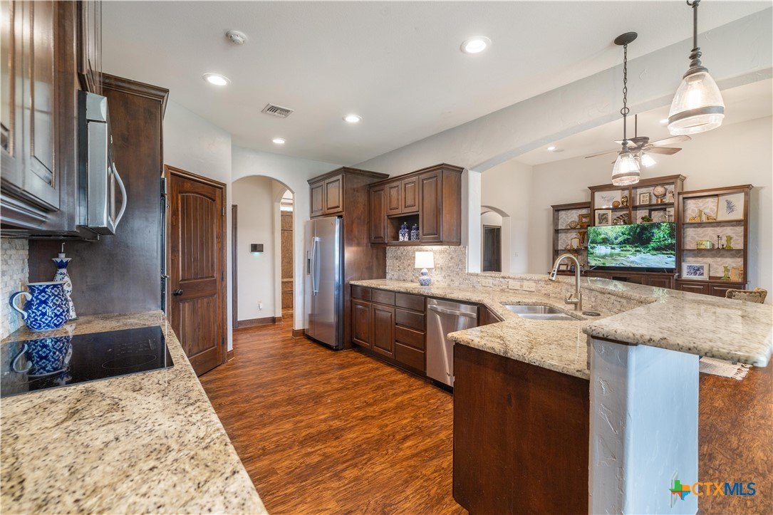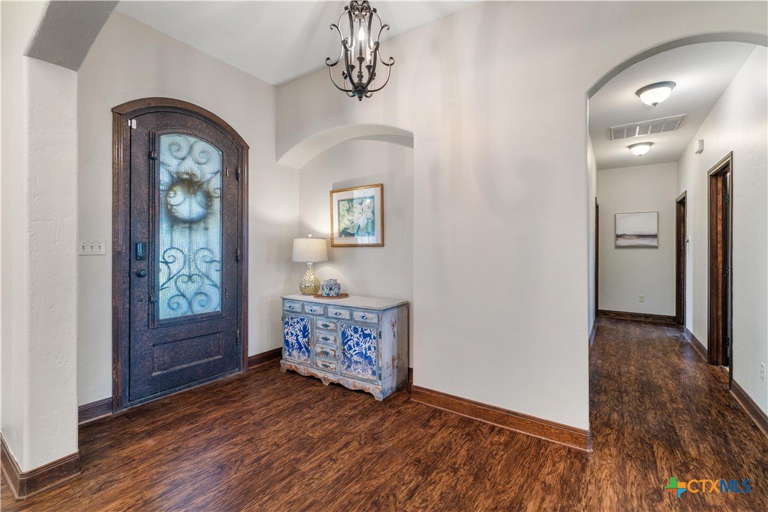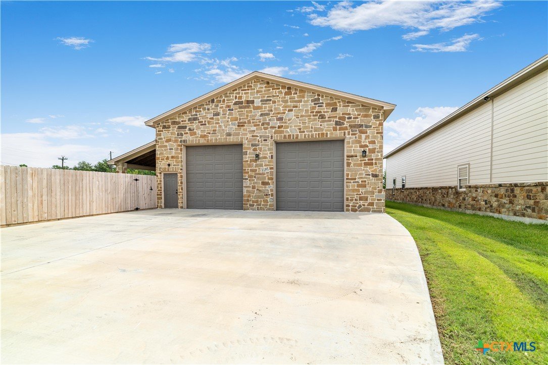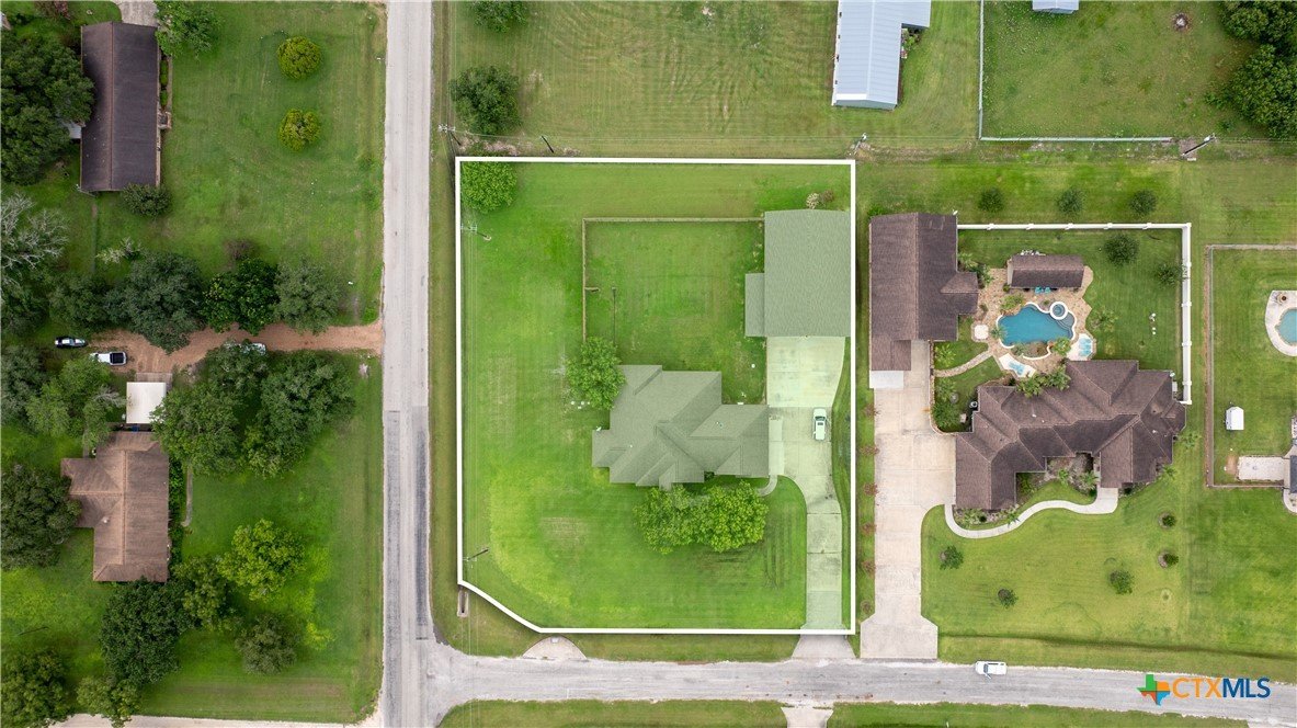 Spring Ridge is known for its beautiful custom homes and they rarely hit the market. Don’t miss this opportunity! Rustic charm meets modern flair in this stunning custom-built Hill Country-style home on over an acre in Spring Ridge Subdivision! This spacious 4-bedroom, 3-bath home offers approx. 2,700 sq ft of well-designed living space with custom finishes throughout PLUS a massive shop and no city taxes! Step inside the welcoming entryway to find engineered hardwood floors, solid wood doors, a rock-accented gas fireplace, and a built-in entertainment center. The open-concept kitchen features double ovens, granite counters, custom cabinetry, and a walk-in pantry perfect for any chef. Each bedroom has extra-large walk-in closets, with built-in dressers in three of them for plenty of storage. The luxurious primary suite includes large windows overlooking the expansive backyard, a huge tile shower, jetted tub, separate vanities, and a spacious walk-in closet with natural light. Designed for entertaining, the home offers two dining areas, a versatile game room/man cave, and a large laundry room with sink. A security system with perimeter cameras, water softener, sprinkler system, and a history of low utilities add to the appeal. Outside, enjoy covered porches and a wide-open backyard perfect for adding a pool, plus a newer privacy fence (2024), a dog run for pets, and an impressive 40' x 60' workshop with 16’ ceilings and two 12’ roll-up doors (2022). The 2,400 sq ft shop is plumbed for a bathroom and offers excellent storage for tools, toys, or projects giving you plenty of space inside and out. Set on a generous corner lot in an established neighborhood with minimal traffic, this property offers peaceful country living just minutes from Victoria amenities and Victoria ISD schools. (Note: House number stone in front holds sentimental value and is excluded.)