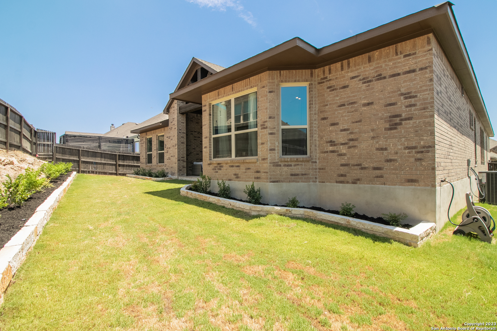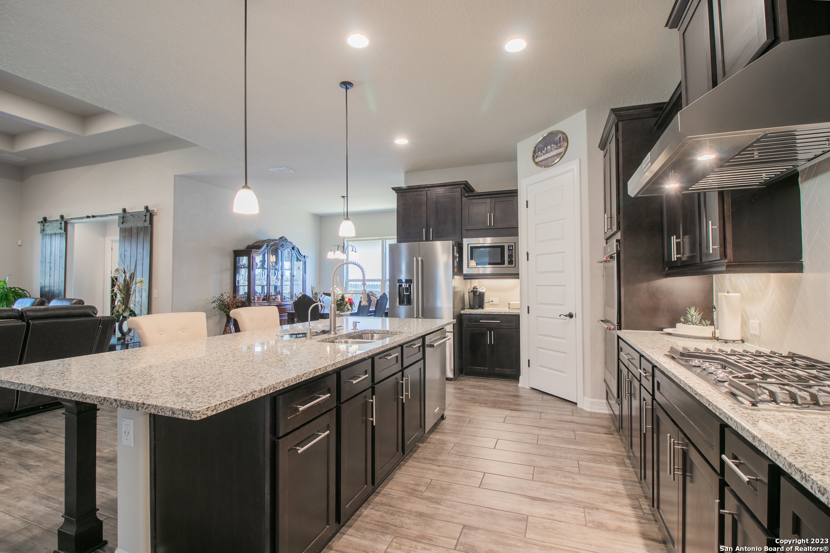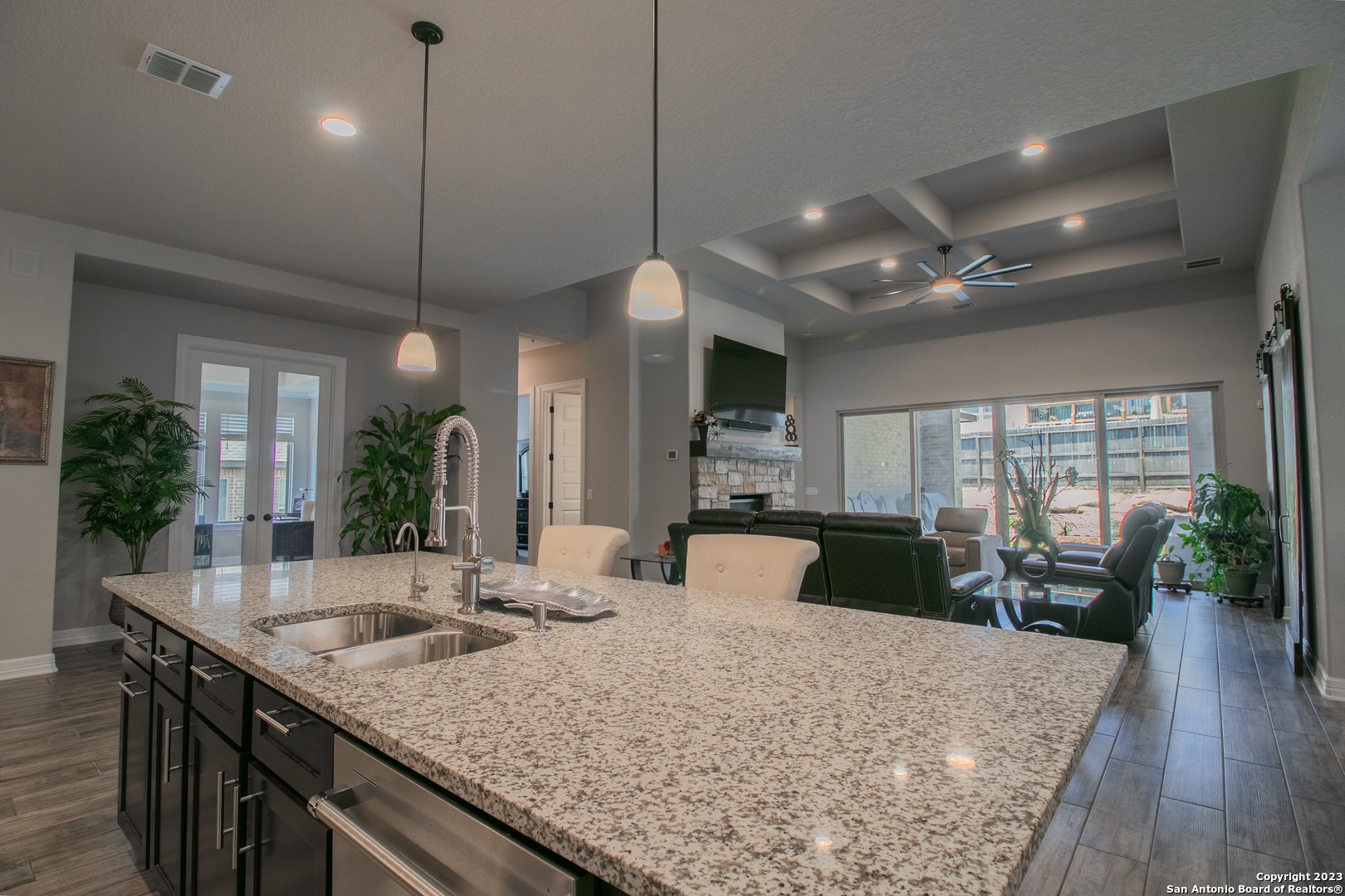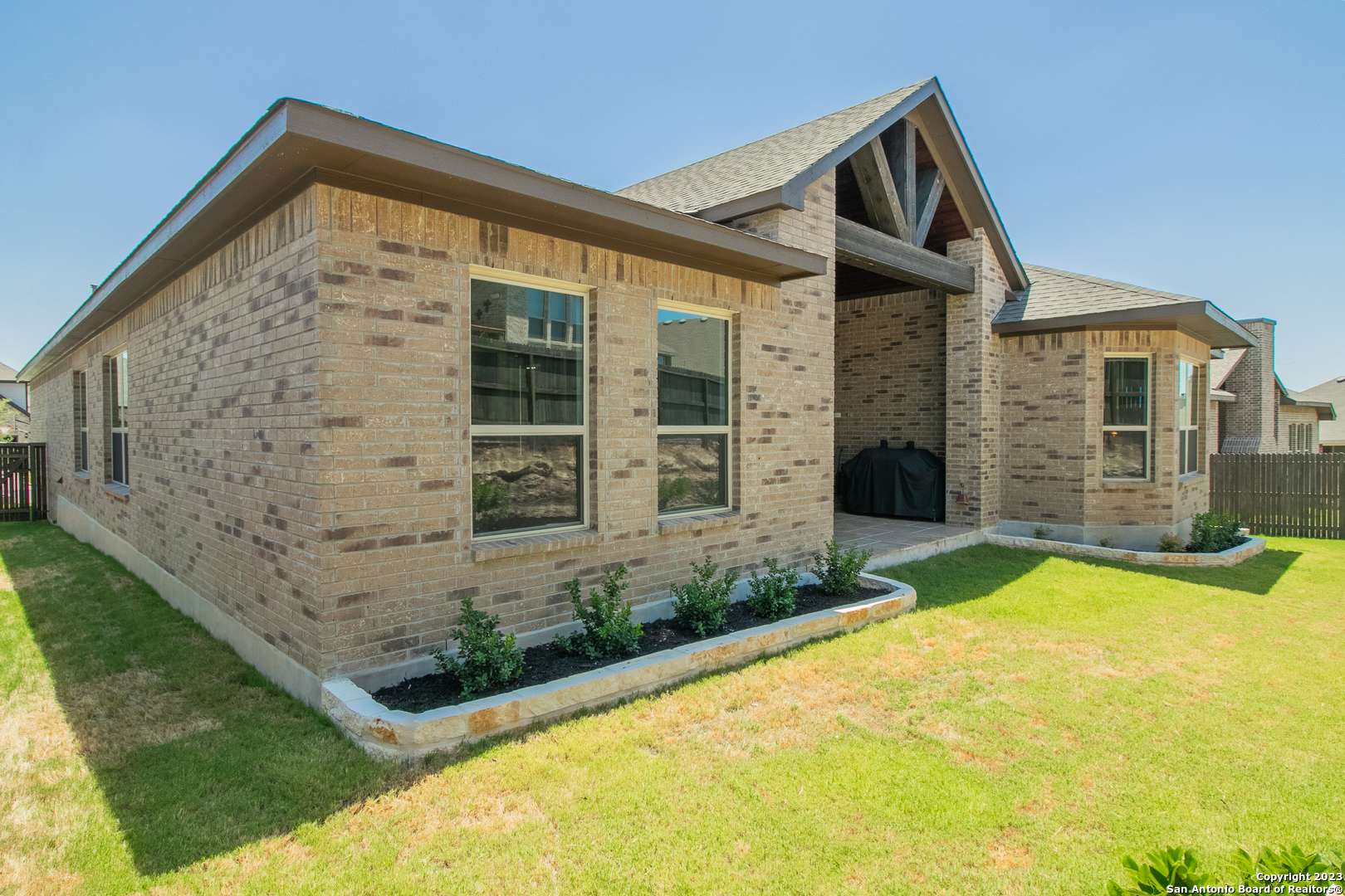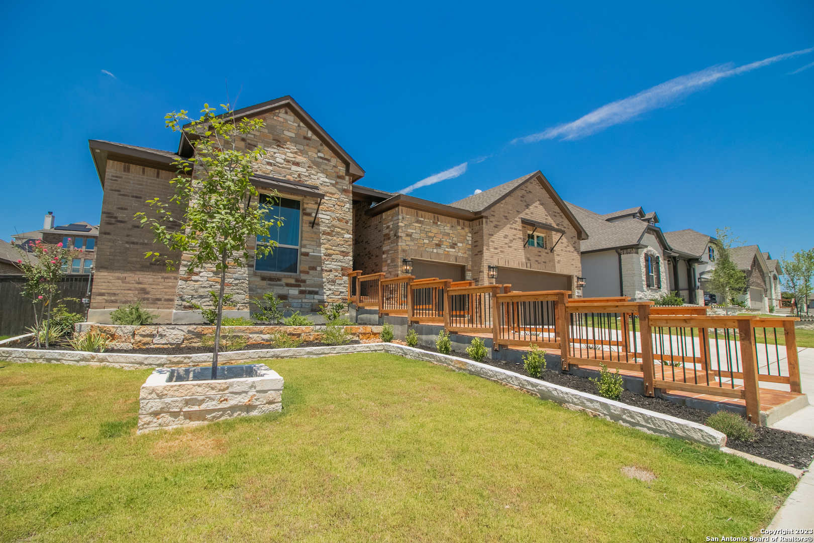 Welcome to this pristine 4 bedroom 3.5 bath home built by Sitterle in 2022. This stone & brick single story home is in the gated Sunday Creek at Kinder Ranch and boasts over 70k in upgrades! The front yard features stone borders, stamping to the front entry landings and impeccable landscaping. You are greeted by an upgraded front door and expansive entryway into the open concept layout. Wood-look tile throughout the main living areas. The kitchen has the entertainment upgraded package: Double ovens, lighting & upgraded cabinetry. The kitchen also features stainless steel appliances, large island w/space for seating, gas cooktop and walk-in pantry. Chef's dream! The family room offers a gorgeous stone gas fireplace w/wooden mantel, upgraded coffered ceilings & stunning bi-parting sliding door access to the backyard living. Off of the family room is the flex space w/barn doors, half bathroom & outdoor access. Can be used as a game or media room. The primary suite features the luxury package: extended walk-in shower, freestanding tub, granite countertops & cabinetry. The primary suite also offers french door access, a spacious walk-in closet & upgraded: tray ceilings, bay window & roll out drawers. The dining room (currently a study) w/french door access & upgraded tray ceilings & recessed lighting. Office (currently exercise rm) w/views to the backyard. 3 great sized secondary bedrooms. Upgraded granite countertops and cabinetry in the secondary bathrooms. The laundry room has added cabinetry space. Exterior features include the outdoor living package (extended patio, cedar plank ceiling, cement stamping), gas line at the patio, holiday light package, tons of privacy and stone border planters. Three car garage w/epoxy flooring on all bays. The attention to detail is endless! Comal ISD! Easy access to 281.