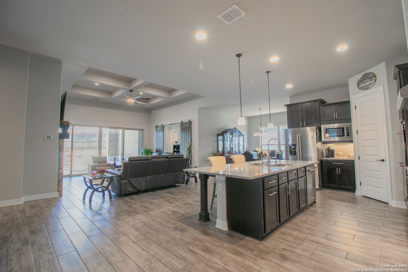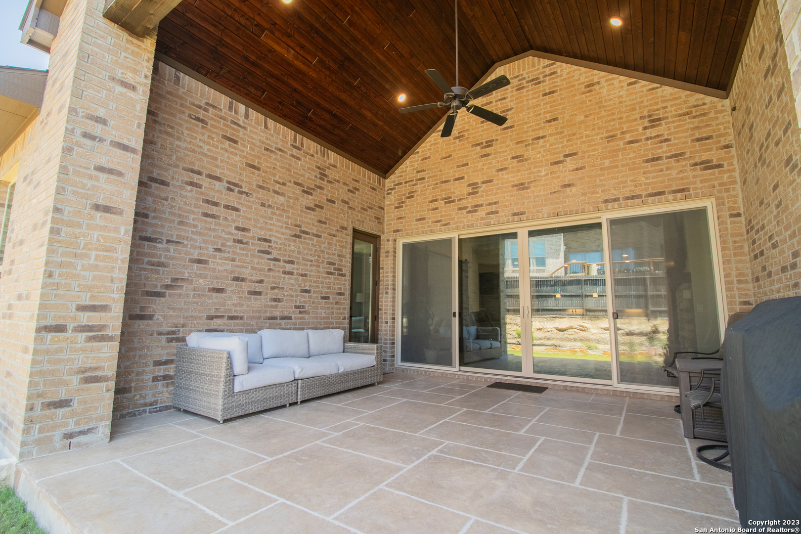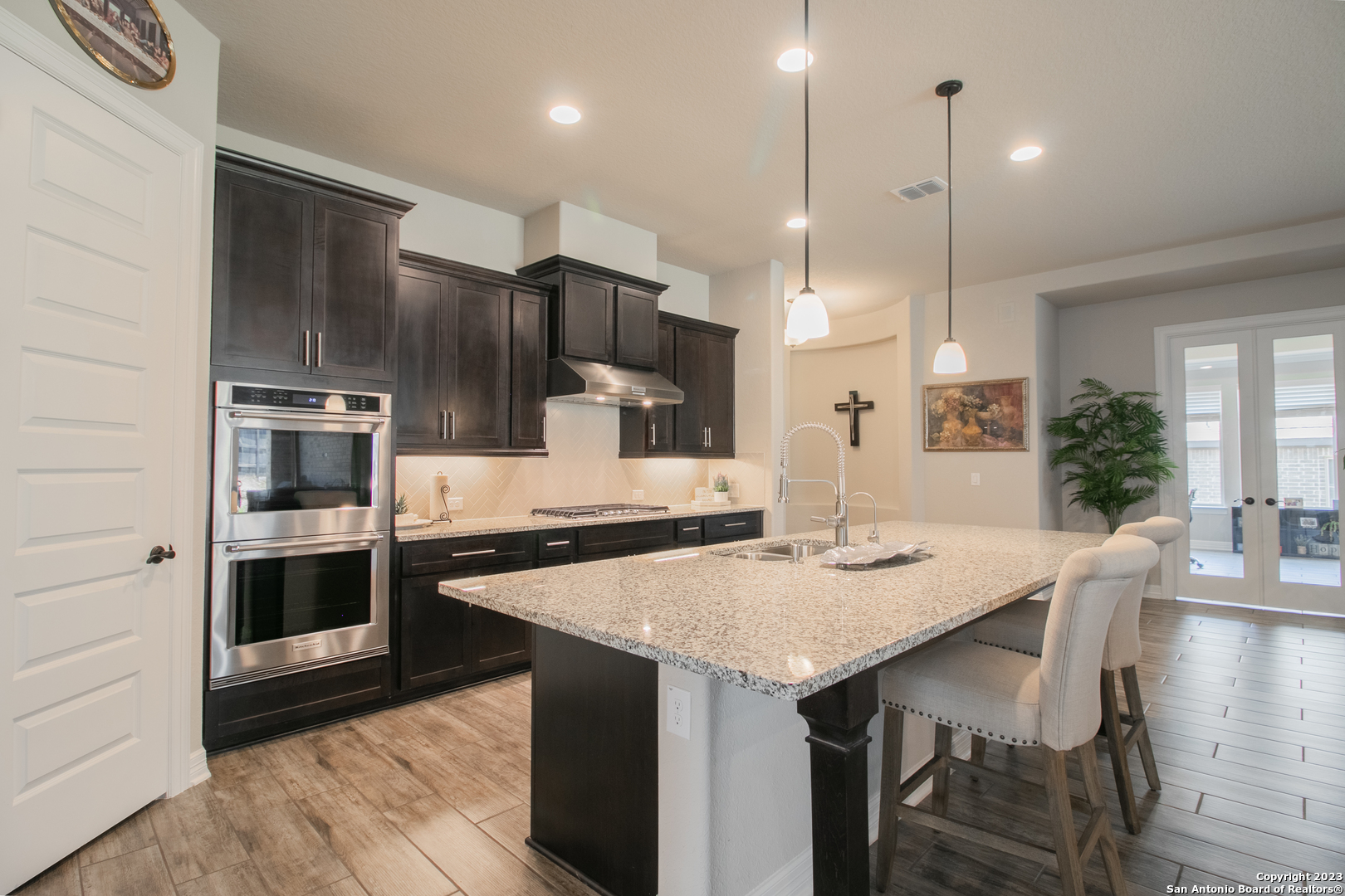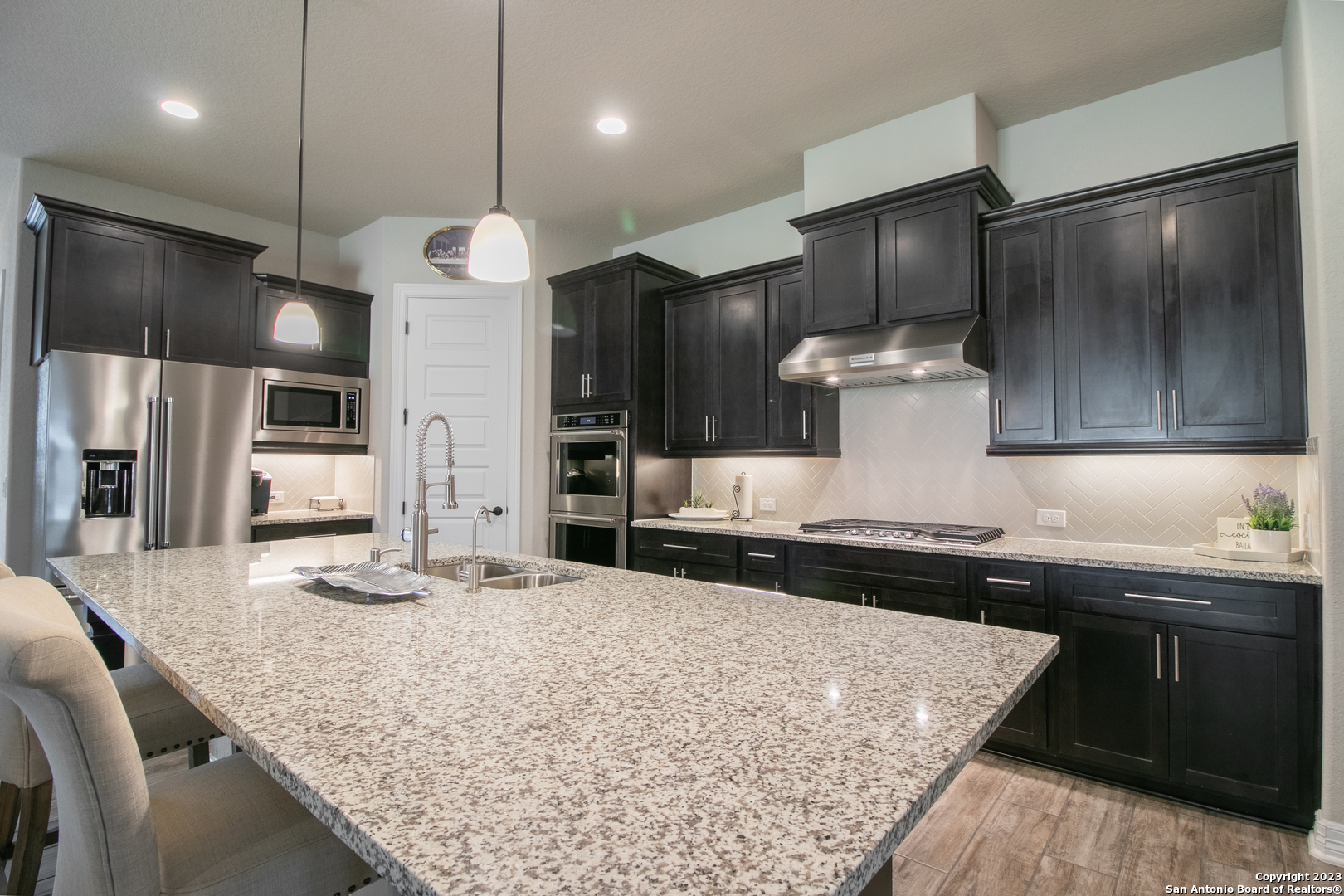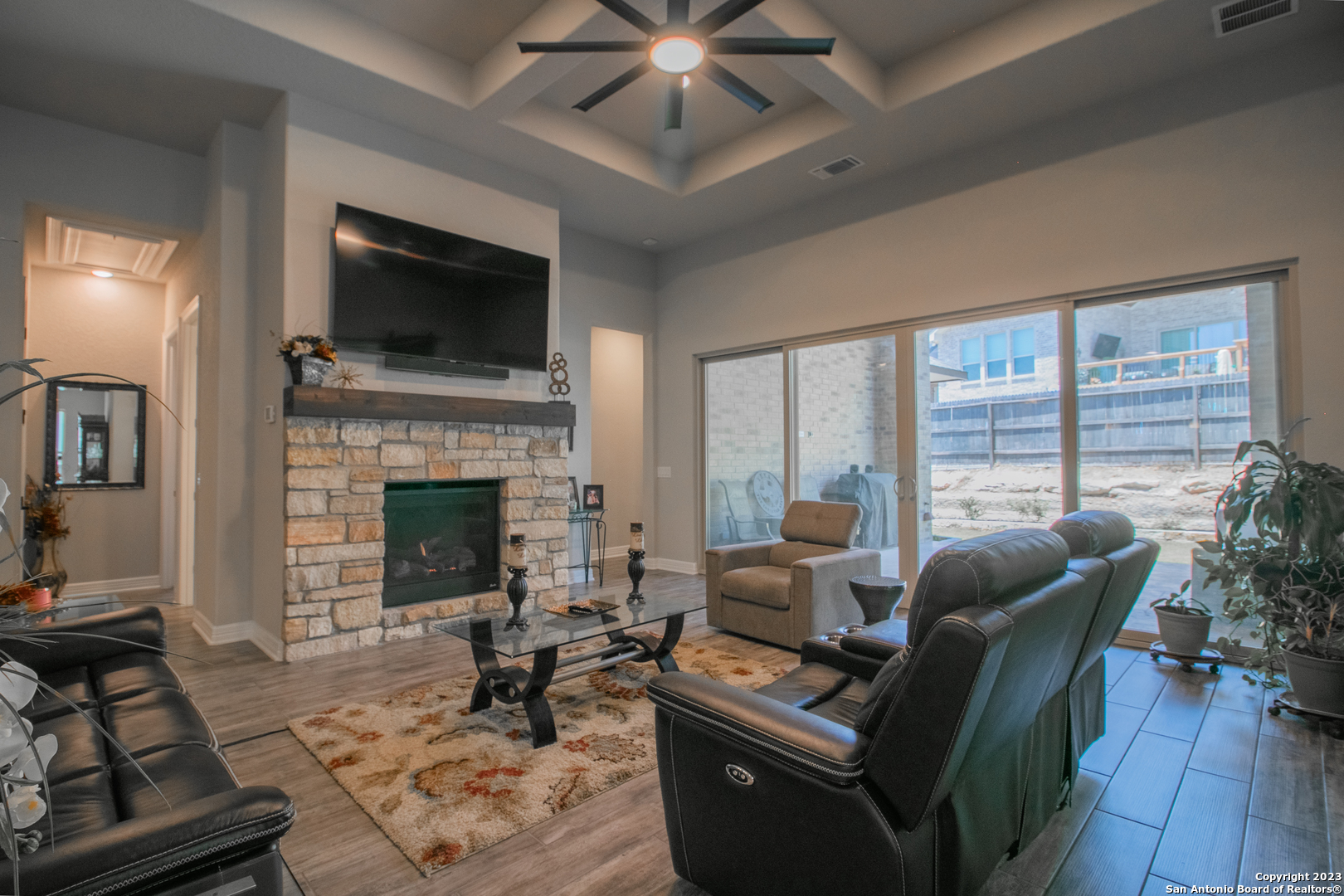 Welcome to this pristine 4 bedroom 3.5 bath home built by Sitterle in 2022. This stone & brick single story home is in the gated Sunday Creek at Kinder Ranch and boasts over 70k in upgrades! The front yard features stone borders, stamping to the front entry landings and impeccable landscaping. You are greeted by an upgraded front door and expansive entryway into the open concept layout. Wood-look tile throughout the main living areas. The kitchen has the entertainment upgraded package: Double ovens, lighting & upgraded cabinetry. The kitchen also features stainless steel appliances, large island w/space for seating, gas cooktop and walk-in pantry. Chef's dream! The family room offers a gorgeous stone gas fireplace w/wooden mantel, upgraded coffered ceilings & stunning bi-parting sliding door access to the backyard living. Off of the family room is the flex space w/barn doors, half bathroom & outdoor access. Can be used as a game or media room. The primary suite features the luxury package: extended walk-in shower, freestanding tub, granite countertops & cabinetry. The primary suite also offers french door access, a spacious walk-in closet & upgraded: tray ceilings, bay window & roll out drawers. The dining room (currently a study) w/french door access & upgraded tray ceilings & recessed lighting. Office (currently exercise rm) w/views to the backyard. 3 great sized secondary bedrooms. Upgraded granite countertops and cabinetry in the secondary bathrooms. The laundry room has added cabinetry space. Exterior features include the outdoor living package (extended patio, cedar plank ceiling, cement stamping), gas line at the patio, holiday light package, tons of privacy and stone border planters. Three car garage w/epoxy flooring on all bays. The attention to detail is endless! Comal ISD! Easy access to 281.