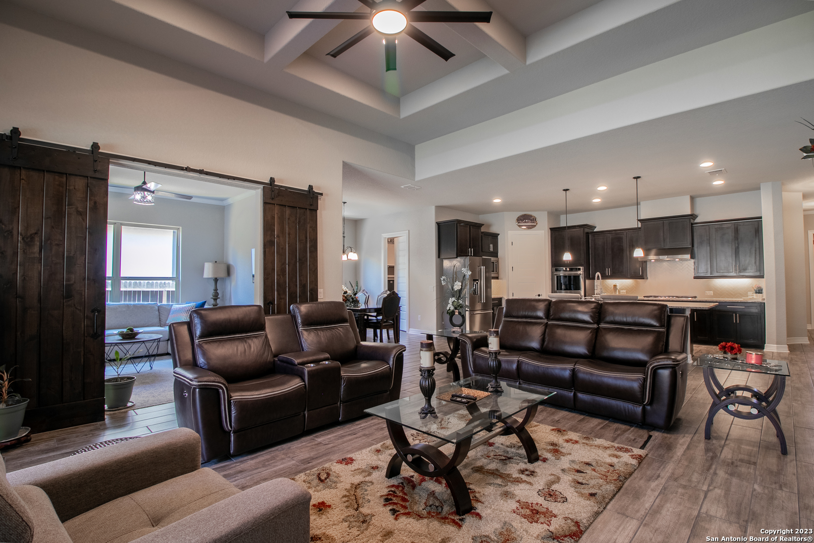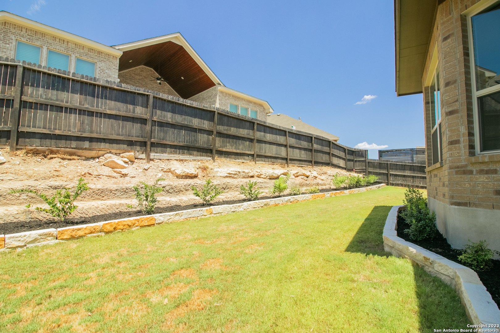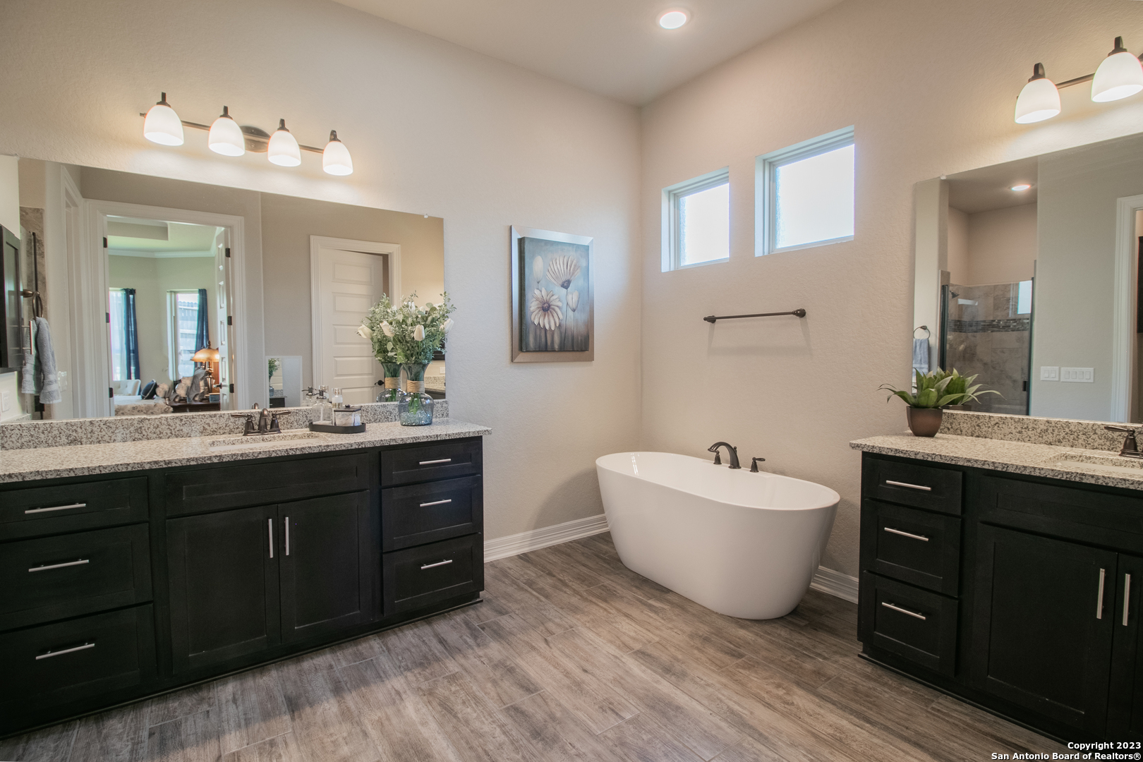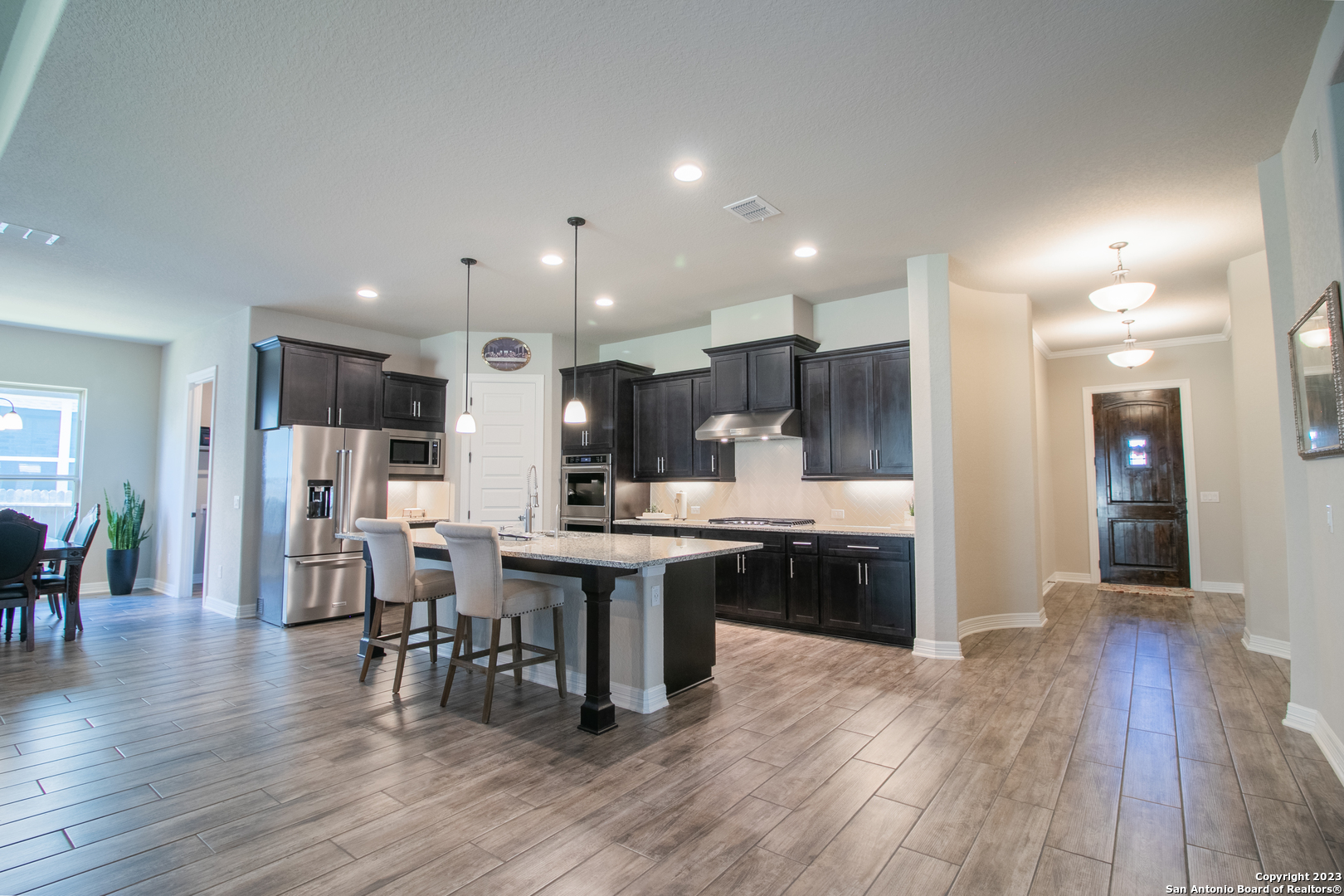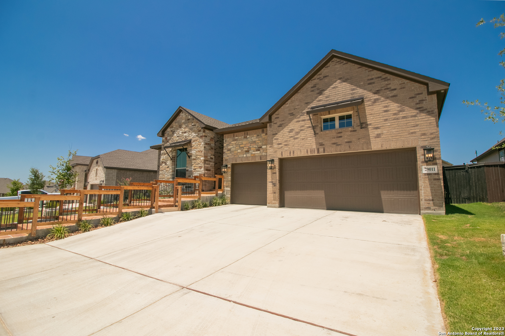 Welcome to this pristine 4 bedroom 3.5 bath home built by Sitterle in 2022. This stone & brick single story home is in the gated Sunday Creek at Kinder Ranch and boasts over 70k in upgrades! The front yard features stone borders, stamping to the front entry landings and impeccable landscaping. You are greeted by an upgraded front door and expansive entryway into the open concept layout. Wood-look tile throughout the main living areas. The kitchen has the entertainment upgraded package: Double ovens, lighting & upgraded cabinetry. The kitchen also features stainless steel appliances, large island w/space for seating, gas cooktop and walk-in pantry. Chef's dream! The family room offers a gorgeous stone gas fireplace w/wooden mantel, upgraded coffered ceilings & stunning bi-parting sliding door access to the backyard living. Off of the family room is the flex space w/barn doors, half bathroom & outdoor access. Can be used as a game or media room. The primary suite features the luxury package: extended walk-in shower, freestanding tub, granite countertops & cabinetry. The primary suite also offers french door access, a spacious walk-in closet & upgraded: tray ceilings, bay window & roll out drawers. The dining room (currently a study) w/french door access & upgraded tray ceilings & recessed lighting. Office (currently exercise rm) w/views to the backyard. 3 great sized secondary bedrooms. Upgraded granite countertops and cabinetry in the secondary bathrooms. The laundry room has added cabinetry space. Exterior features include the outdoor living package (extended patio, cedar plank ceiling, cement stamping), gas line at the patio, holiday light package, tons of privacy and stone border planters. Three car garage w/epoxy flooring on all bays. The attention to detail is endless! Comal ISD! Easy access to 281.