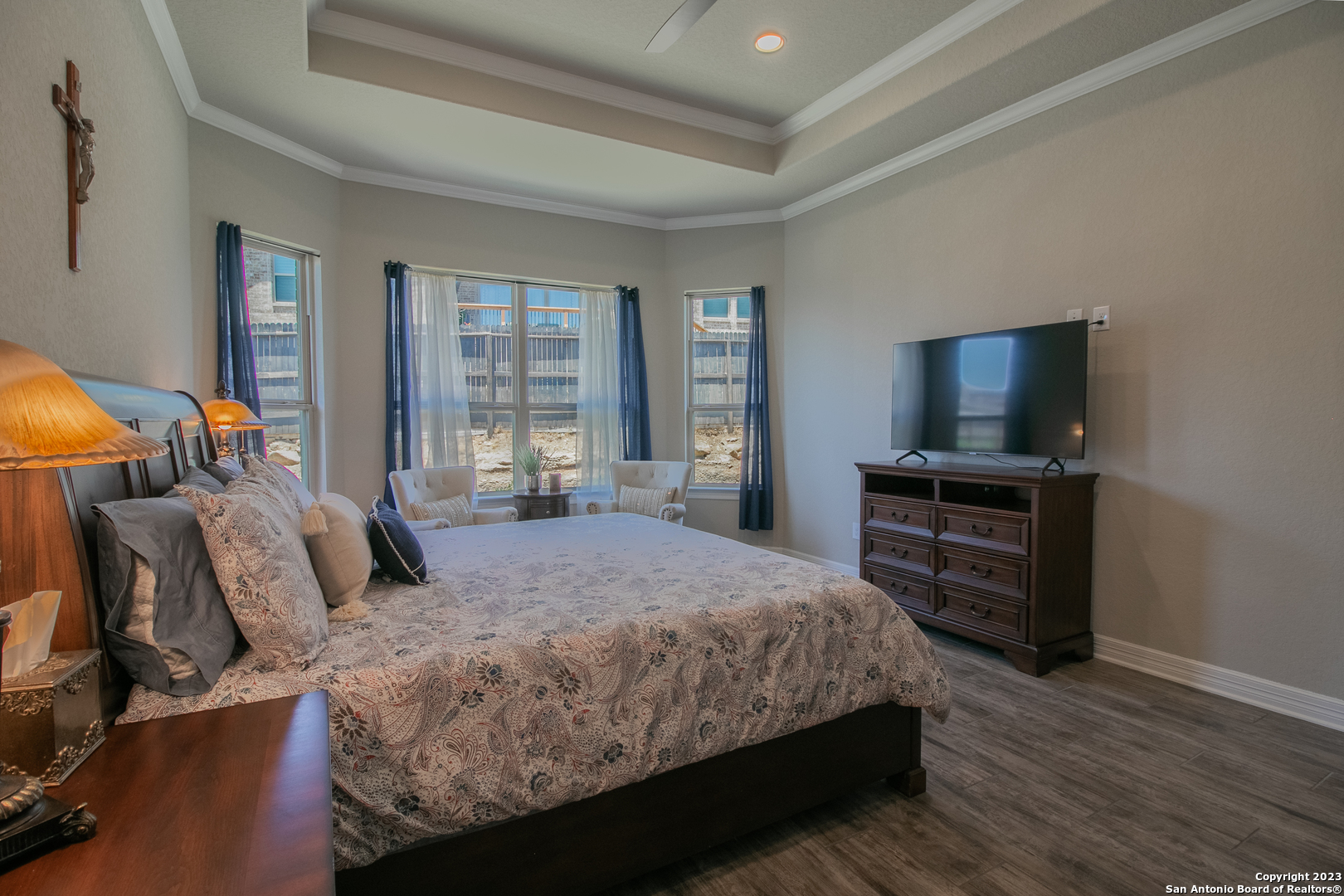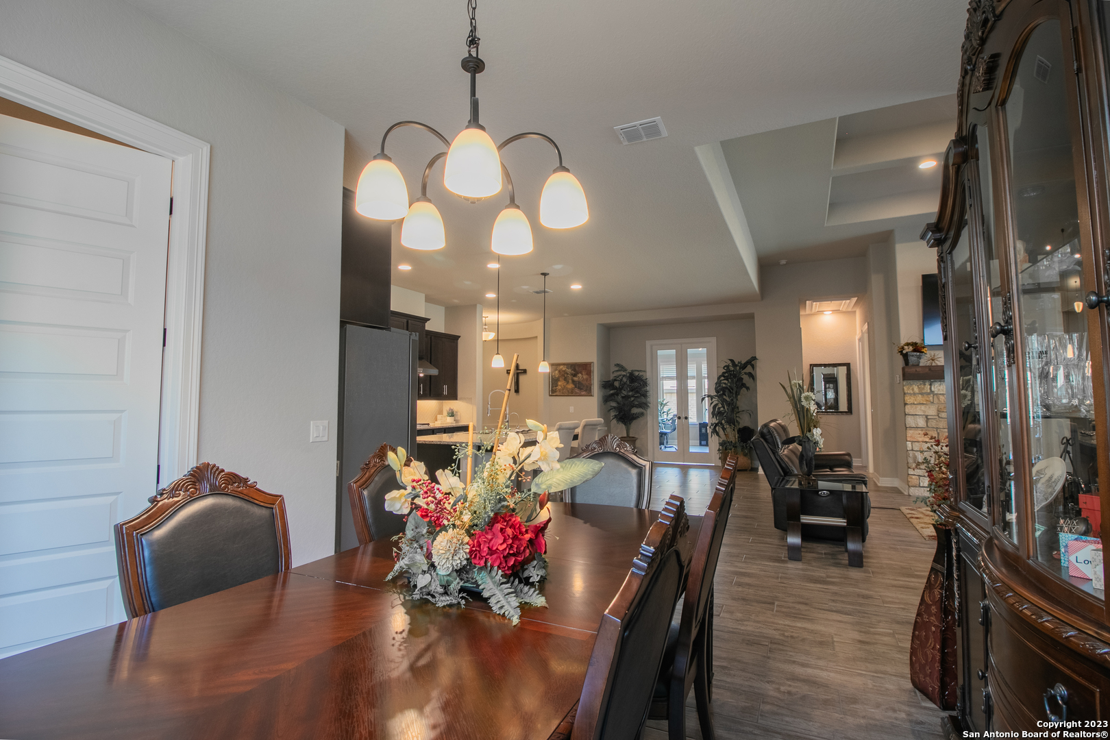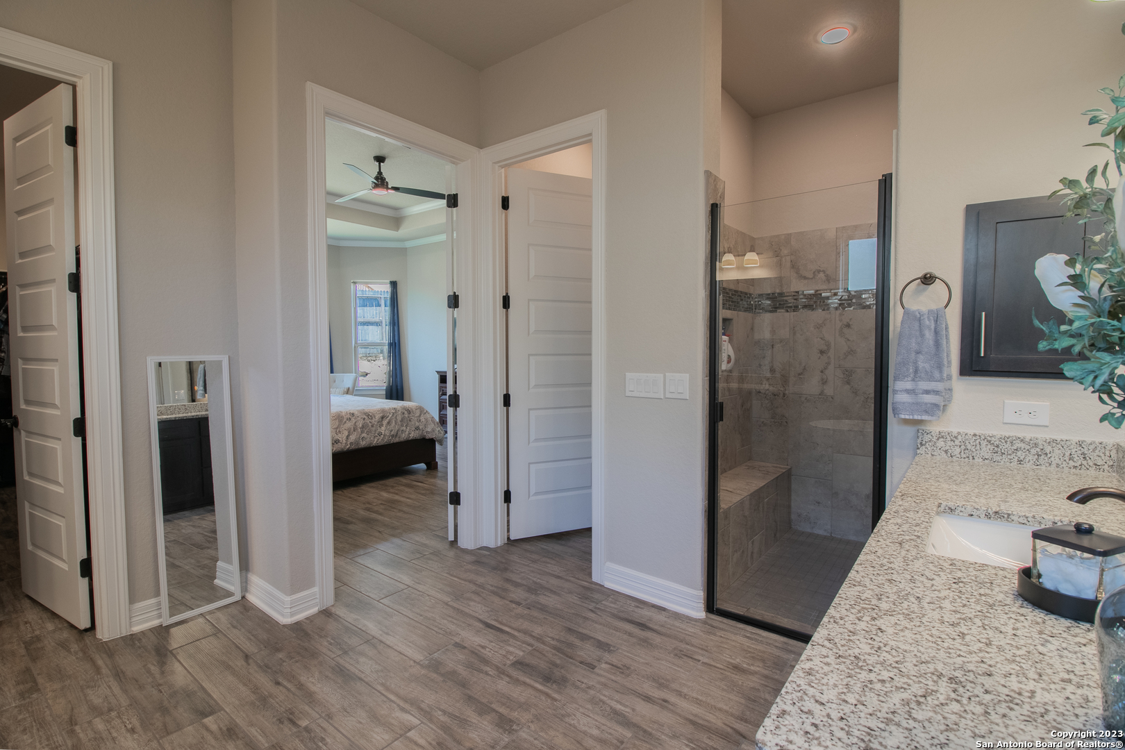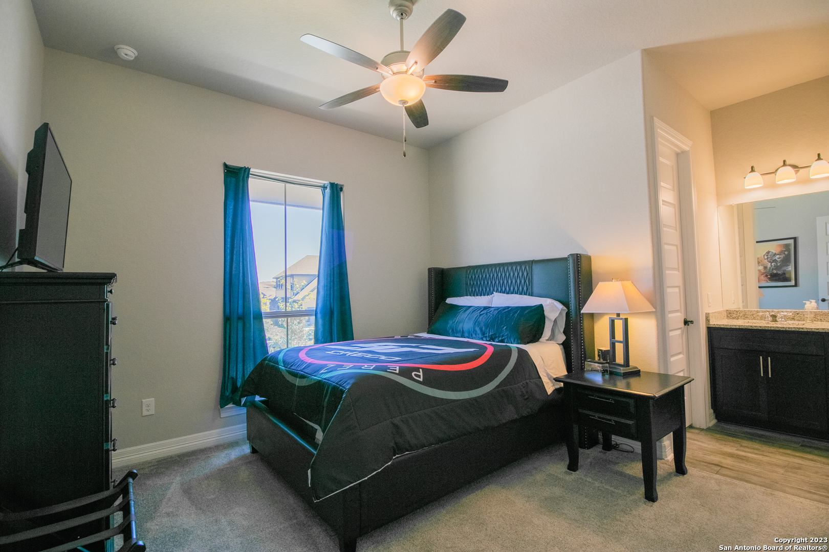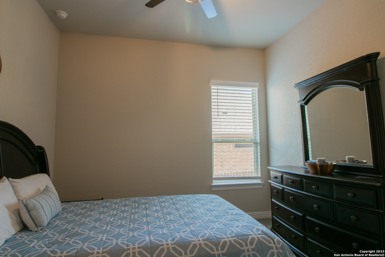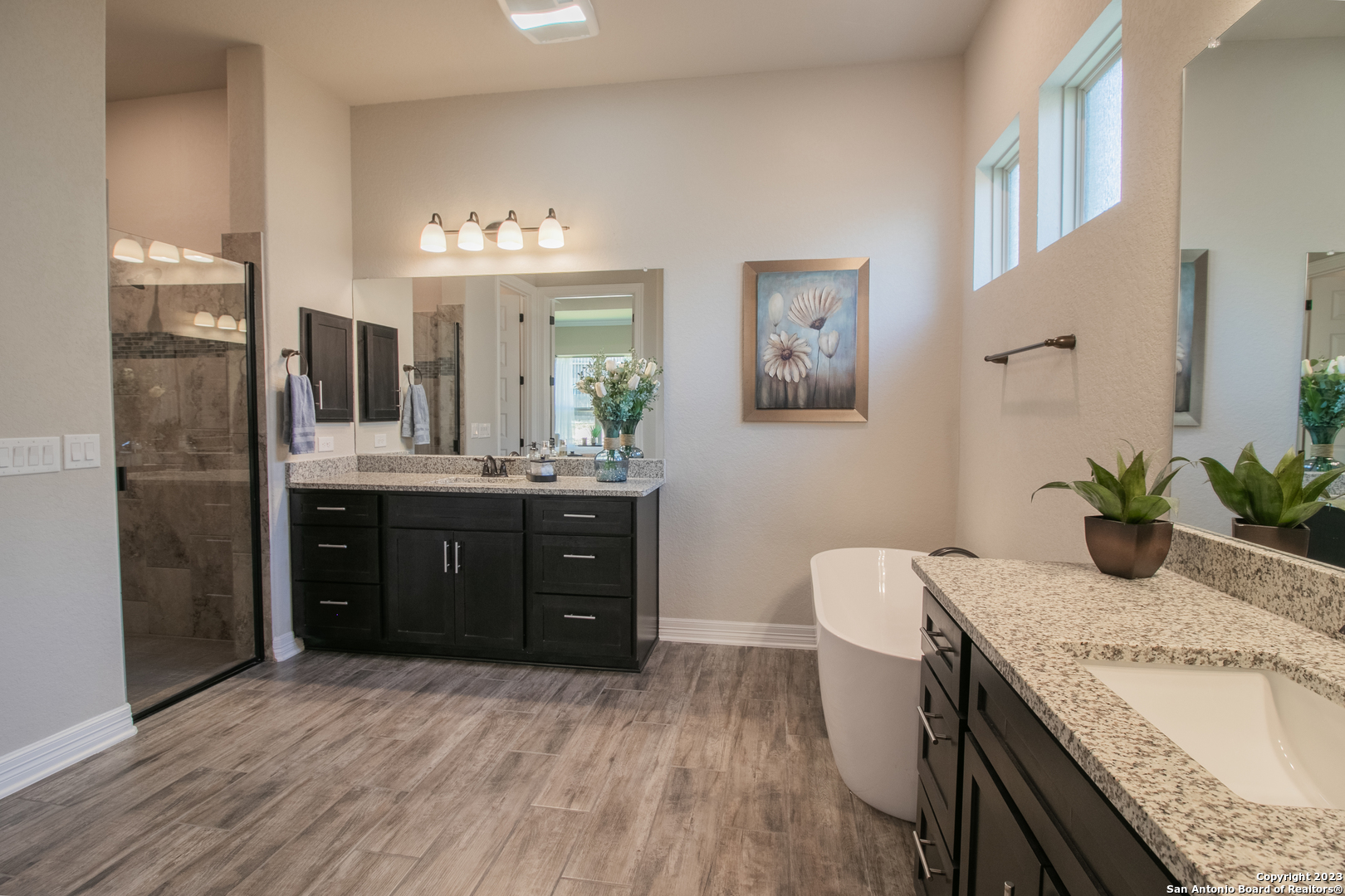 Welcome to this pristine 4 bedroom 3.5 bath home built by Sitterle in 2022. This stone & brick single story home is in the gated Sunday Creek at Kinder Ranch and boasts over 70k in upgrades! The front yard features stone borders, stamping to the front entry landings and impeccable landscaping. You are greeted by an upgraded front door and expansive entryway into the open concept layout. Wood-look tile throughout the main living areas. The kitchen has the entertainment upgraded package: Double ovens, lighting & upgraded cabinetry. The kitchen also features stainless steel appliances, large island w/space for seating, gas cooktop and walk-in pantry. Chef's dream! The family room offers a gorgeous stone gas fireplace w/wooden mantel, upgraded coffered ceilings & stunning bi-parting sliding door access to the backyard living. Off of the family room is the flex space w/barn doors, half bathroom & outdoor access. Can be used as a game or media room. The primary suite features the luxury package: extended walk-in shower, freestanding tub, granite countertops & cabinetry. The primary suite also offers french door access, a spacious walk-in closet & upgraded: tray ceilings, bay window & roll out drawers. The dining room (currently a study) w/french door access & upgraded tray ceilings & recessed lighting. Office (currently exercise rm) w/views to the backyard. 3 great sized secondary bedrooms. Upgraded granite countertops and cabinetry in the secondary bathrooms. The laundry room has added cabinetry space. Exterior features include the outdoor living package (extended patio, cedar plank ceiling, cement stamping), gas line at the patio, holiday light package, tons of privacy and stone border planters. Three car garage w/epoxy flooring on all bays. The attention to detail is endless! Comal ISD! Easy access to 281.