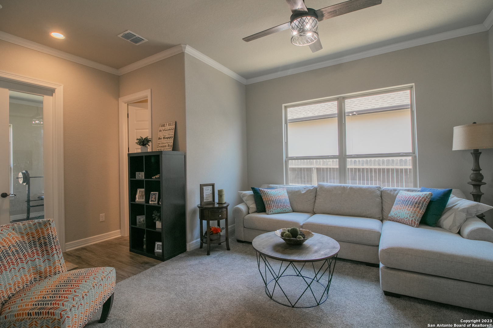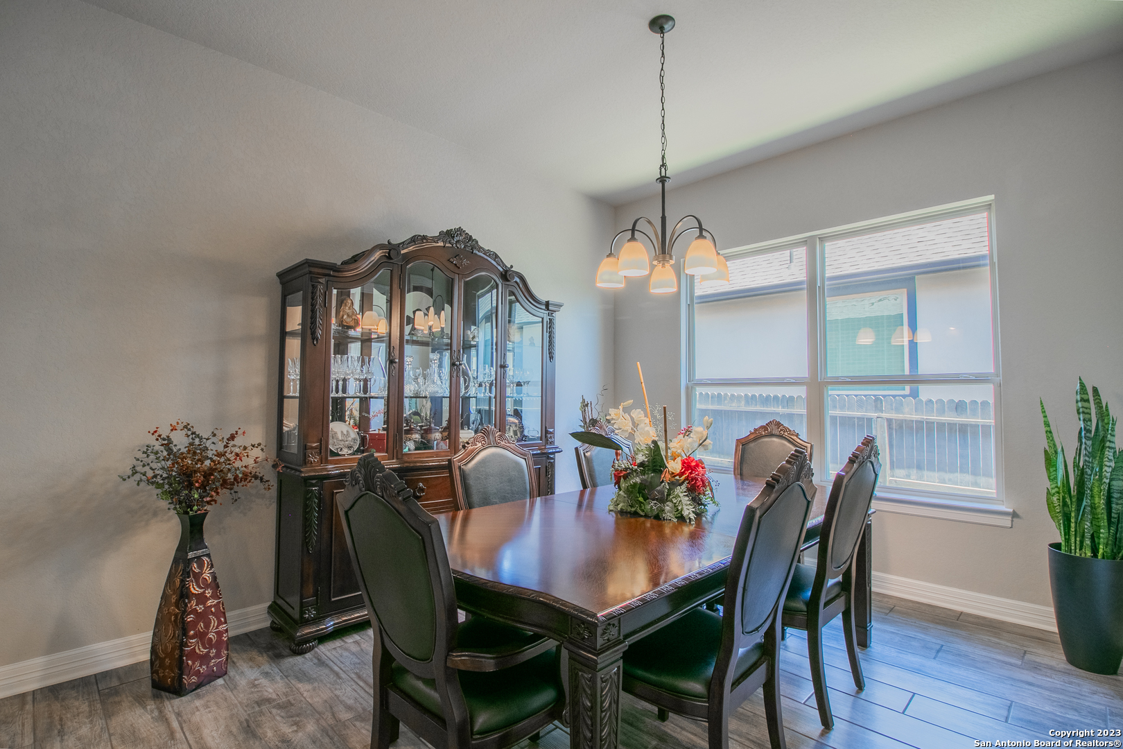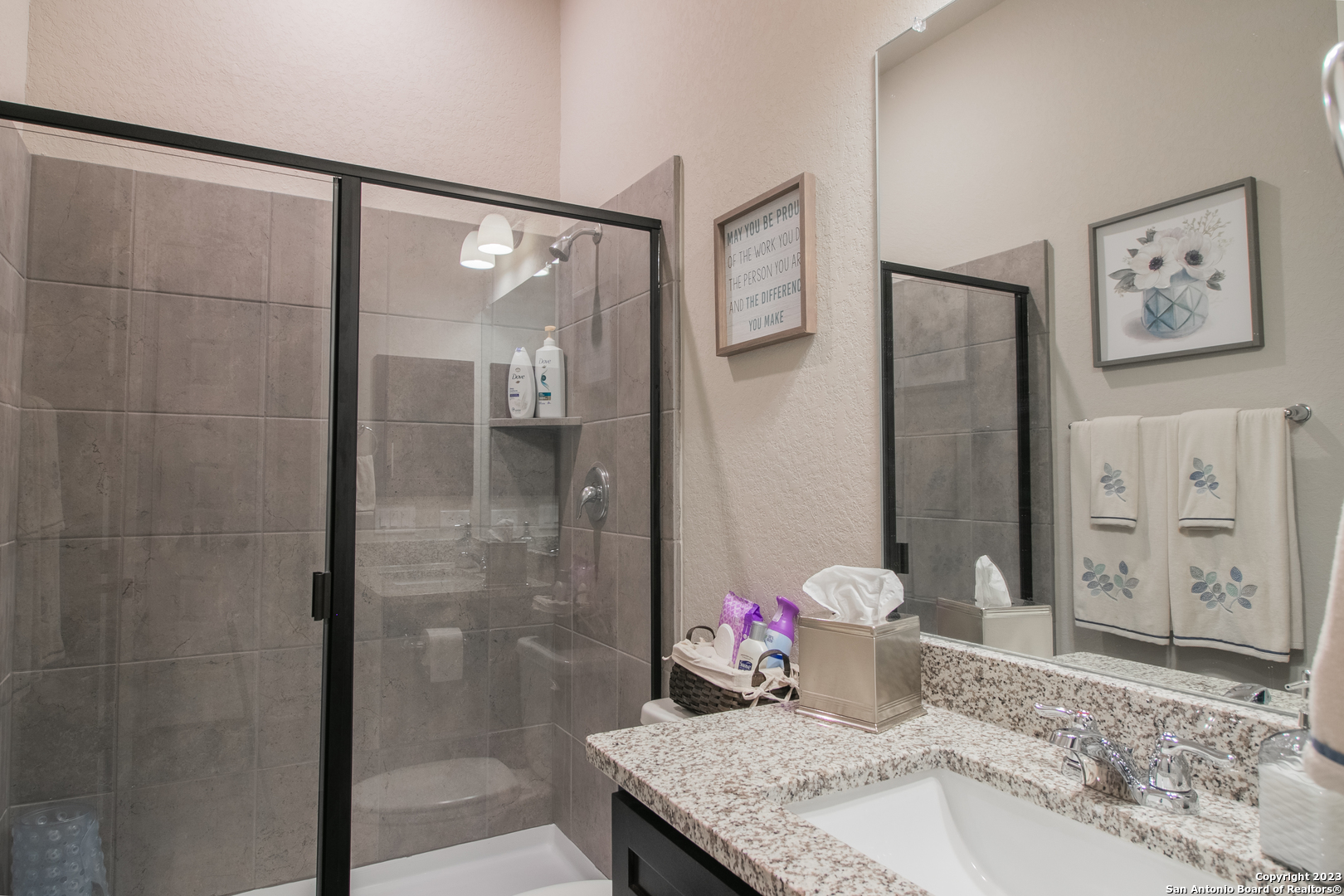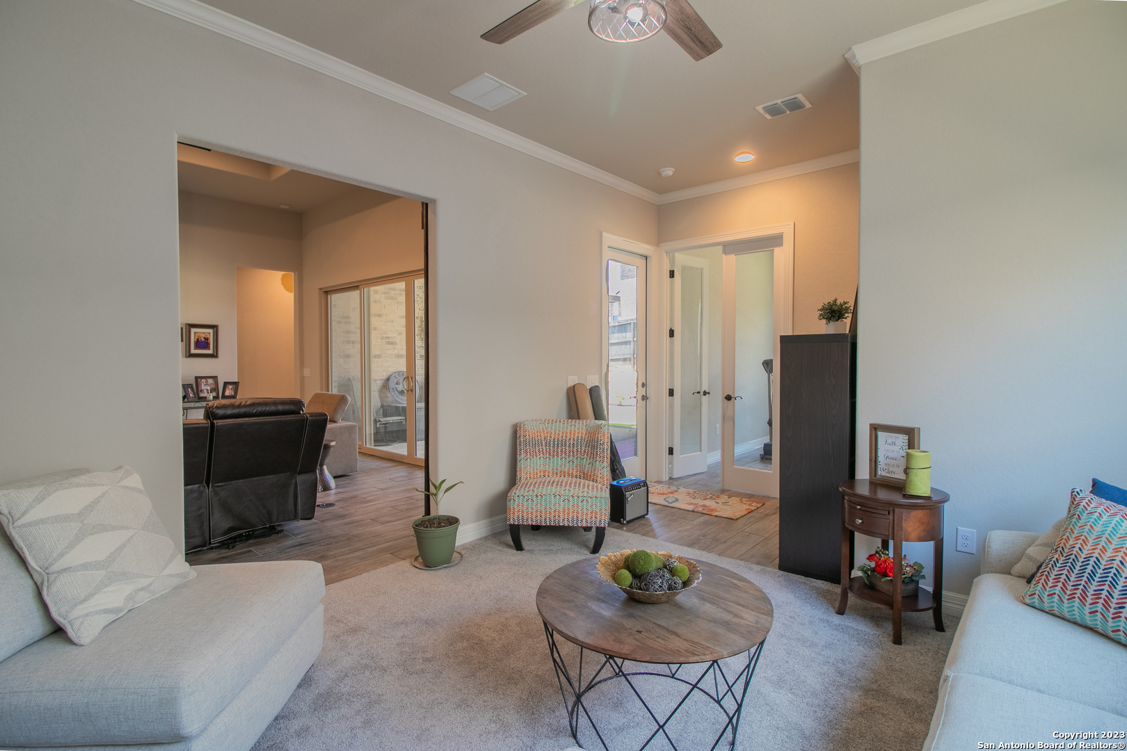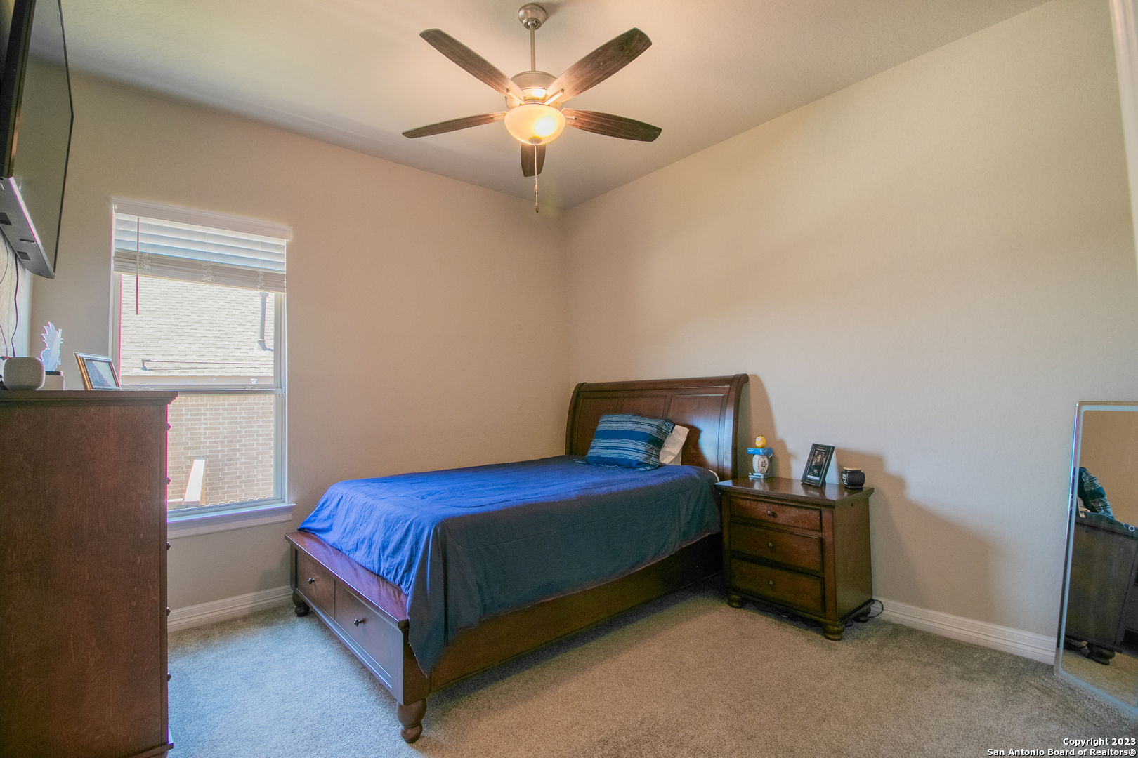 Welcome to this pristine 4 bedroom 3.5 bath home built by Sitterle in 2022. This stone & brick single story home is in the gated Sunday Creek at Kinder Ranch and boasts over 70k in upgrades! The front yard features stone borders, stamping to the front entry landings and impeccable landscaping. You are greeted by an upgraded front door and expansive entryway into the open concept layout. Wood-look tile throughout the main living areas. The kitchen has the entertainment upgraded package: Double ovens, lighting & upgraded cabinetry. The kitchen also features stainless steel appliances, large island w/space for seating, gas cooktop and walk-in pantry. Chef's dream! The family room offers a gorgeous stone gas fireplace w/wooden mantel, upgraded coffered ceilings & stunning bi-parting sliding door access to the backyard living. Off of the family room is the flex space w/barn doors, half bathroom & outdoor access. Can be used as a game or media room. The primary suite features the luxury package: extended walk-in shower, freestanding tub, granite countertops & cabinetry. The primary suite also offers french door access, a spacious walk-in closet & upgraded: tray ceilings, bay window & roll out drawers. The dining room (currently a study) w/french door access & upgraded tray ceilings & recessed lighting. Office (currently exercise rm) w/views to the backyard. 3 great sized secondary bedrooms. Upgraded granite countertops and cabinetry in the secondary bathrooms. The laundry room has added cabinetry space. Exterior features include the outdoor living package (extended patio, cedar plank ceiling, cement stamping), gas line at the patio, holiday light package, tons of privacy and stone border planters. Three car garage w/epoxy flooring on all bays. The attention to detail is endless! Comal ISD! Easy access to 281.