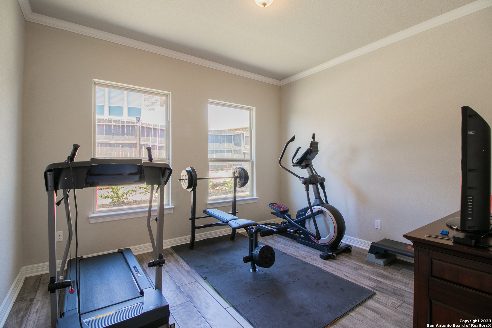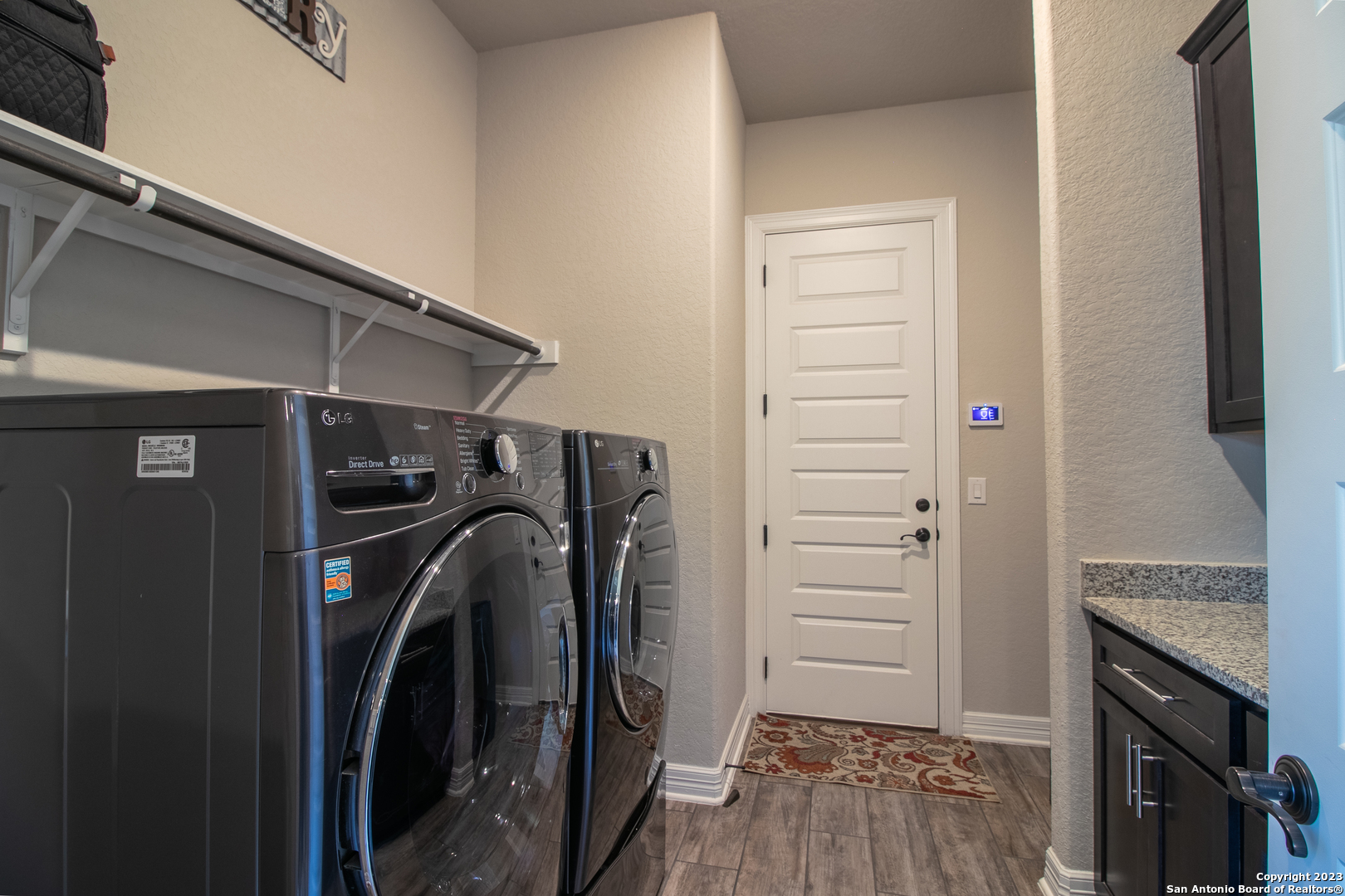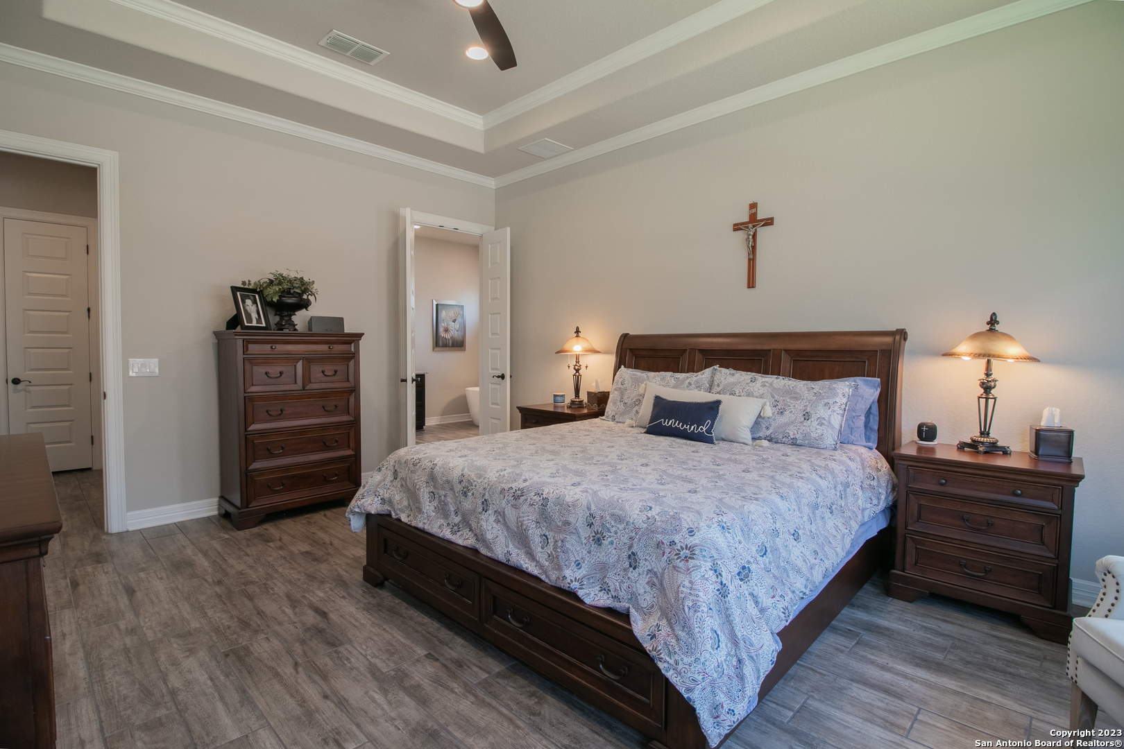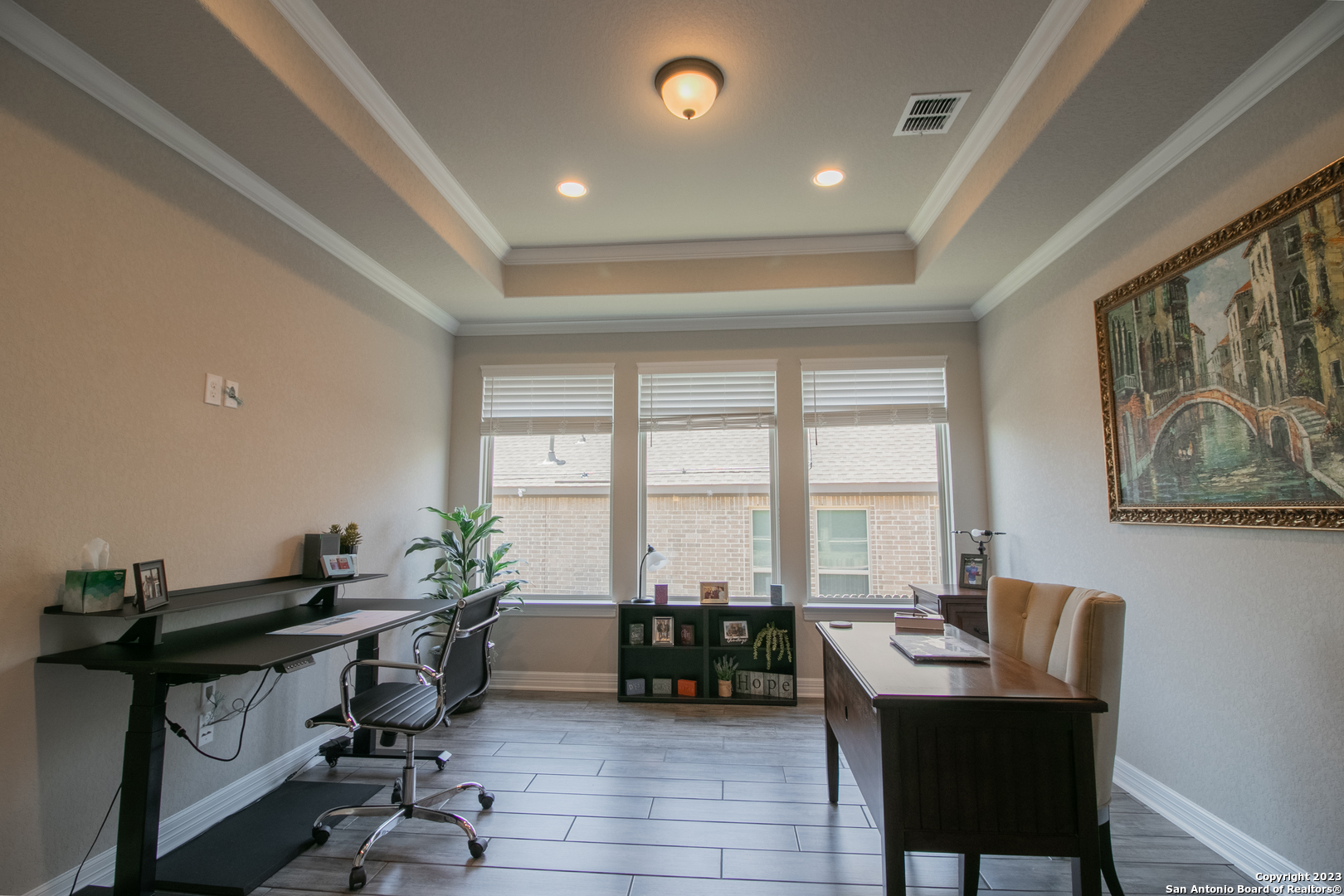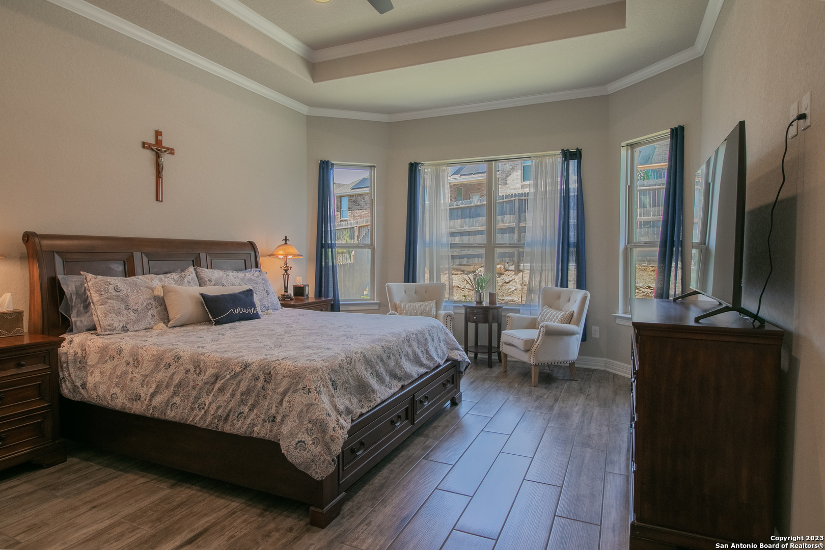 Welcome to this pristine 4 bedroom 3.5 bath home built by Sitterle in 2022. This stone & brick single story home is in the gated Sunday Creek at Kinder Ranch and boasts over 70k in upgrades! The front yard features stone borders, stamping to the front entry landings and impeccable landscaping. You are greeted by an upgraded front door and expansive entryway into the open concept layout. Wood-look tile throughout the main living areas. The kitchen has the entertainment upgraded package: Double ovens, lighting & upgraded cabinetry. The kitchen also features stainless steel appliances, large island w/space for seating, gas cooktop and walk-in pantry. Chef's dream! The family room offers a gorgeous stone gas fireplace w/wooden mantel, upgraded coffered ceilings & stunning bi-parting sliding door access to the backyard living. Off of the family room is the flex space w/barn doors, half bathroom & outdoor access. Can be used as a game or media room. The primary suite features the luxury package: extended walk-in shower, freestanding tub, granite countertops & cabinetry. The primary suite also offers french door access, a spacious walk-in closet & upgraded: tray ceilings, bay window & roll out drawers. The dining room (currently a study) w/french door access & upgraded tray ceilings & recessed lighting. Office (currently exercise rm) w/views to the backyard. 3 great sized secondary bedrooms. Upgraded granite countertops and cabinetry in the secondary bathrooms. The laundry room has added cabinetry space. Exterior features include the outdoor living package (extended patio, cedar plank ceiling, cement stamping), gas line at the patio, holiday light package, tons of privacy and stone border planters. Three car garage w/epoxy flooring on all bays. The attention to detail is endless! Comal ISD! Easy access to 281.