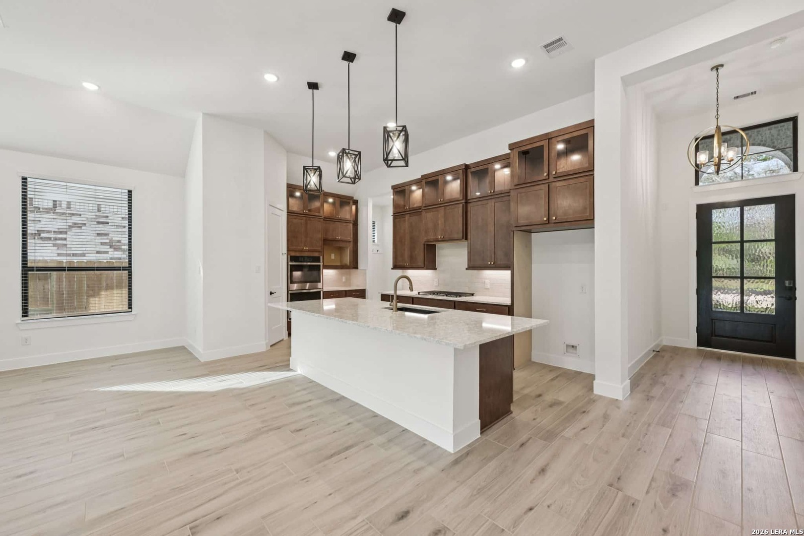 Welcome to this stunning one-story home nestled on an expansive .3-acre oversized lot in the charming town of Castroville. Backing to beautiful, mature trees, this property offers the perfect blend of privacy, space, and natural beauty. Step inside to discover soaring ceilings throughout, creating an open and airy feel, while the vaulted ceiling in the primary bedroom adds an extra touch of elegance and retreat-like comfort. Large windows flood the home with natural light, enhancing every living space with warmth and brightness. The inviting living area is anchored by a cozy fireplace, perfect for relaxing evenings and adding charm to the heart of the home. The oversized kitchen is truly the heart of the home, featuring a massive island ideal for entertaining, gathering, or everyday living. With three full bathrooms, this home offers both convenience and flexibility for families and guests alike. Enjoy outdoor living with a private, tucked-in patio positioned in the center of the home-perfect for relaxing or hosting while still feeling secluded. Located just minutes from major shopping, dining, and military bases, this home offers the tranquility of a spacious lot with the convenience of nearby amenities.