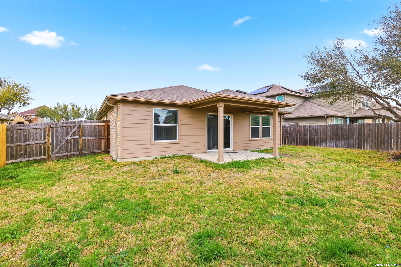 FOR RENT. FRESHLY RENOVATED - Beautifully updated 3-bedroom, 2-bath home located in the desirable Riata subdivision of Schertz. This well-maintained property offers a bright, modern interior with stylish upgrades and a comfortable layout perfect for everyday living. The kitchen features white cabinetry, sleek countertops, a modern hexagon tile backsplash, and black appliances, creating a clean and contemporary space ideal for cooking and entertaining. The layout flows easily into the living and dining areas, providing an inviting atmosphere for relaxing or hosting guest. The primary suite is spacious and includes a large walk-in closet along with an updated en-suite bathroom featuring a dual vanity, modern fixtures, and a glass walk-in shower. The additional bedrooms are generously sized and share a full bathroom. Outside, the home offers great curb appeal with mature trees, a private driveway, and a two-car garage. The yard provides space to relax and enjoy outdoor living. Located in the Riata subdivision, this home offers convenient access to IH-35, shopping, dining, schools, and Randolph Air Force Base, making commuting and everyday errands easy.