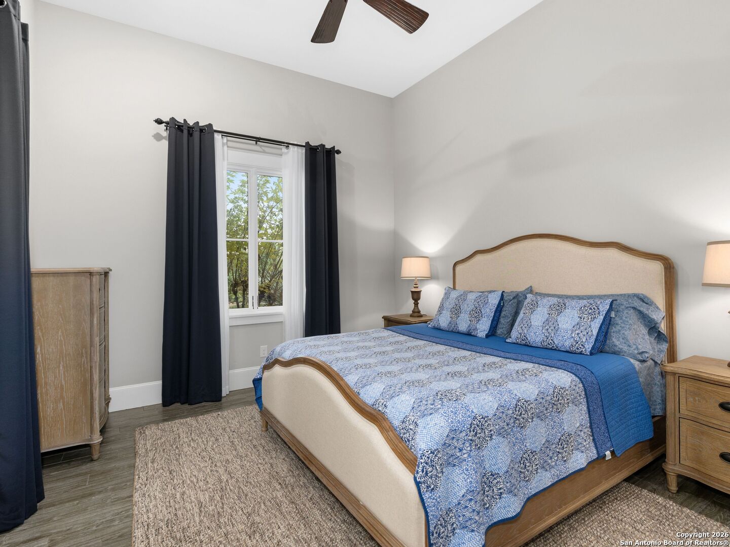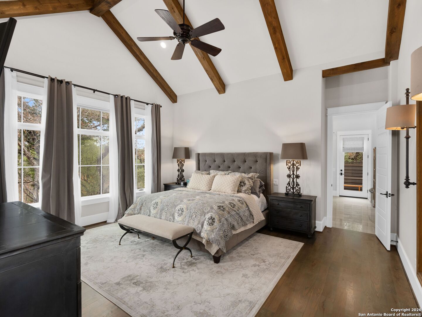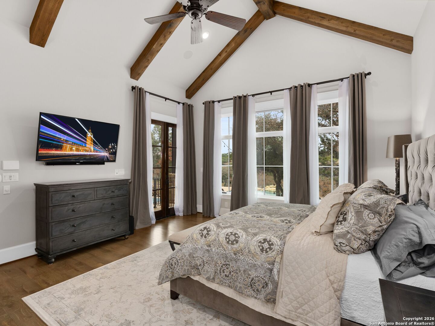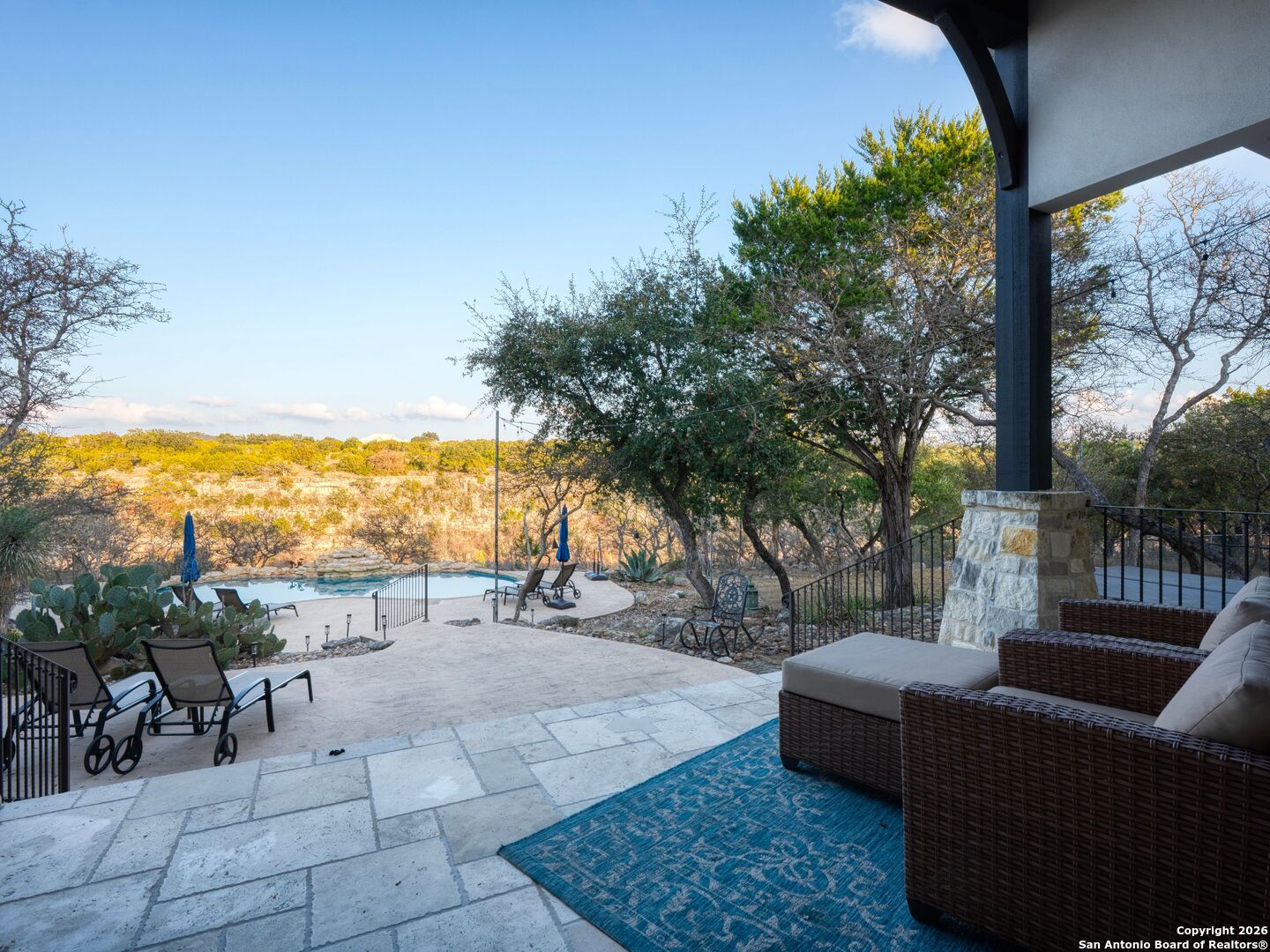 This Hill Country Masterpiece sits on 3.63 acres on a bluff forty feet above the Medina River with 3 bedrooms, 2 full baths and 2 half baths. The 872 sq ft Casita has an additional large bedroom and full bath. Enter the home's foyer featuring an eighteen foot ceiling and stone wall floor to ceiling. The home centers around a great room with a fourteen foot high beamed ceiling and fireplace with a view of the pool and river bluff. One side of the home features a large primary bedroom with vaulted beamed ceiling, large primary bath with ceiling treatment including a whirlpool tub, large shower, access to the outdoor shower, walk in closet with marble island, a dressing table and a separate storage room that also has access to the home office. Also off the foyer is the formal powder room and study. Back to the great room to view an open area that includes dining room with ceiling treatment, island kitchen with lots of storage and a separate bar with sit down counter. Bar has an under counter wine refrigerator and ice maker. Walk through the kitchen to the rear hall to find a bedroom with ensuite bath, secondary powder room, pantry and utility room. Exit here to find the three car garage with mop sink, work counters and extra storage. A walkway from the pool leads you to the Casita. Along the path are steps that lead down to a flagstone deck with swing facing the river and a large fire pit for cool calm evenings and star gazing. Many more custom features in Additional Information.