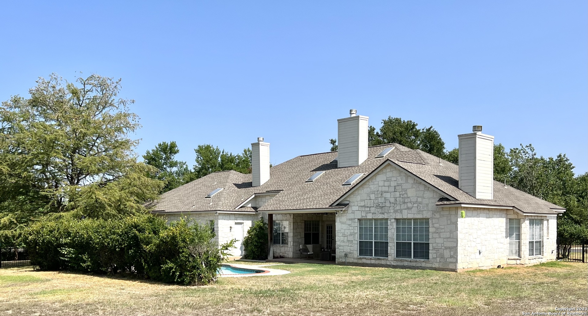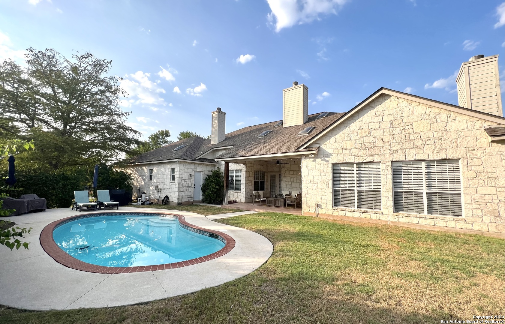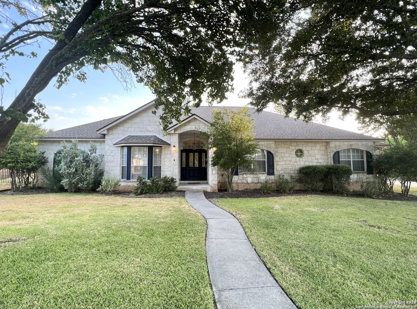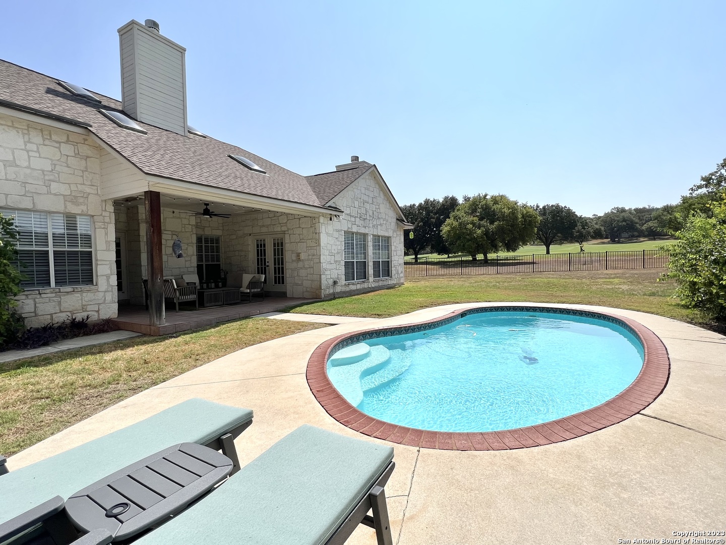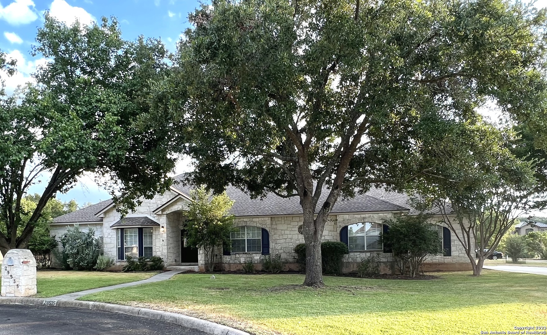 Rare find...tasteful, extensively remodeled Fair Oaks Ranch golf course home with pool! Enjoy fantastic, set-back views of the golf course from back patio/pool on .49 acre, cul-de-sac lot. Custom, rock one-story home has 3 bedrooms/2.5 baths/2.5 garage, 3 fireplaces & skylights for added light. Open floor plan flows with 2 living areas split by updated wet bar, formal dining, kitchen with breakfast, two secondary bedrooms with shared bath, & study/office. Gorgeous wood-look porcelain tile, newer light fixtures/ceiling fans, & fresh paint/carpet throughout home interior. Stunning kitchen has updated cabinets, appliances, granite & backsplash. Spa-like master bath suite w/fireplace has soaking tub, beautiful shower, updated granite counters, & private access to pool. Secondary bath has new tub/tile and granite counters on sinks. Entertainers delight with patio/semi-private pool/expanded fenced area. Excellent Boerne ISD schools & Fair Oaks Ranch Community. The Rim/La Cantera shopping are minutes away. Don't miss this opportunity to be on the Fair Oaks Ranch golf course!