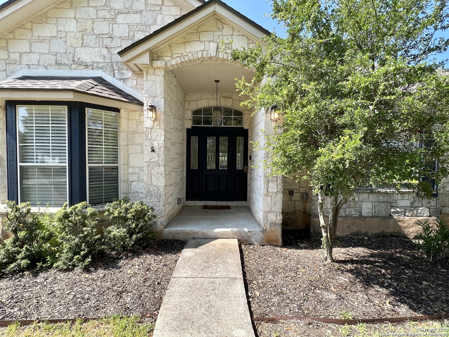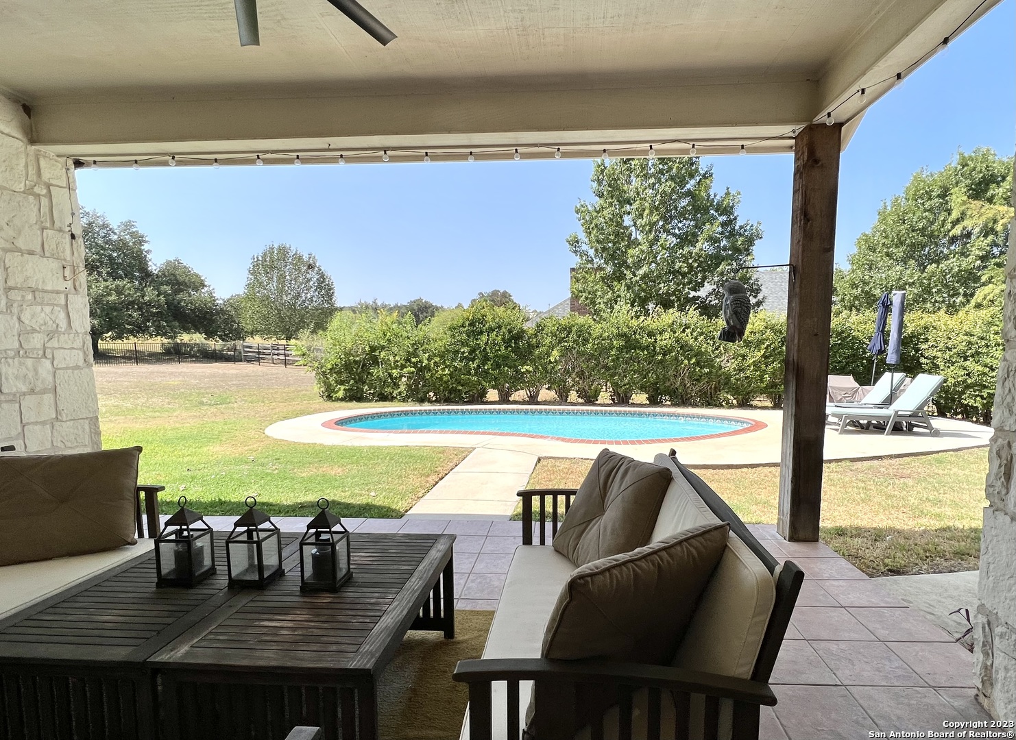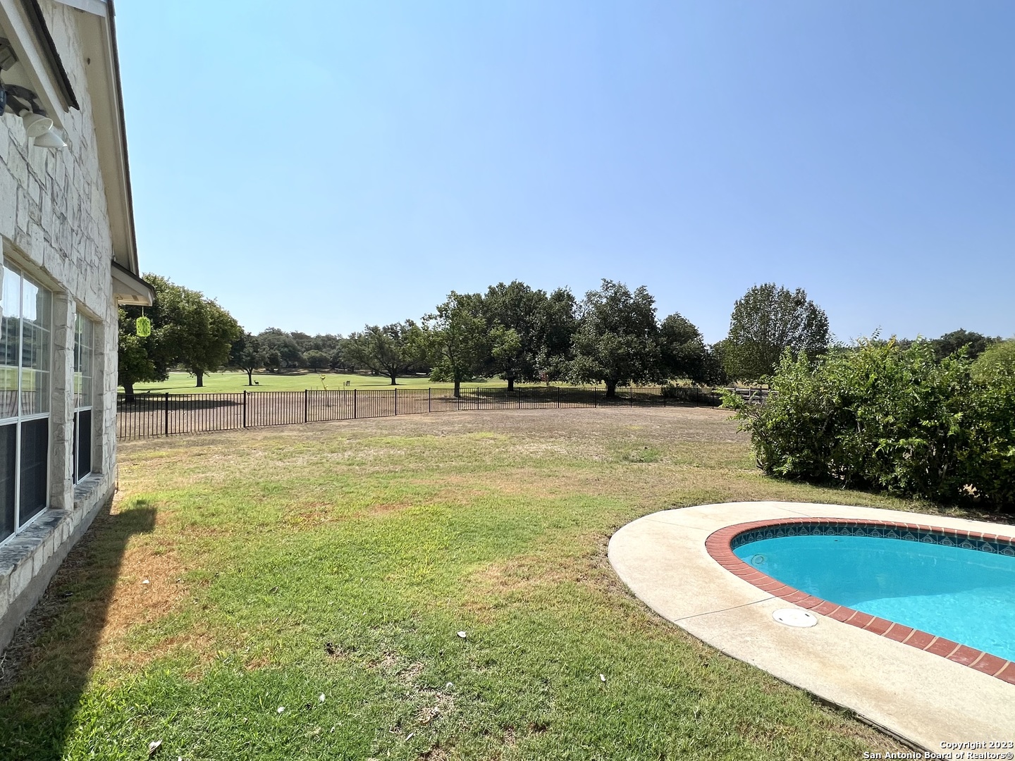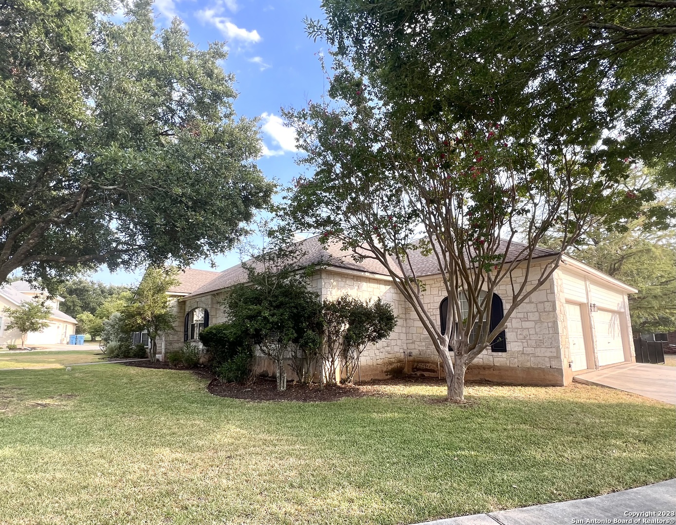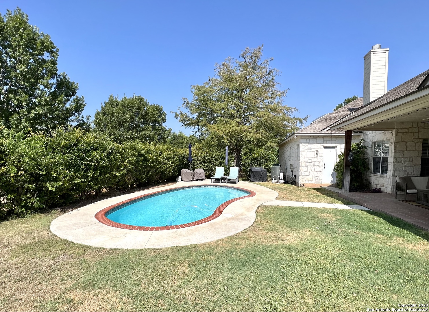 Rare find...tasteful, extensively remodeled Fair Oaks Ranch golf course home with pool! Enjoy fantastic, set-back views of the golf course from back patio/pool on .49 acre, cul-de-sac lot. Custom, rock one-story home has 3 bedrooms/2.5 baths/2.5 garage, 3 fireplaces & skylights for added light. Open floor plan flows with 2 living areas split by updated wet bar, formal dining, kitchen with breakfast, two secondary bedrooms with shared bath, & study/office. Gorgeous wood-look porcelain tile, newer light fixtures/ceiling fans, & fresh paint/carpet throughout home interior. Stunning kitchen has updated cabinets, appliances, granite & backsplash. Spa-like master bath suite w/fireplace has soaking tub, beautiful shower, updated granite counters, & private access to pool. Secondary bath has new tub/tile and granite counters on sinks. Entertainers delight with patio/semi-private pool/expanded fenced area. Excellent Boerne ISD schools & Fair Oaks Ranch Community. The Rim/La Cantera shopping are minutes away. Don't miss this opportunity to be on the Fair Oaks Ranch golf course!