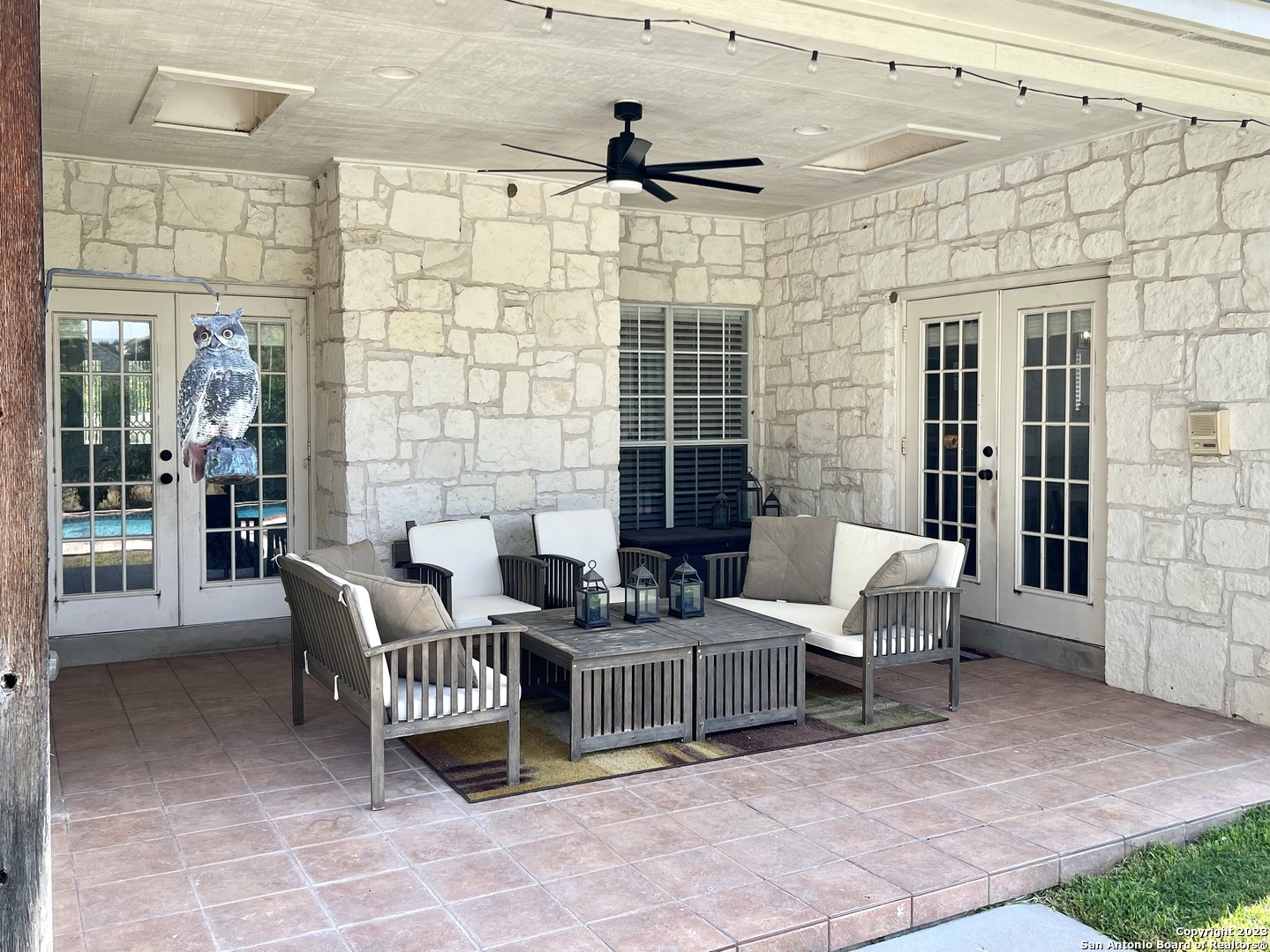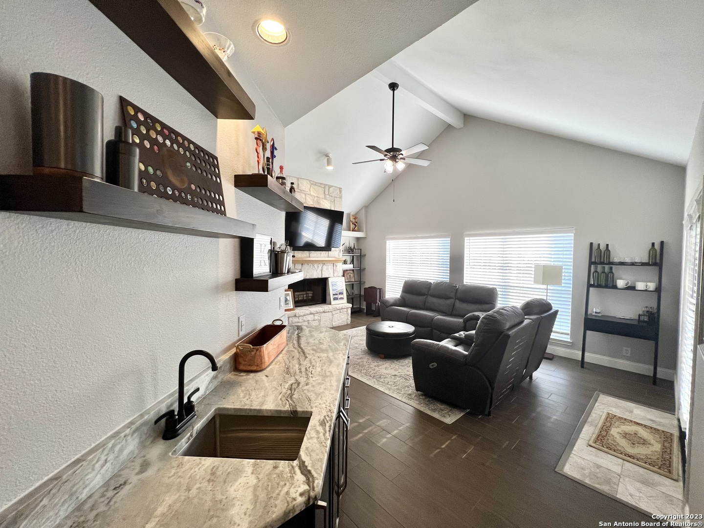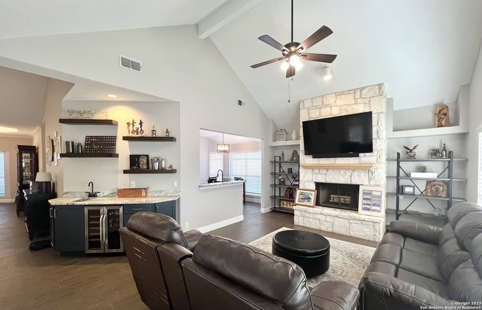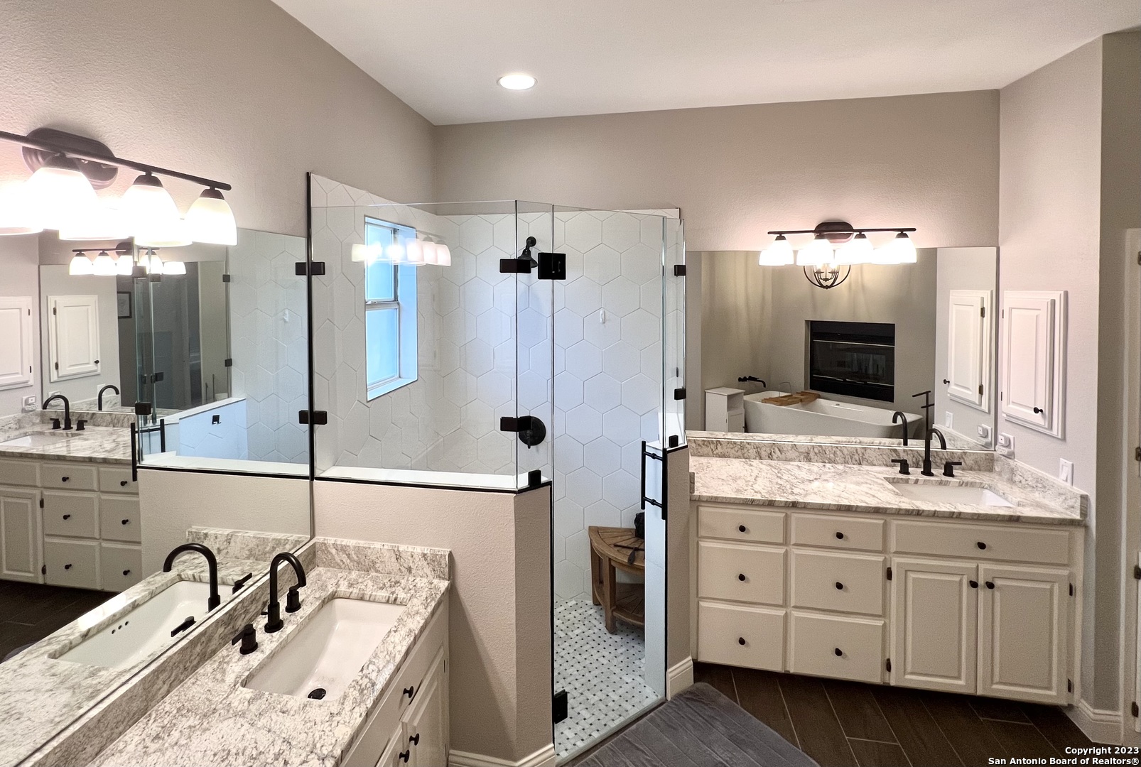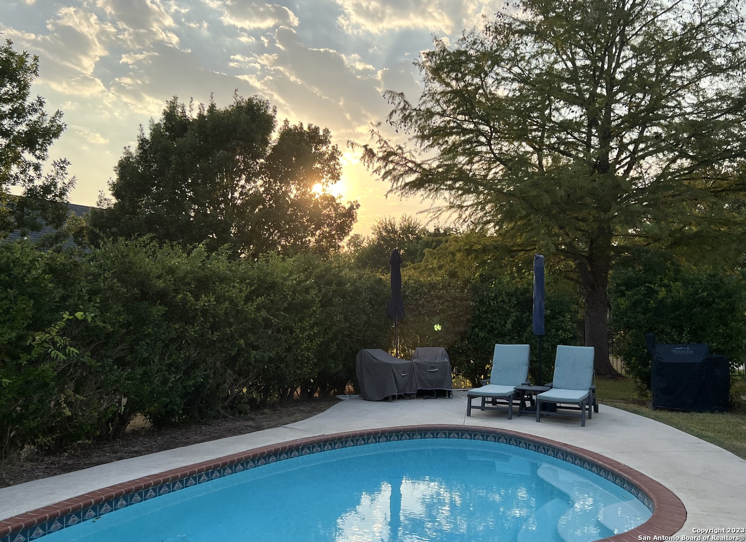 Rare find...tasteful, extensively remodeled Fair Oaks Ranch golf course home with pool! Enjoy fantastic, set-back views of the golf course from back patio/pool on .49 acre, cul-de-sac lot. Custom, rock one-story home has 3 bedrooms/2.5 baths/2.5 garage, 3 fireplaces & skylights for added light. Open floor plan flows with 2 living areas split by updated wet bar, formal dining, kitchen with breakfast, two secondary bedrooms with shared bath, & study/office. Gorgeous wood-look porcelain tile, newer light fixtures/ceiling fans, & fresh paint/carpet throughout home interior. Stunning kitchen has updated cabinets, appliances, granite & backsplash. Spa-like master bath suite w/fireplace has soaking tub, beautiful shower, updated granite counters, & private access to pool. Secondary bath has new tub/tile and granite counters on sinks. Entertainers delight with patio/semi-private pool/expanded fenced area. Excellent Boerne ISD schools & Fair Oaks Ranch Community. The Rim/La Cantera shopping are minutes away. Don't miss this opportunity to be on the Fair Oaks Ranch golf course!