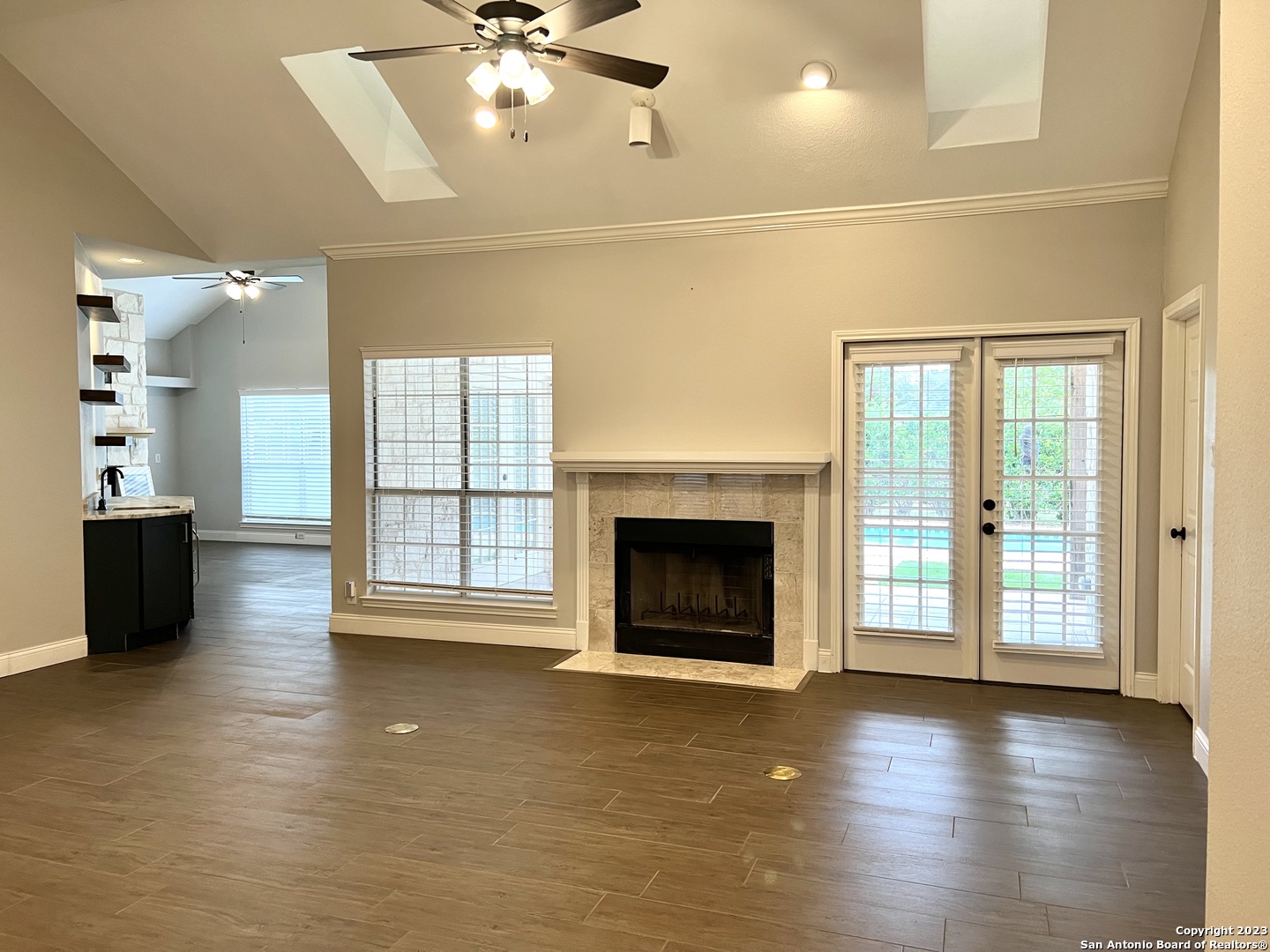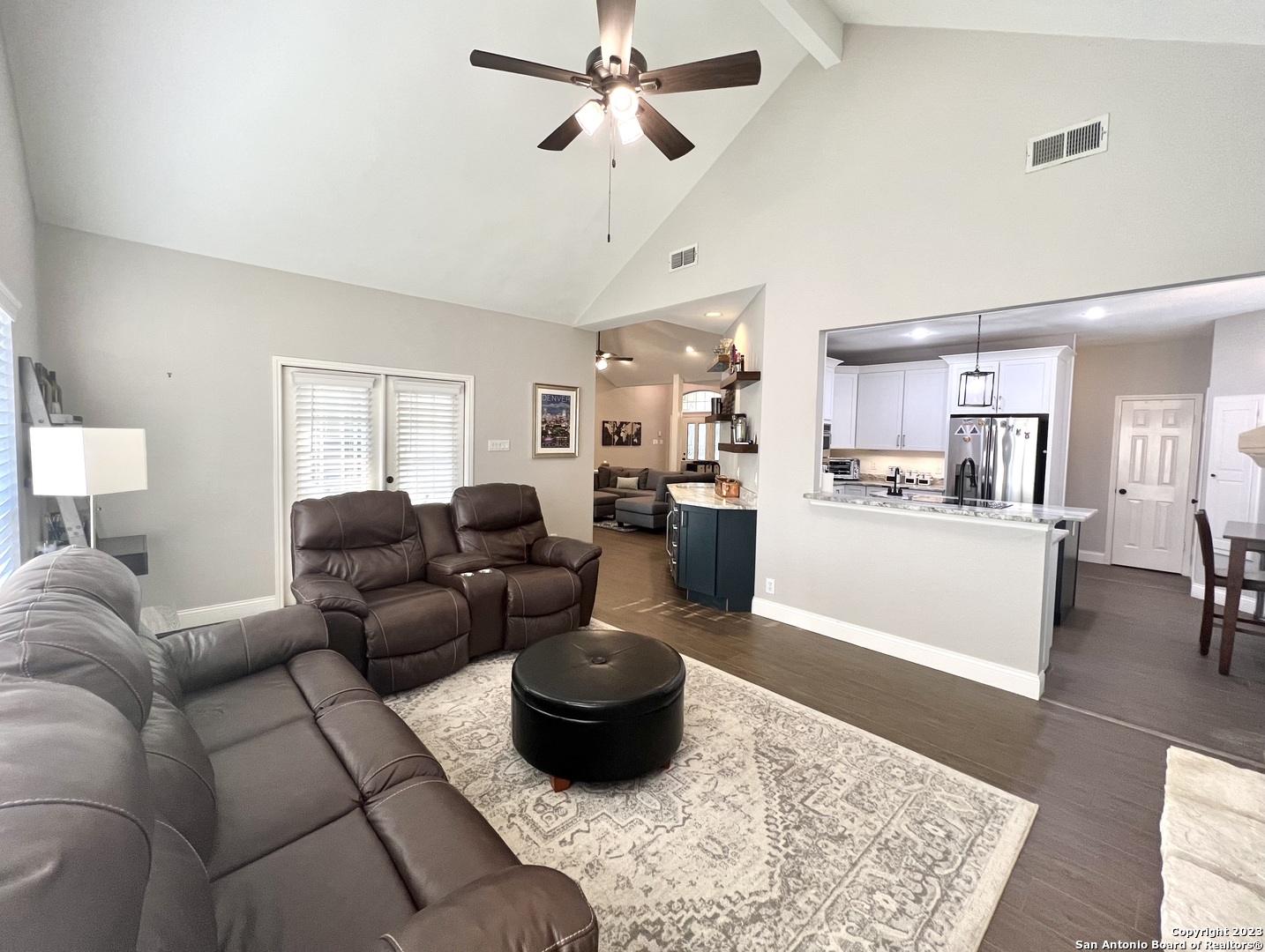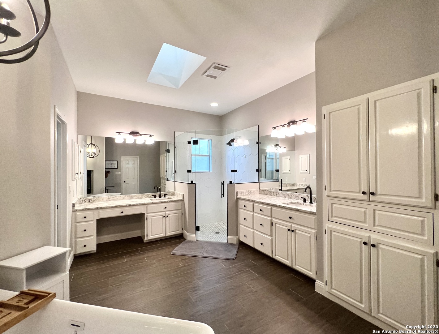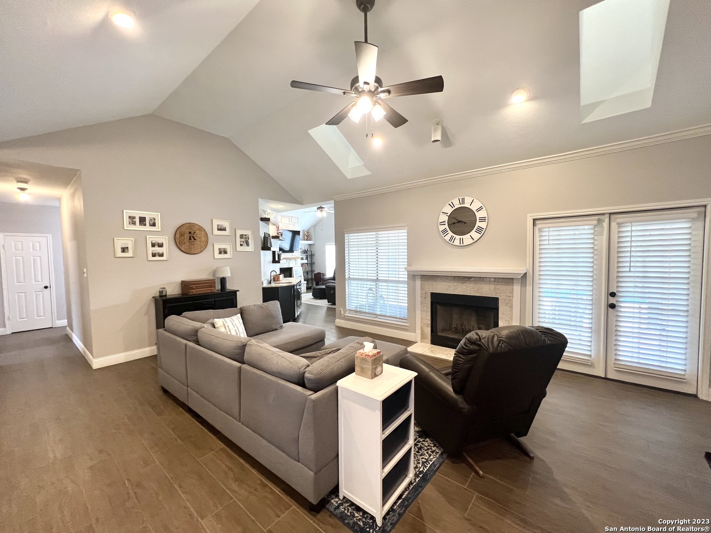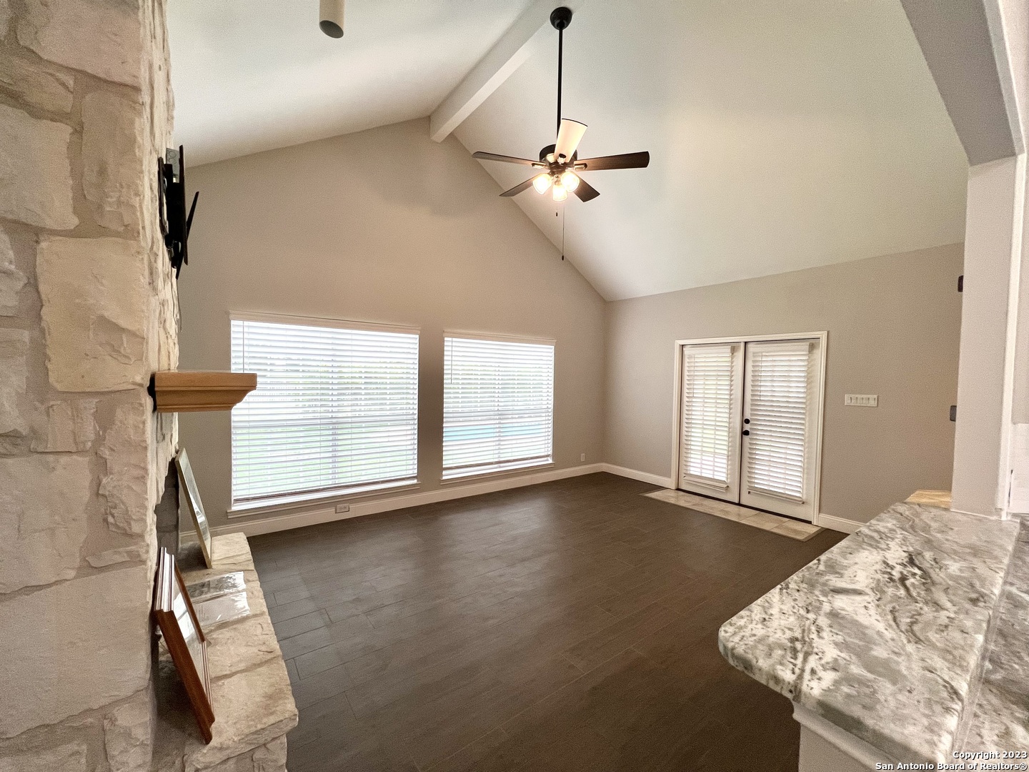 Rare find...tasteful, extensively remodeled Fair Oaks Ranch golf course home with pool! Enjoy fantastic, set-back views of the golf course from back patio/pool on .49 acre, cul-de-sac lot. Custom, rock one-story home has 3 bedrooms/2.5 baths/2.5 garage, 3 fireplaces & skylights for added light. Open floor plan flows with 2 living areas split by updated wet bar, formal dining, kitchen with breakfast, two secondary bedrooms with shared bath, & study/office. Gorgeous wood-look porcelain tile, newer light fixtures/ceiling fans, & fresh paint/carpet throughout home interior. Stunning kitchen has updated cabinets, appliances, granite & backsplash. Spa-like master bath suite w/fireplace has soaking tub, beautiful shower, updated granite counters, & private access to pool. Secondary bath has new tub/tile and granite counters on sinks. Entertainers delight with patio/semi-private pool/expanded fenced area. Excellent Boerne ISD schools & Fair Oaks Ranch Community. The Rim/La Cantera shopping are minutes away. Don't miss this opportunity to be on the Fair Oaks Ranch golf course!