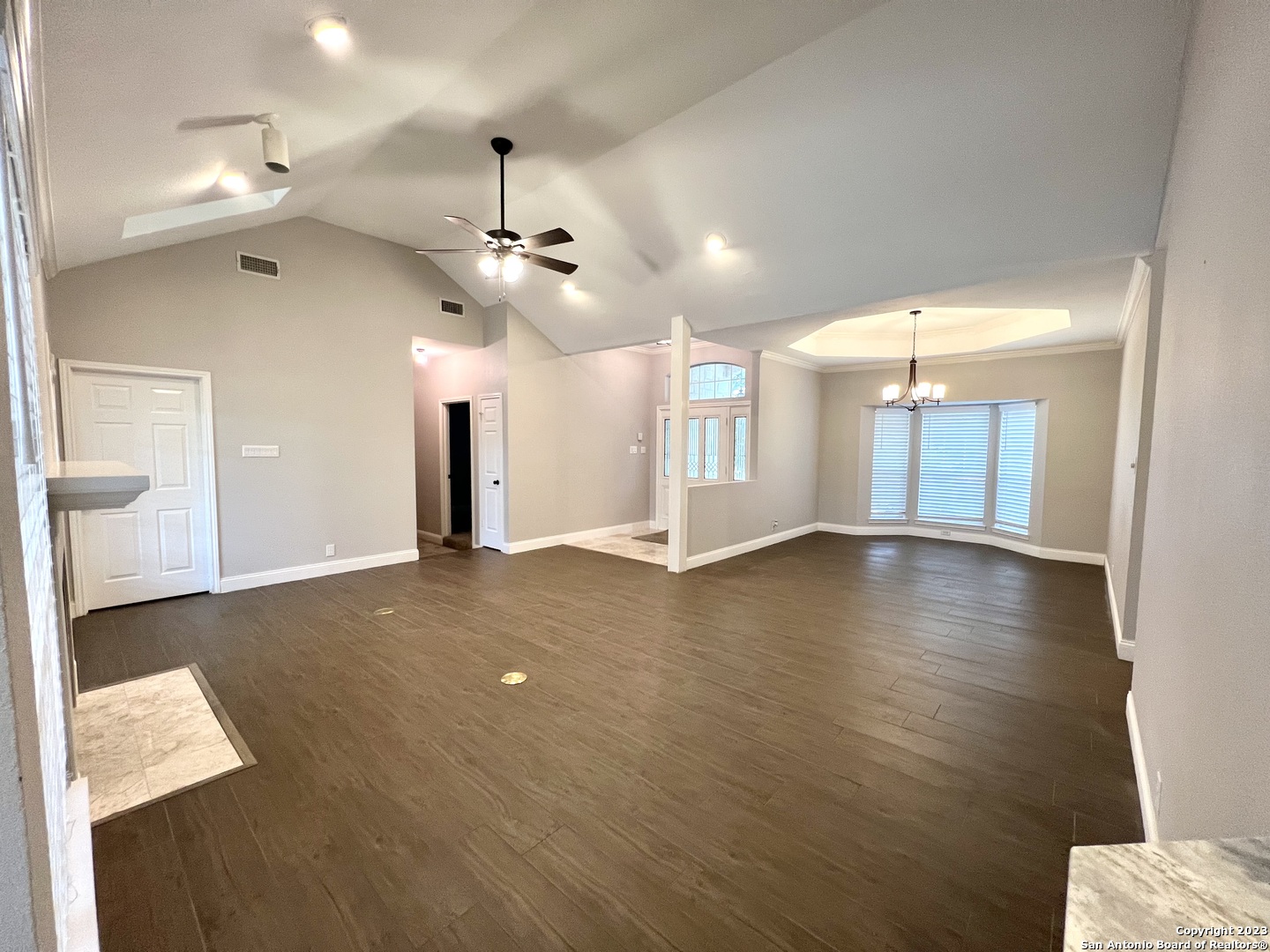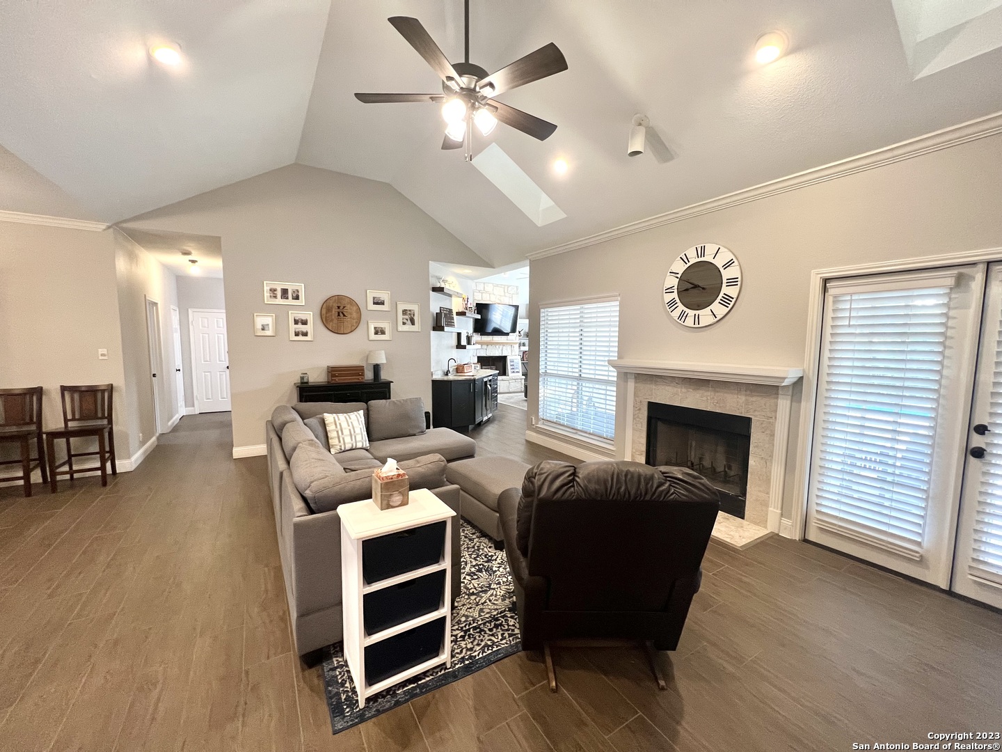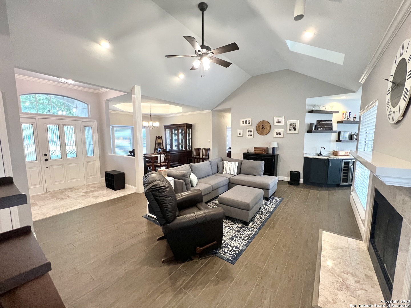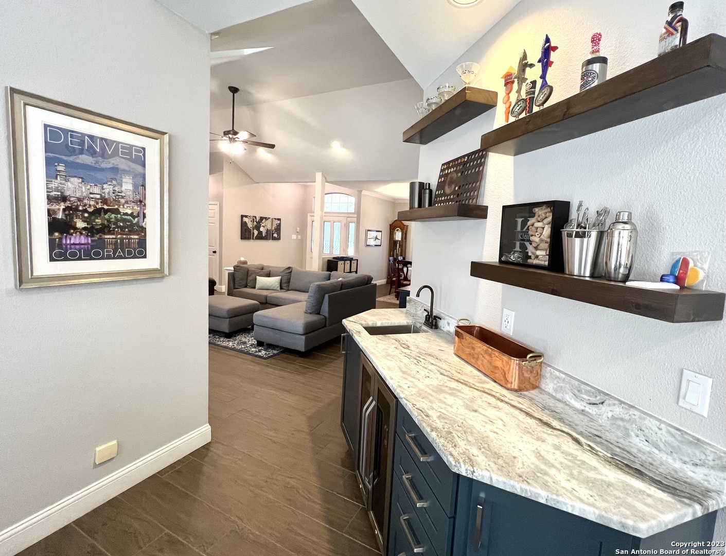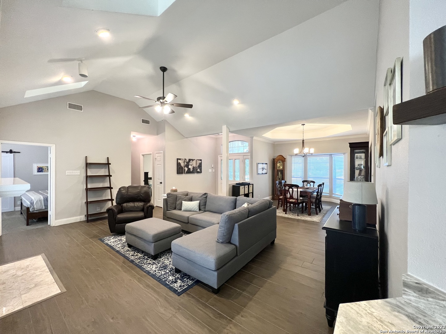 Rare find...tasteful, extensively remodeled Fair Oaks Ranch golf course home with pool! Enjoy fantastic, set-back views of the golf course from back patio/pool on .49 acre, cul-de-sac lot. Custom, rock one-story home has 3 bedrooms/2.5 baths/2.5 garage, 3 fireplaces & skylights for added light. Open floor plan flows with 2 living areas split by updated wet bar, formal dining, kitchen with breakfast, two secondary bedrooms with shared bath, & study/office. Gorgeous wood-look porcelain tile, newer light fixtures/ceiling fans, & fresh paint/carpet throughout home interior. Stunning kitchen has updated cabinets, appliances, granite & backsplash. Spa-like master bath suite w/fireplace has soaking tub, beautiful shower, updated granite counters, & private access to pool. Secondary bath has new tub/tile and granite counters on sinks. Entertainers delight with patio/semi-private pool/expanded fenced area. Excellent Boerne ISD schools & Fair Oaks Ranch Community. The Rim/La Cantera shopping are minutes away. Don't miss this opportunity to be on the Fair Oaks Ranch golf course!