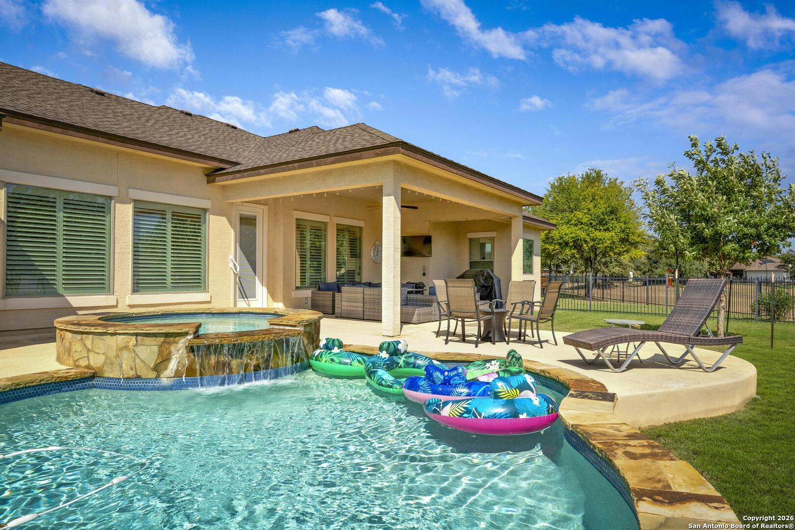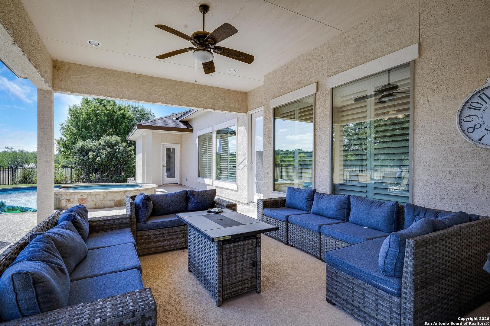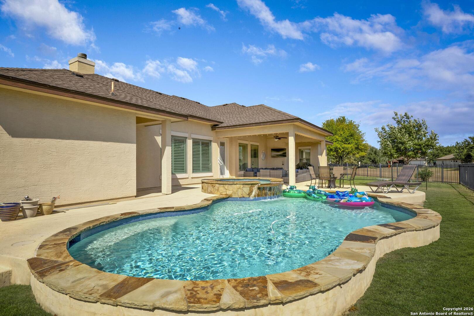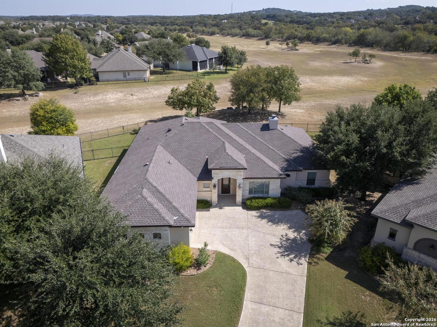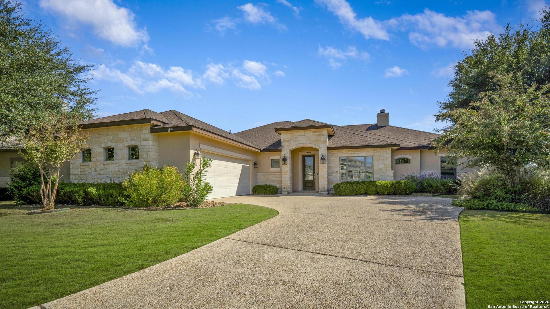 This stunning one-story garden home is the ultimate answer for those seeking a "lock-and-leave" lifestyle without giving up the high-end finishes of a custom home. Situated on a quiet cul-de-sac, this stone and stucco residence offers prestigious curb appeal with none of the weekend chores - because the HOA mows the yard for you! Inside, the home is designed for easy movement and elegant living. High tray ceilings and plantation shutters create an airy, sophisticated atmosphere, while the central limestone fireplace provides a cozy heart to the home. For the entertainer, the kitchen's illuminated wine bar and large island are ready for your next dinner party. The primary suite is a true sanctuary, featuring a nook perfect for a quiet reading corner or a home office. The primary bath is a masterpiece of thoughtful design, featuring dual vanities and a sleek, zero-threshold walk-in shower for effortless accessibility. Outside, you will enjoy the large covered patio featuring evening shade and a near-constant breeze - the perfect vantage point for relaxing and watching deer roam the greenspace and the scenic Cibolo River HOA park. A video of this home can be found on you tube too. Homes in this neighborhood are known to sell quickly; schedule your private showing today!