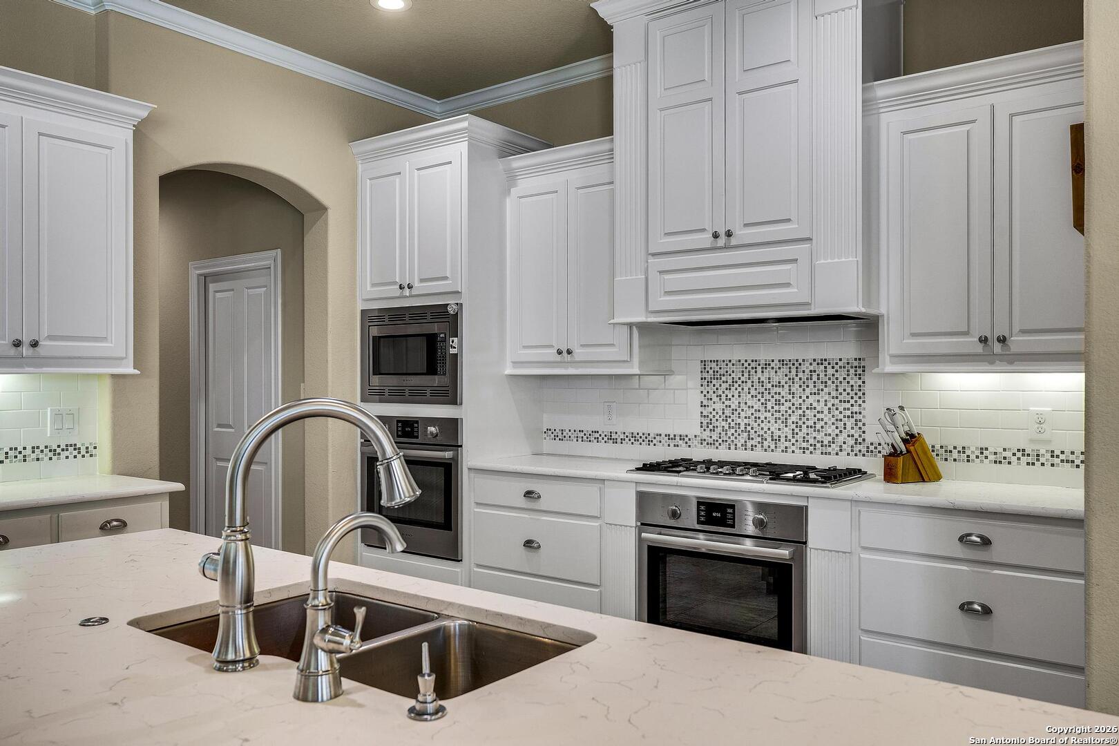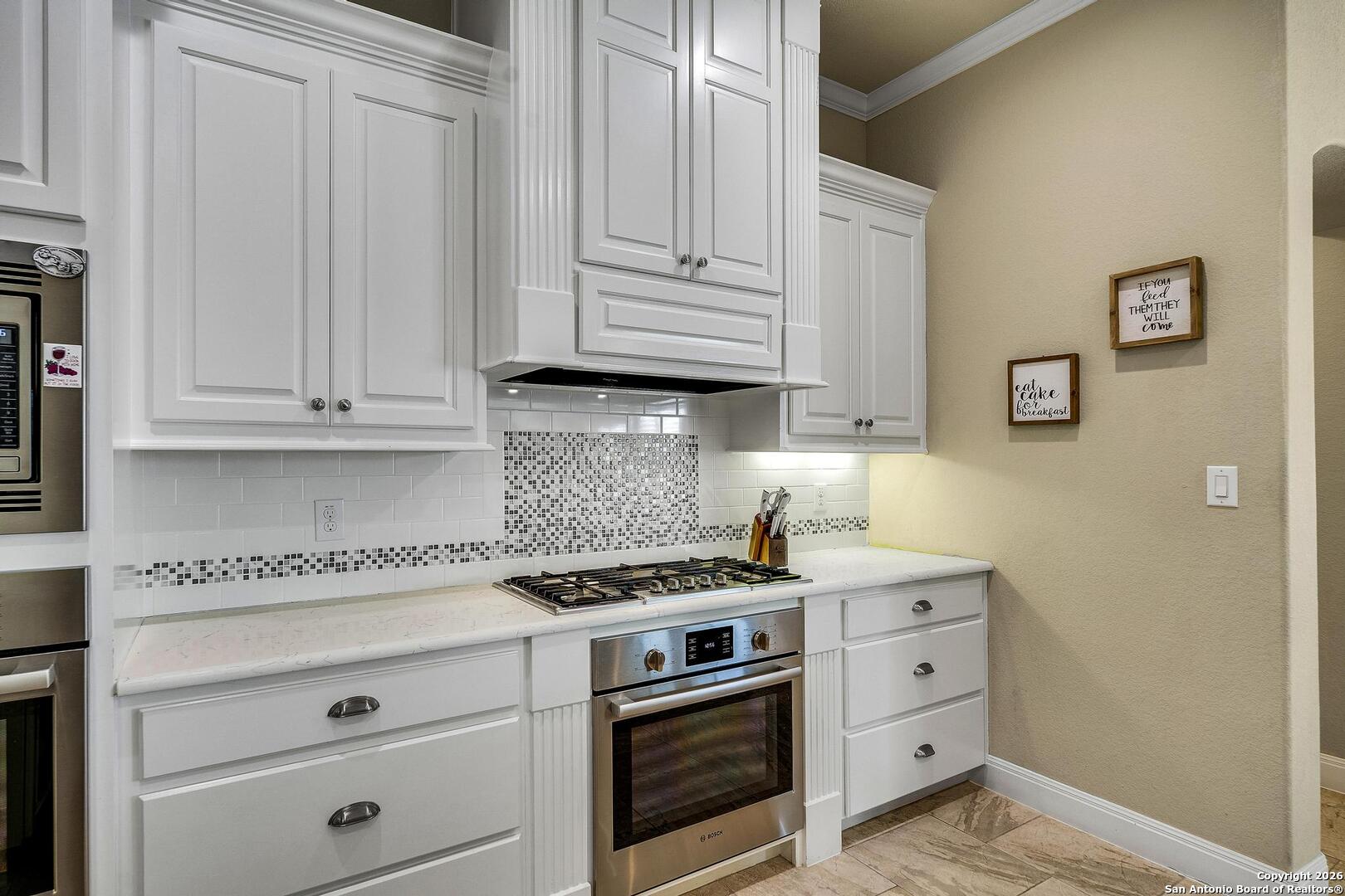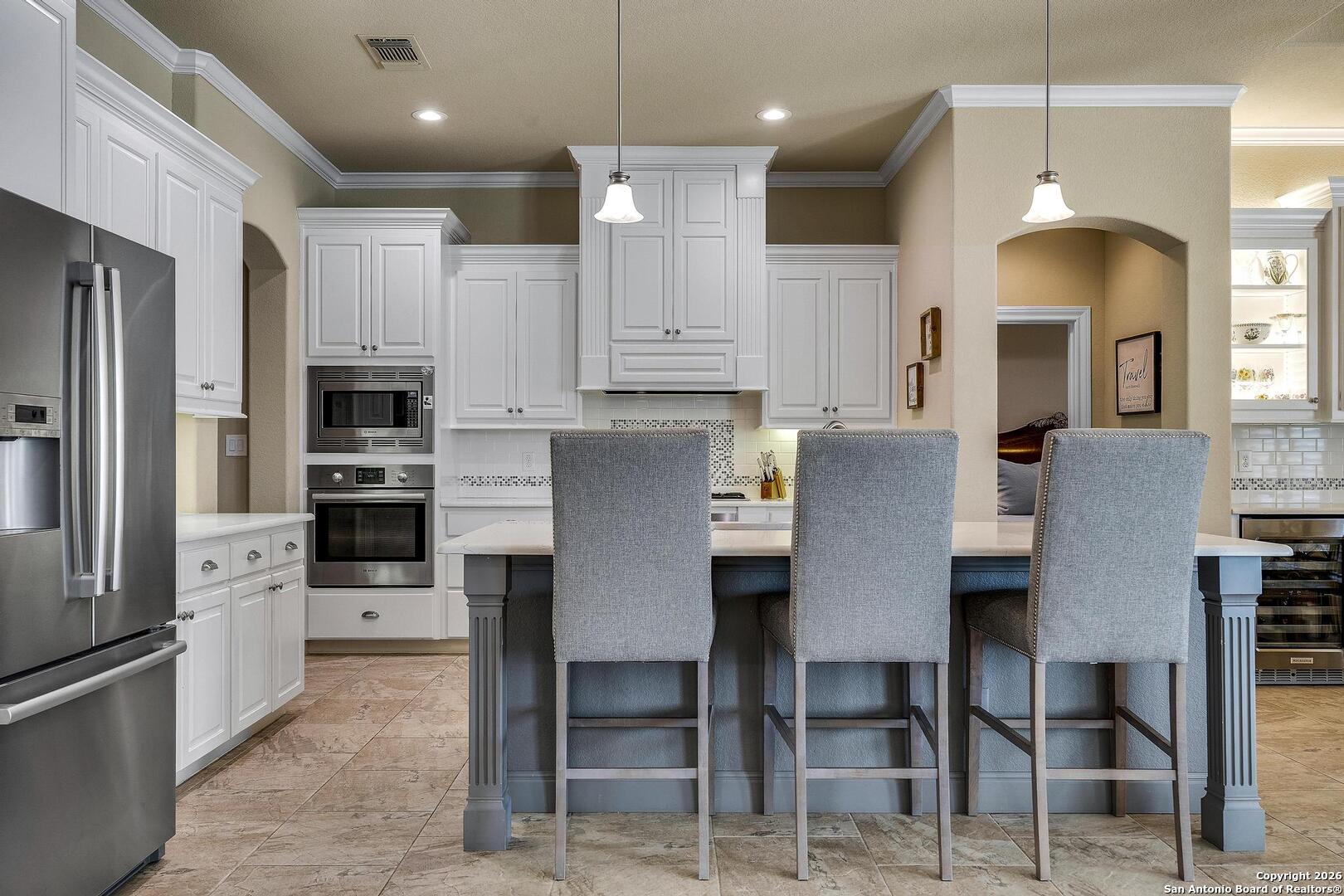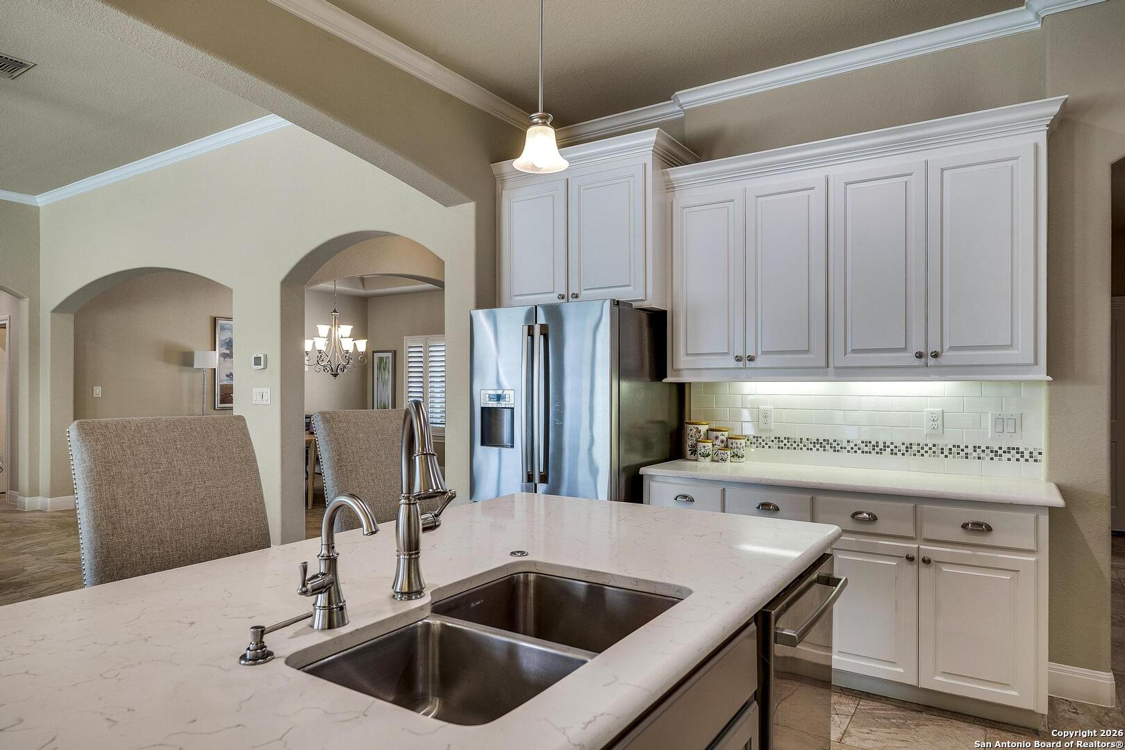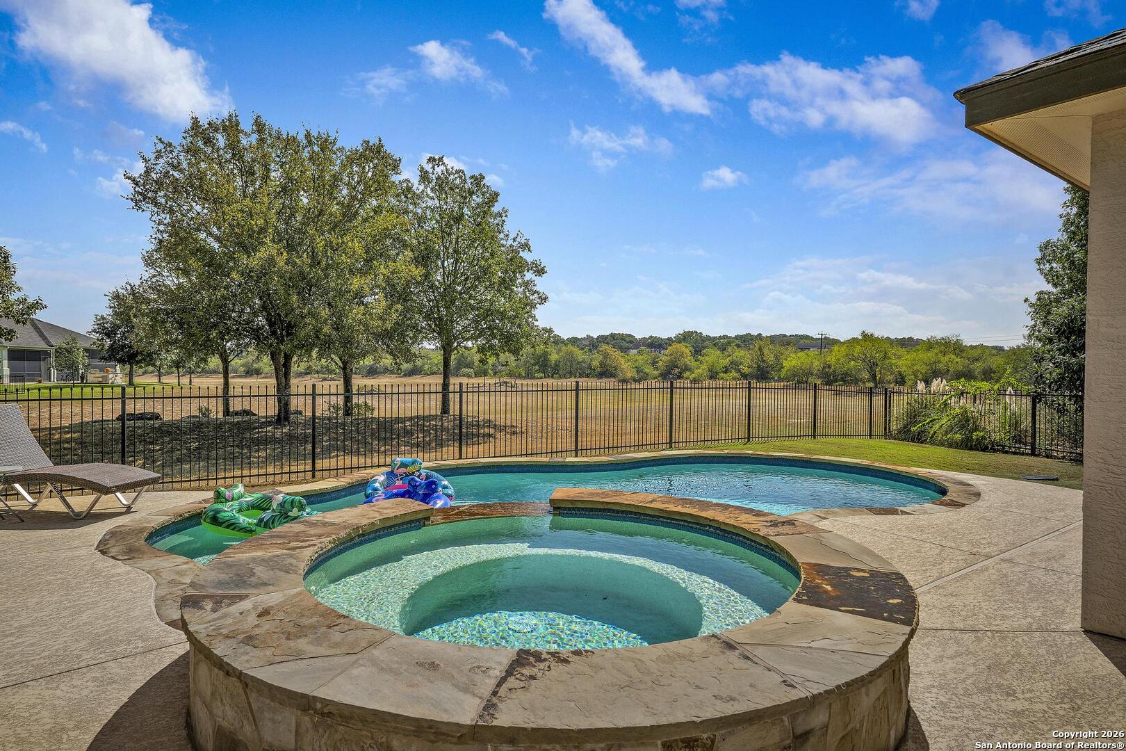 This stunning one-story garden home is the ultimate answer for those seeking a "lock-and-leave" lifestyle without giving up the high-end finishes of a custom home. Situated on a quiet cul-de-sac, this stone and stucco residence offers prestigious curb appeal with none of the weekend chores - because the HOA mows the yard for you! Inside, the home is designed for easy movement and elegant living. High tray ceilings and plantation shutters create an airy, sophisticated atmosphere, while the central limestone fireplace provides a cozy heart to the home. For the entertainer, the kitchen's illuminated wine bar and large island are ready for your next dinner party. The primary suite is a true sanctuary, featuring a nook perfect for a quiet reading corner or a home office. The primary bath is a masterpiece of thoughtful design, featuring dual vanities and a sleek, zero-threshold walk-in shower for effortless accessibility. Outside, you will enjoy the large covered patio featuring evening shade and a near-constant breeze - the perfect vantage point for relaxing and watching deer roam the greenspace and the scenic Cibolo River HOA park. A video of this home can be found on you tube too. Homes in this neighborhood are known to sell quickly; schedule your private showing today!