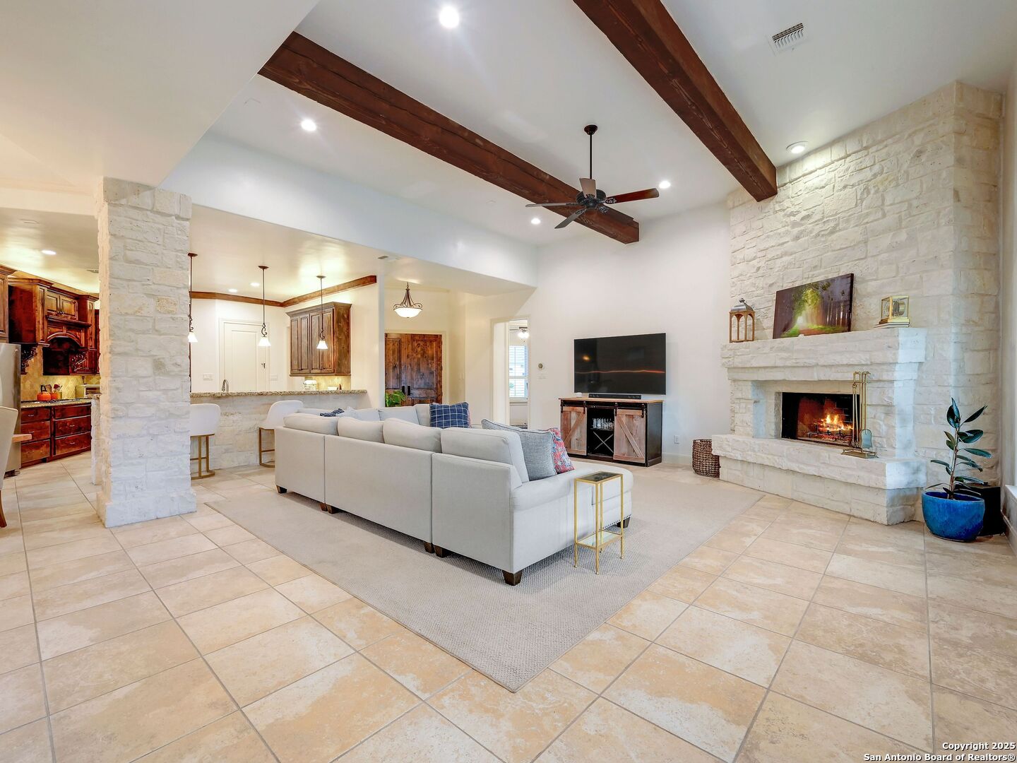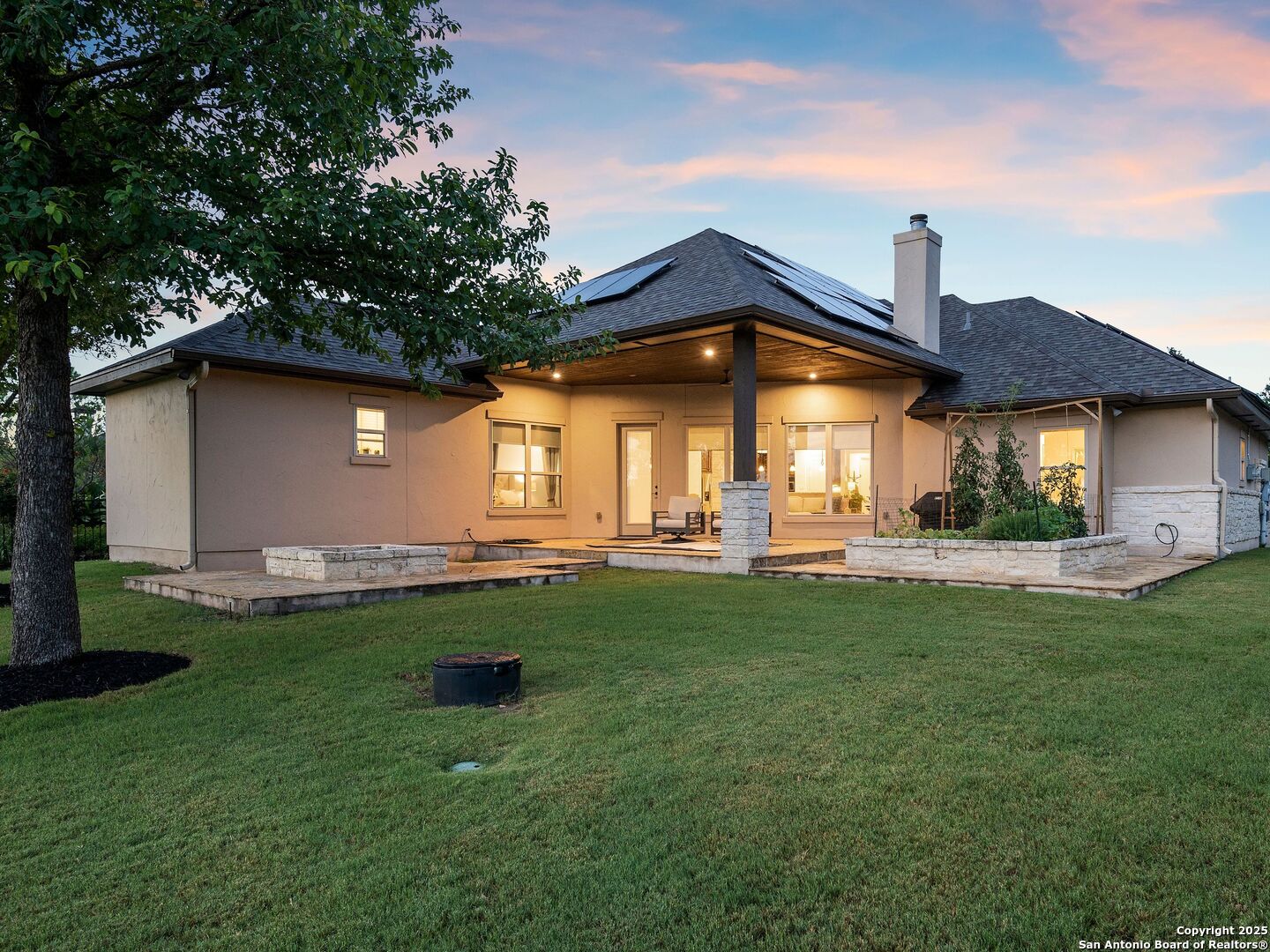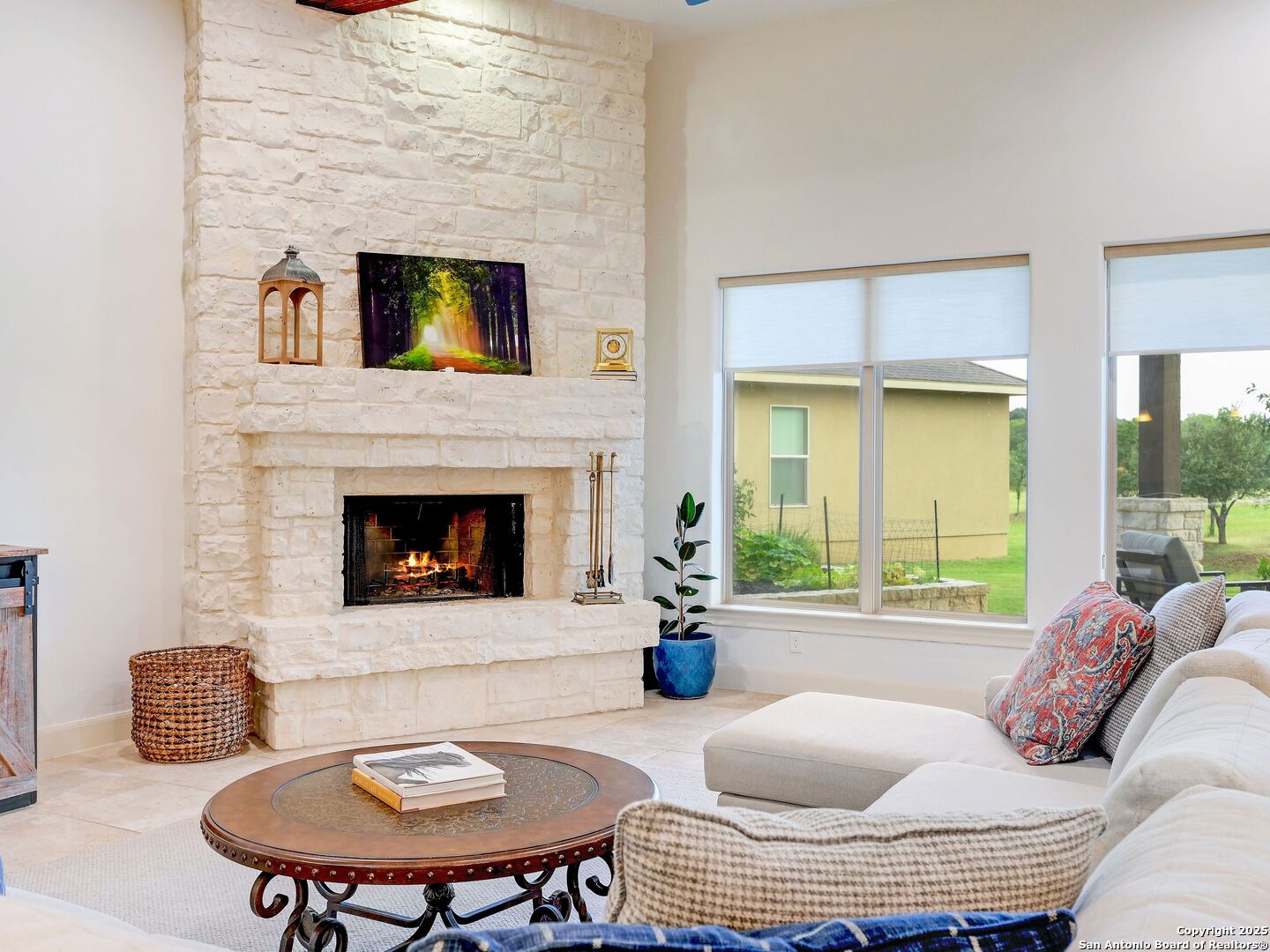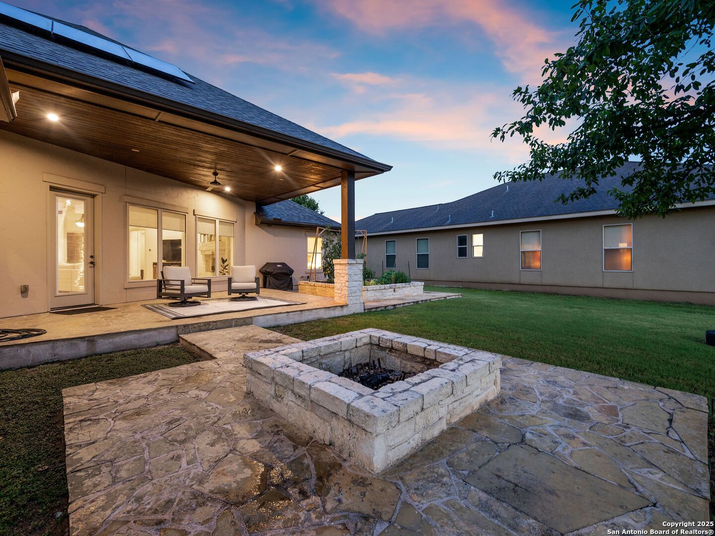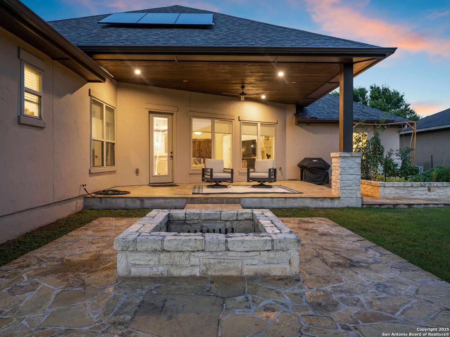 This beautifully updated one-story home offers a thoughtfully designed floor plan that perfectly balances comfort, functionality, and style. Freshly painted and equipped with brand-new solar panels, it's both energy-efficient and move-in ready. Enjoy tranquil greenbelt views from the spacious backyard, where a large covered patio and built-in fire pit provide the perfect space for relaxing or entertaining under the open sky. Inside, the open-concept kitchen and living area are filled with natural light from expansive picture windows, creating a bright and inviting atmosphere. The kitchen features custom cabinetry, elegant granite countertops, a statement vent hood, and an eat-in bar that's ideal for casual meals or gathering with guests. Additional highlights include a separate office, an eat-in dining area, and three generously sized bedrooms, offering flexibility for both work and leisure. Set in a well-maintained neighborhood known for its lush landscaping and beautiful homes, the property offers a sense of privacy and peaceful living, often accompanied by deer sightings just beyond your backyard. Perfectly situated just off Fair Oaks Ranch Blvd near the golf course, this home is ideally located between the vibrant city of San Antonio and the charm of Boerne, and is part of the highly rated Boerne ISD. Schedule your showing today!