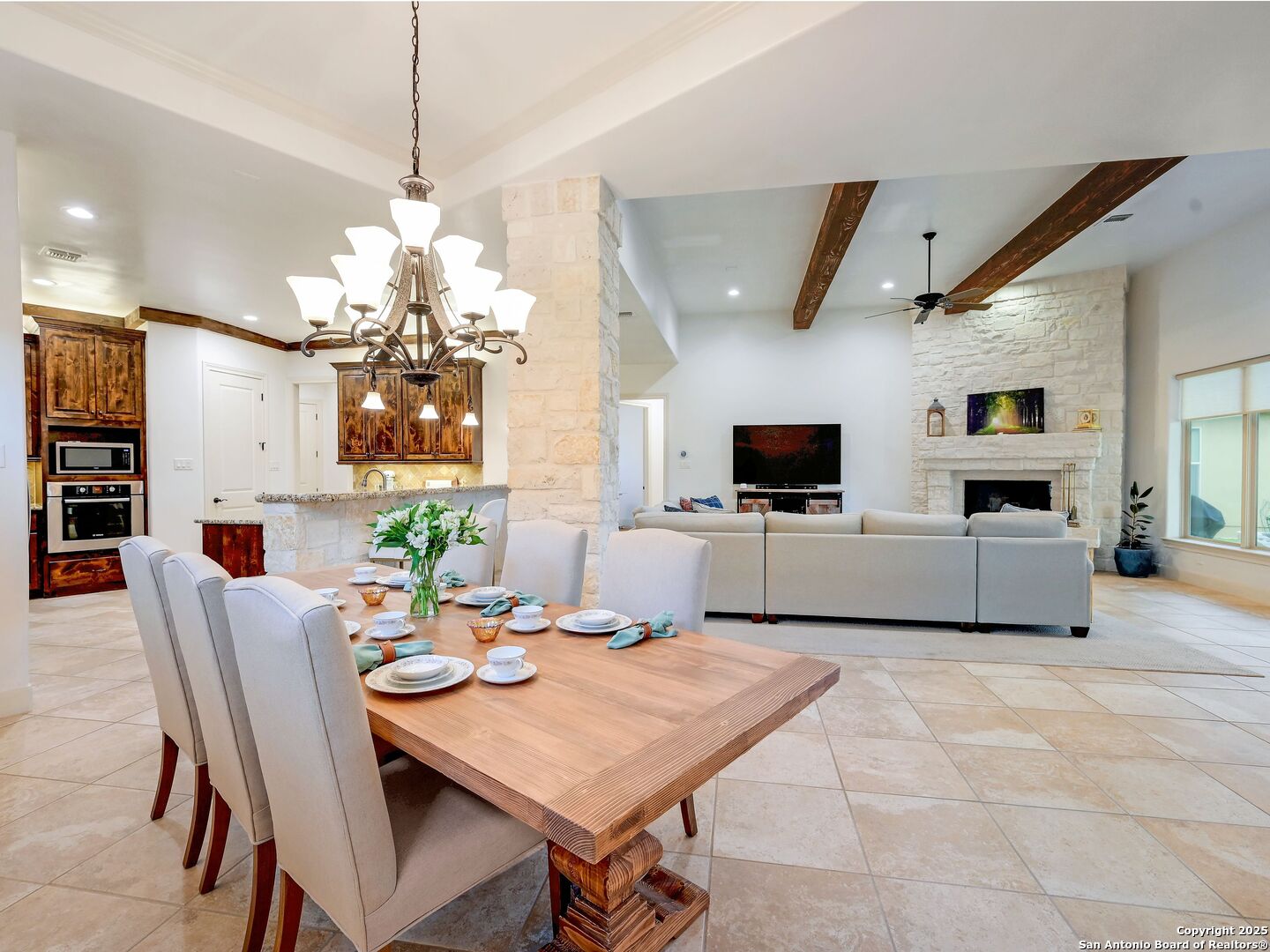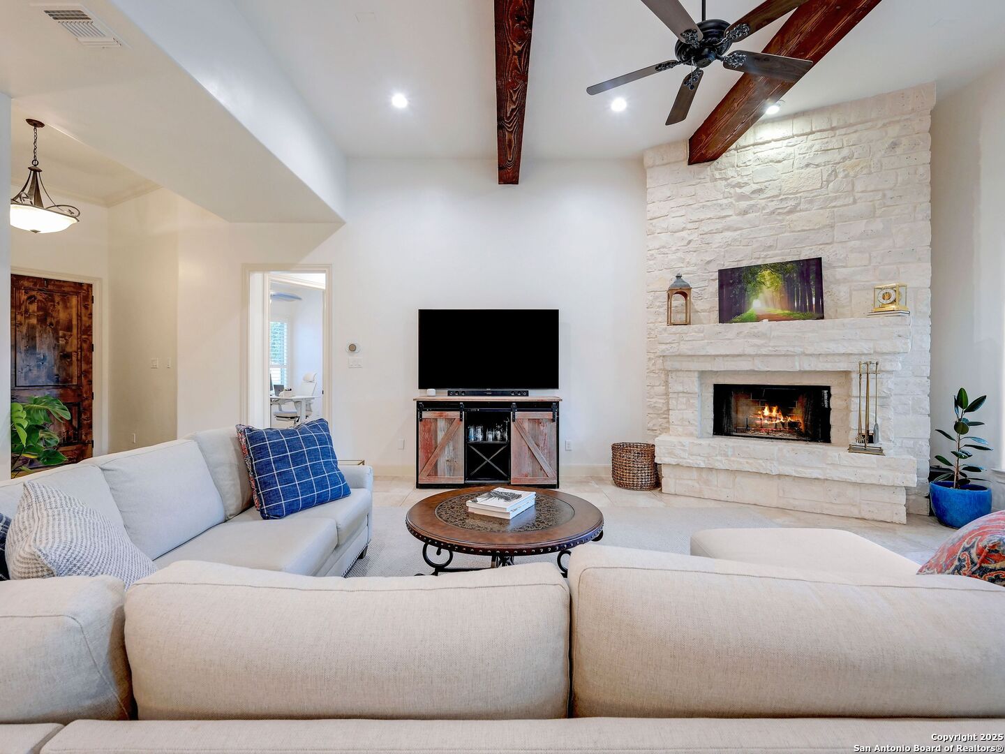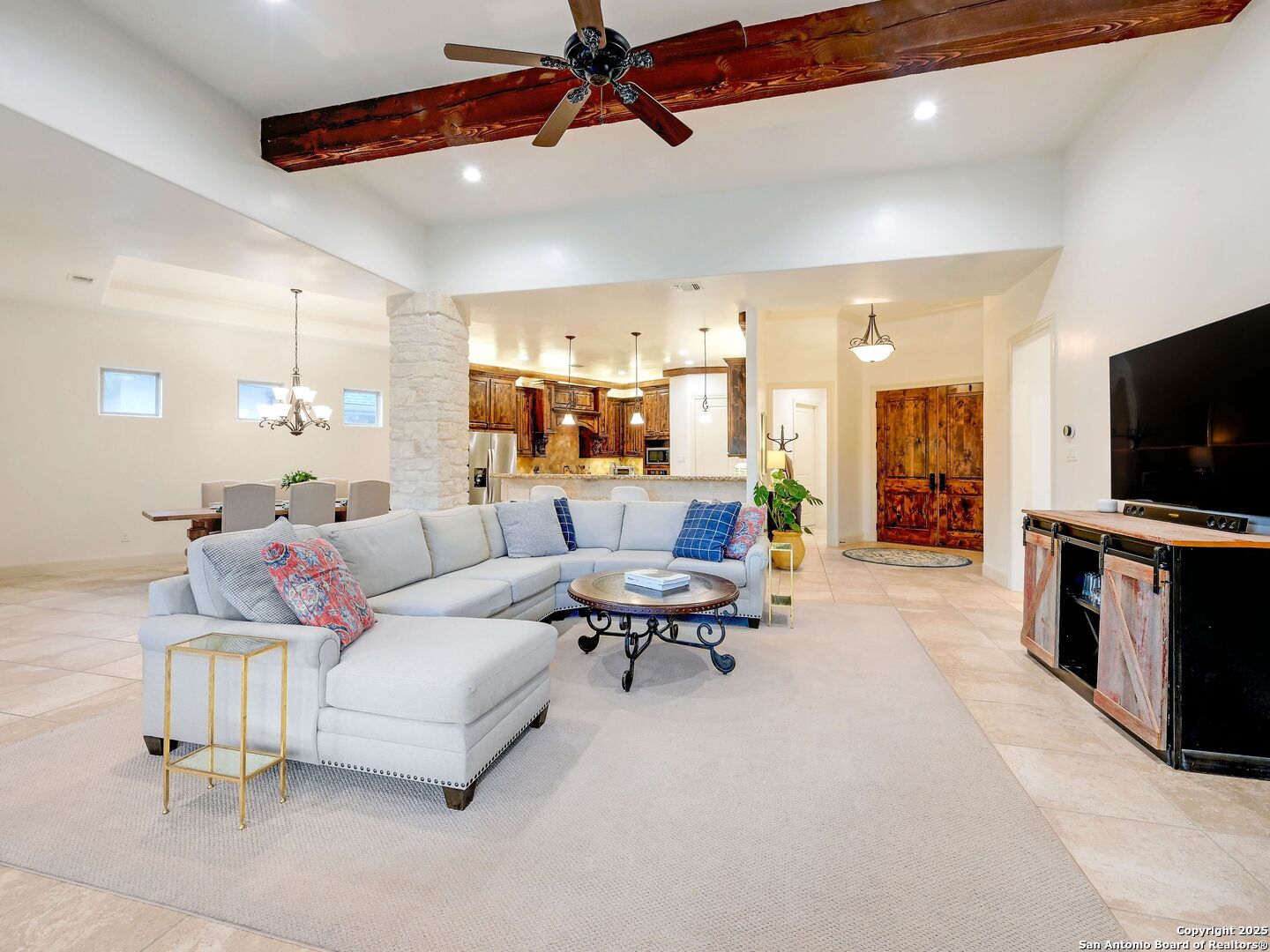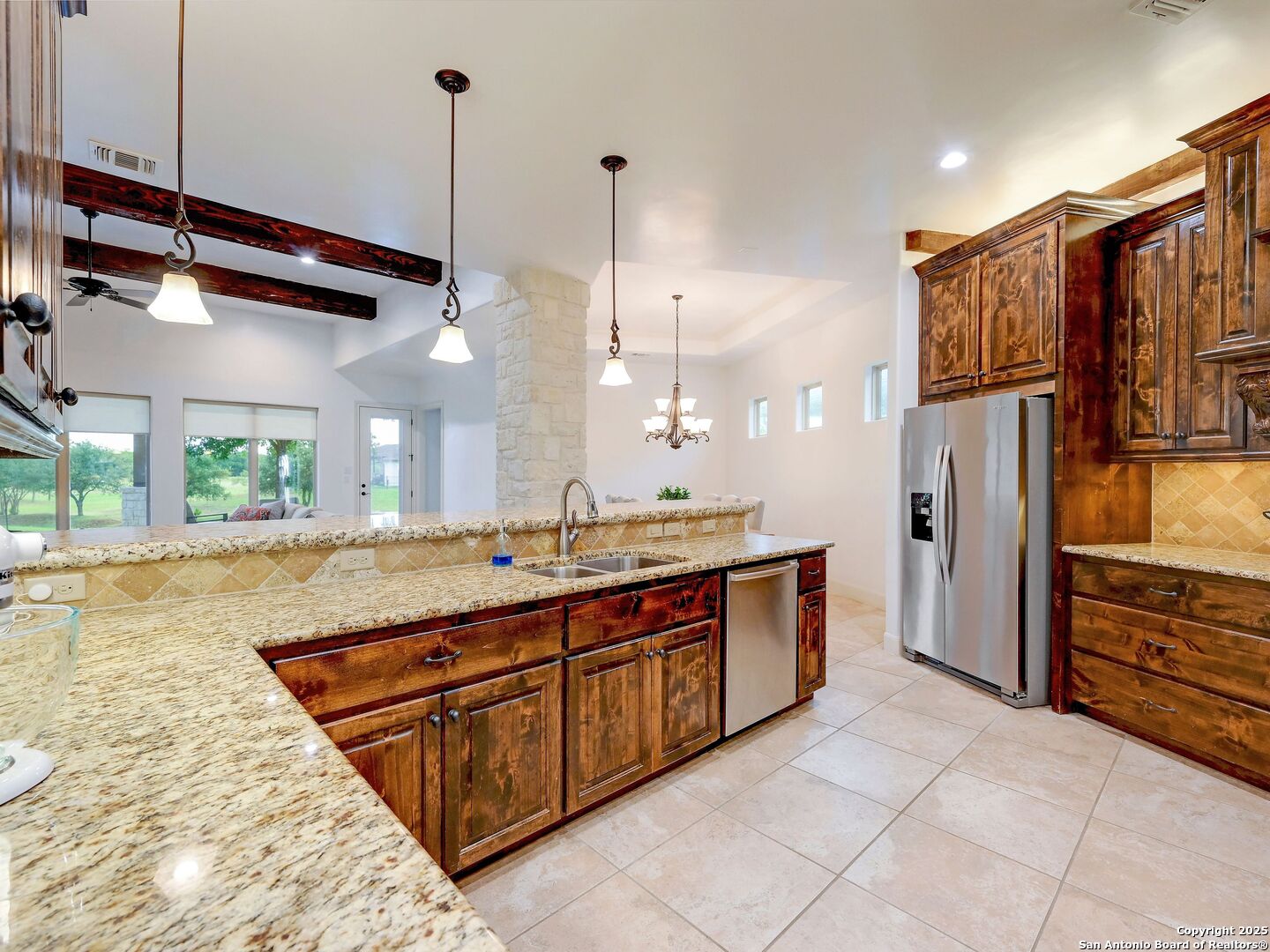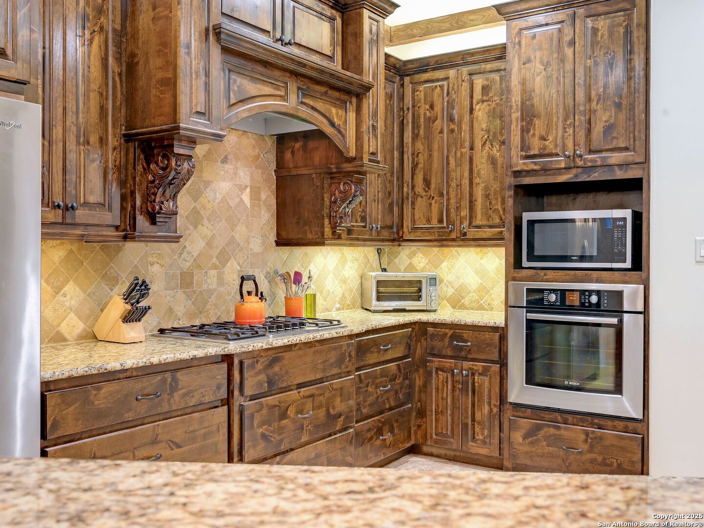 This beautifully updated one-story home offers a thoughtfully designed floor plan that perfectly balances comfort, functionality, and style. Freshly painted and equipped with brand-new solar panels, it's both energy-efficient and move-in ready. Enjoy tranquil greenbelt views from the spacious backyard, where a large covered patio and built-in fire pit provide the perfect space for relaxing or entertaining under the open sky. Inside, the open-concept kitchen and living area are filled with natural light from expansive picture windows, creating a bright and inviting atmosphere. The kitchen features custom cabinetry, elegant granite countertops, a statement vent hood, and an eat-in bar that's ideal for casual meals or gathering with guests. Additional highlights include a separate office, an eat-in dining area, and three generously sized bedrooms, offering flexibility for both work and leisure. Set in a well-maintained neighborhood known for its lush landscaping and beautiful homes, the property offers a sense of privacy and peaceful living, often accompanied by deer sightings just beyond your backyard. Perfectly situated just off Fair Oaks Ranch Blvd near the golf course, this home is ideally located between the vibrant city of San Antonio and the charm of Boerne, and is part of the highly rated Boerne ISD. Schedule your showing today!