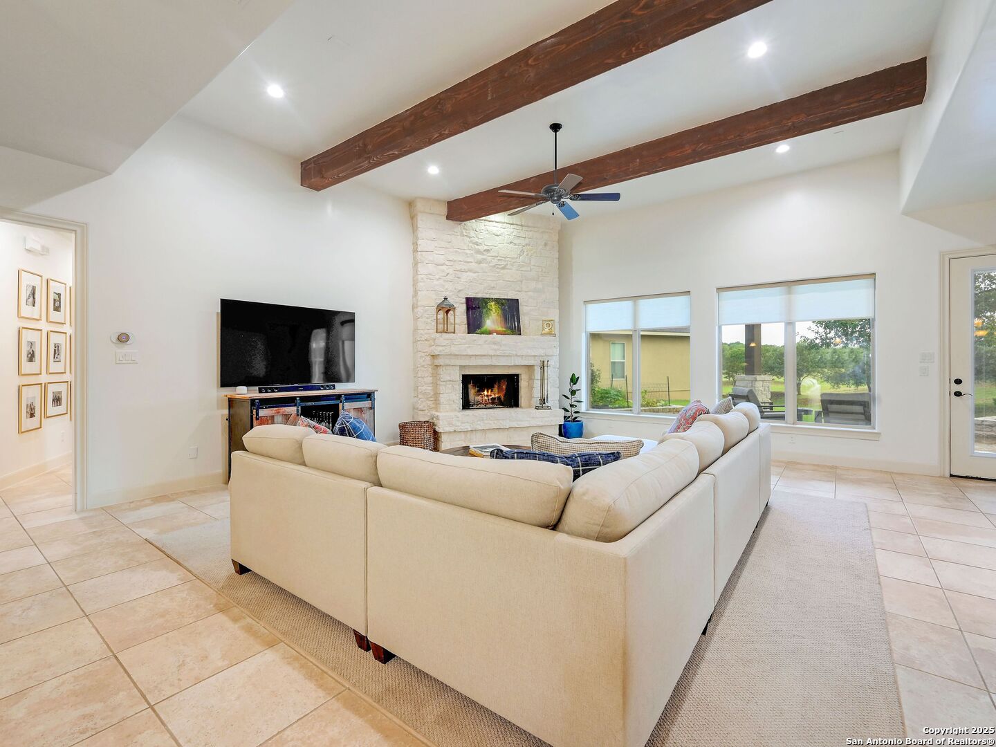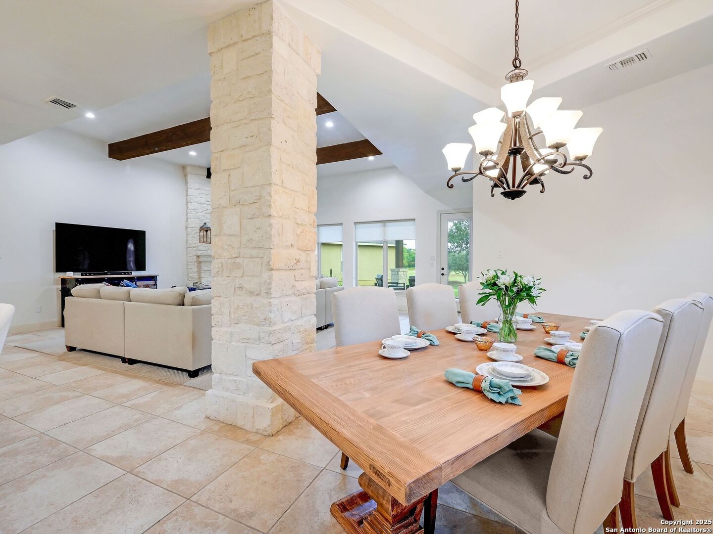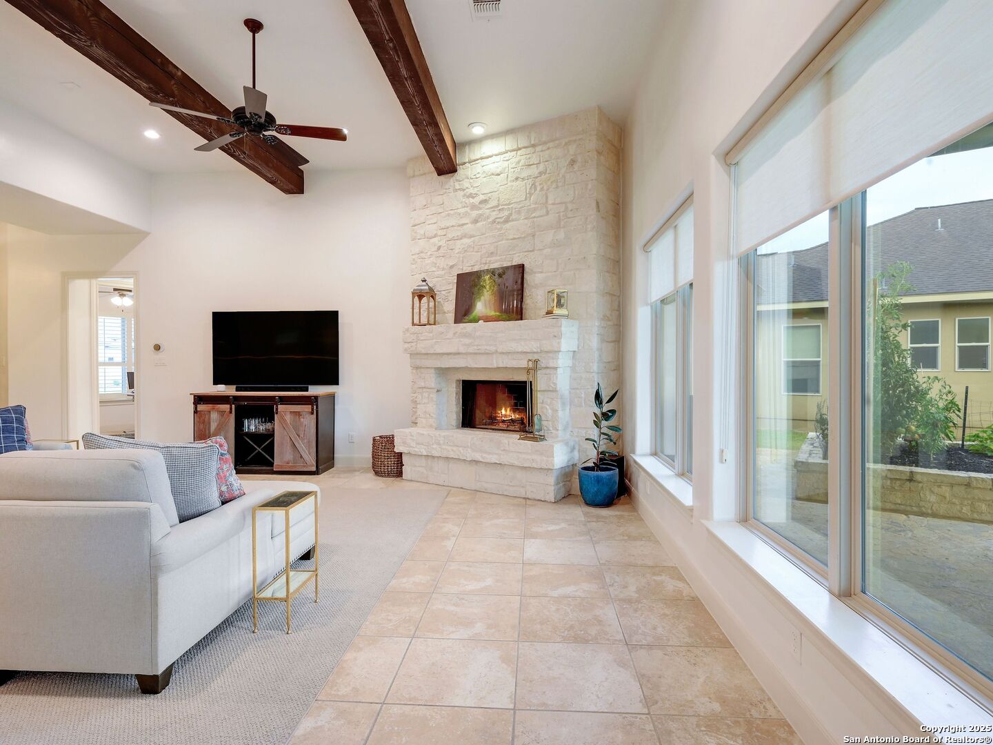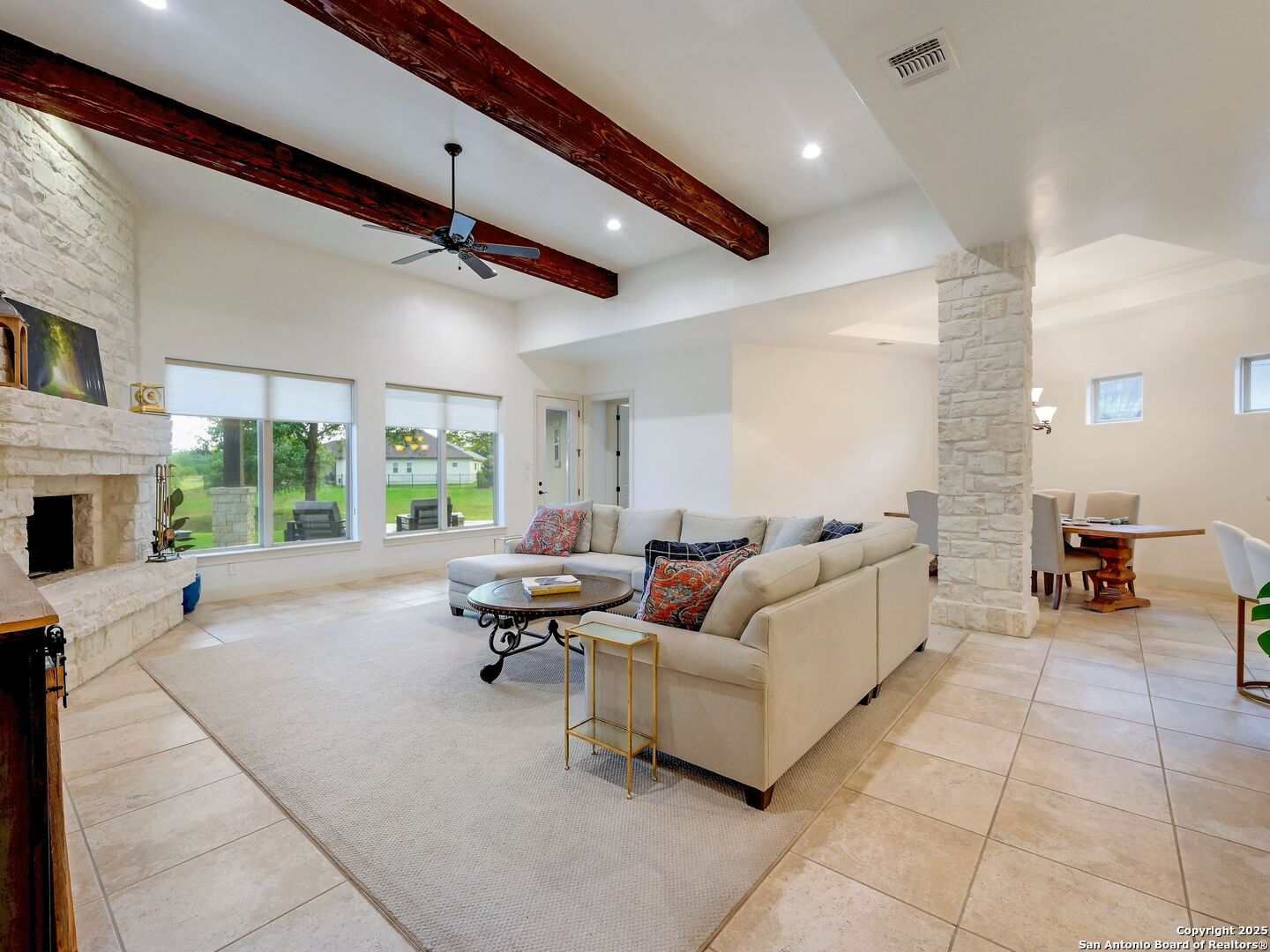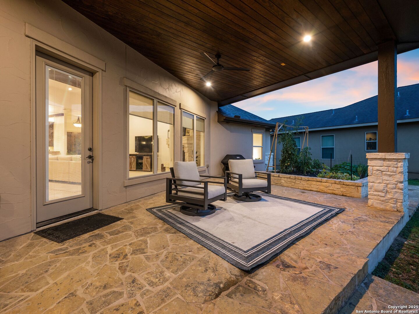 This beautifully updated one-story home offers a thoughtfully designed floor plan that perfectly balances comfort, functionality, and style. Freshly painted and equipped with brand-new solar panels, it's both energy-efficient and move-in ready. Enjoy tranquil greenbelt views from the spacious backyard, where a large covered patio and built-in fire pit provide the perfect space for relaxing or entertaining under the open sky. Inside, the open-concept kitchen and living area are filled with natural light from expansive picture windows, creating a bright and inviting atmosphere. The kitchen features custom cabinetry, elegant granite countertops, a statement vent hood, and an eat-in bar that's ideal for casual meals or gathering with guests. Additional highlights include a separate office, an eat-in dining area, and three generously sized bedrooms, offering flexibility for both work and leisure. Set in a well-maintained neighborhood known for its lush landscaping and beautiful homes, the property offers a sense of privacy and peaceful living, often accompanied by deer sightings just beyond your backyard. Perfectly situated just off Fair Oaks Ranch Blvd near the golf course, this home is ideally located between the vibrant city of San Antonio and the charm of Boerne, and is part of the highly rated Boerne ISD. Schedule your showing today!