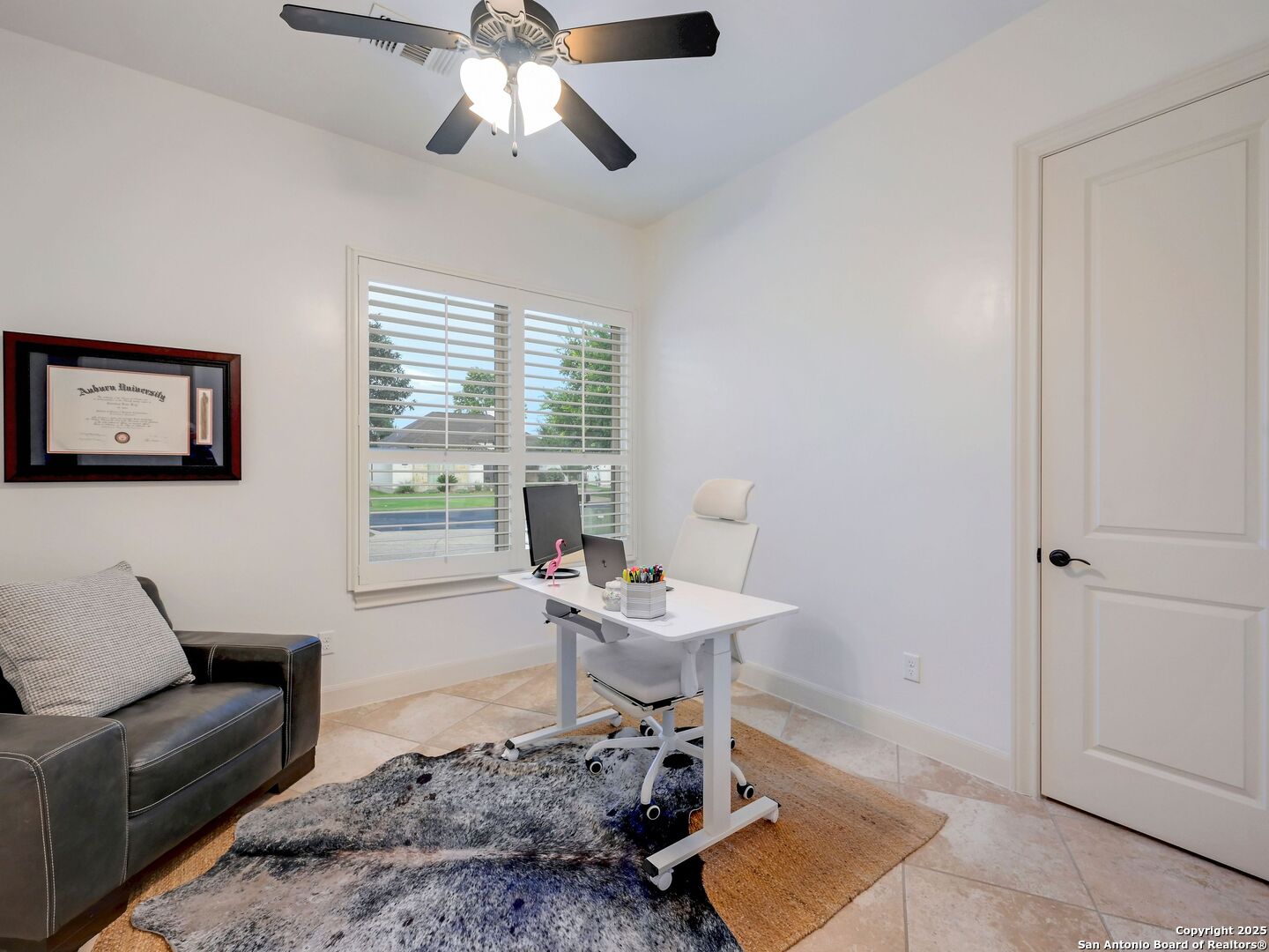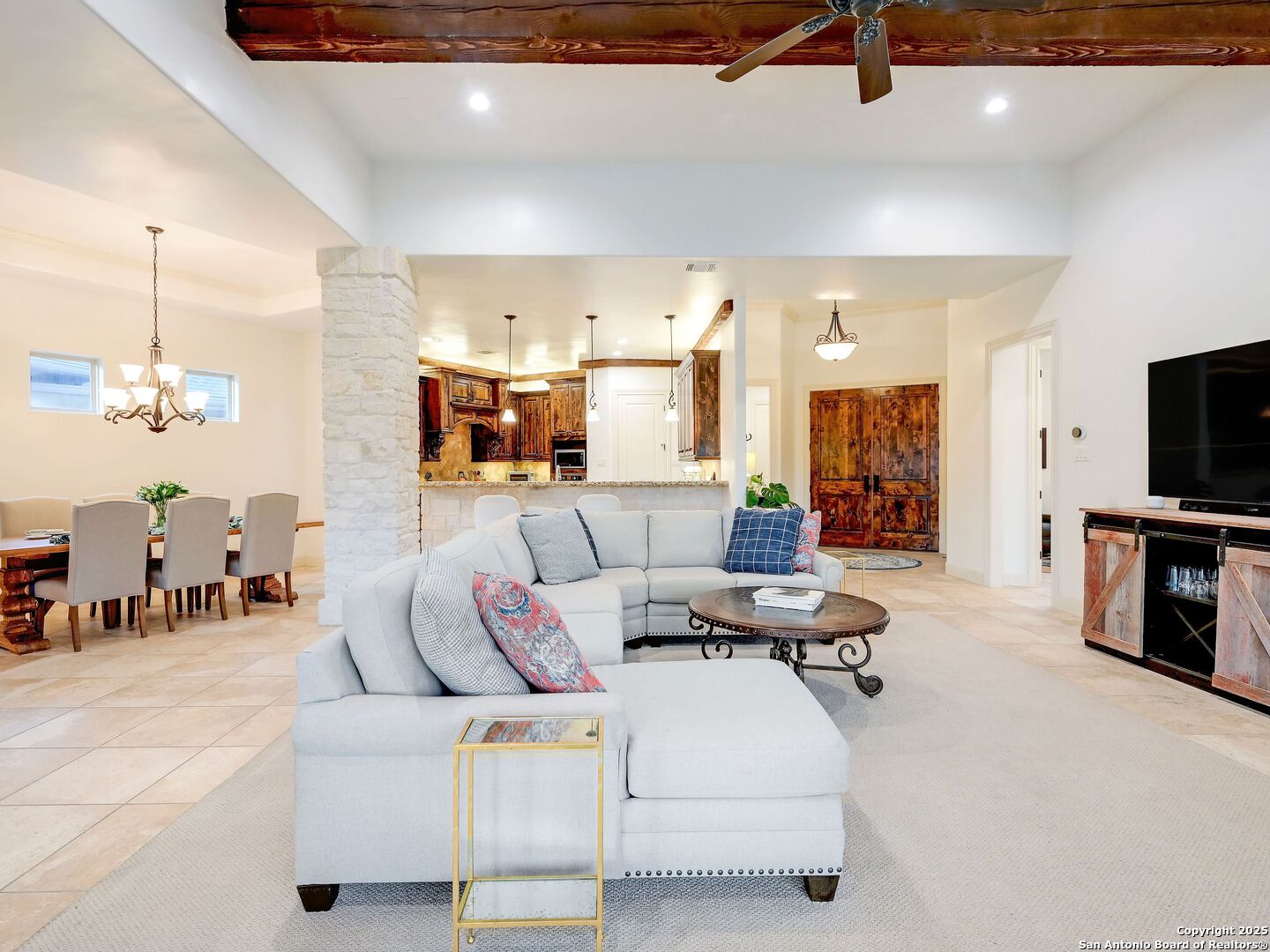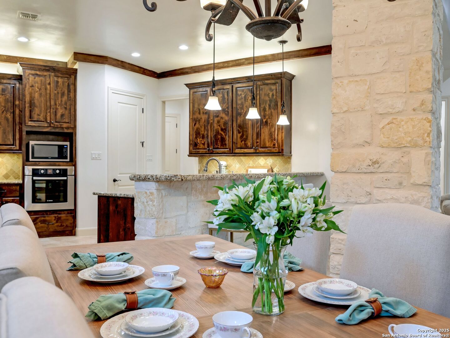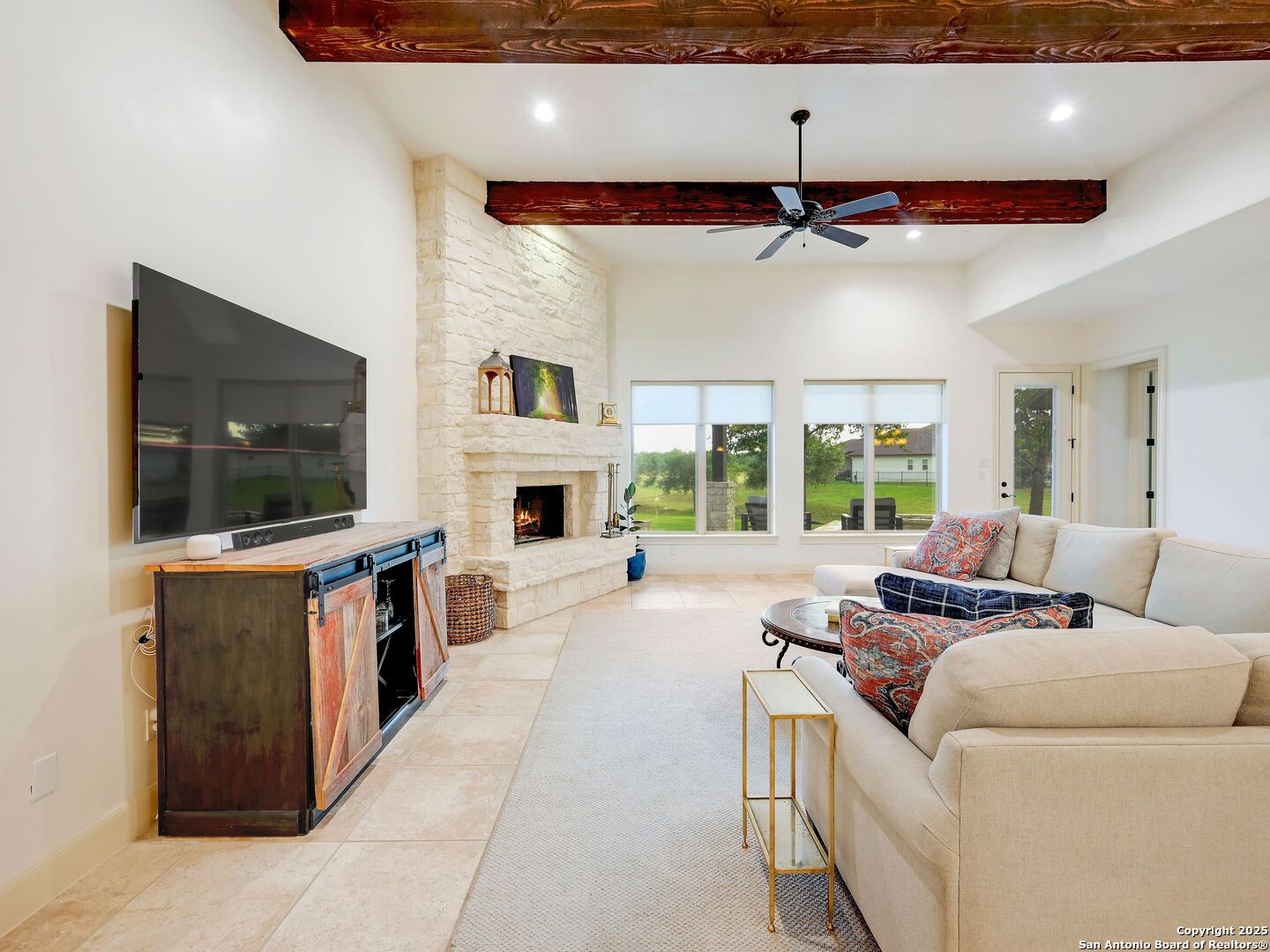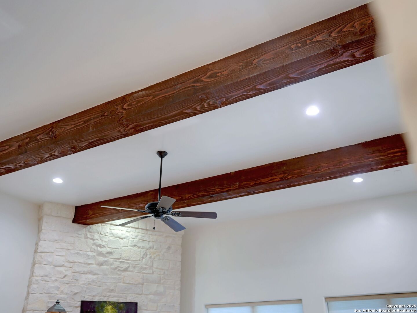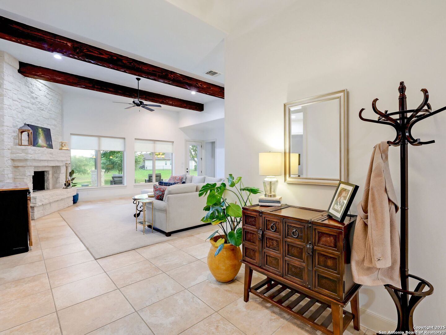 This beautifully updated one-story home offers a thoughtfully designed floor plan that perfectly balances comfort, functionality, and style. Freshly painted and equipped with brand-new solar panels, it's both energy-efficient and move-in ready. Enjoy tranquil greenbelt views from the spacious backyard, where a large covered patio and built-in fire pit provide the perfect space for relaxing or entertaining under the open sky. Inside, the open-concept kitchen and living area are filled with natural light from expansive picture windows, creating a bright and inviting atmosphere. The kitchen features custom cabinetry, elegant granite countertops, a statement vent hood, and an eat-in bar that's ideal for casual meals or gathering with guests. Additional highlights include a separate office, an eat-in dining area, and three generously sized bedrooms, offering flexibility for both work and leisure. Set in a well-maintained neighborhood known for its lush landscaping and beautiful homes, the property offers a sense of privacy and peaceful living, often accompanied by deer sightings just beyond your backyard. Perfectly situated just off Fair Oaks Ranch Blvd near the golf course, this home is ideally located between the vibrant city of San Antonio and the charm of Boerne, and is part of the highly rated Boerne ISD. Schedule your showing today!